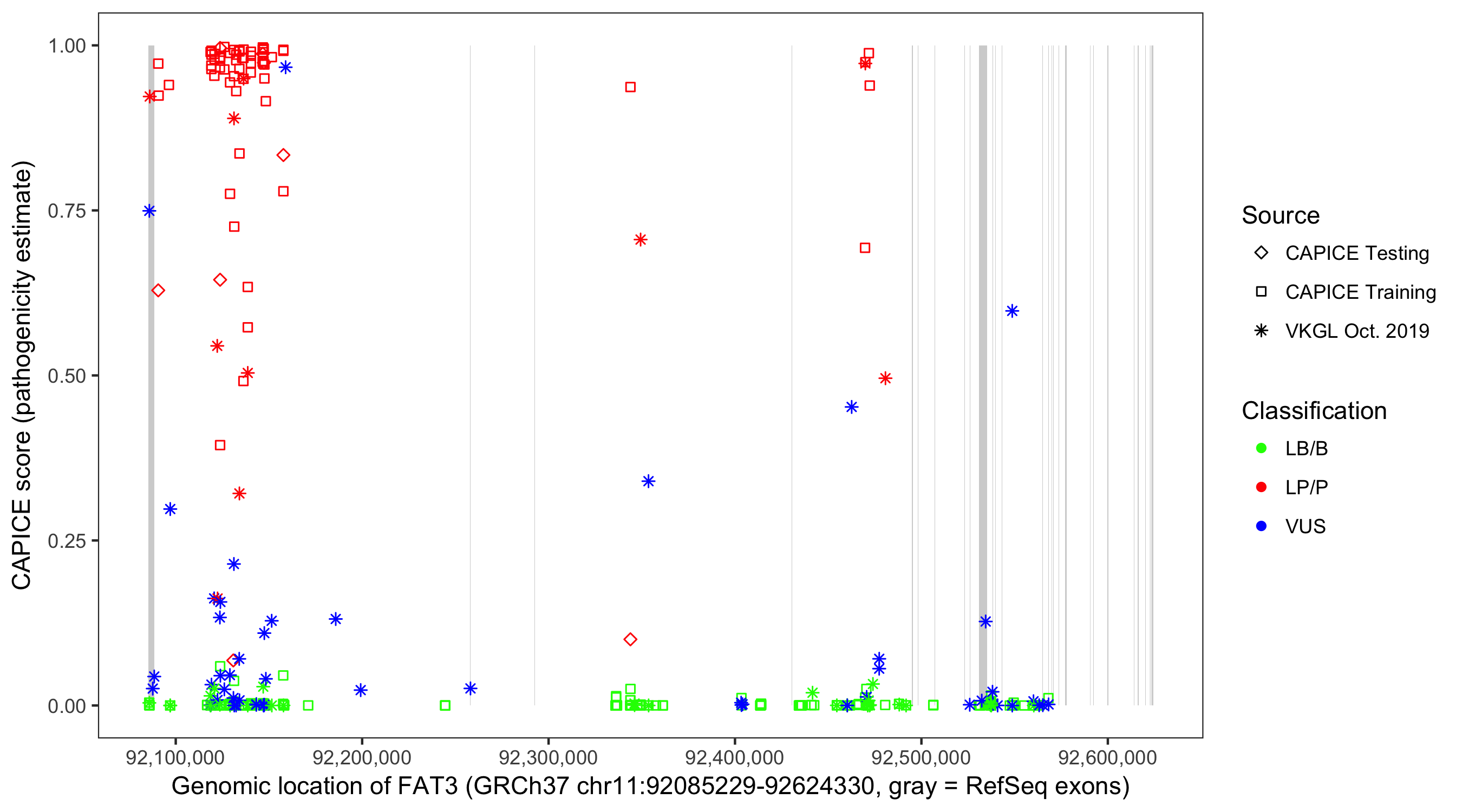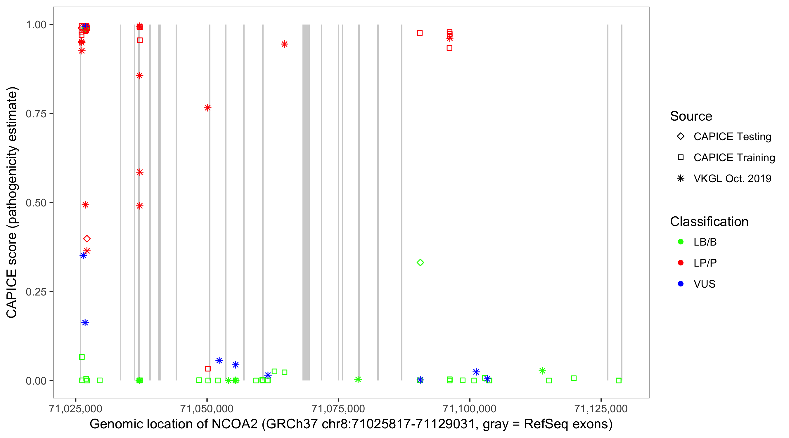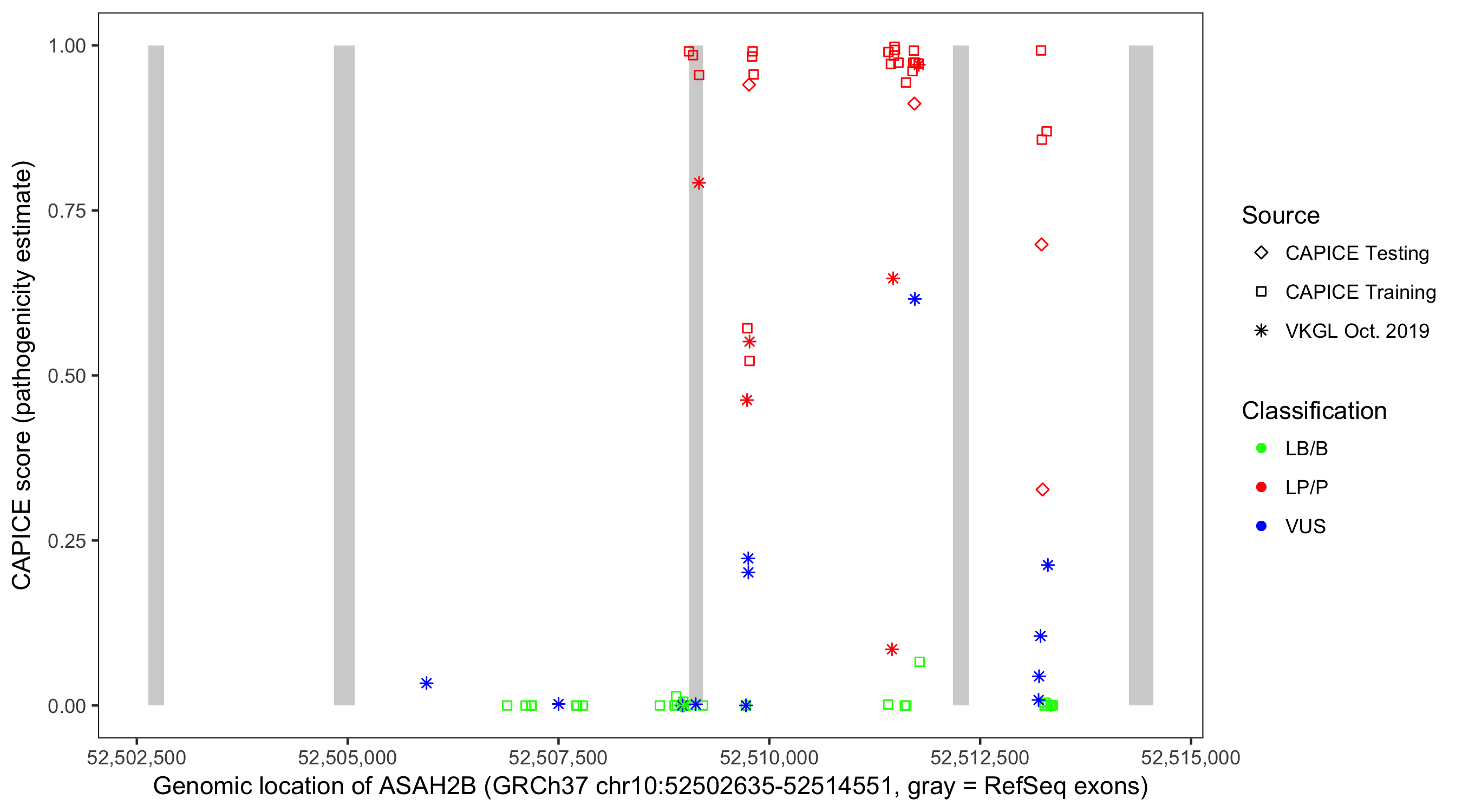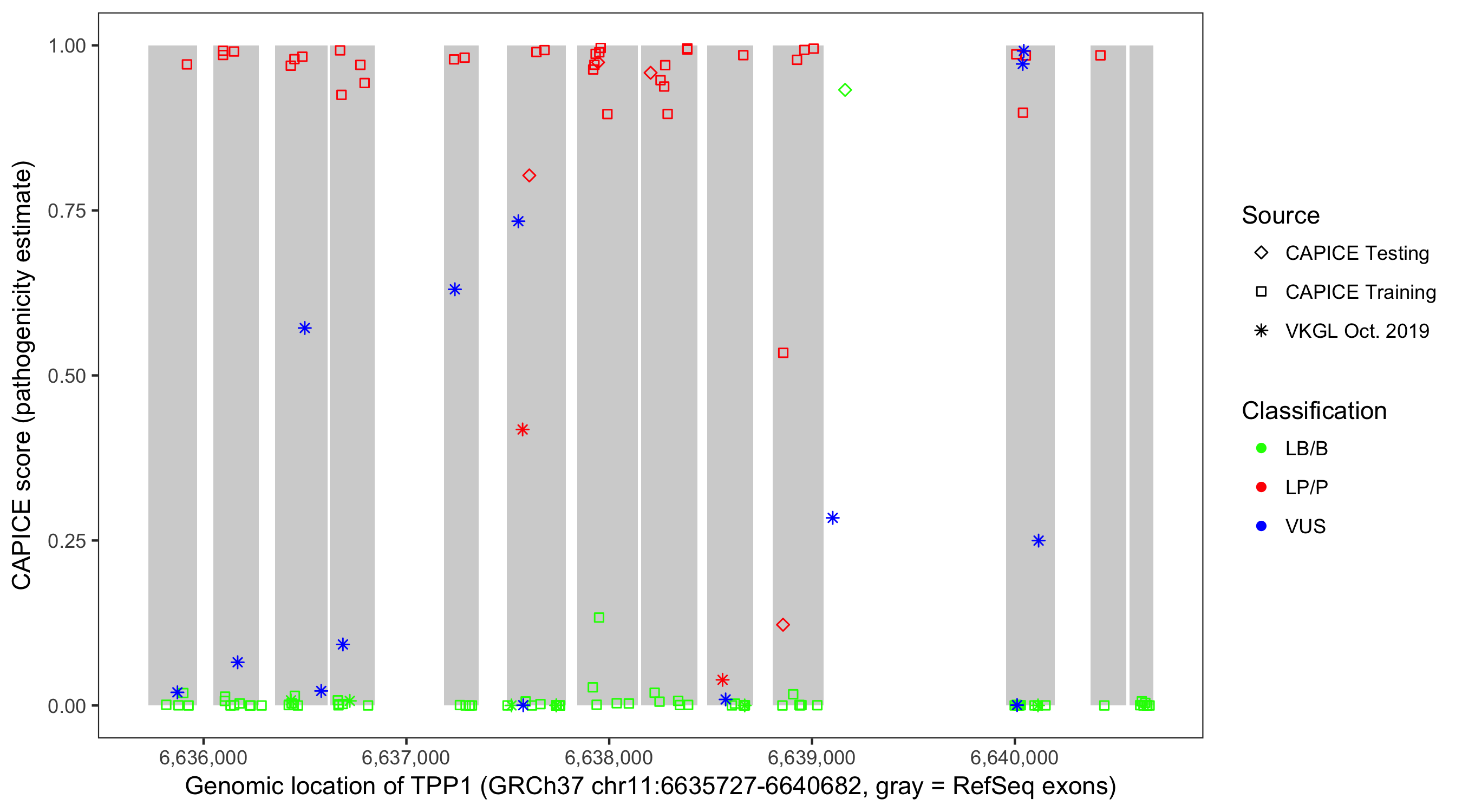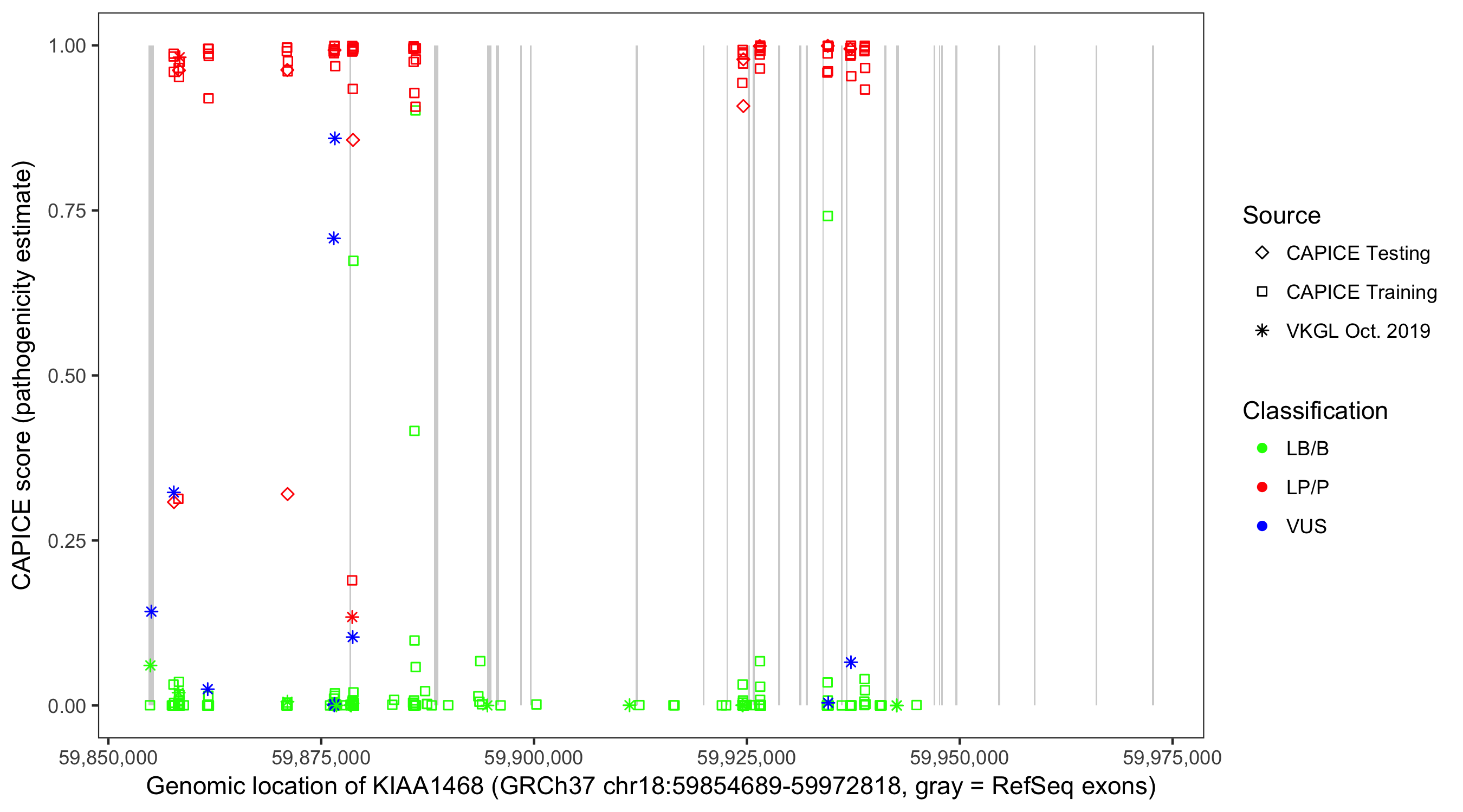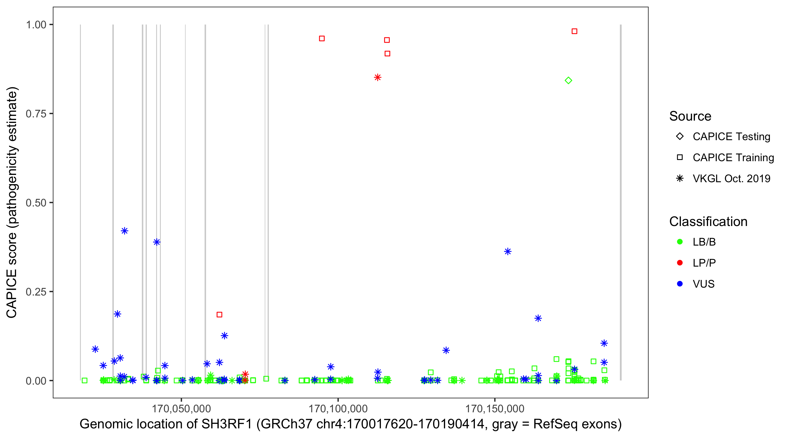 Shown are CAPICE train/test variants plus VKGL Oct 2019.
