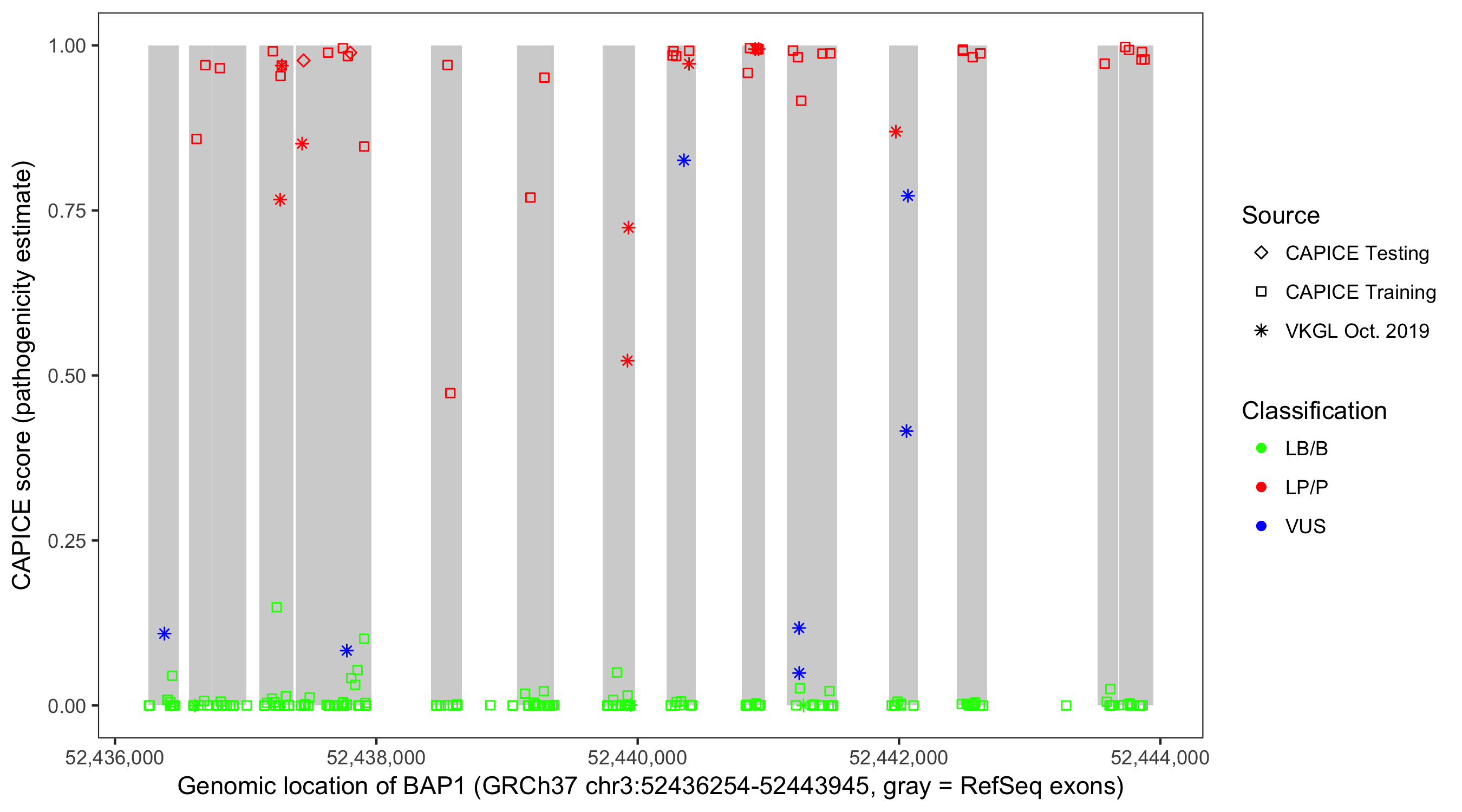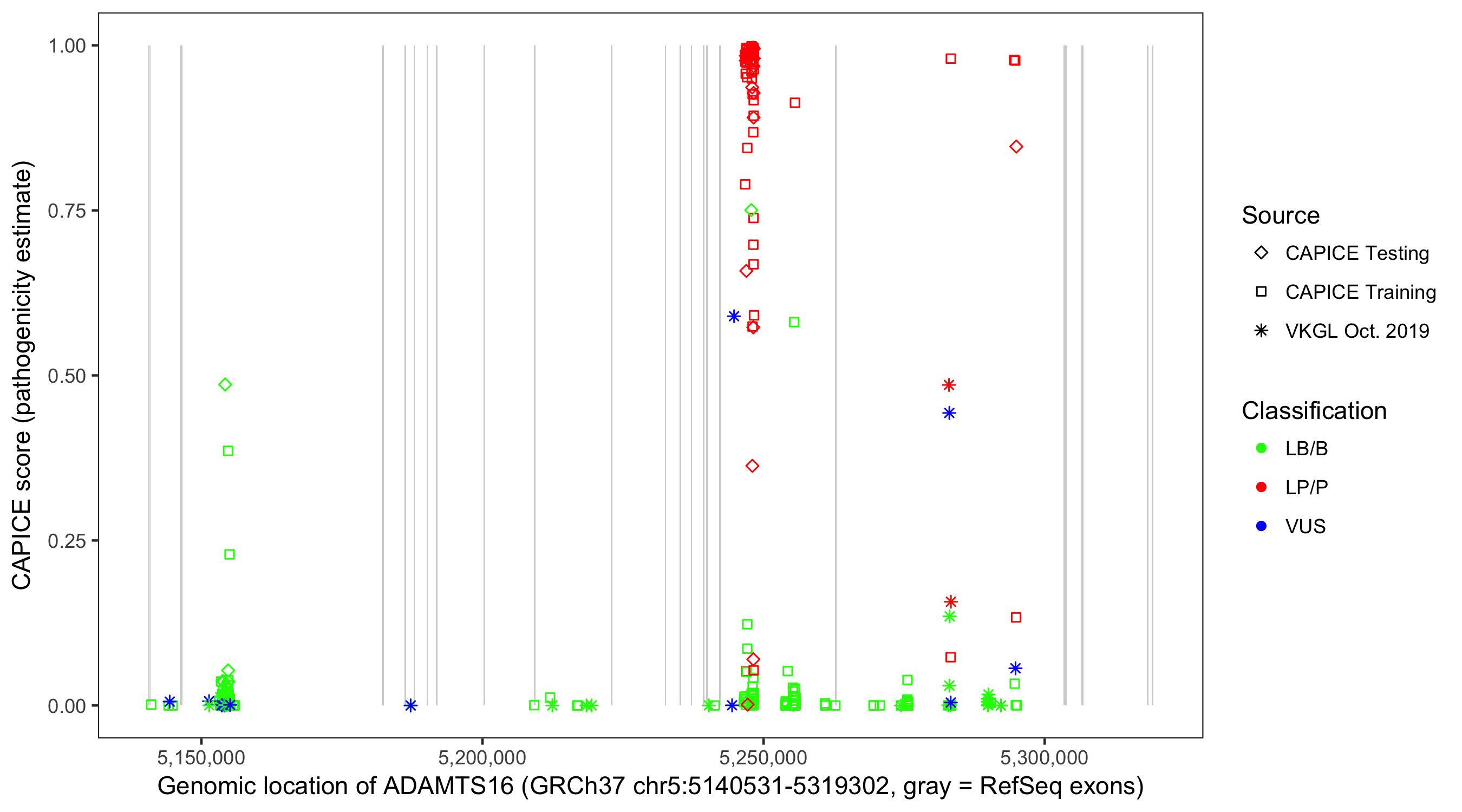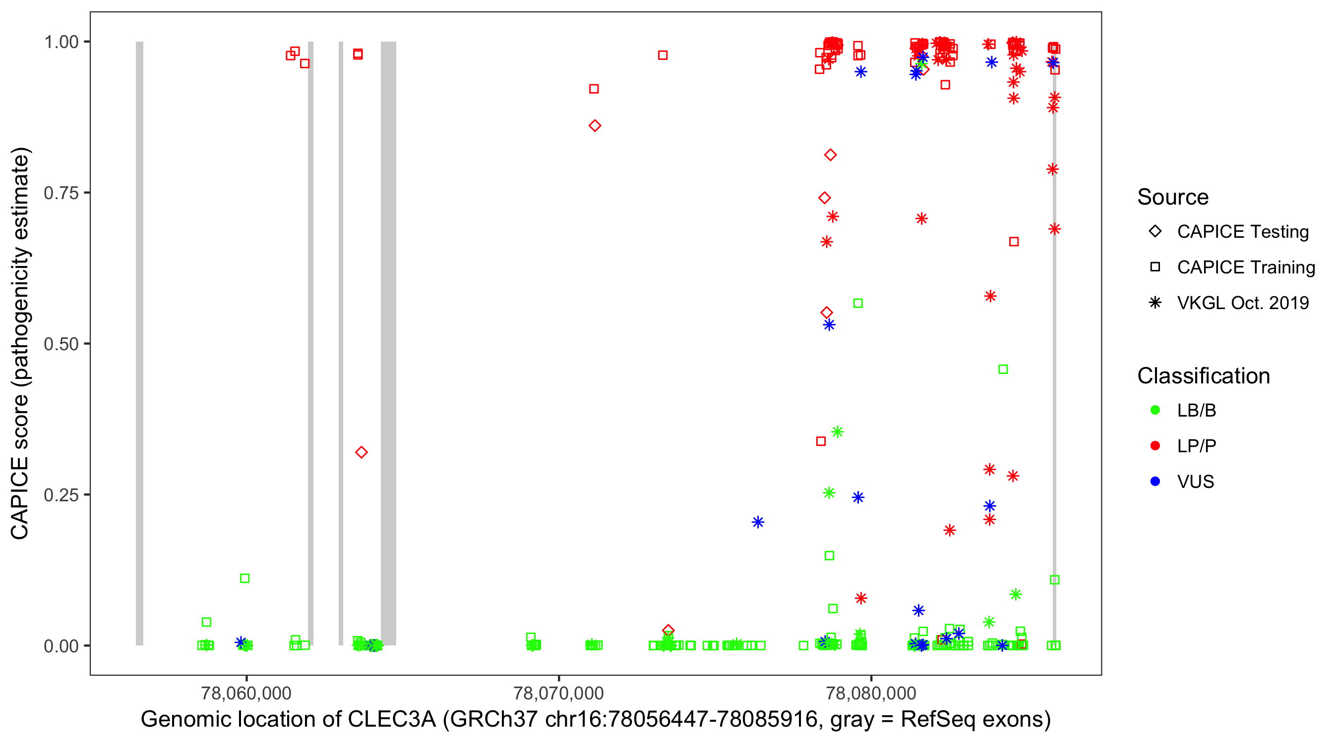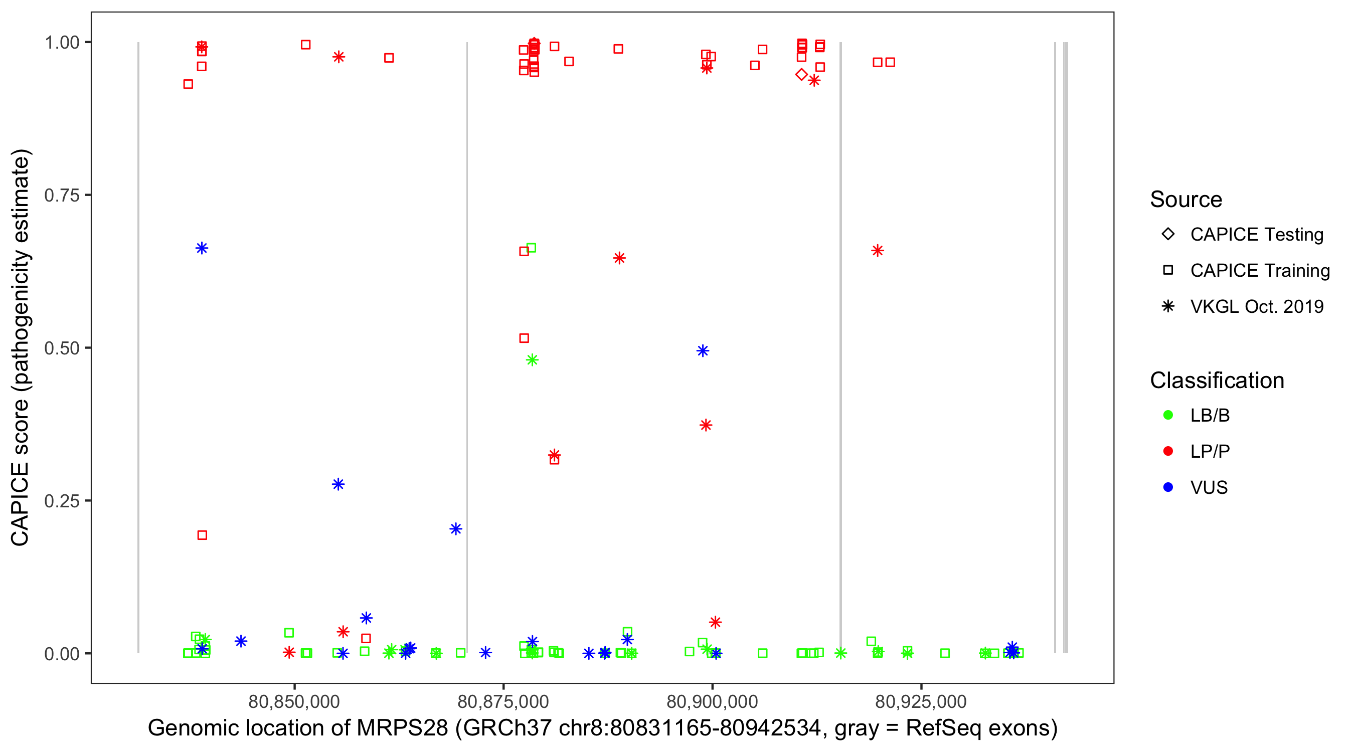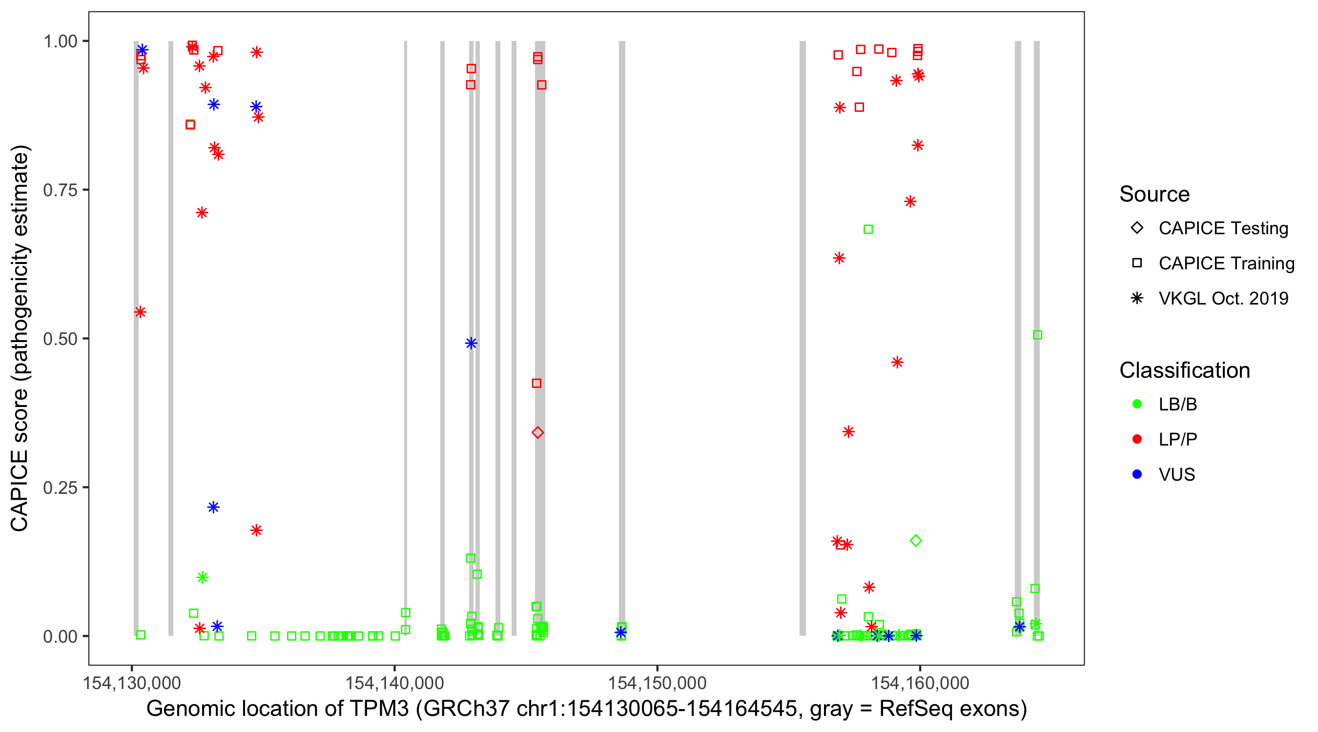 Shown are CAPICE train/test variants plus VKGL Oct 2019.