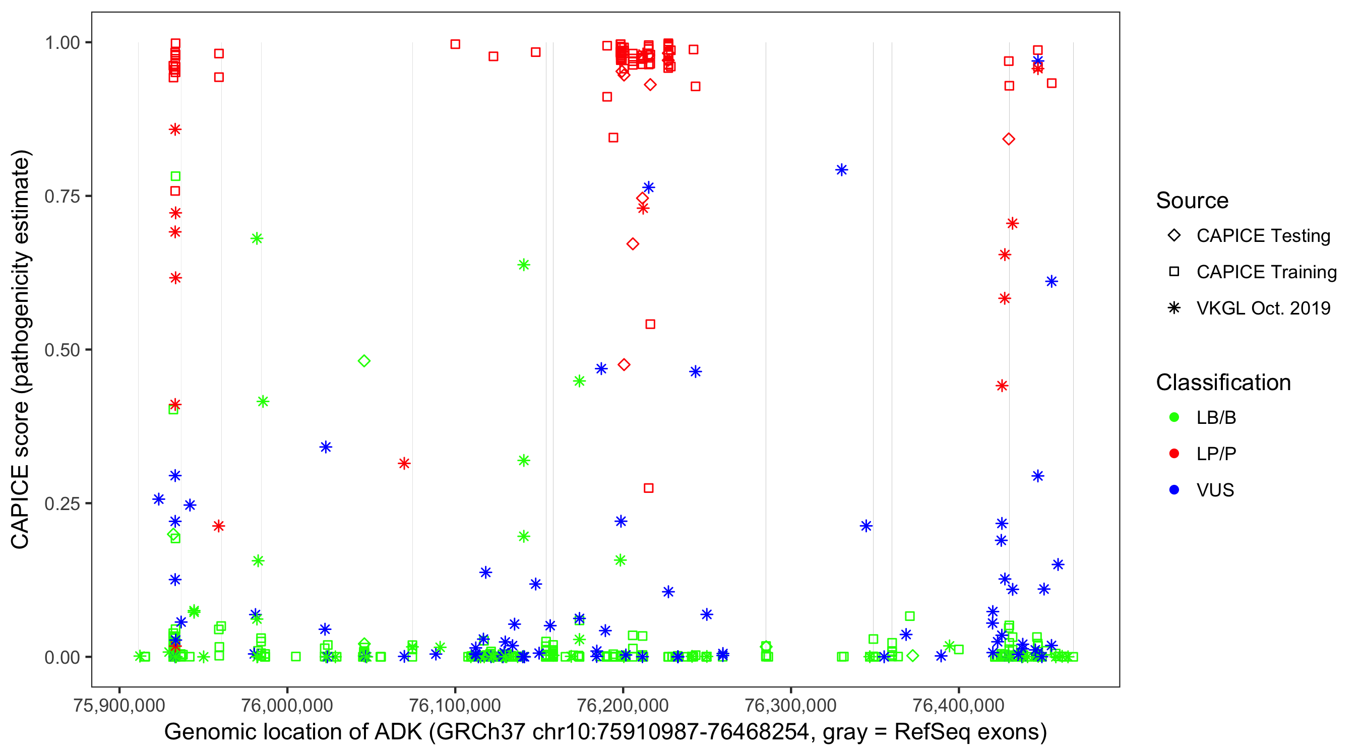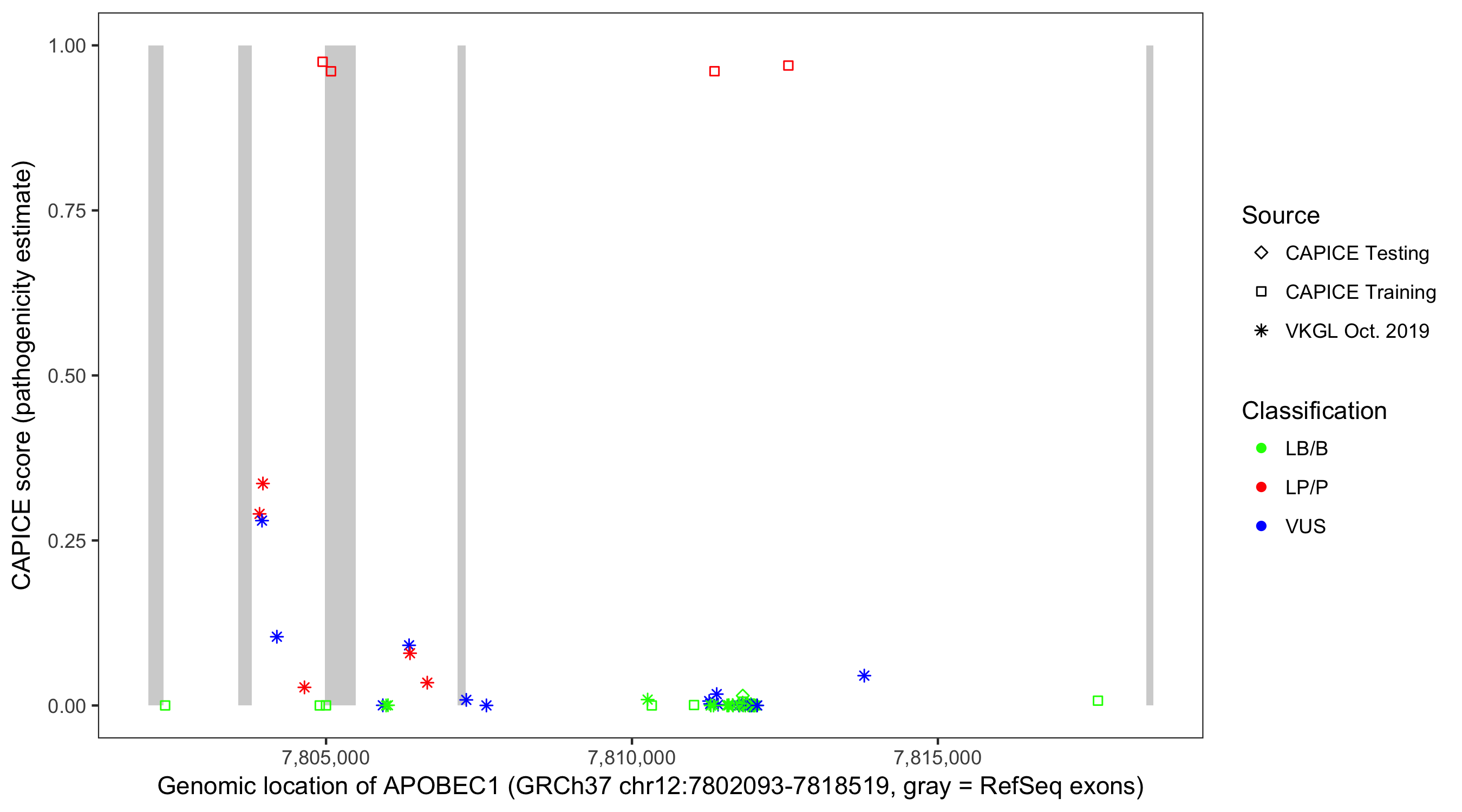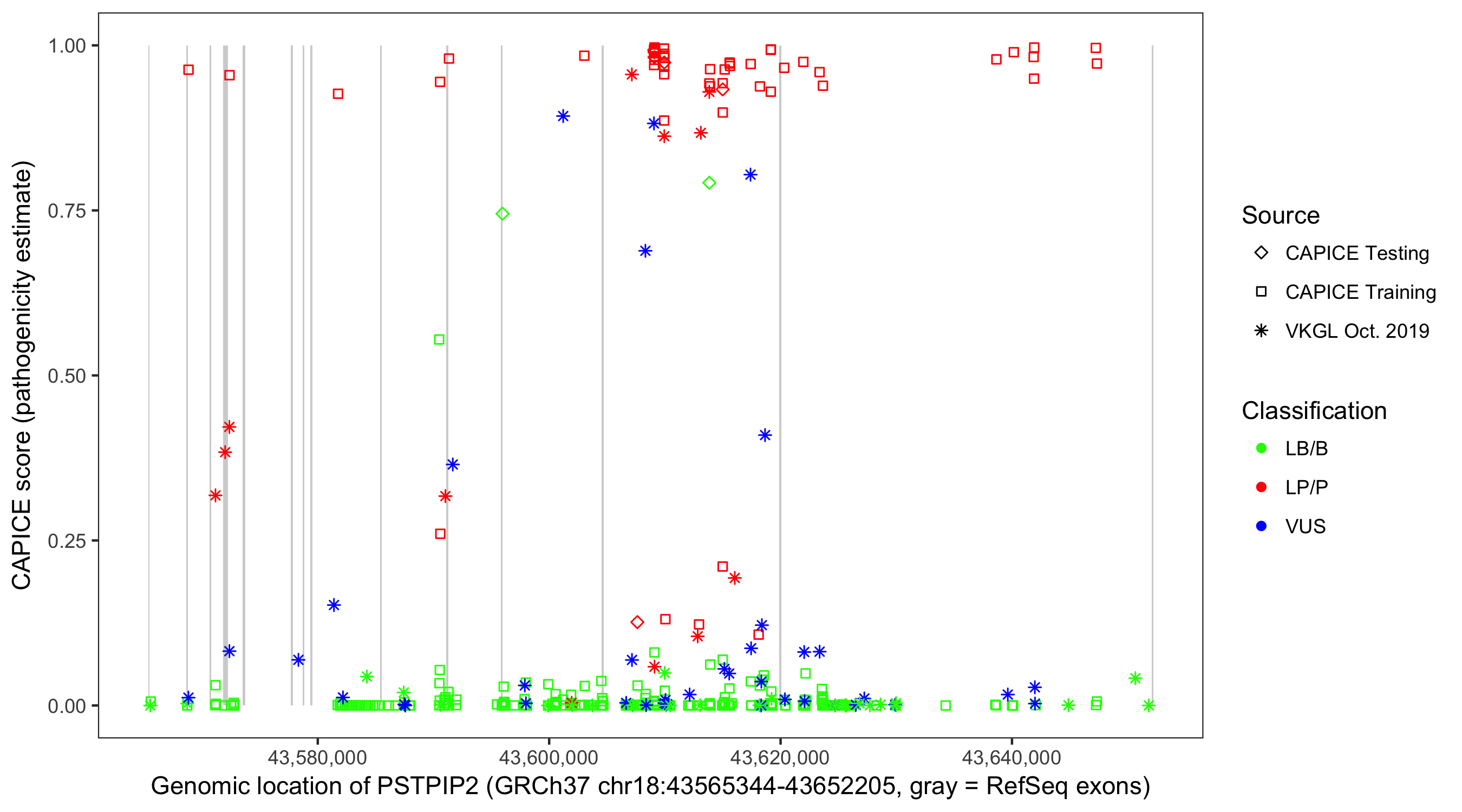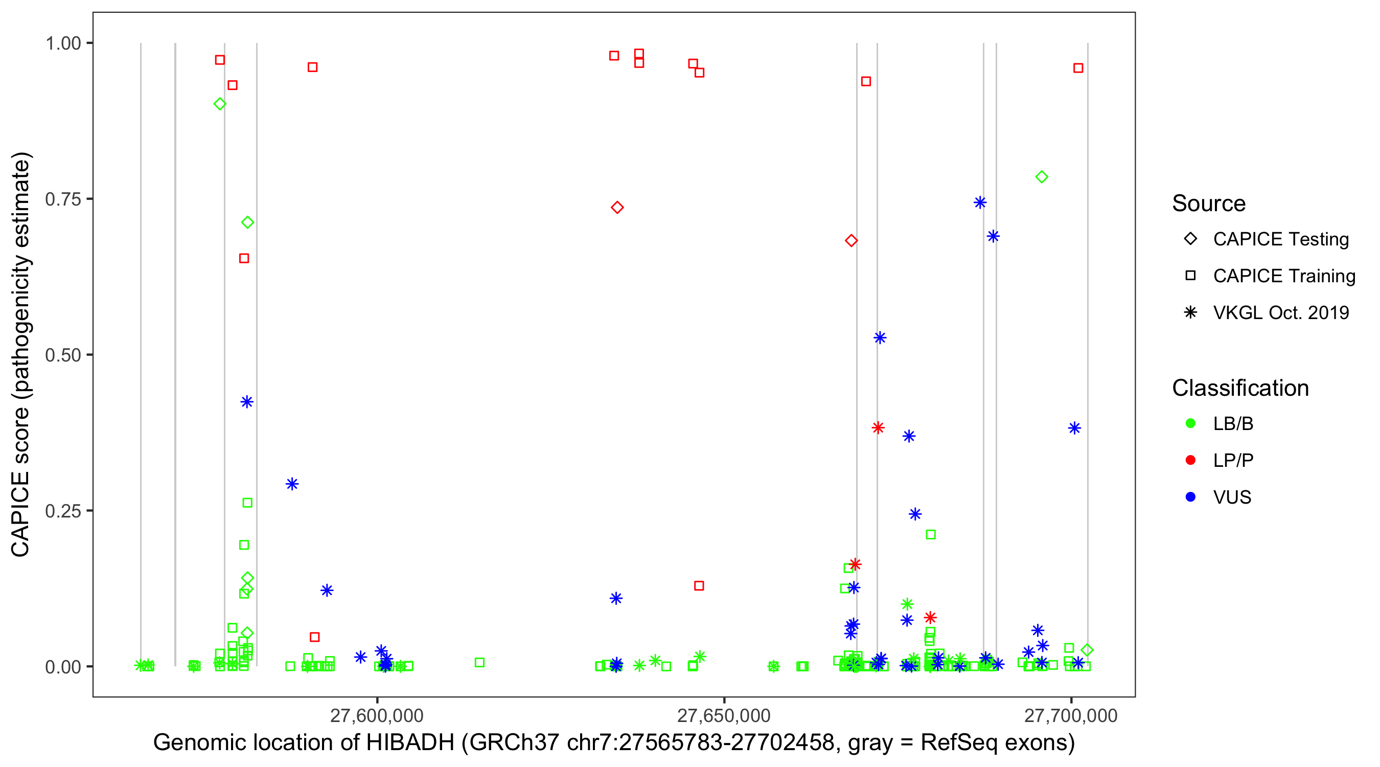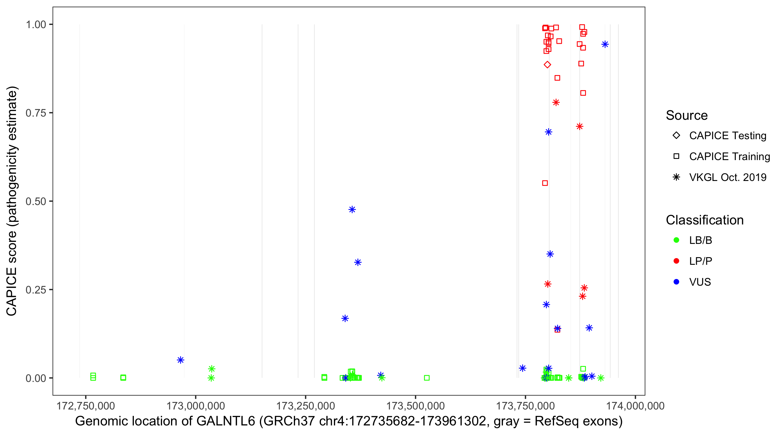 Shown are CAPICE train/test variants plus VKGL Oct 2019.