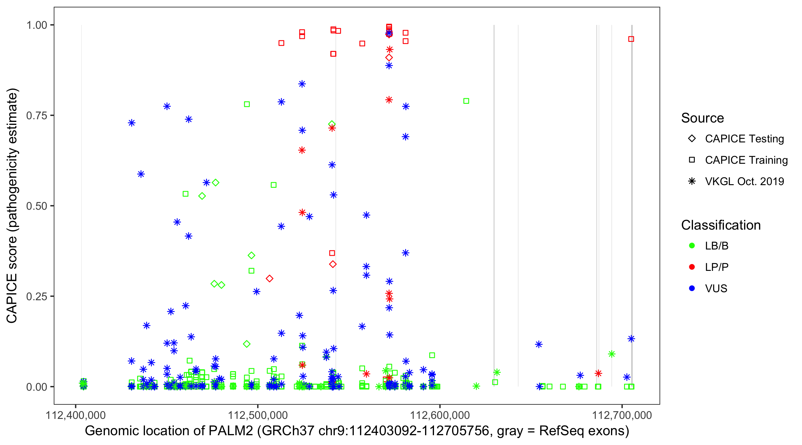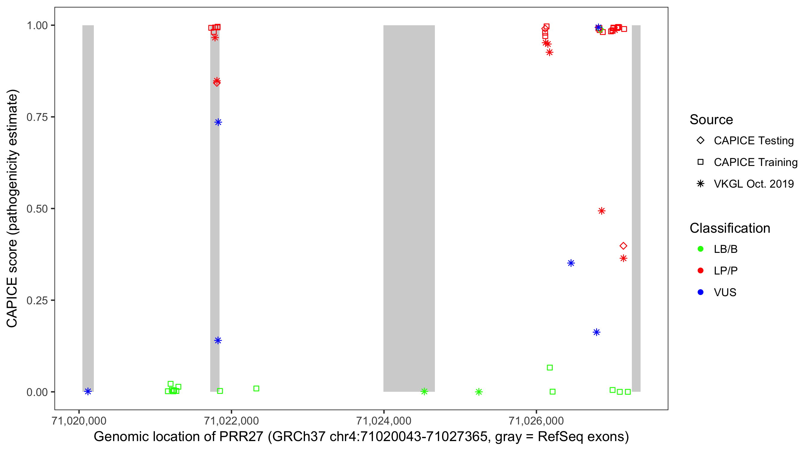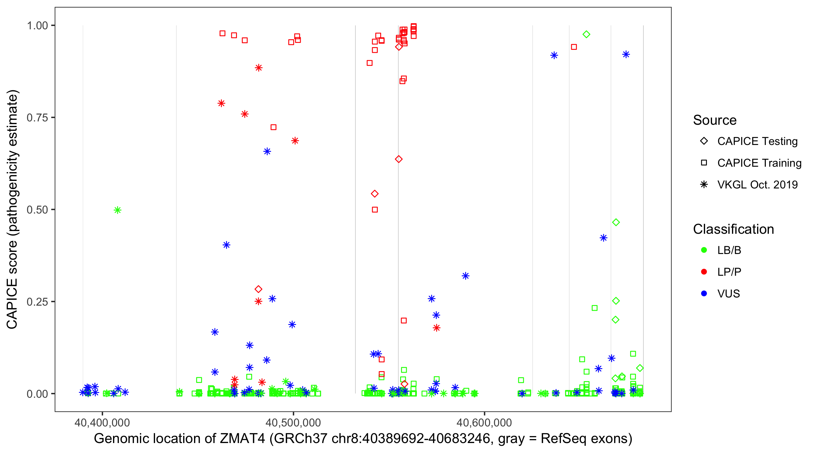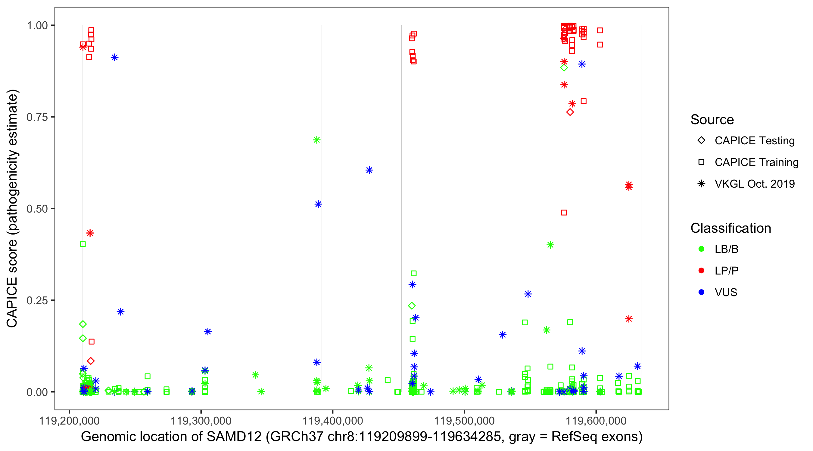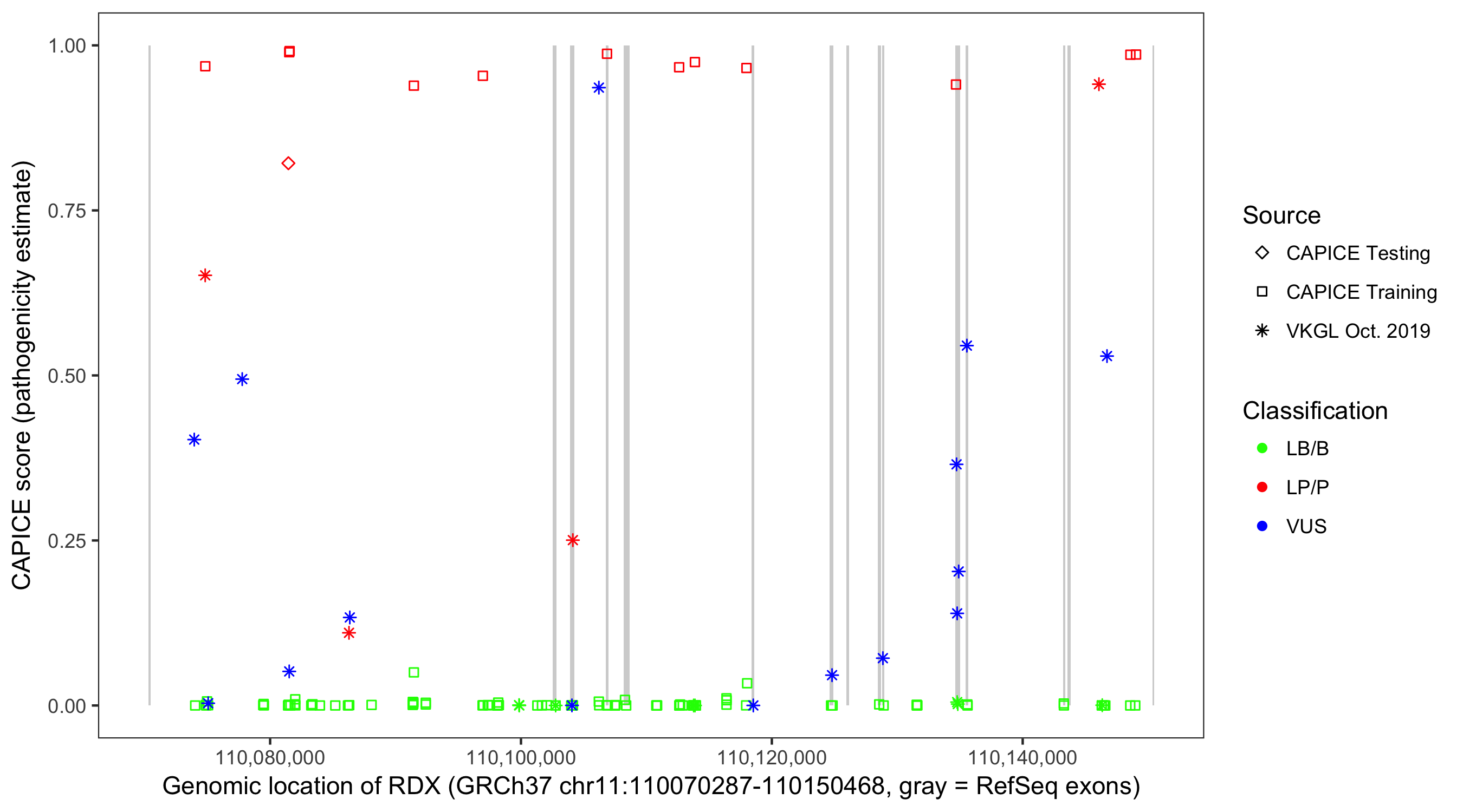 Shown are CAPICE train/test variants plus VKGL Oct 2019.