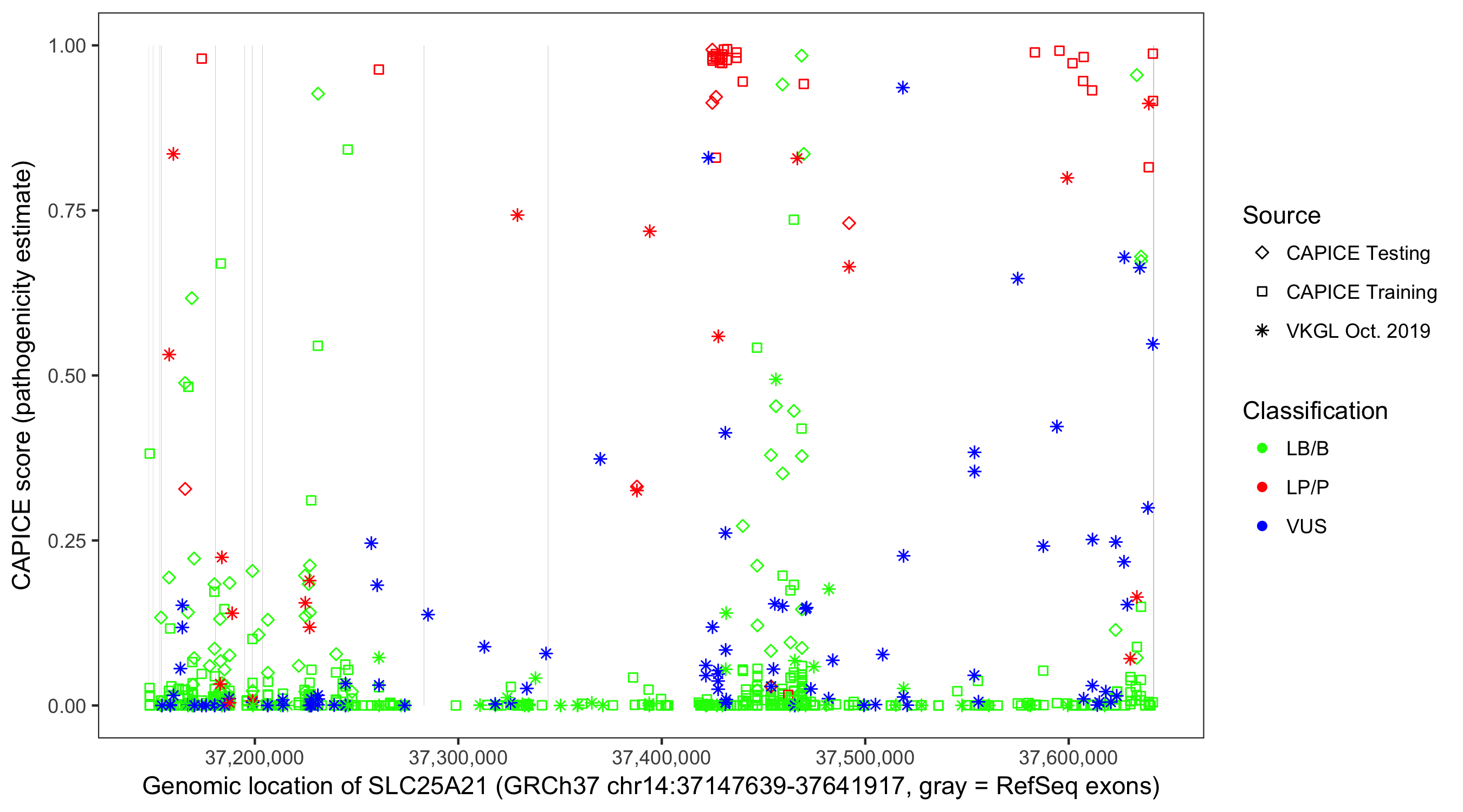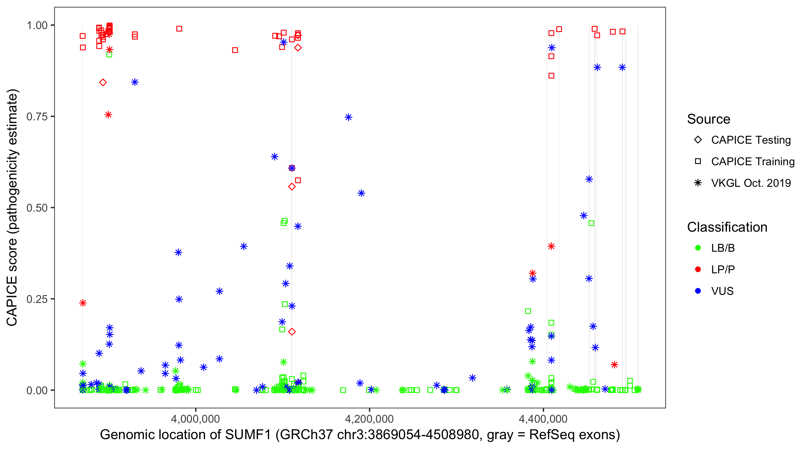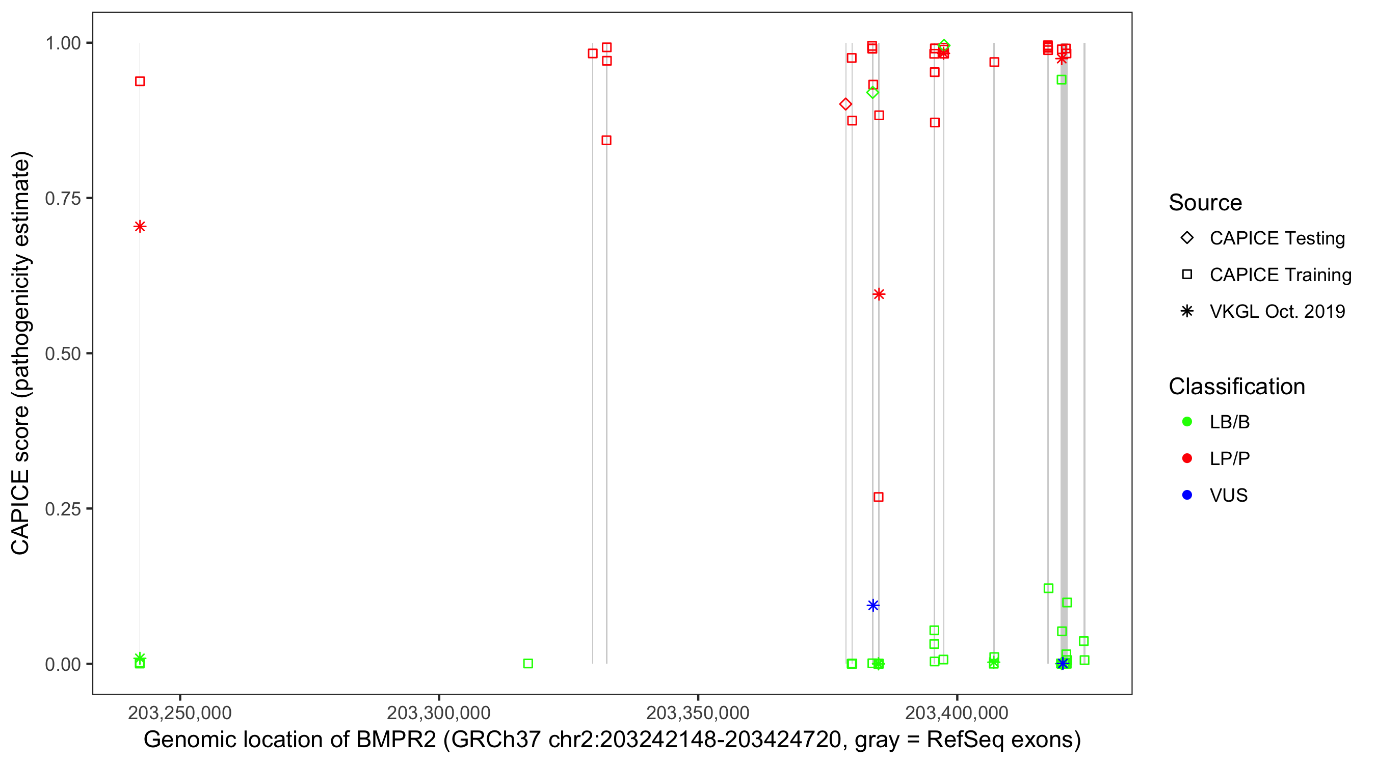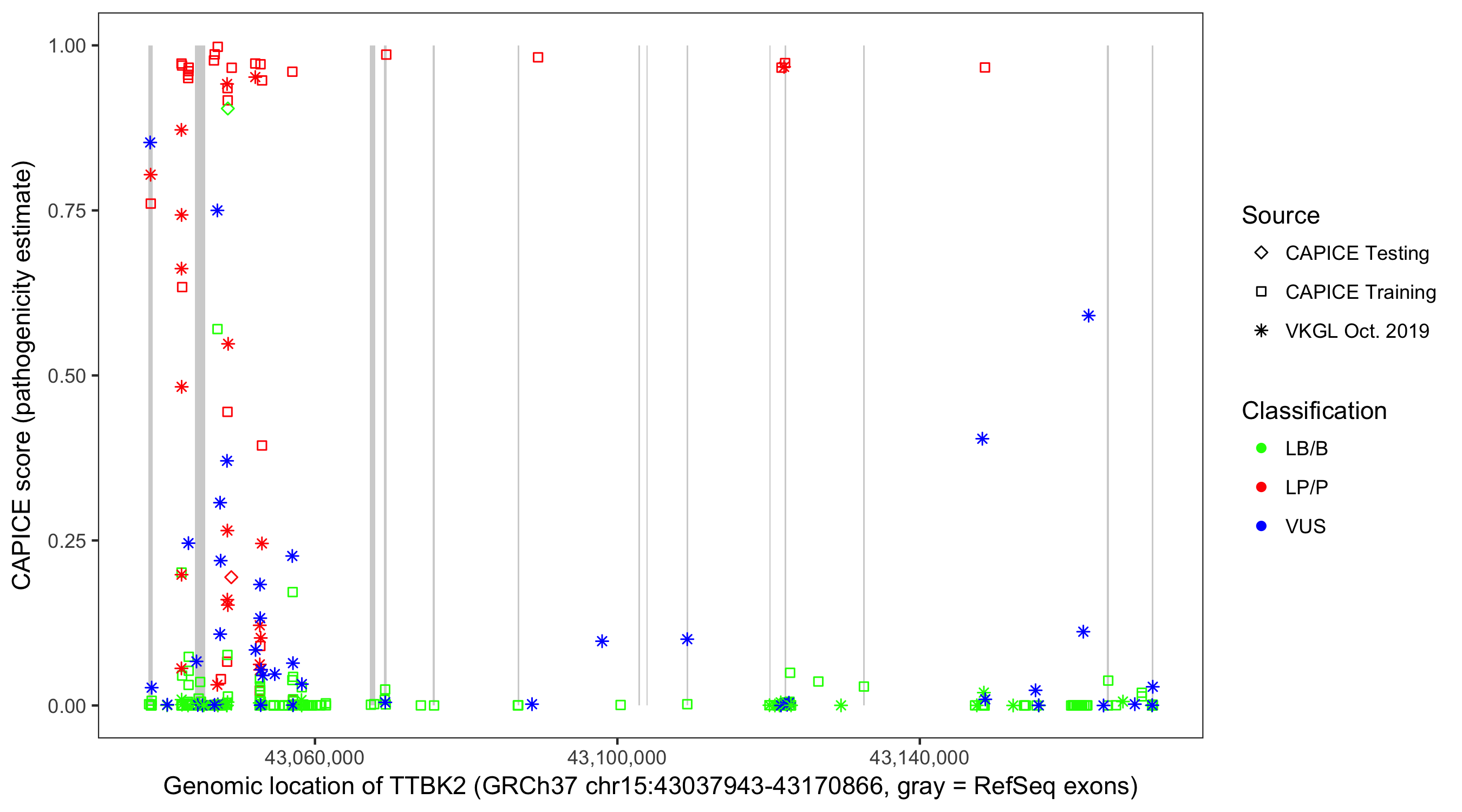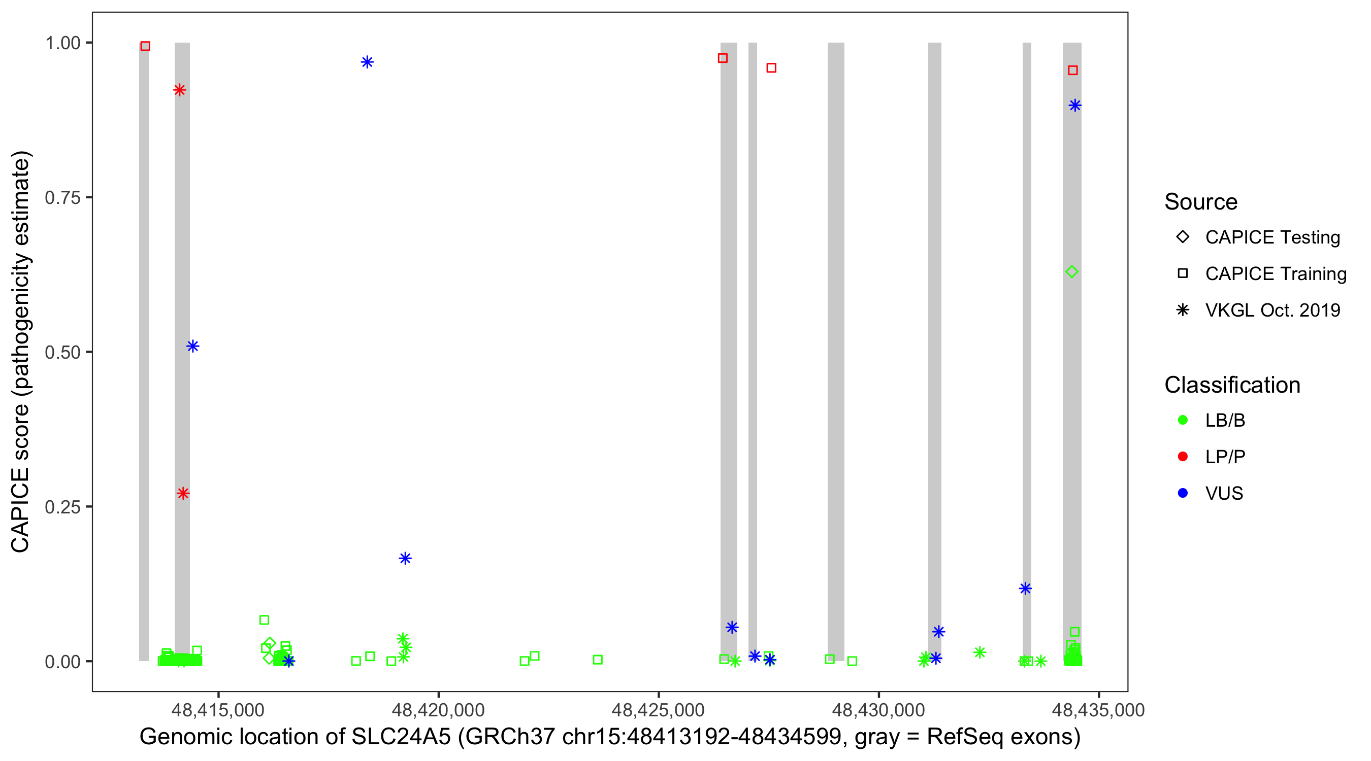 Shown are CAPICE train/test variants plus VKGL Oct 2019.
