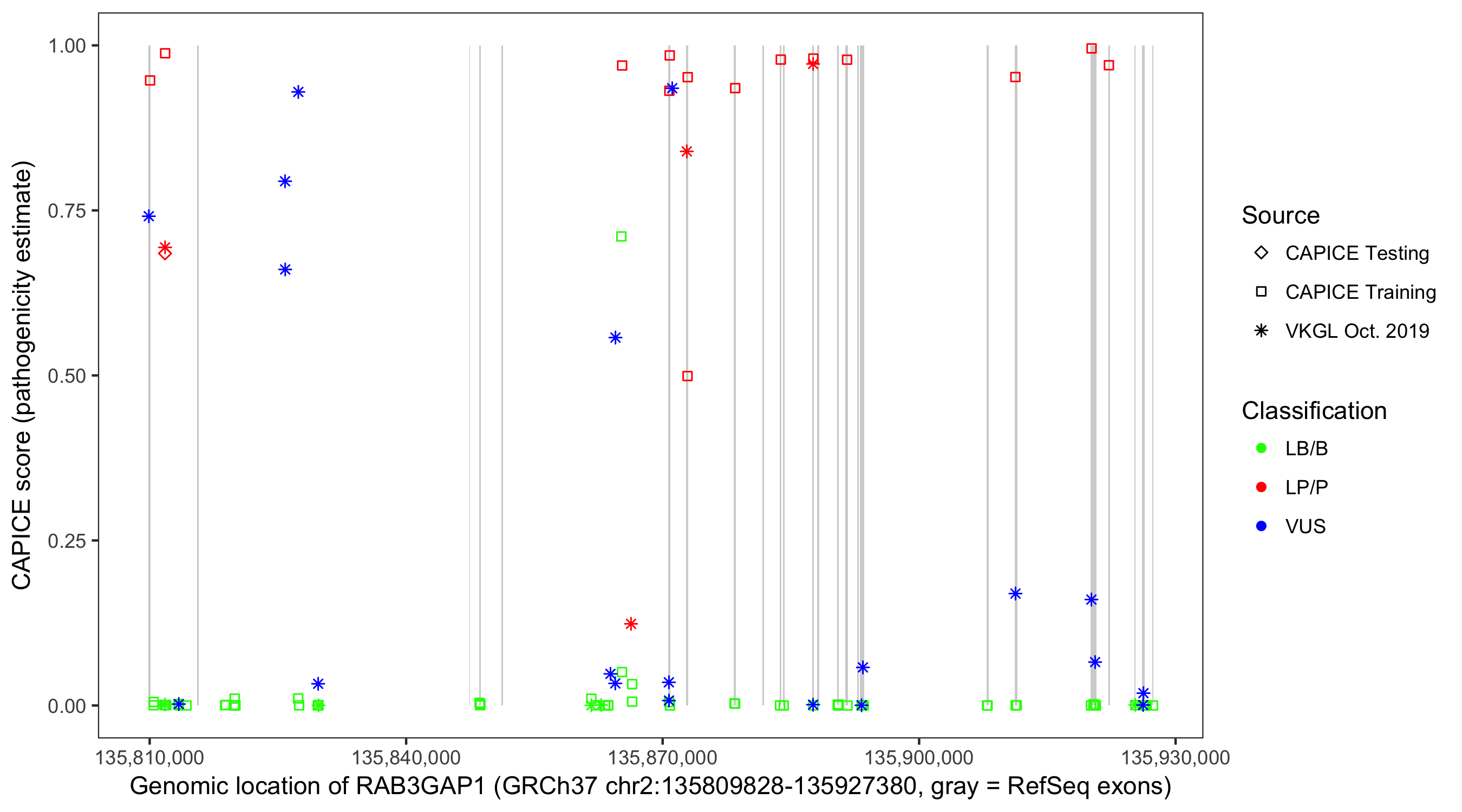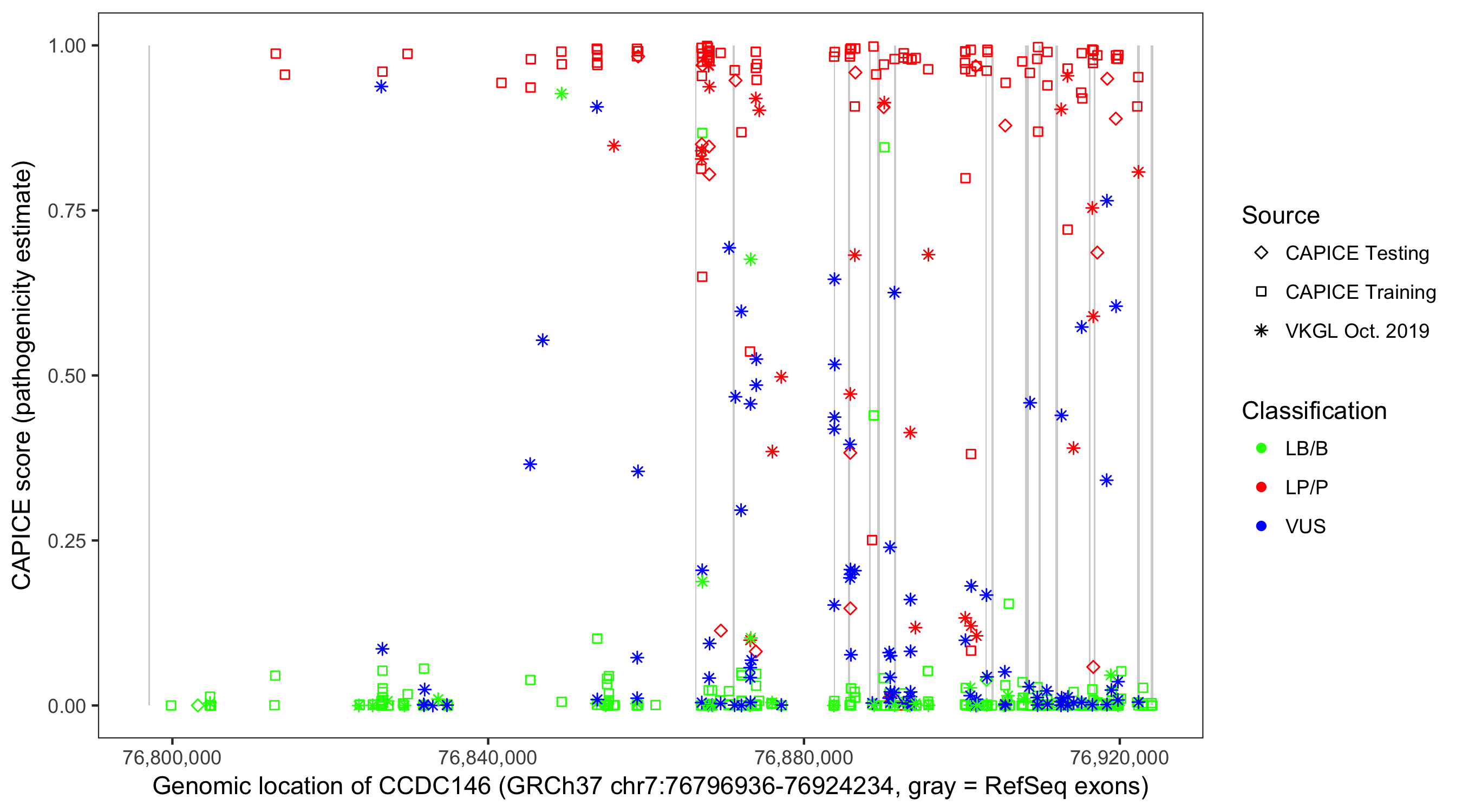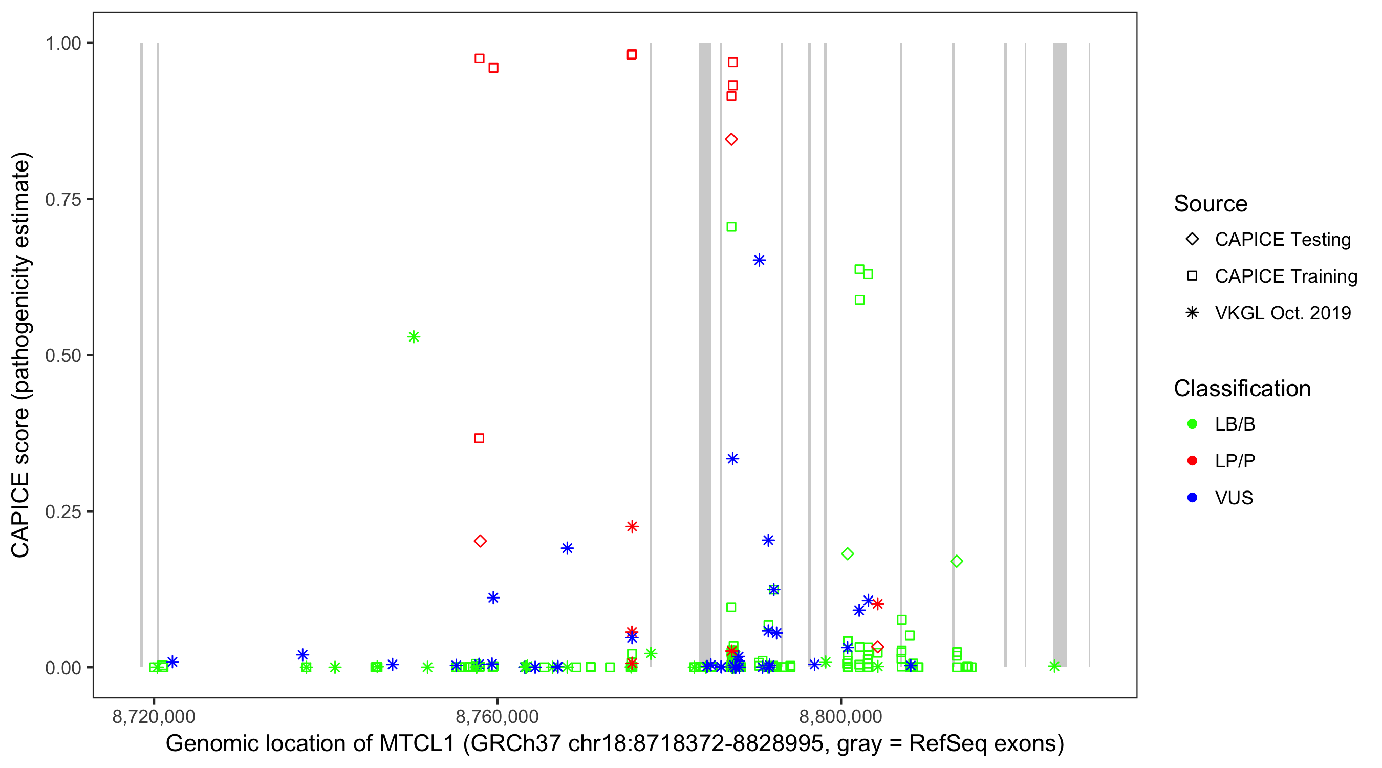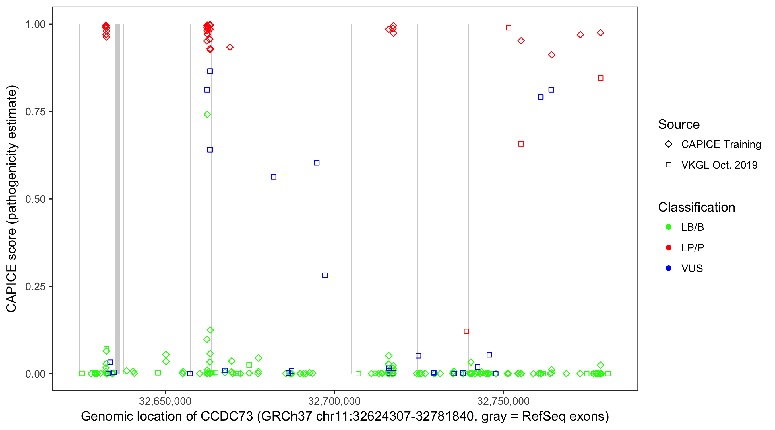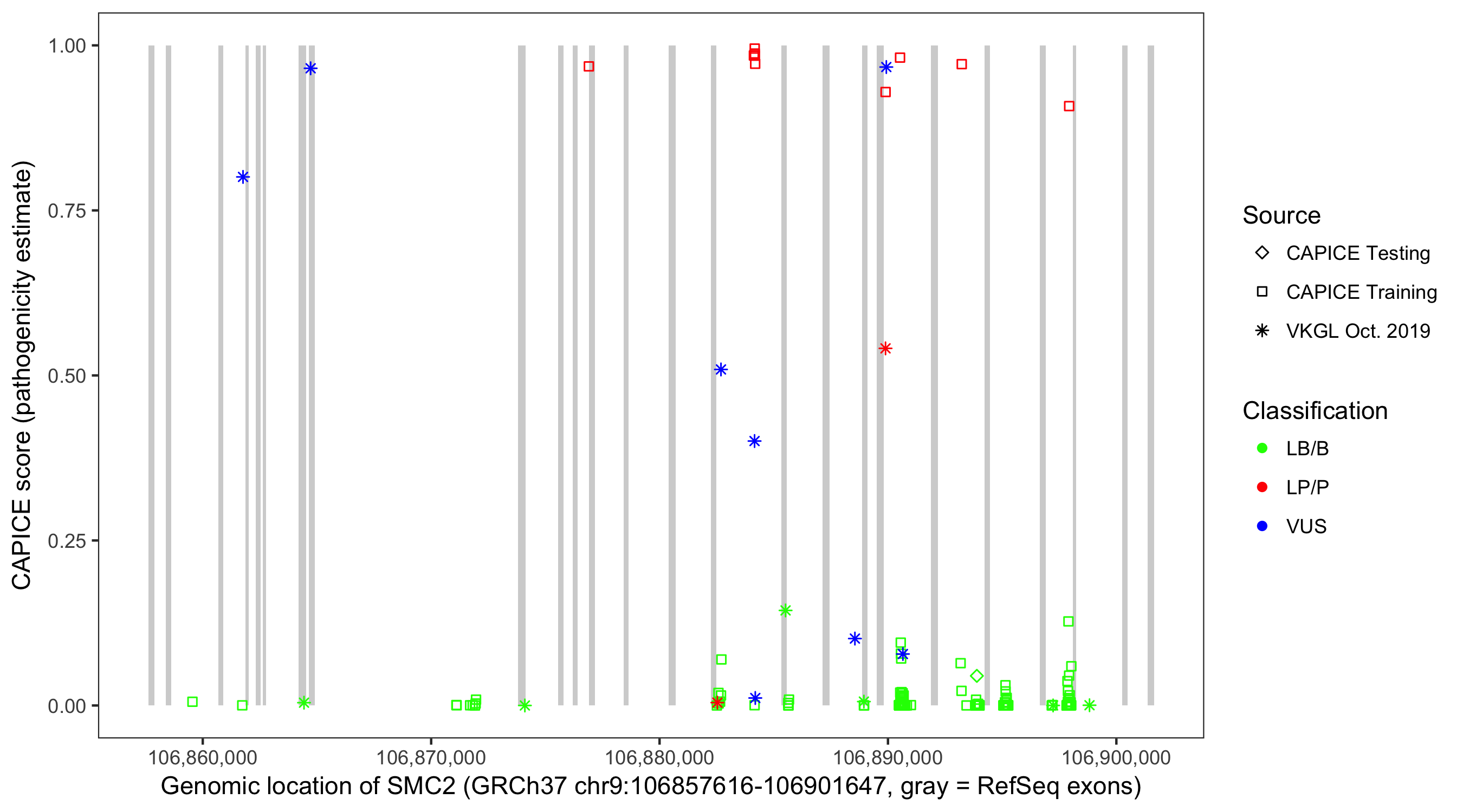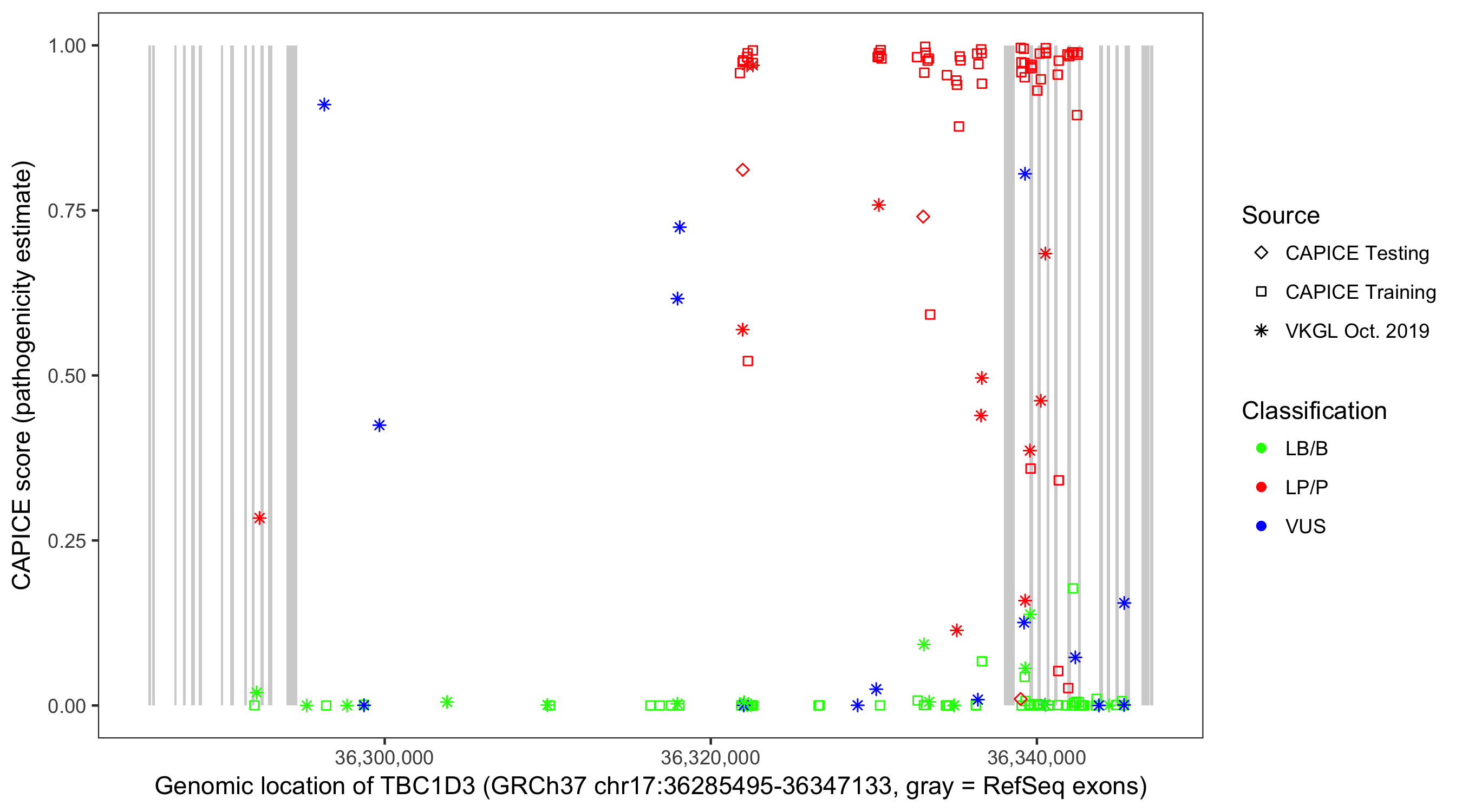 Shown are CAPICE train/test variants plus VKGL Oct 2019.