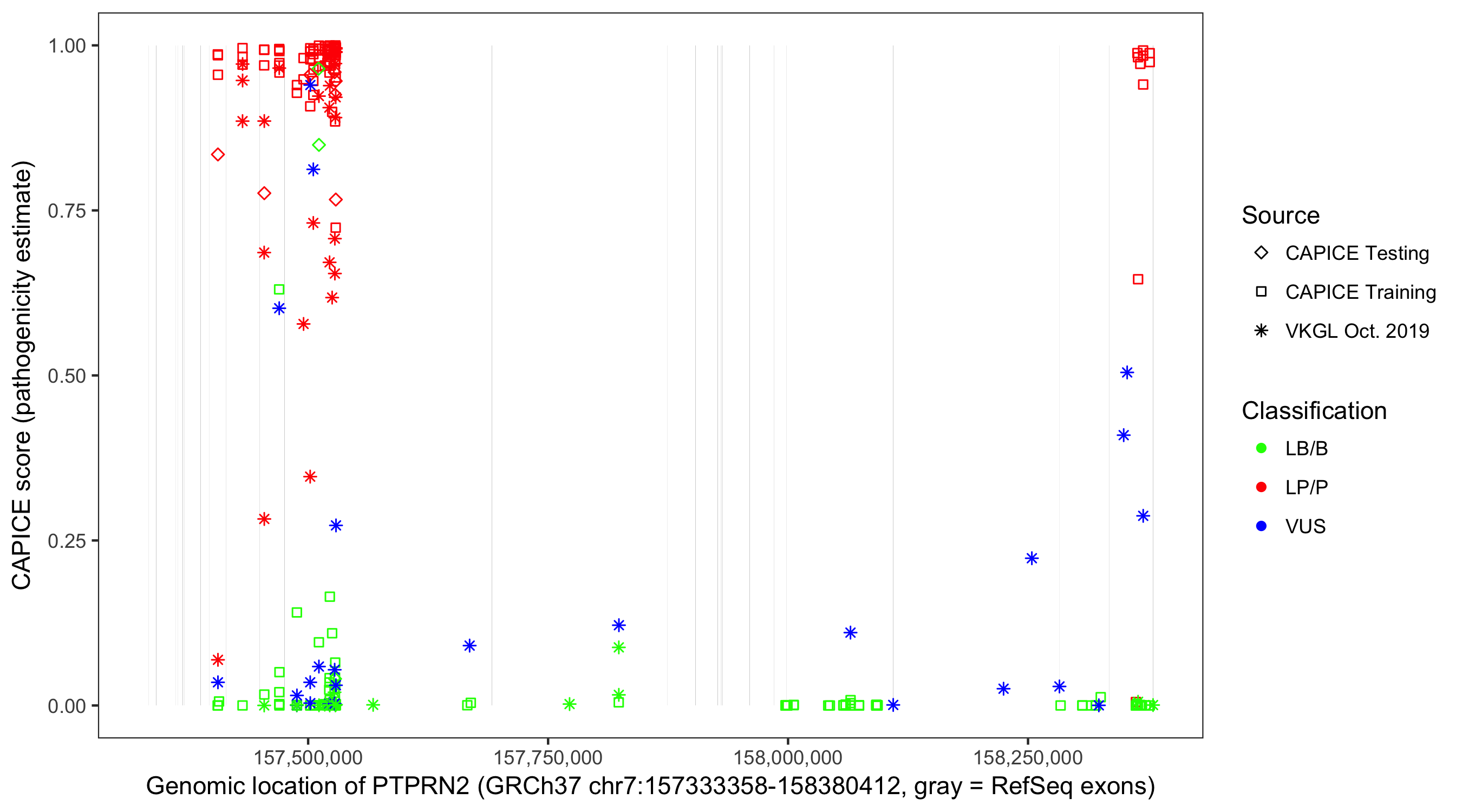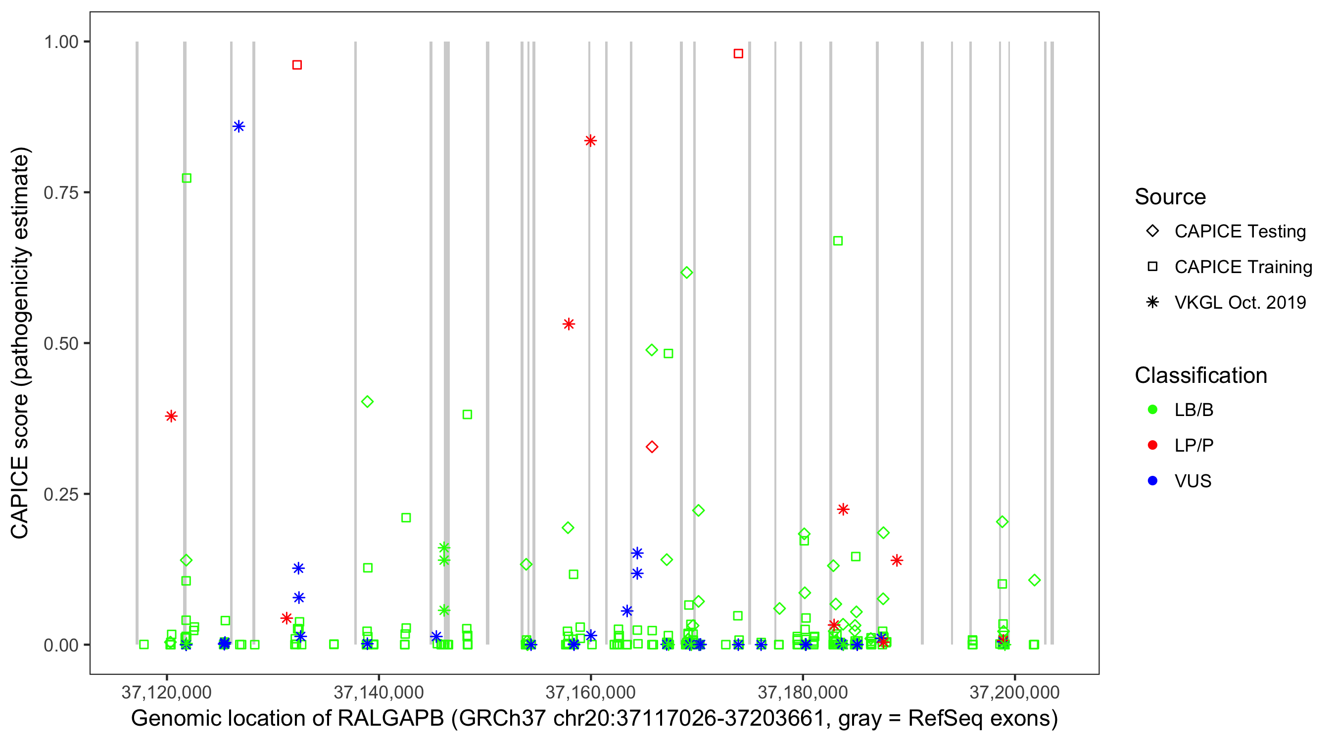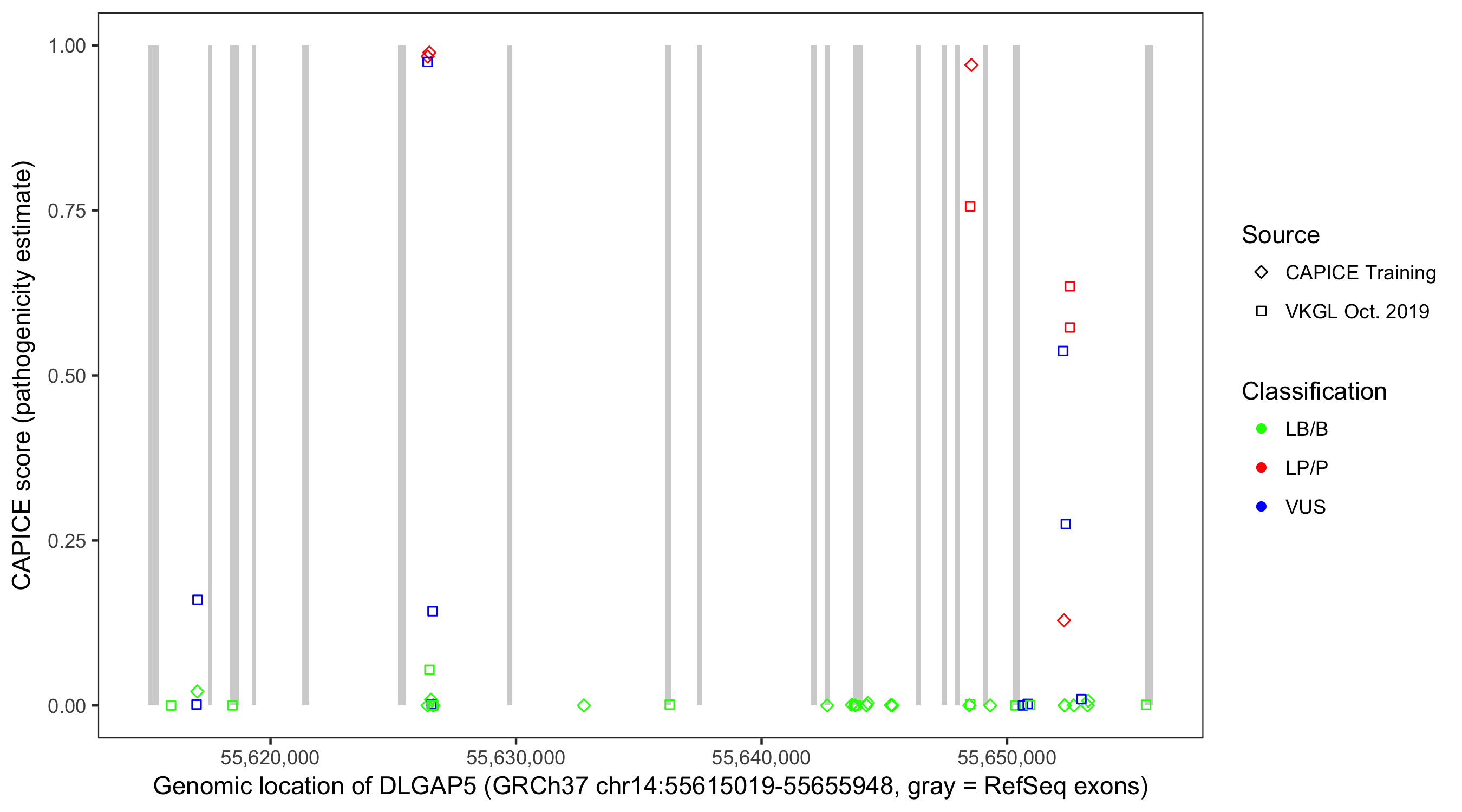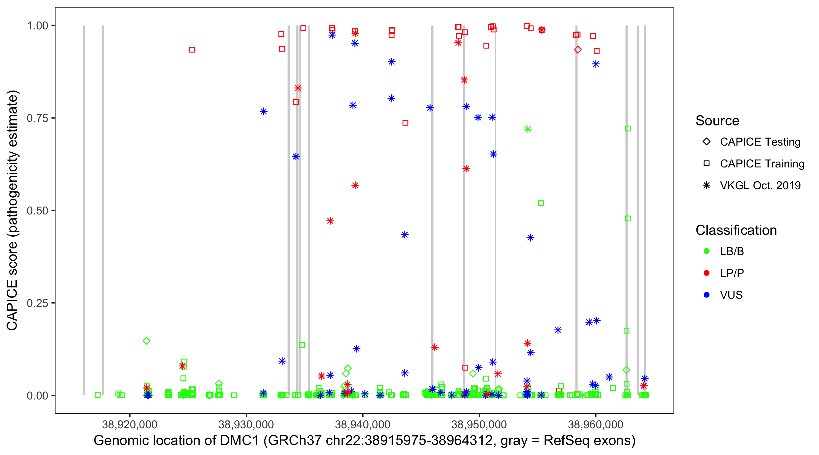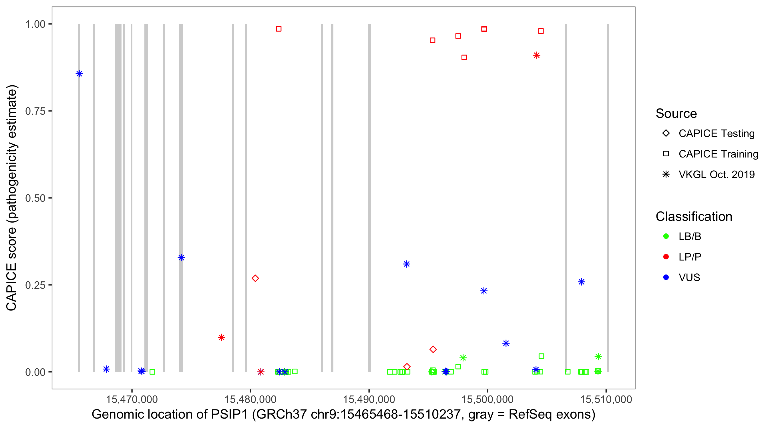 Shown are CAPICE train/test variants plus VKGL Oct 2019.