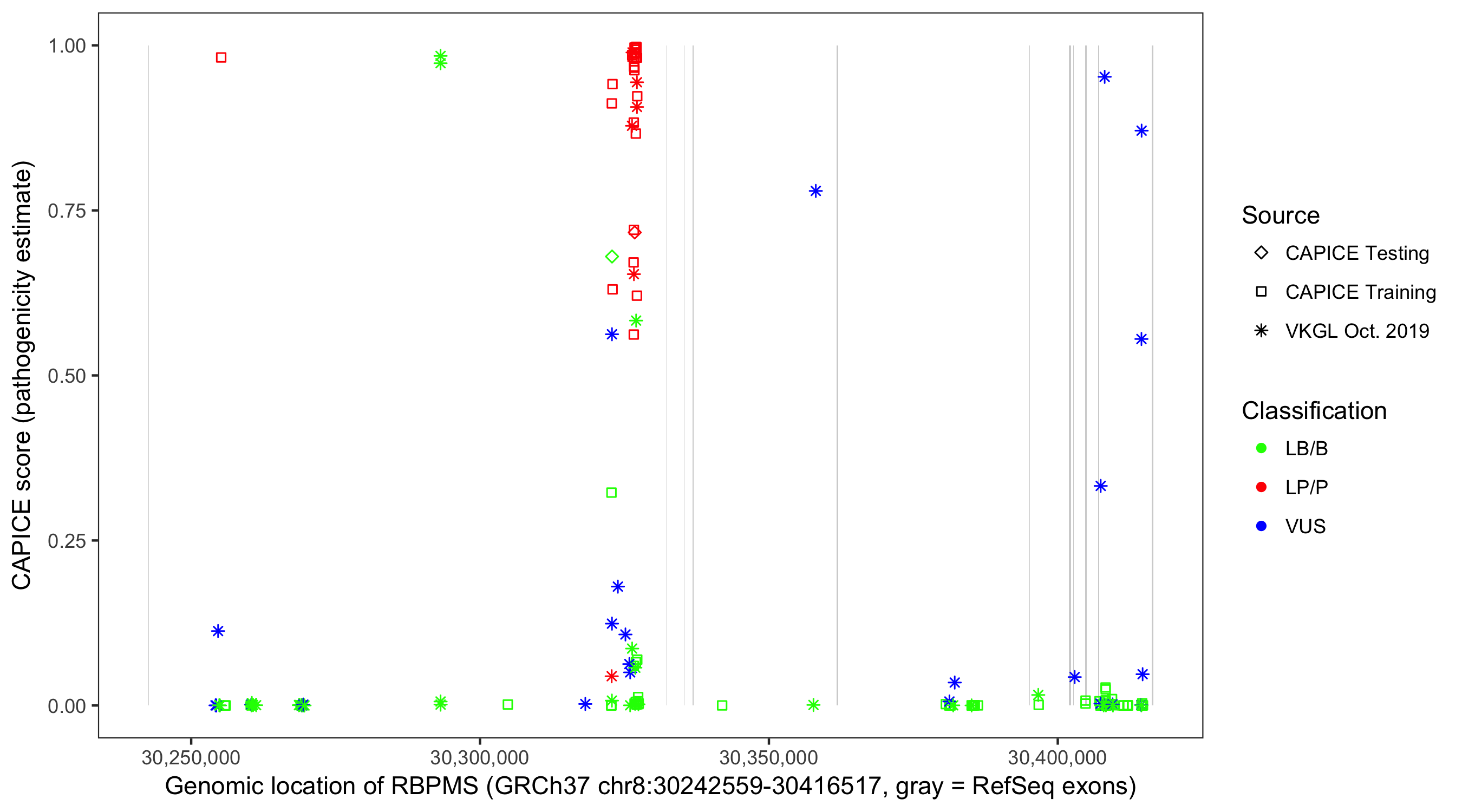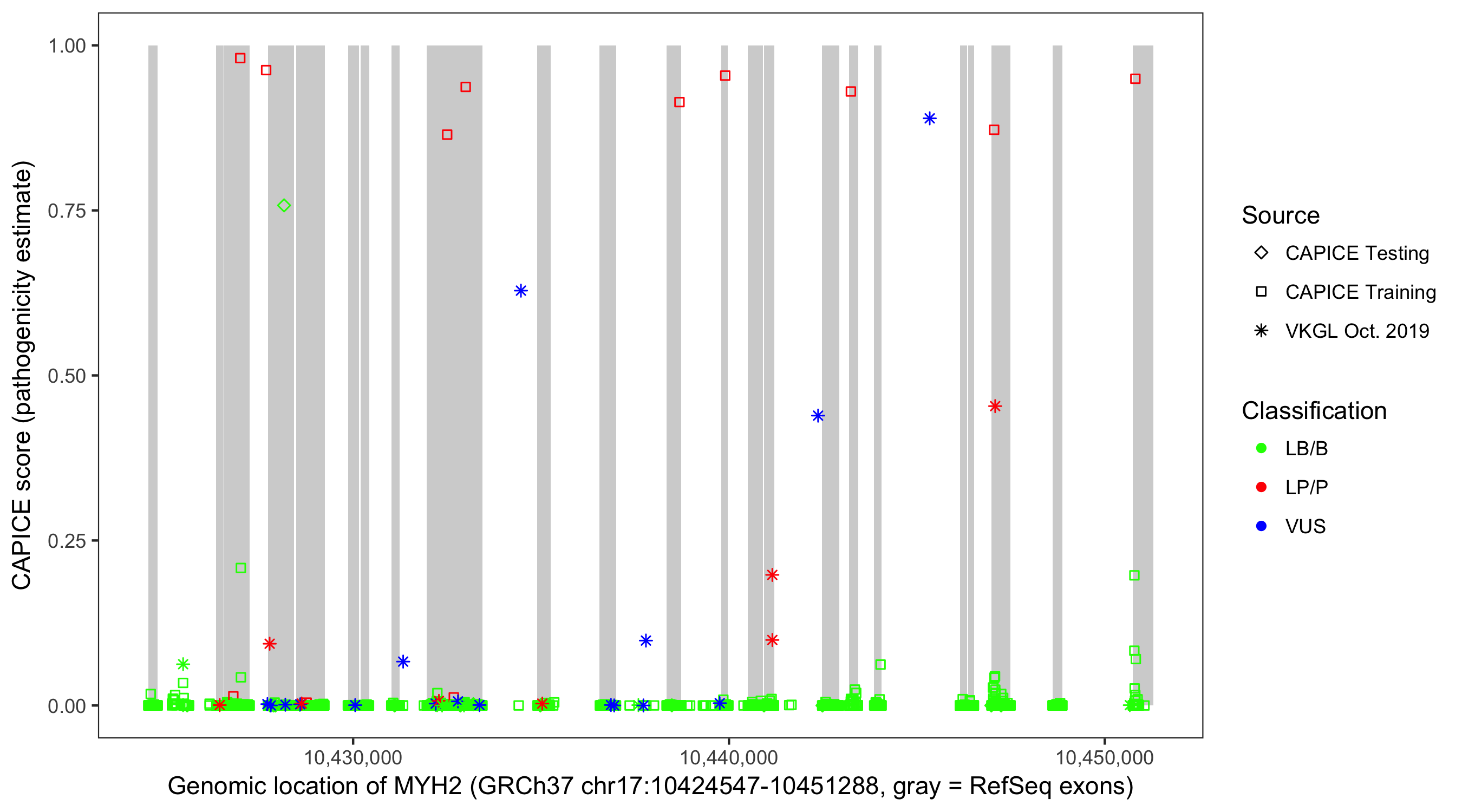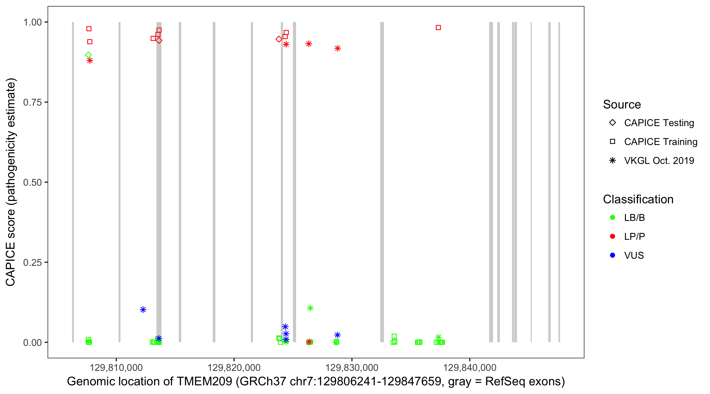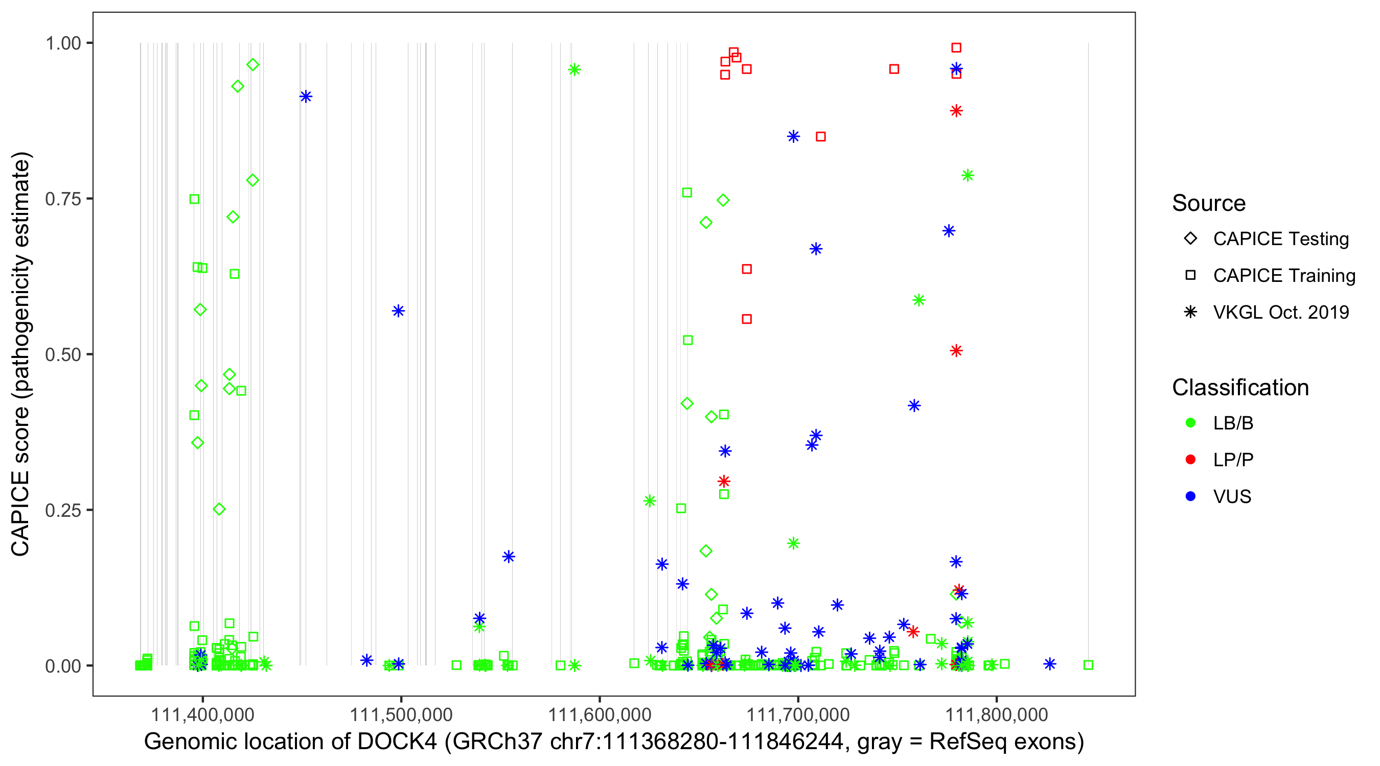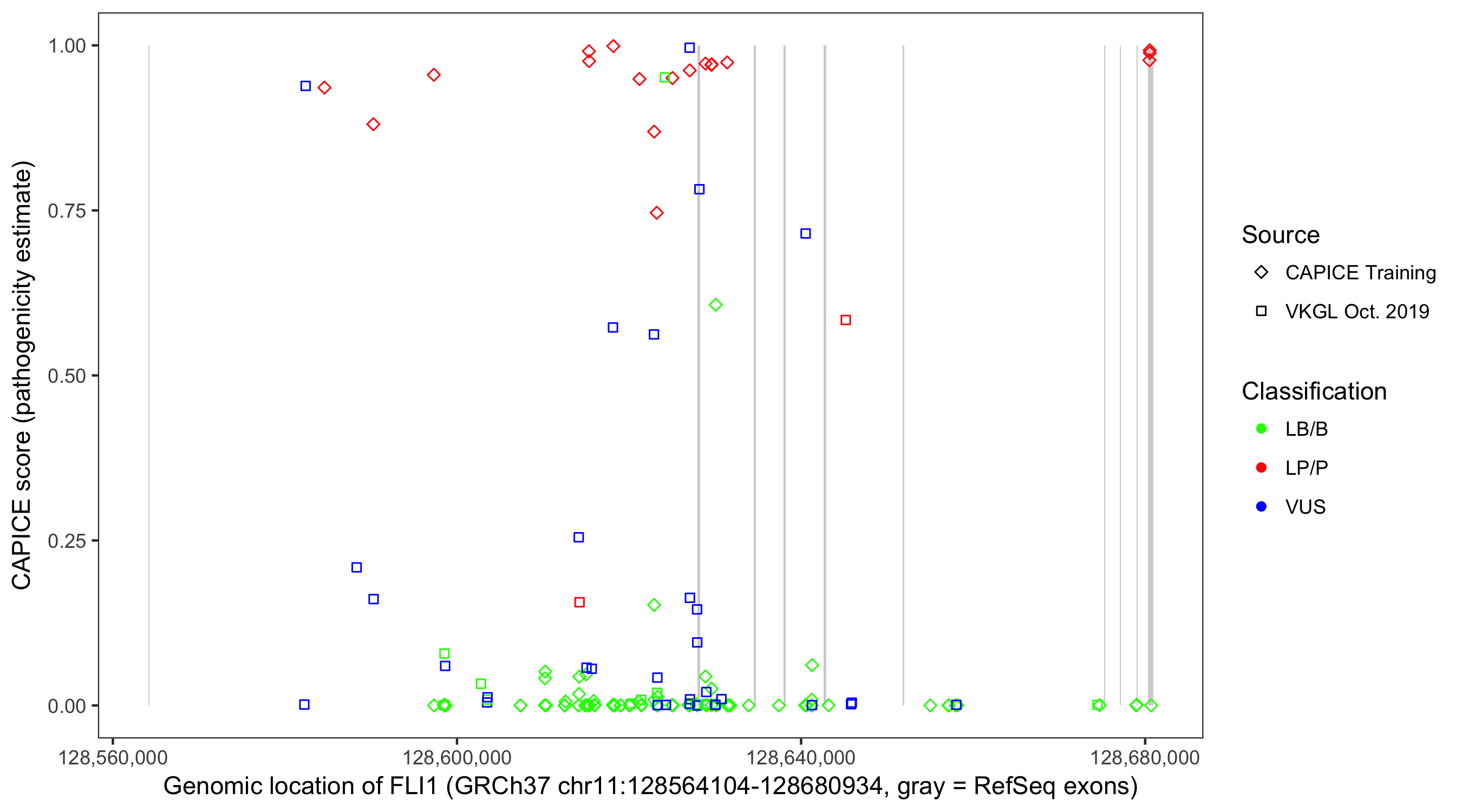 Shown are CAPICE train/test variants plus VKGL Oct 2019.