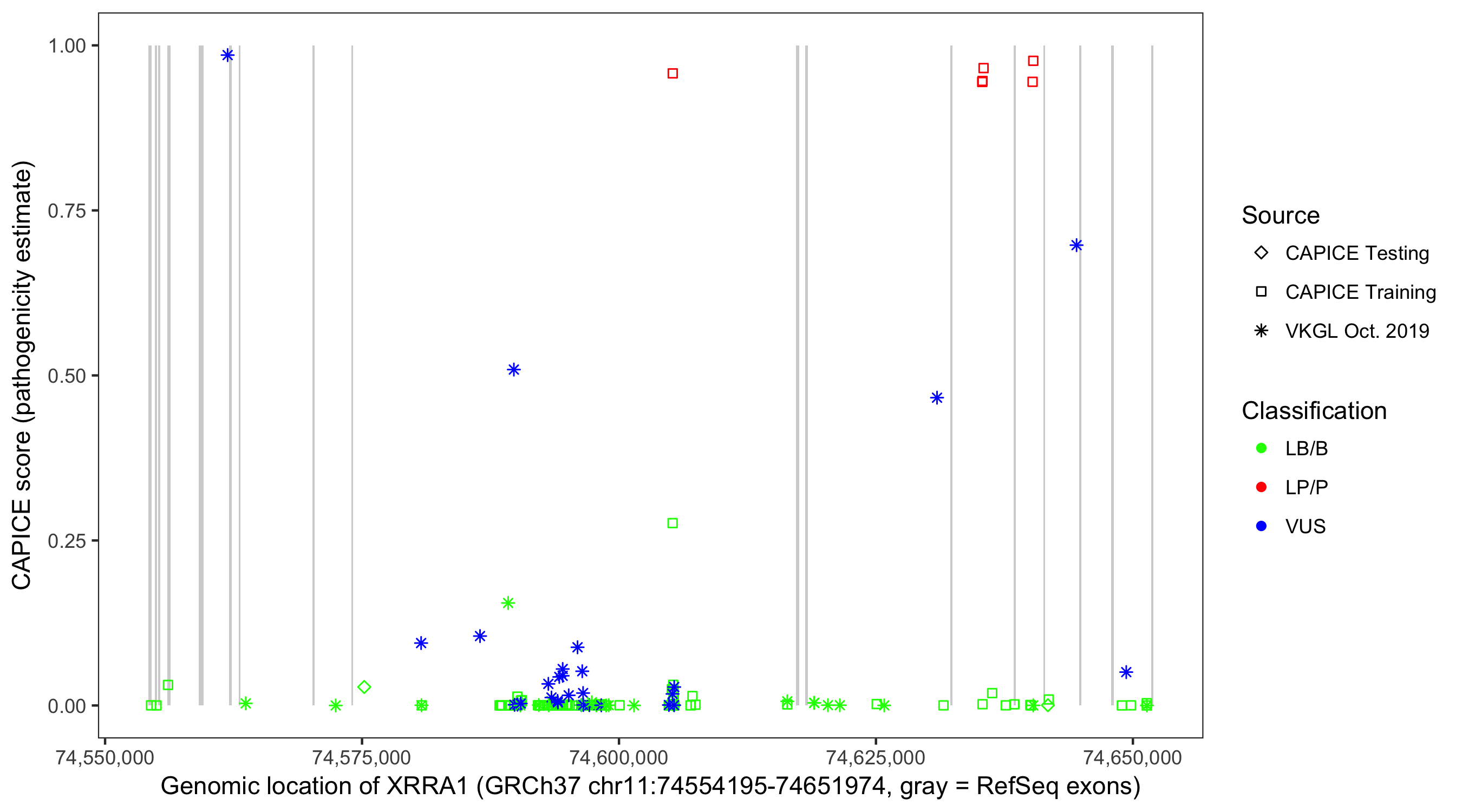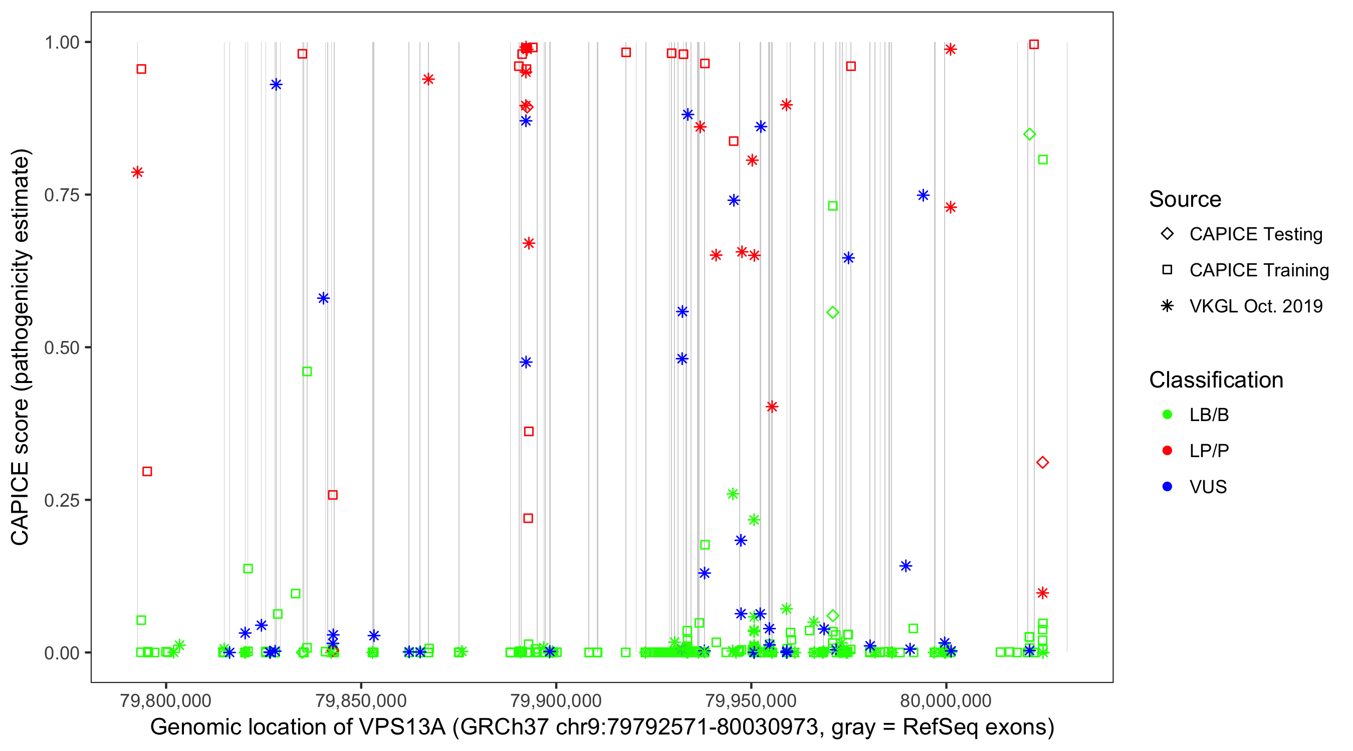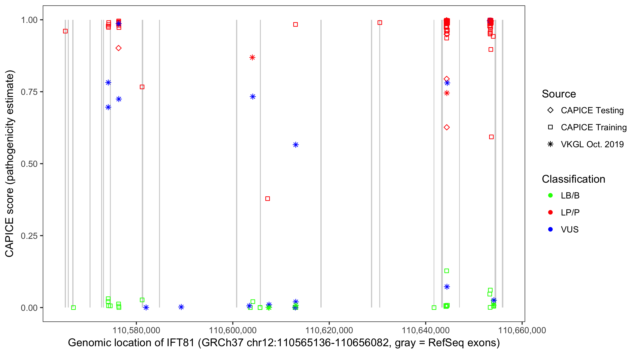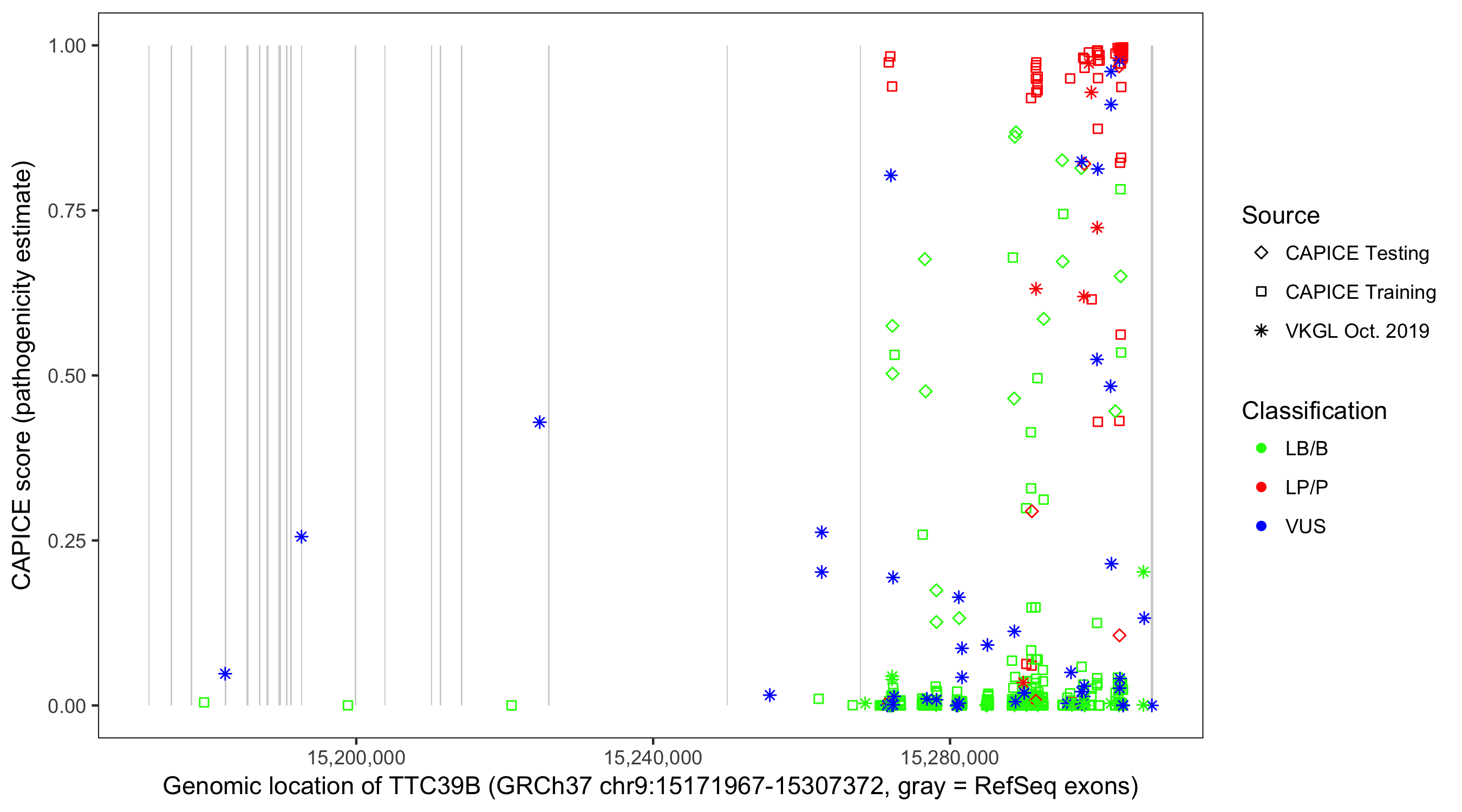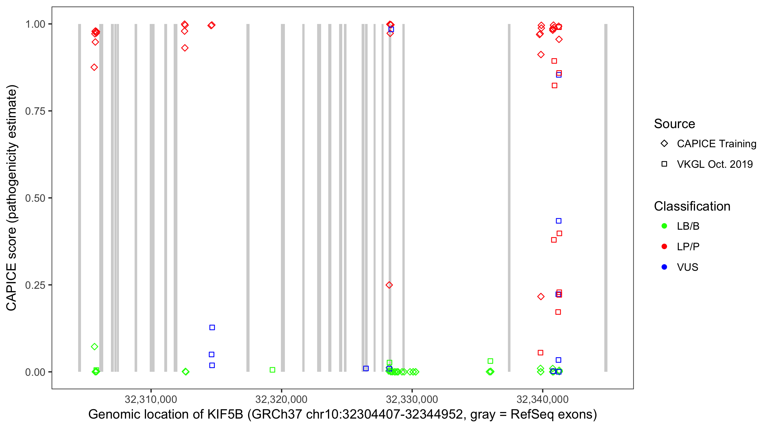 Shown are CAPICE train/test variants plus VKGL Oct 2019.