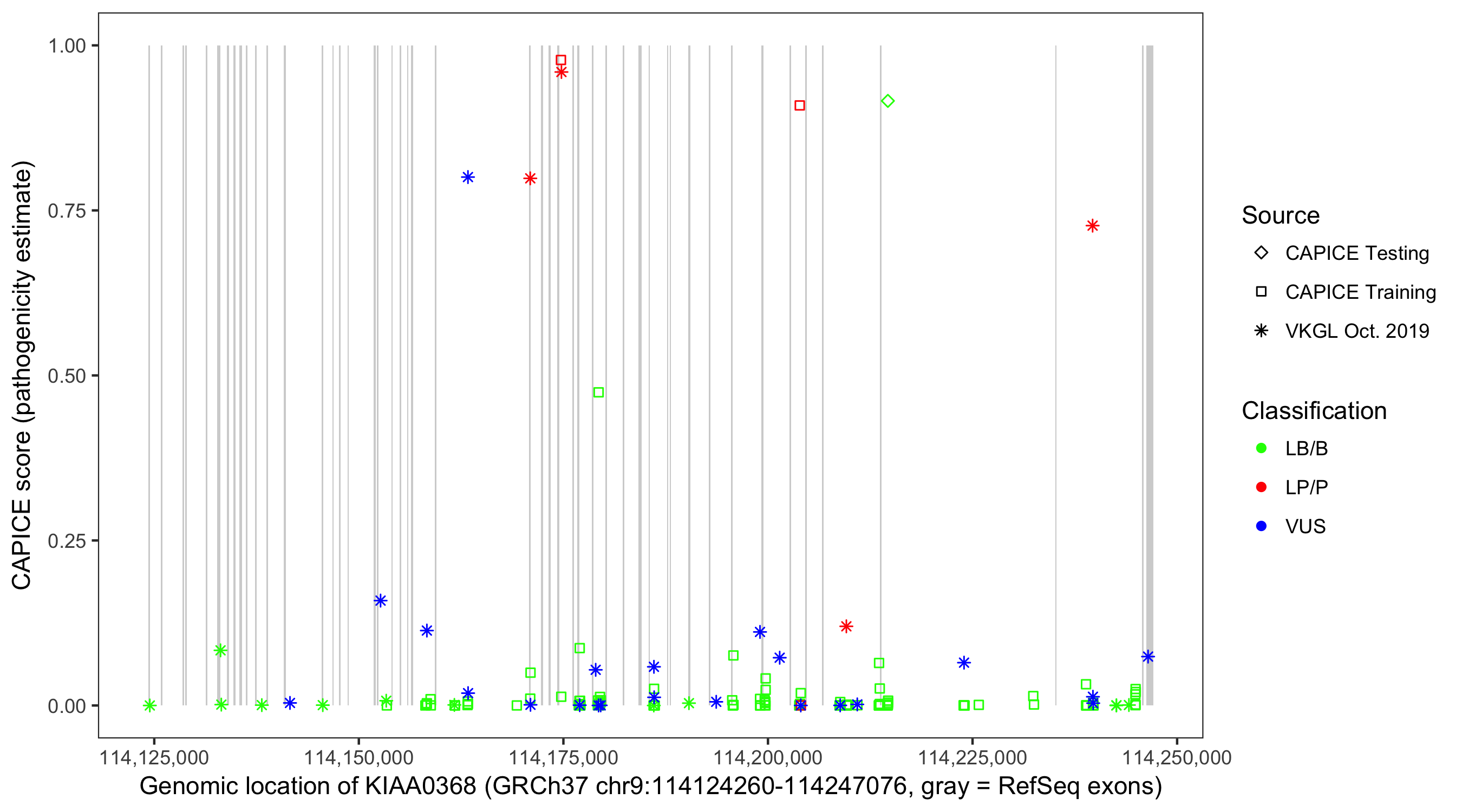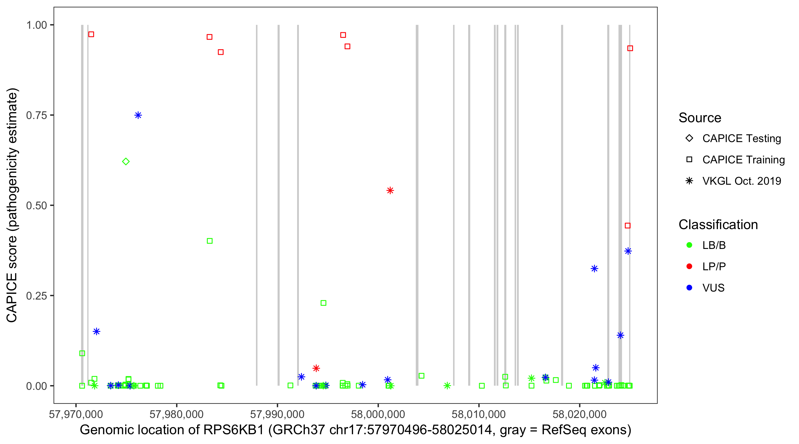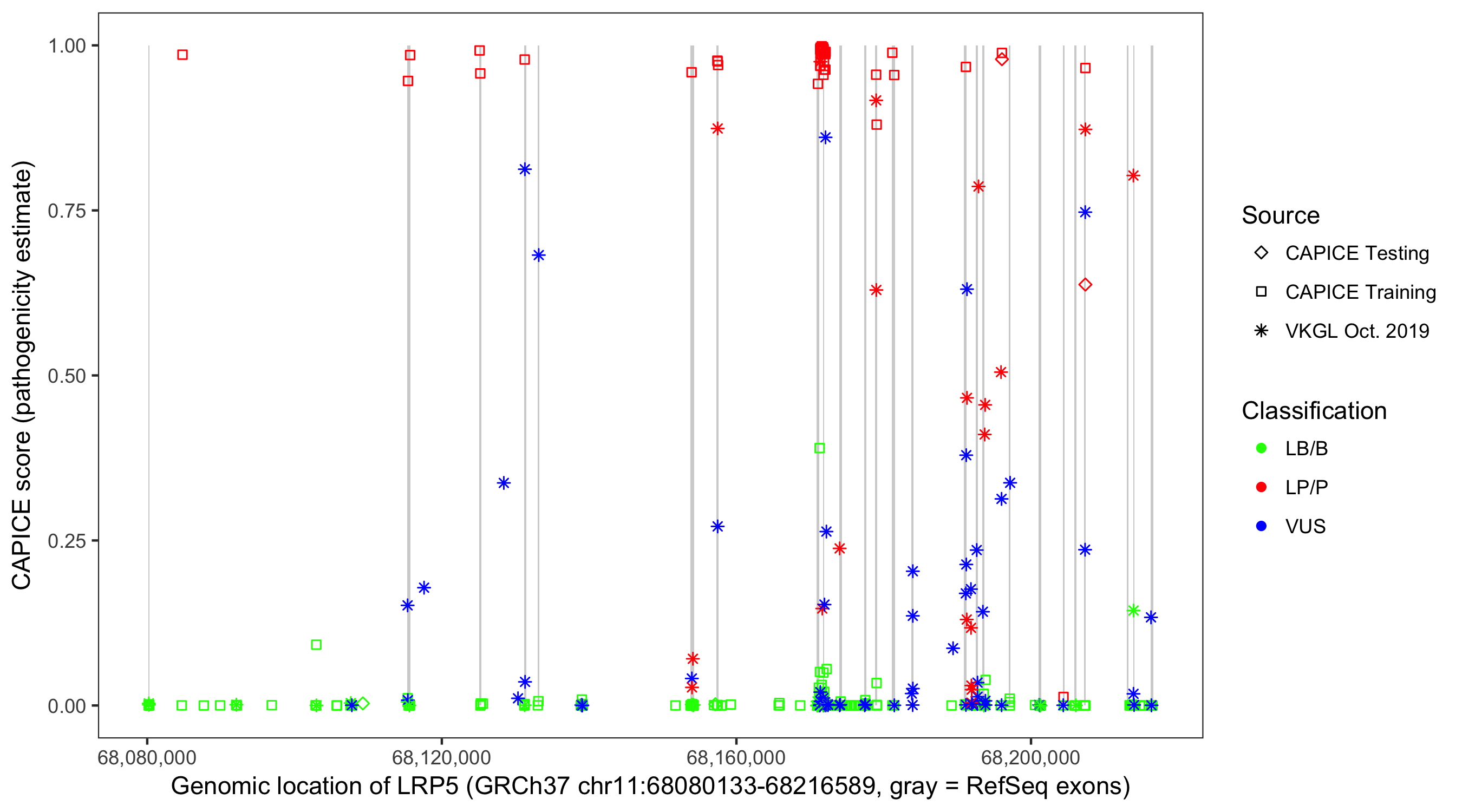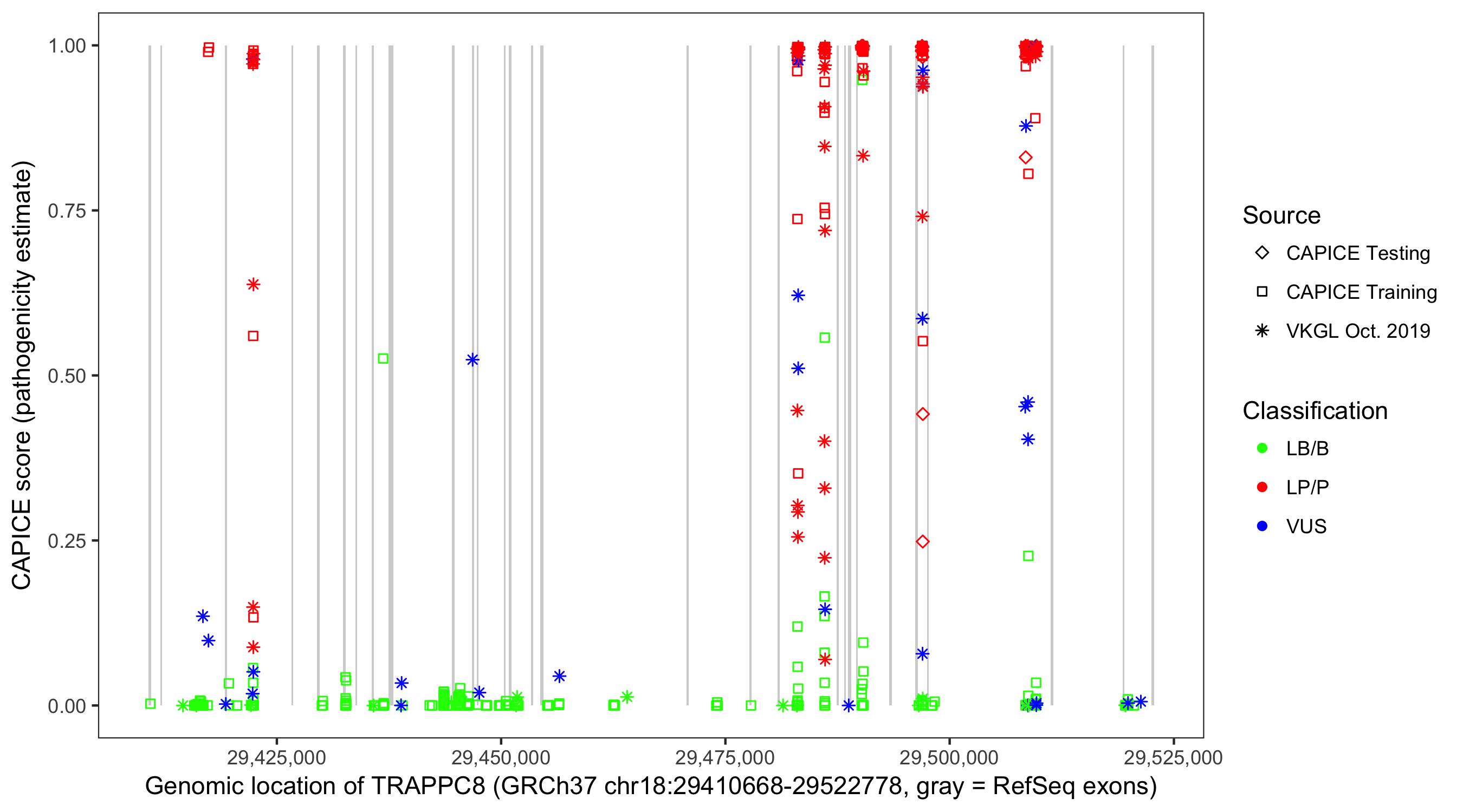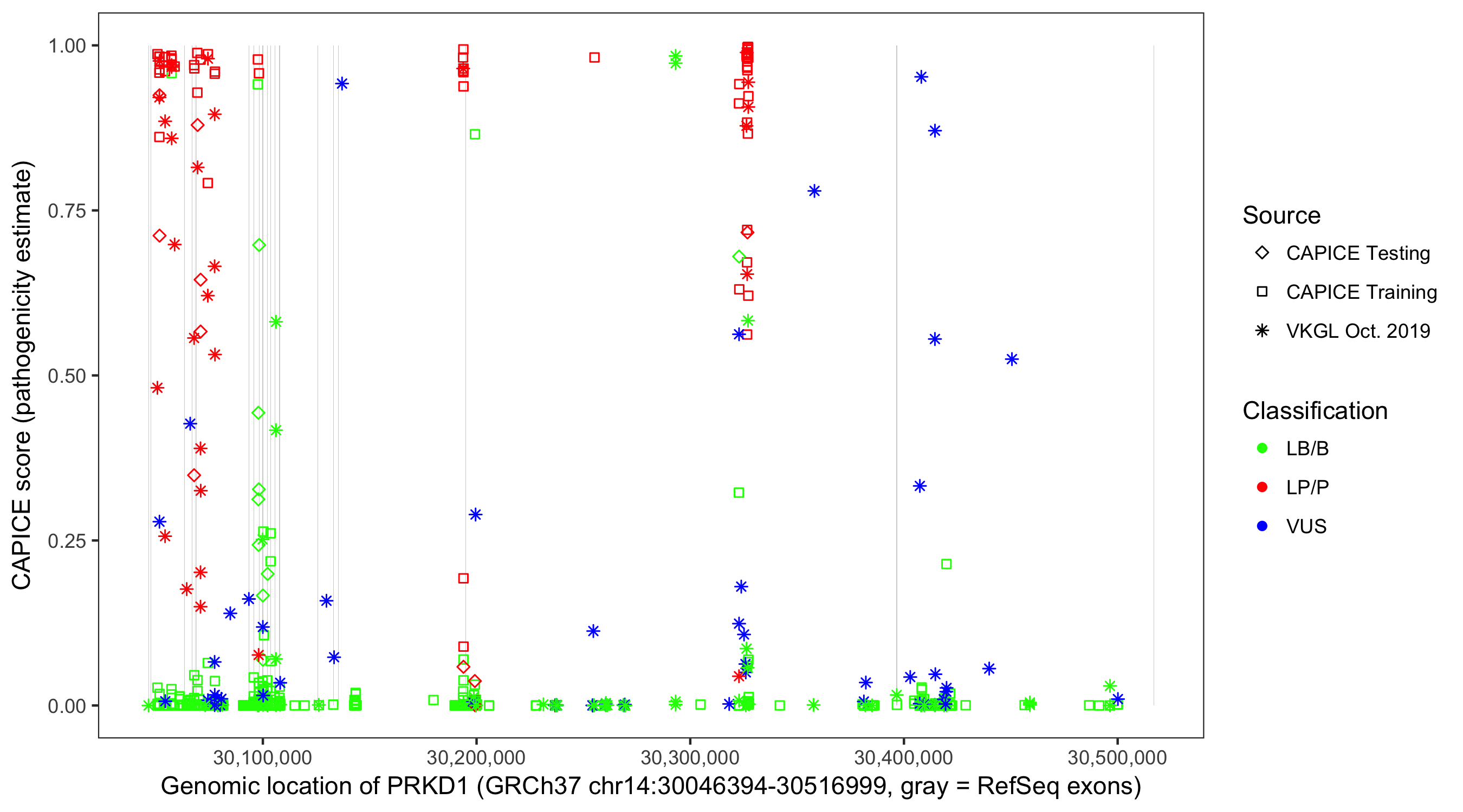Shown are CAPICE train/test variants plus VKGL Oct 2019.