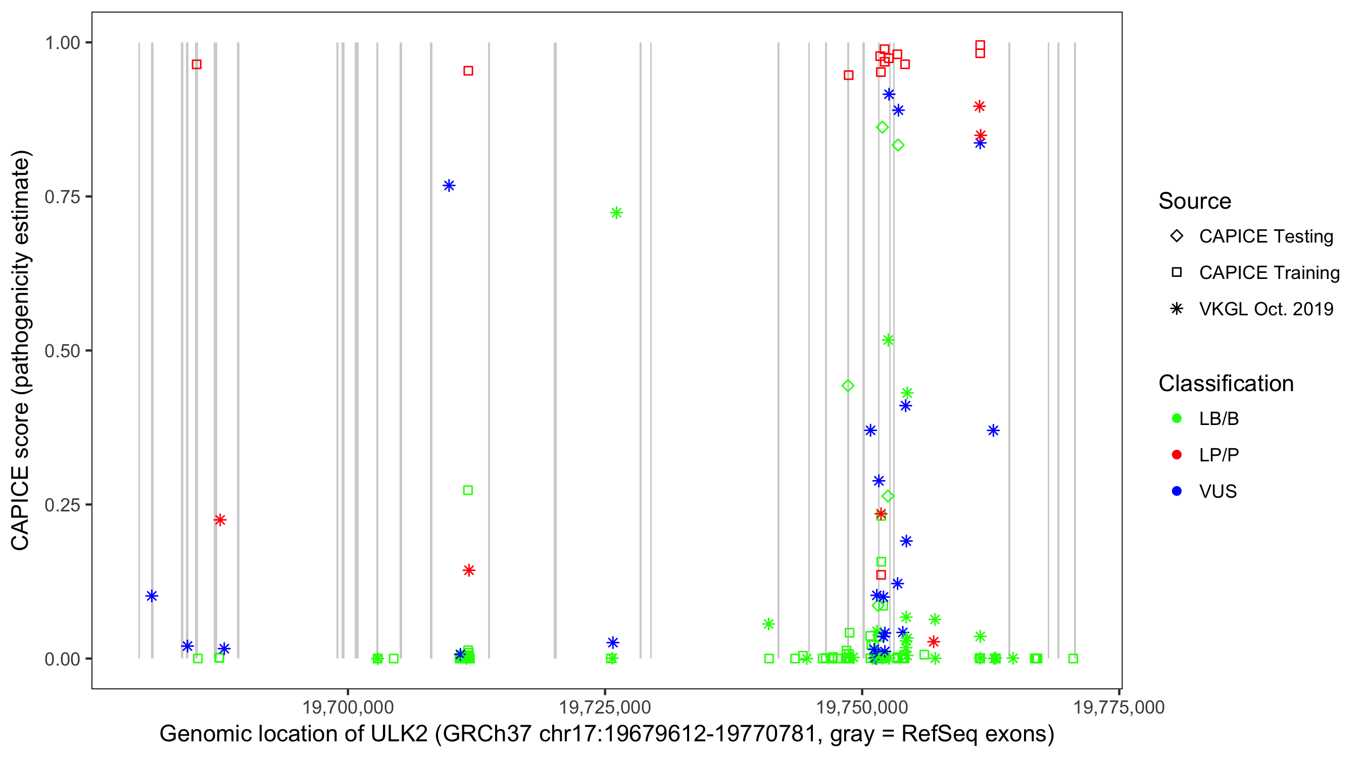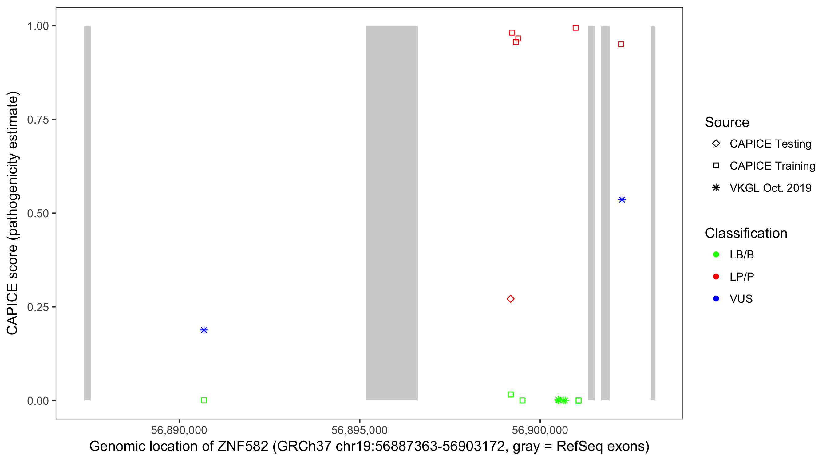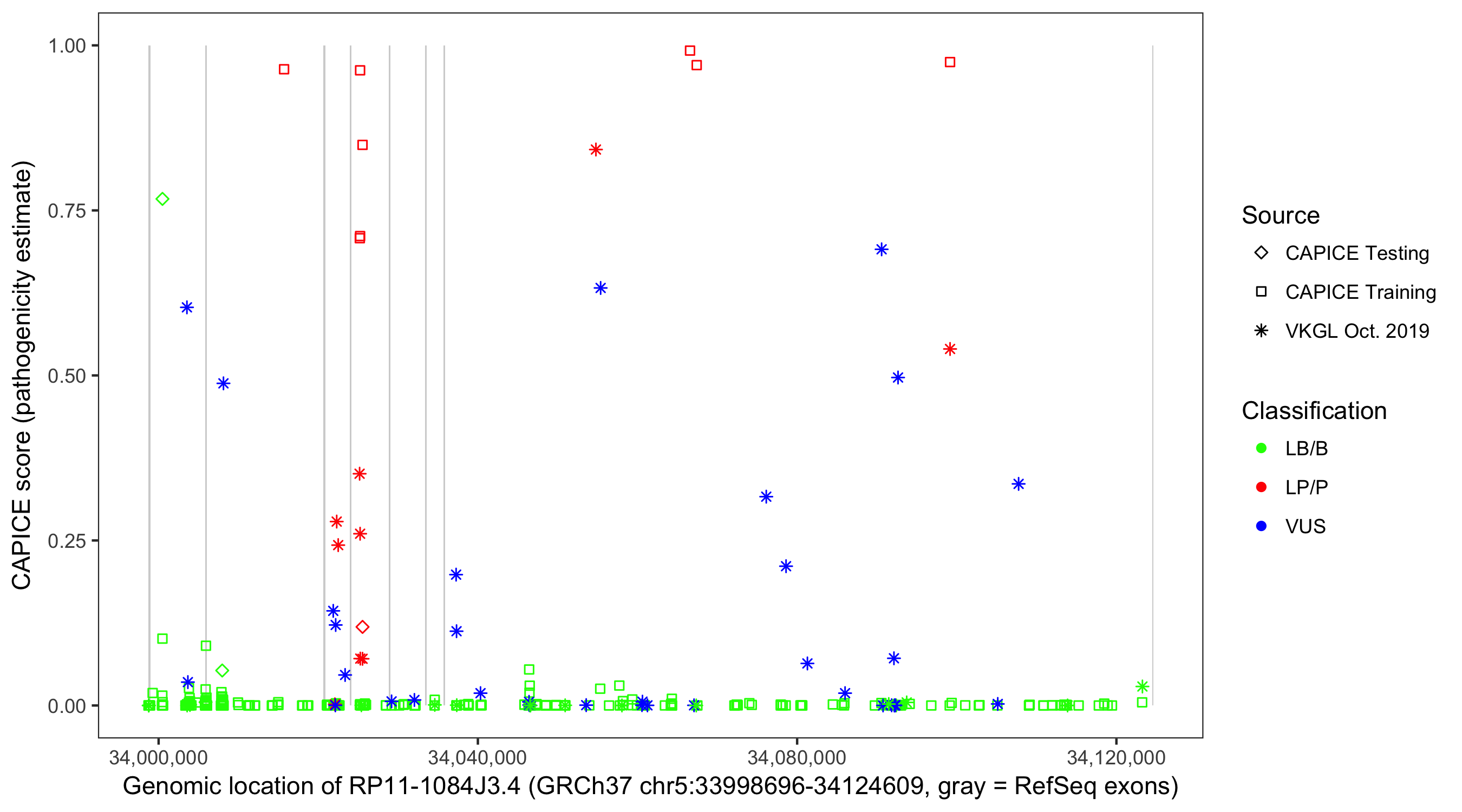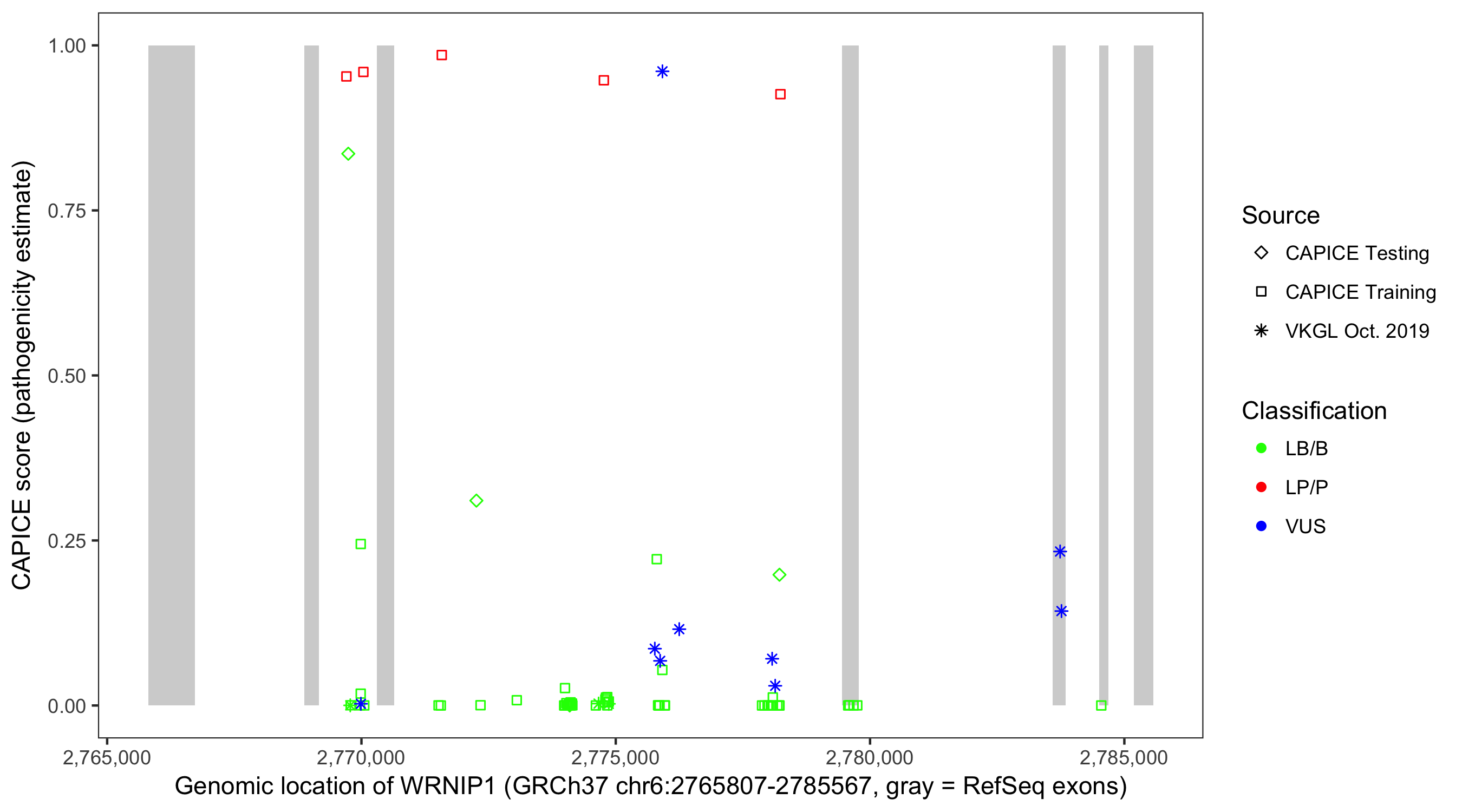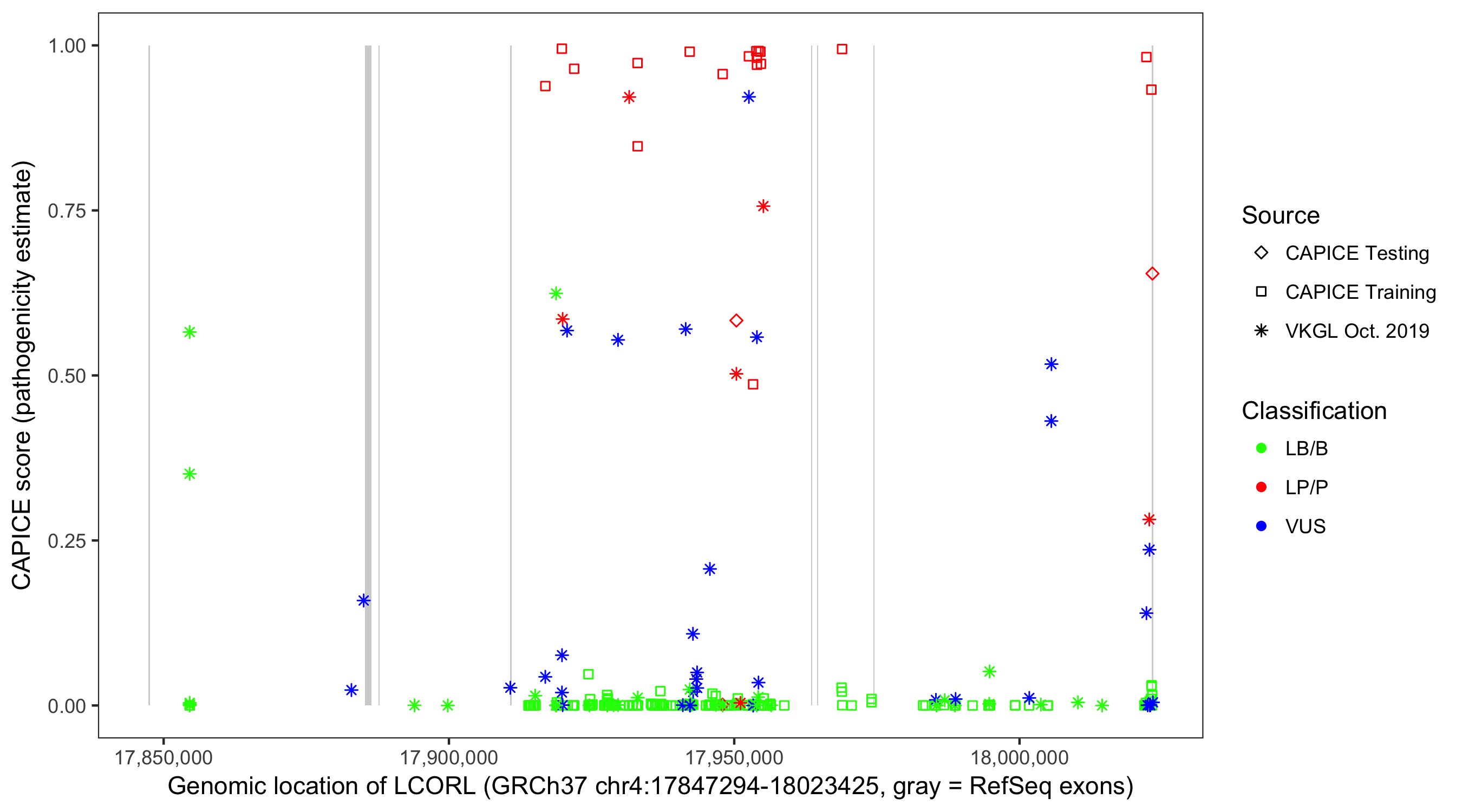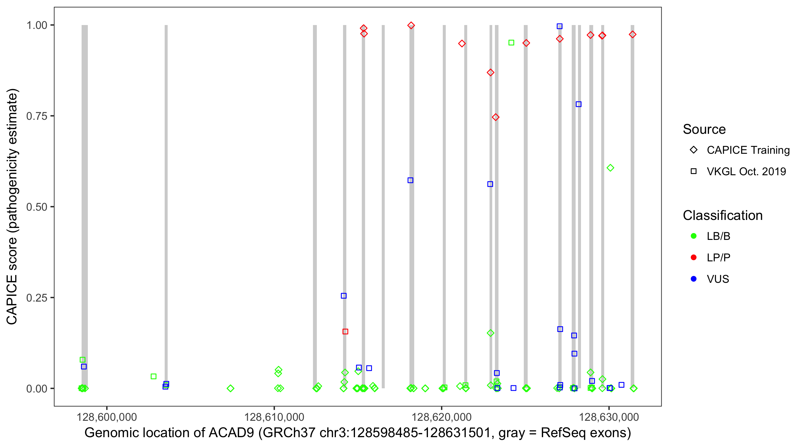 Shown are CAPICE train/test variants plus VKGL Oct 2019.