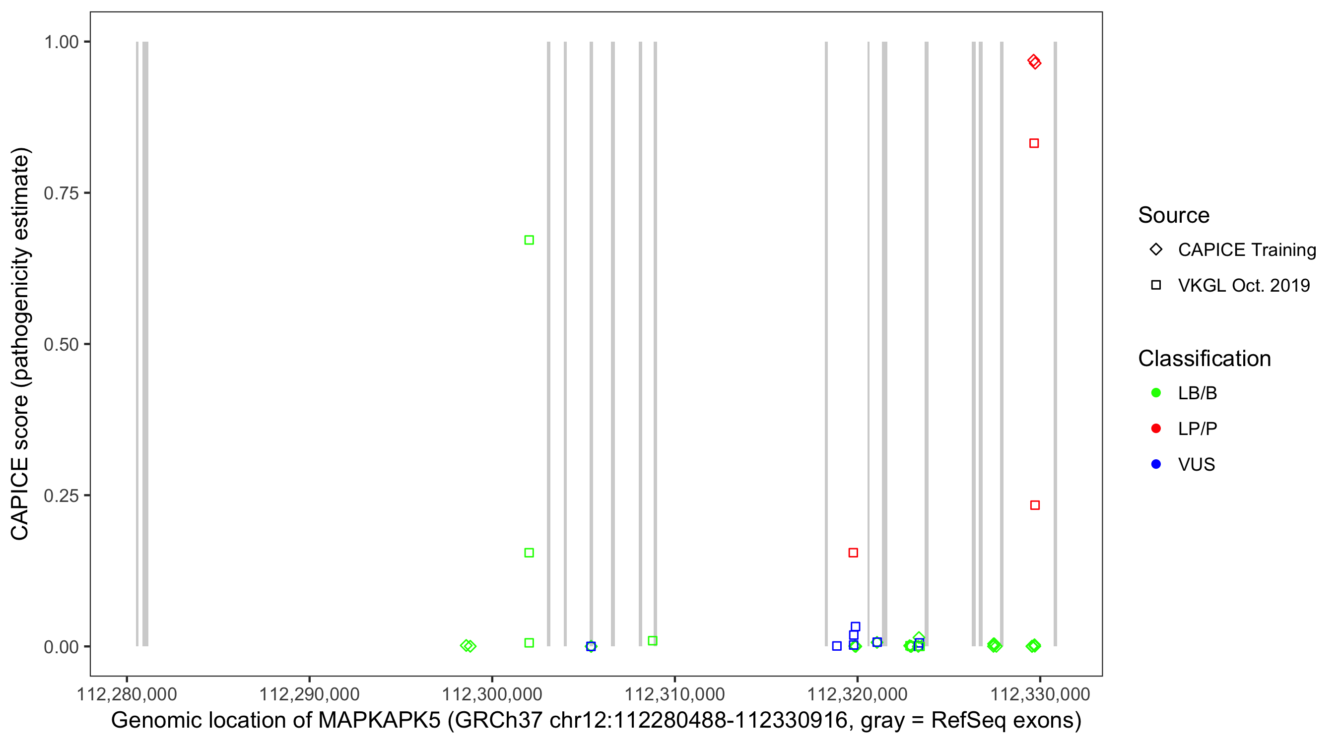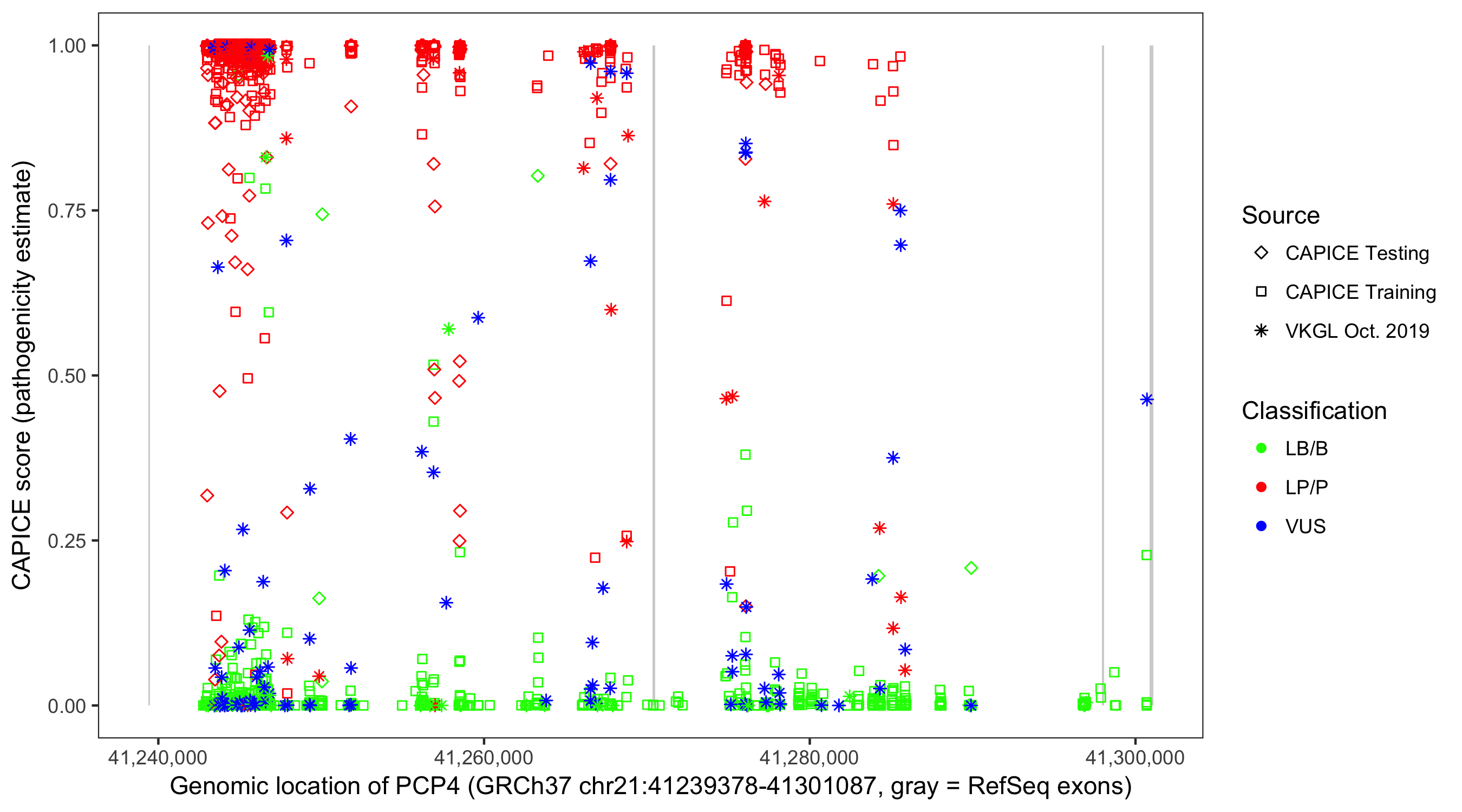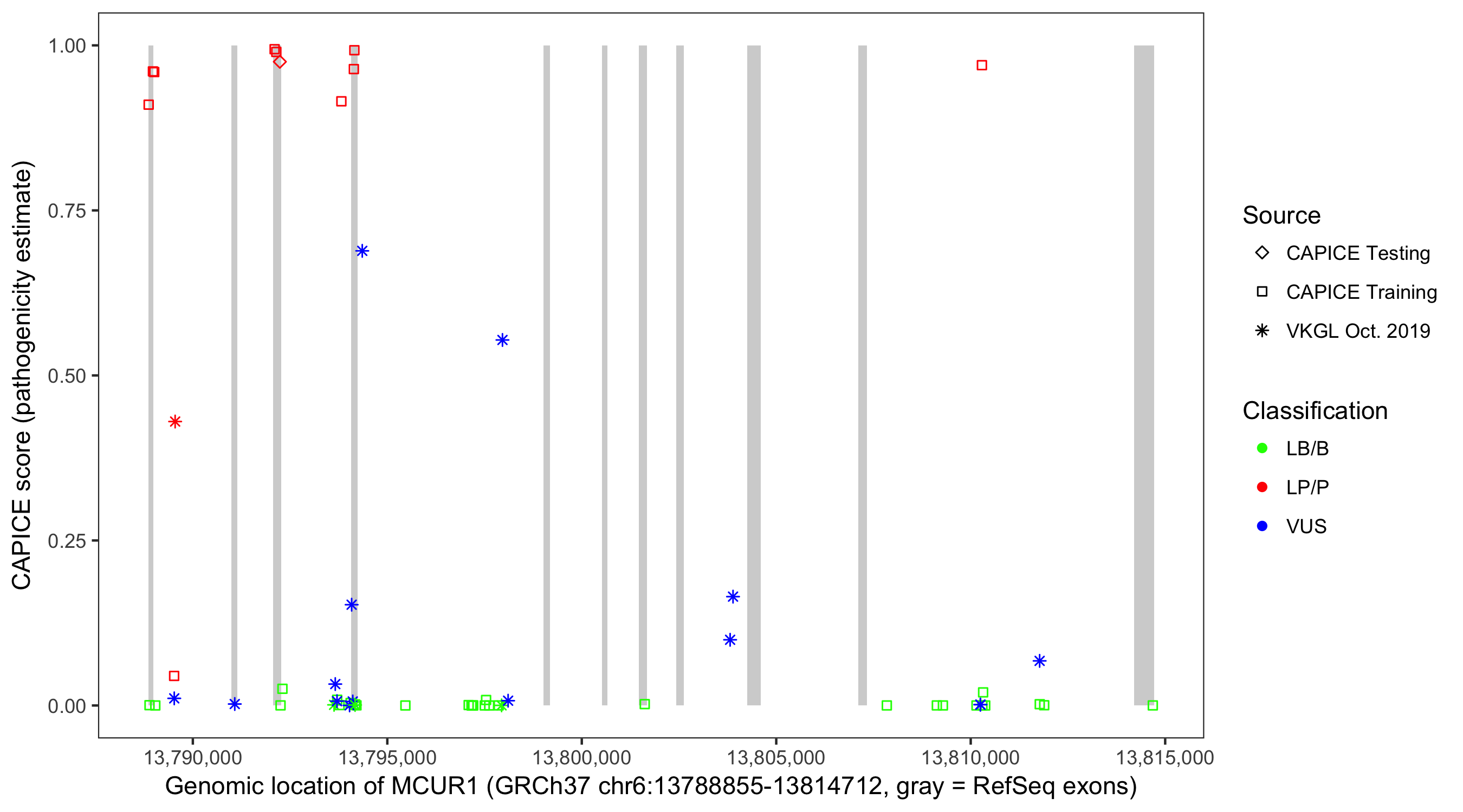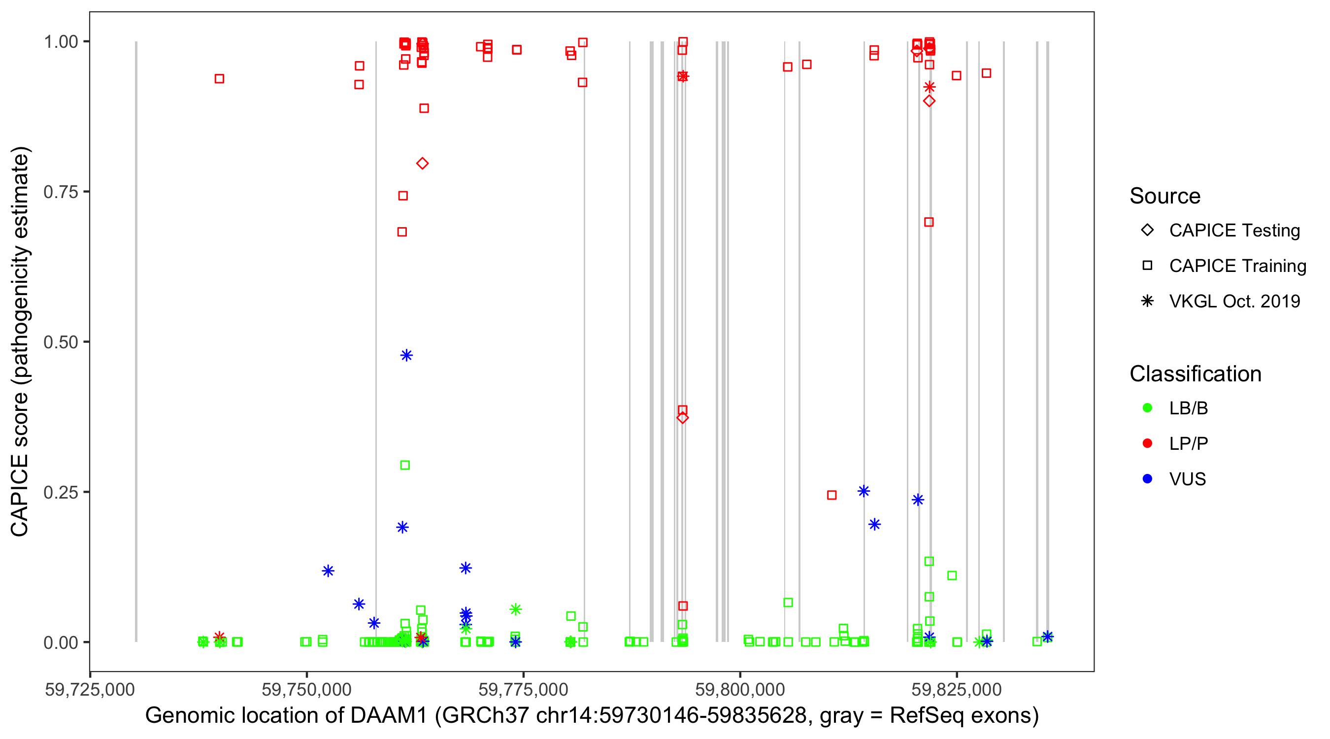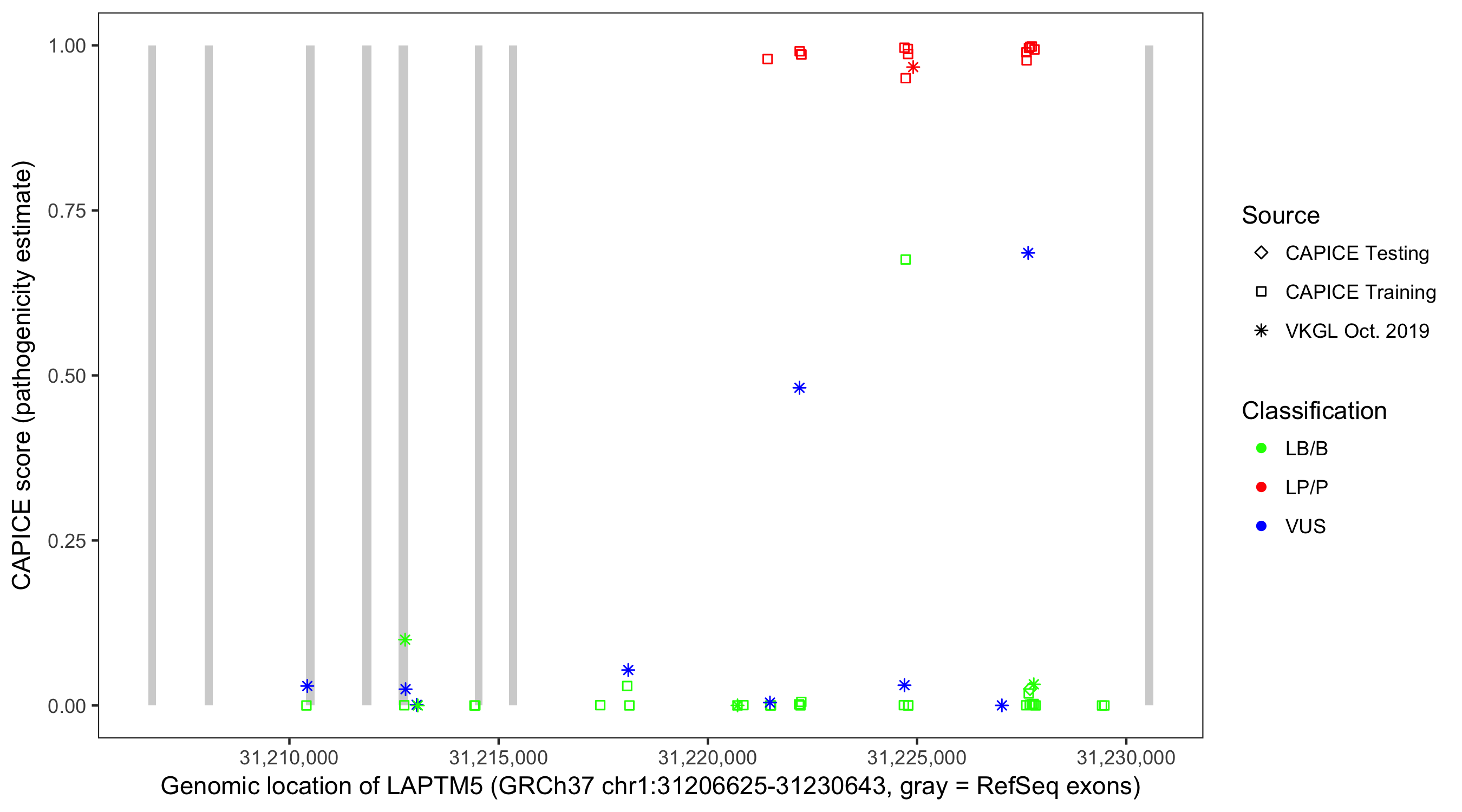Shown are CAPICE train/test variants plus VKGL Oct 2019.