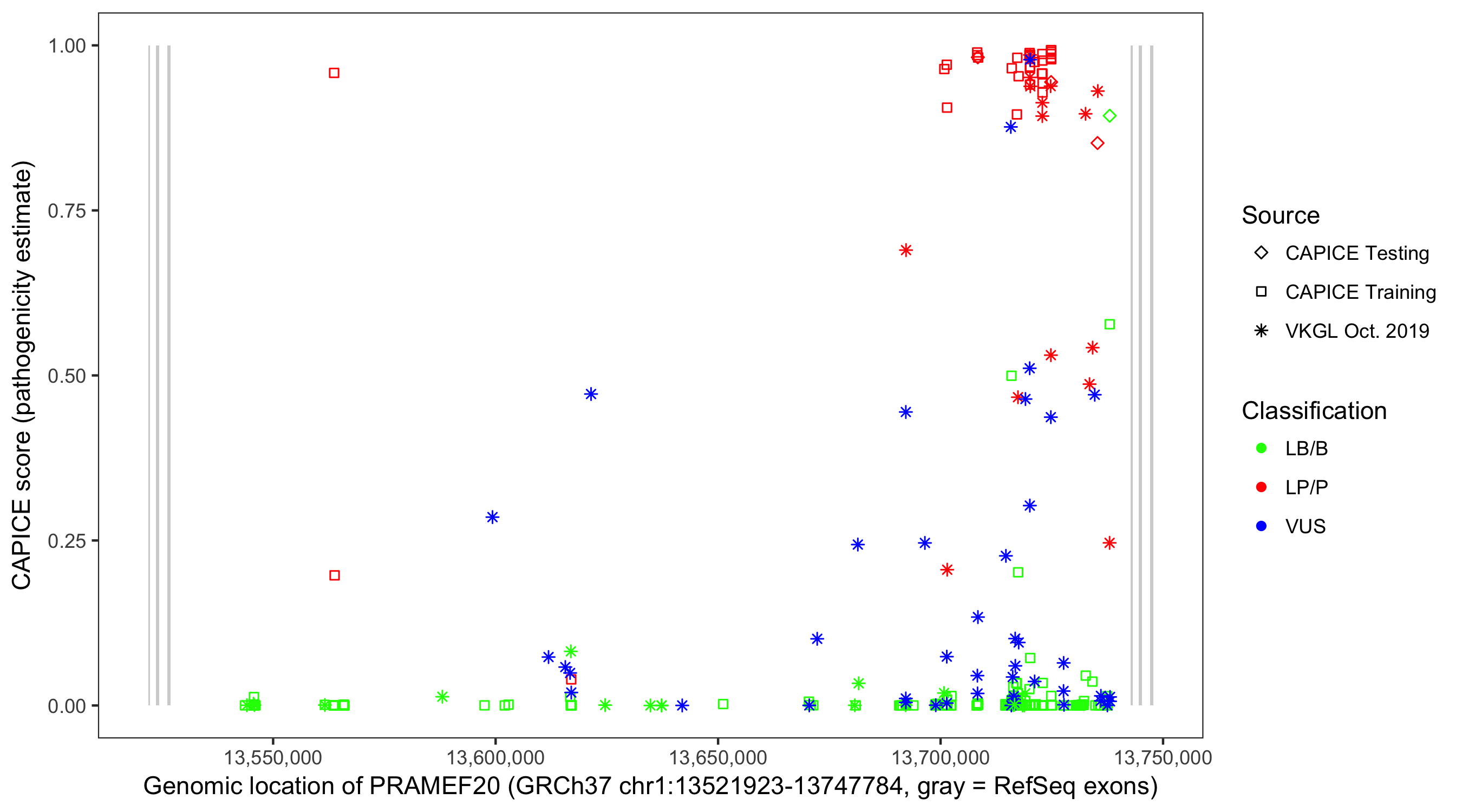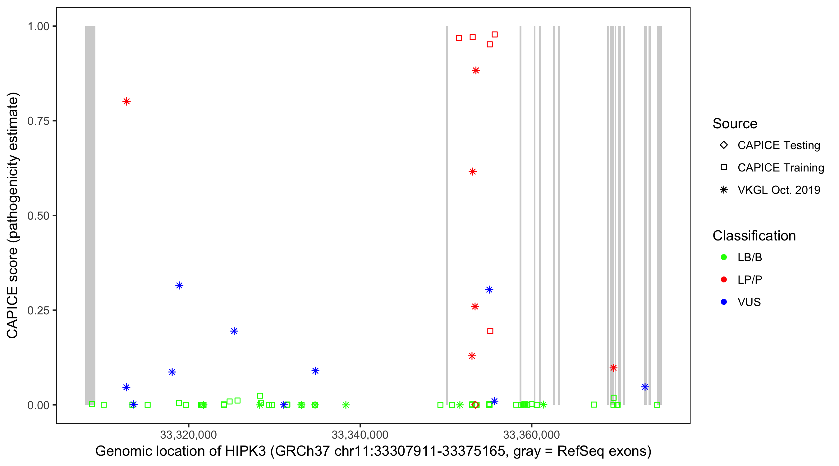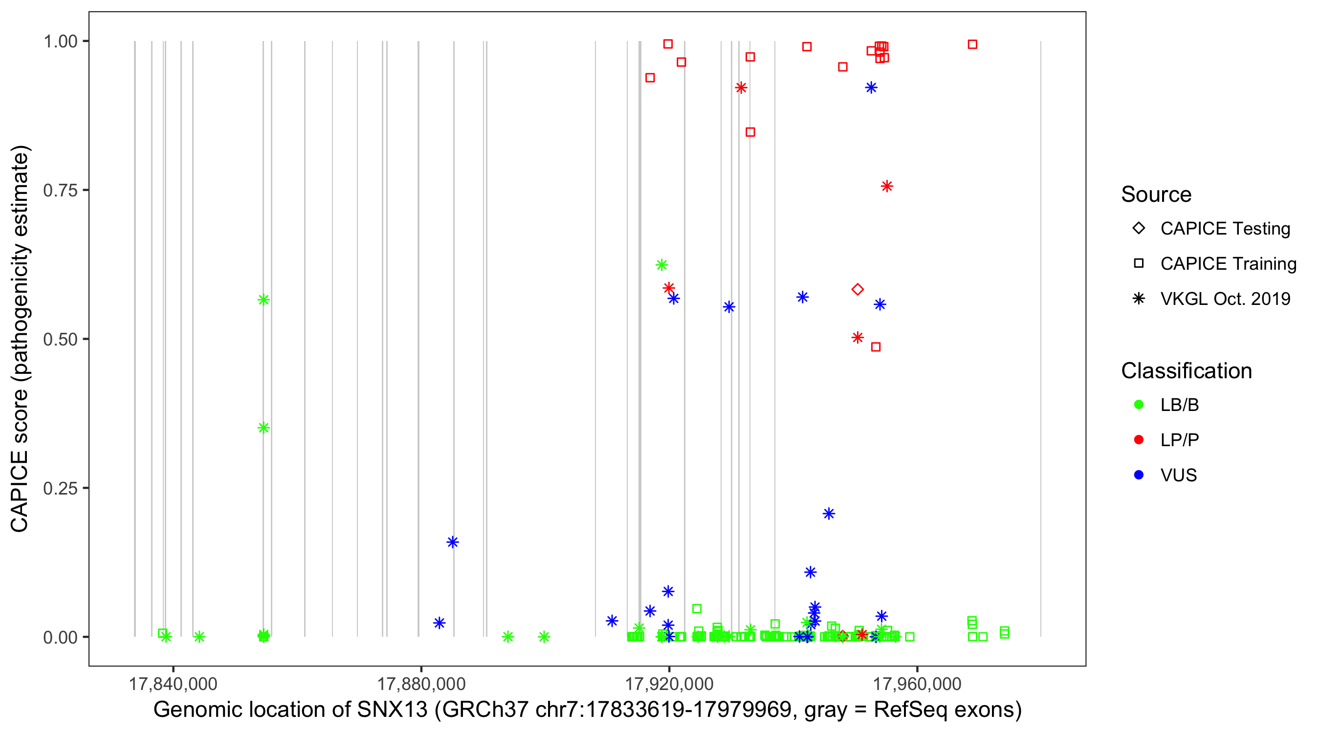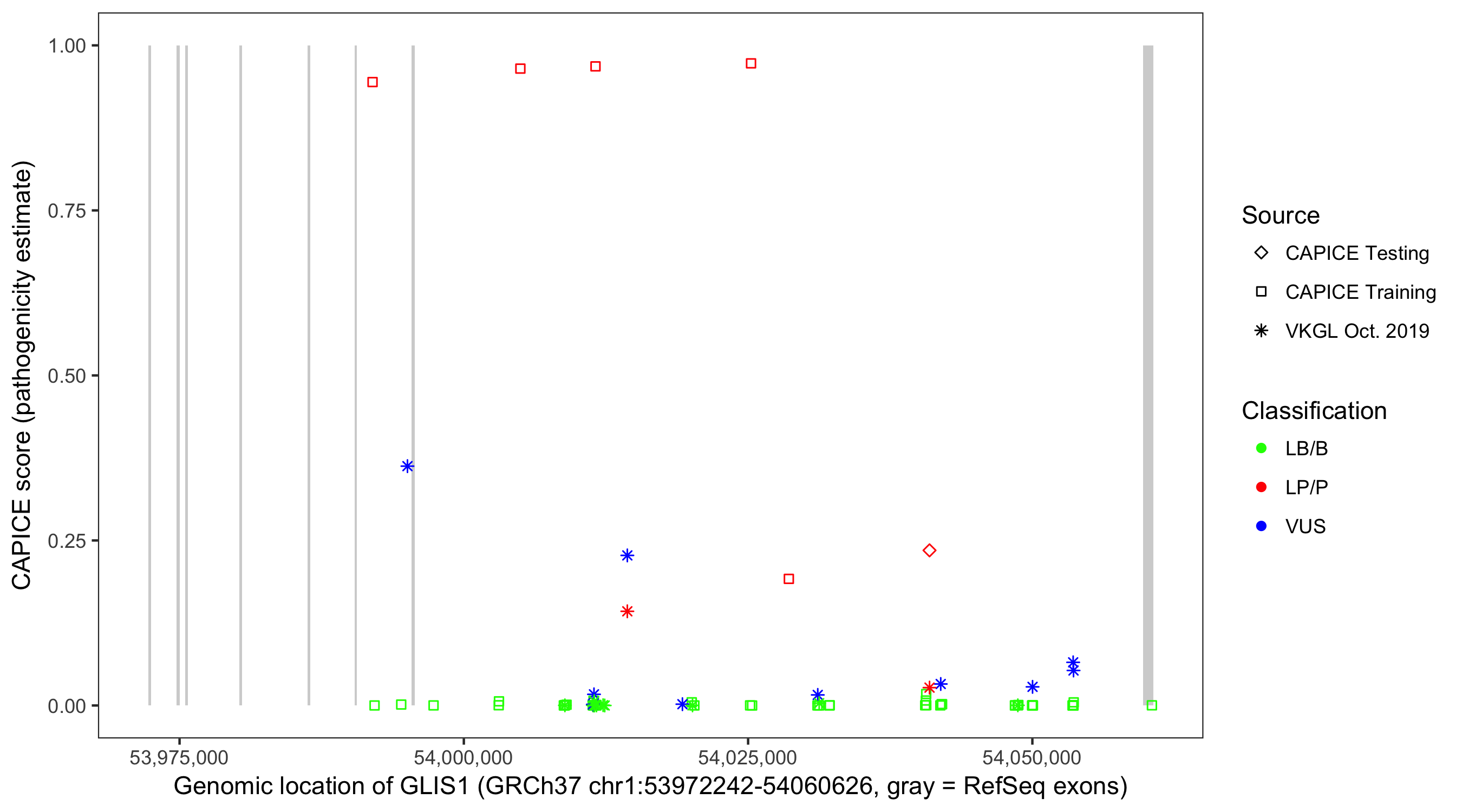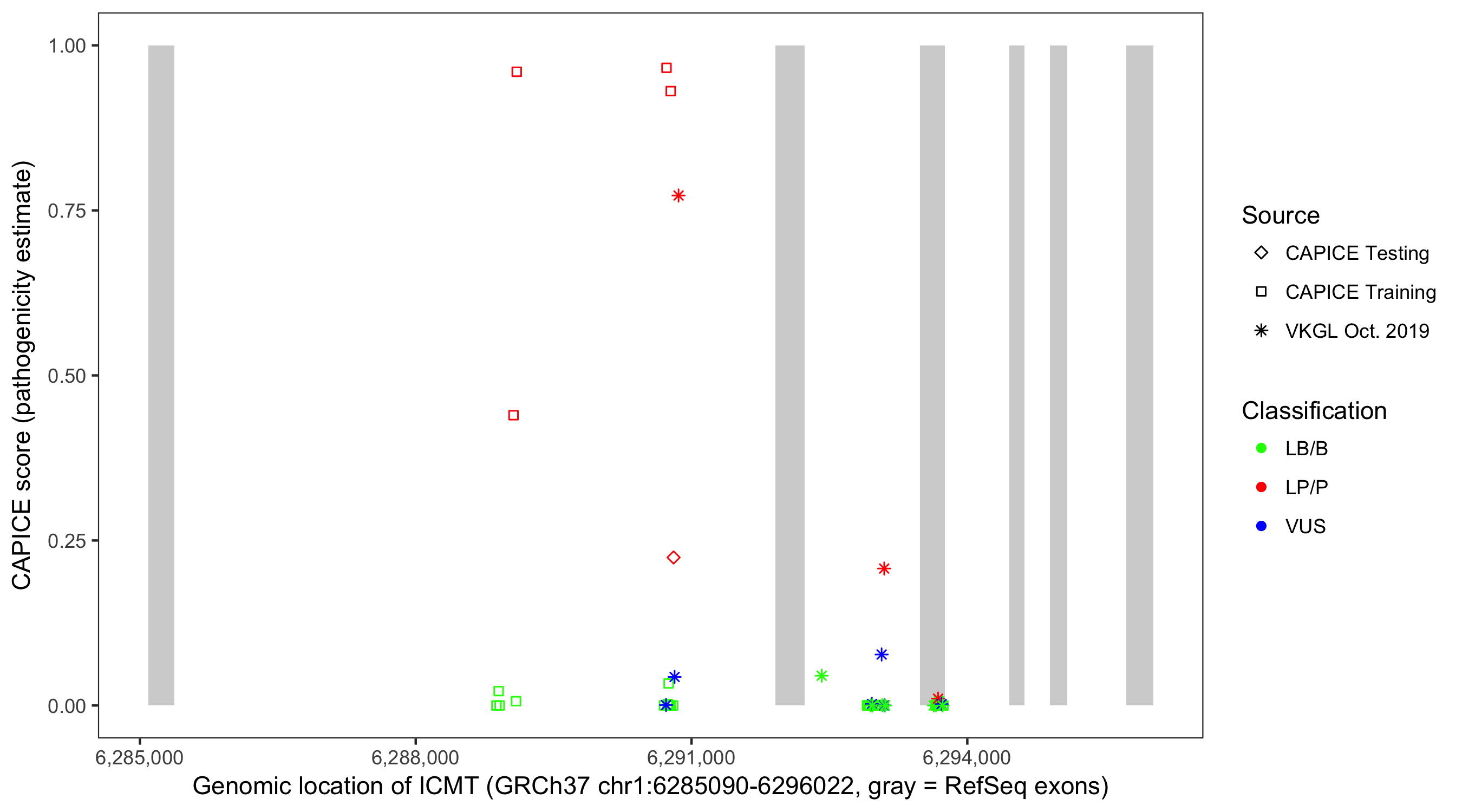 Shown are CAPICE train/test variants plus VKGL Oct 2019.