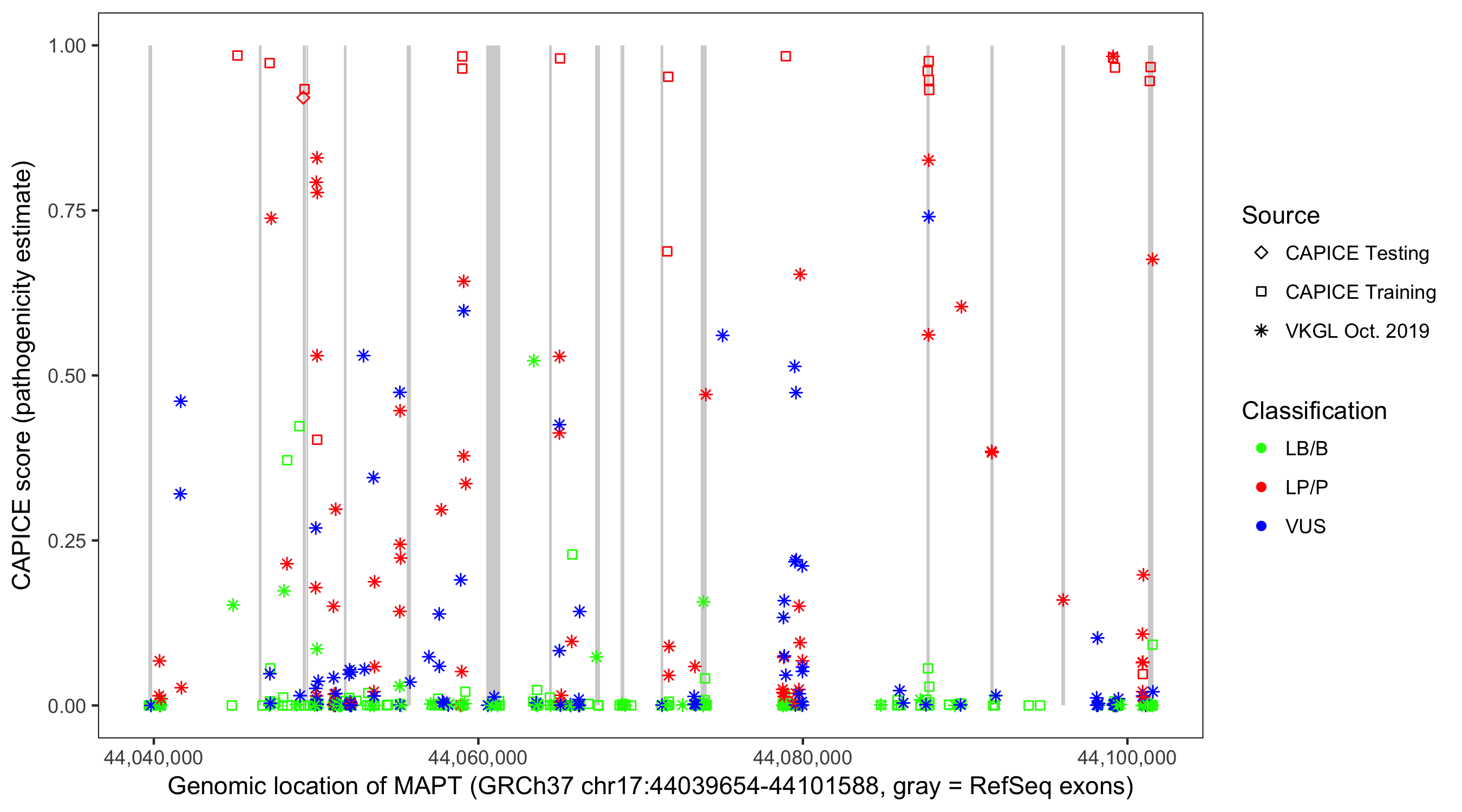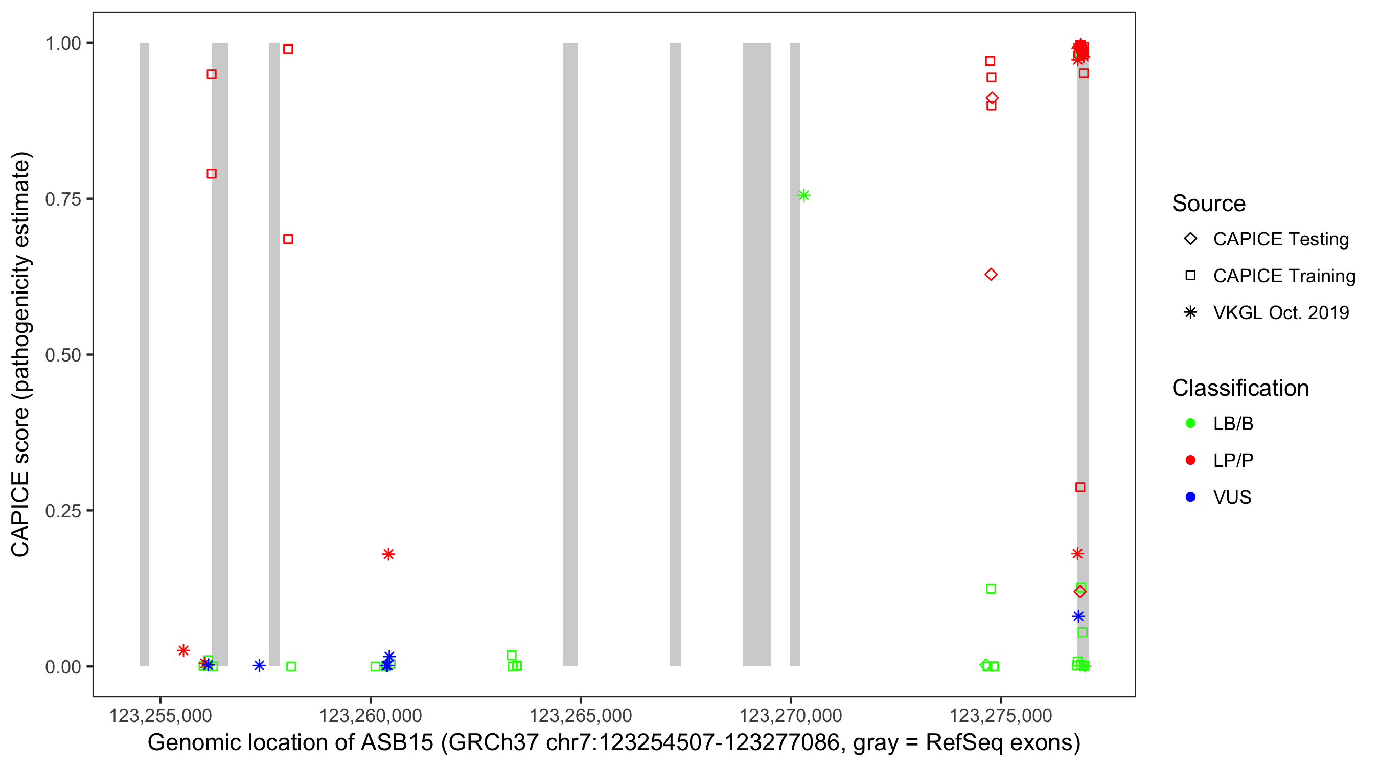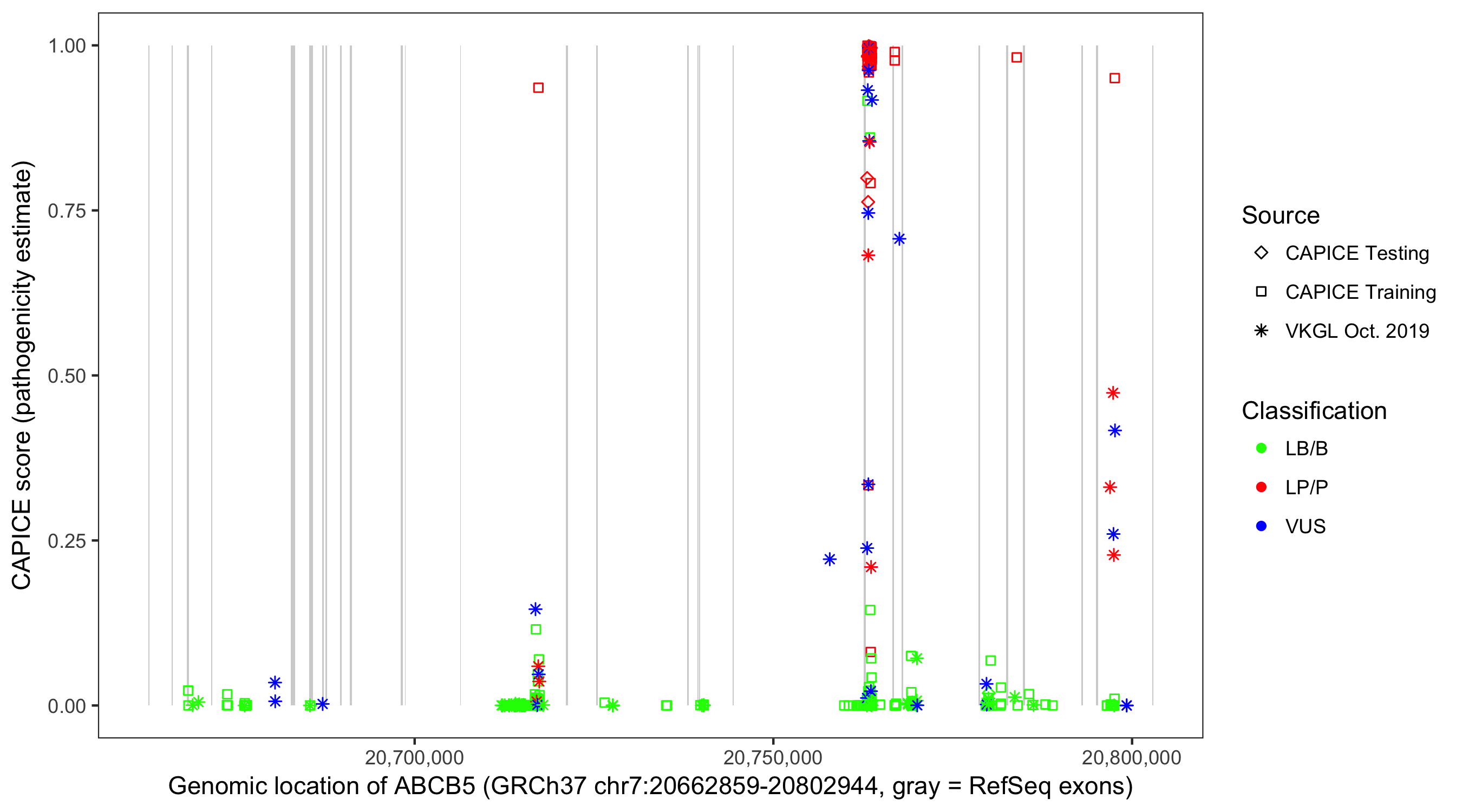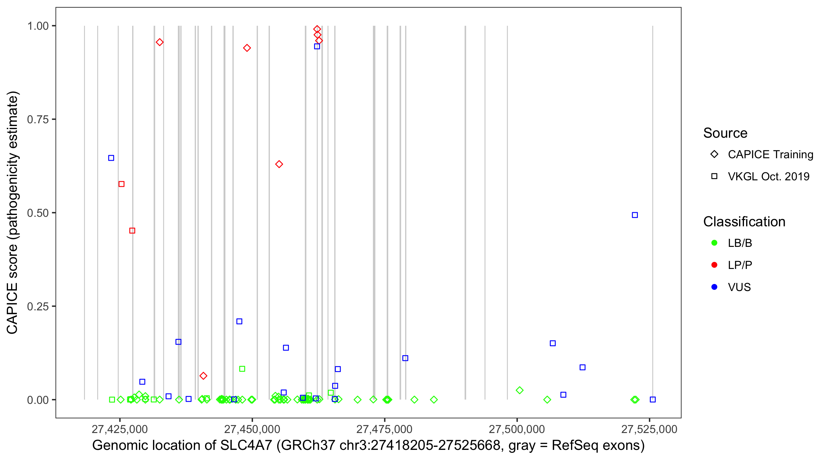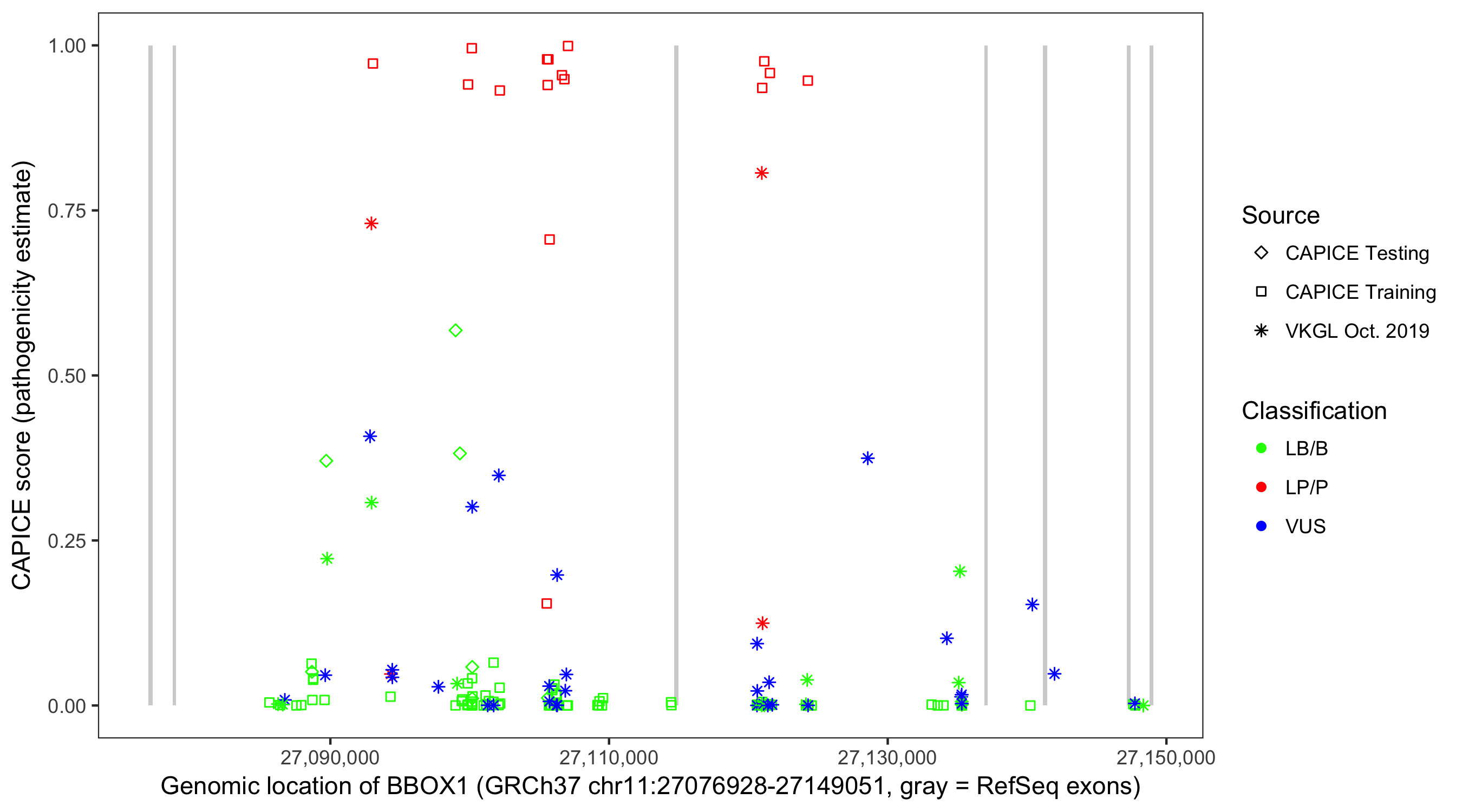 Shown are CAPICE train/test variants plus VKGL Oct 2019.