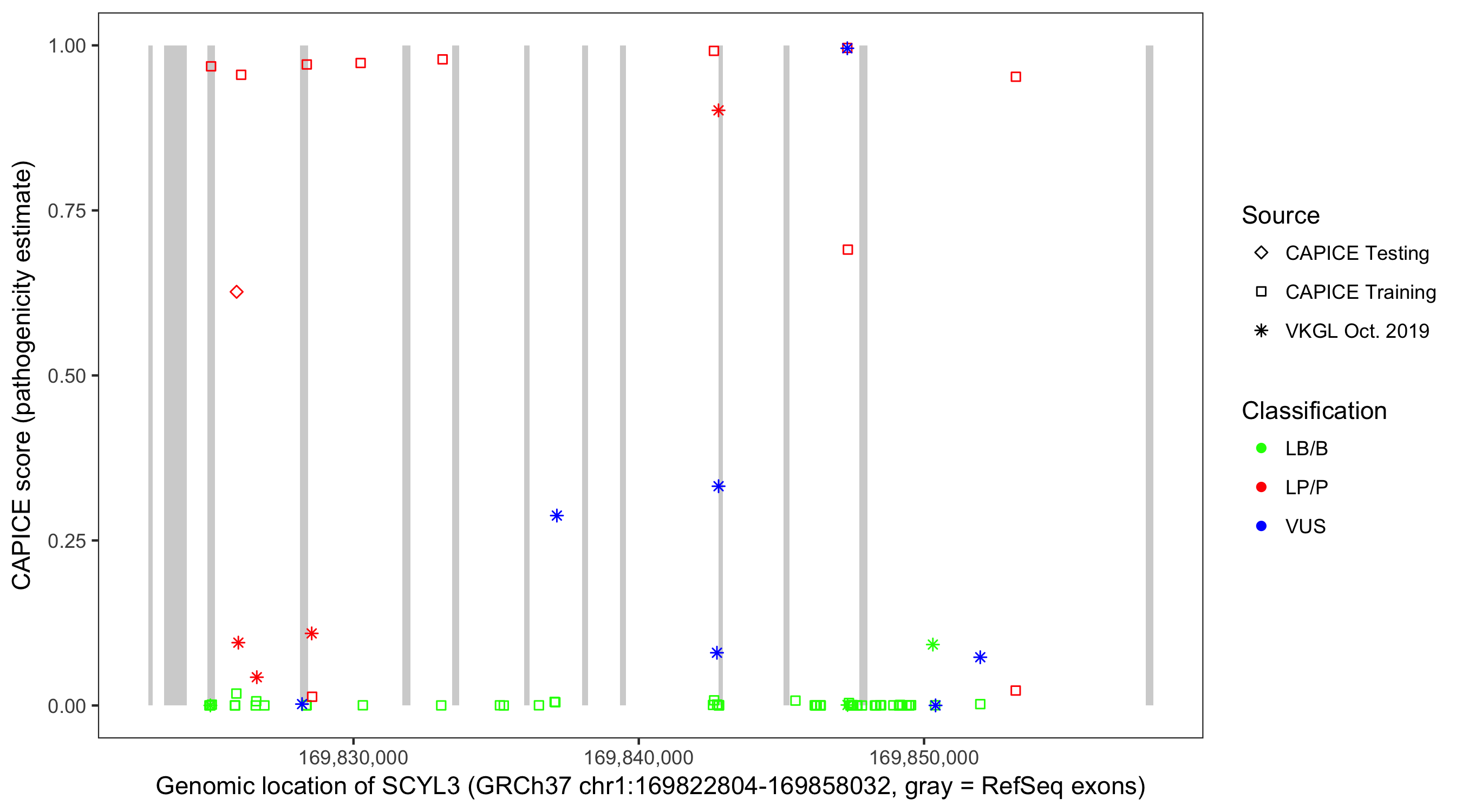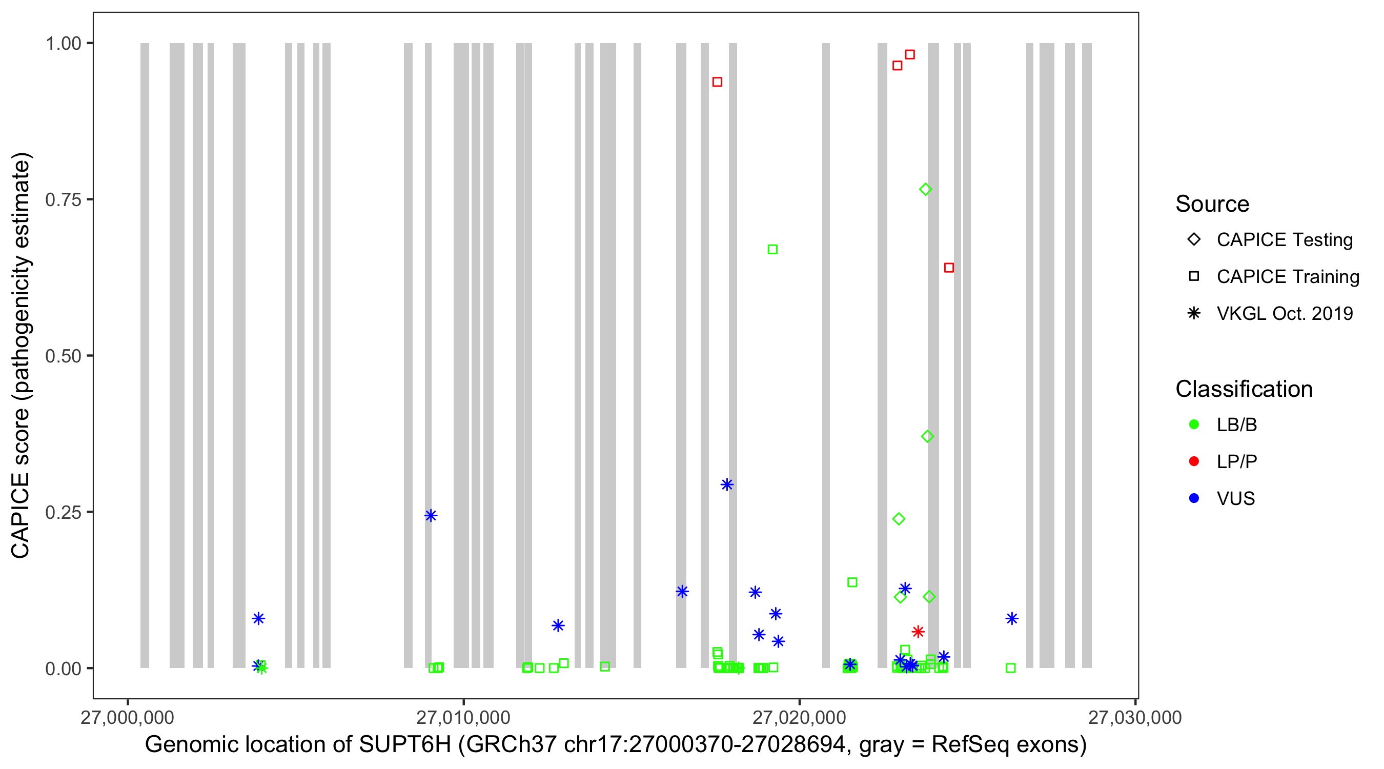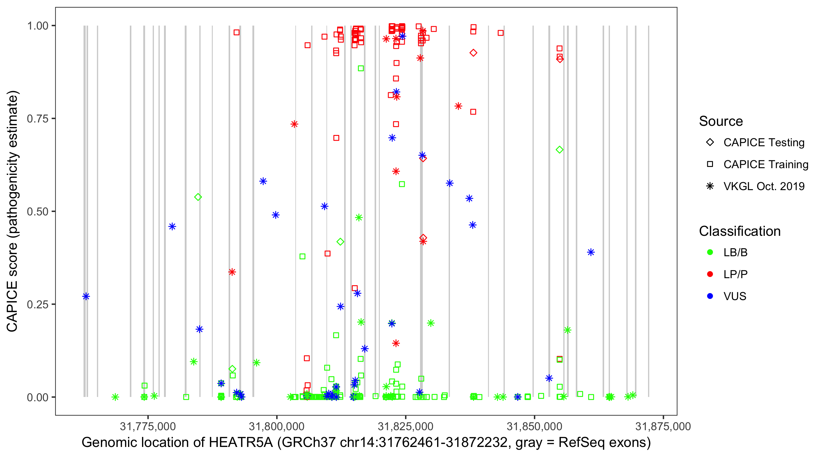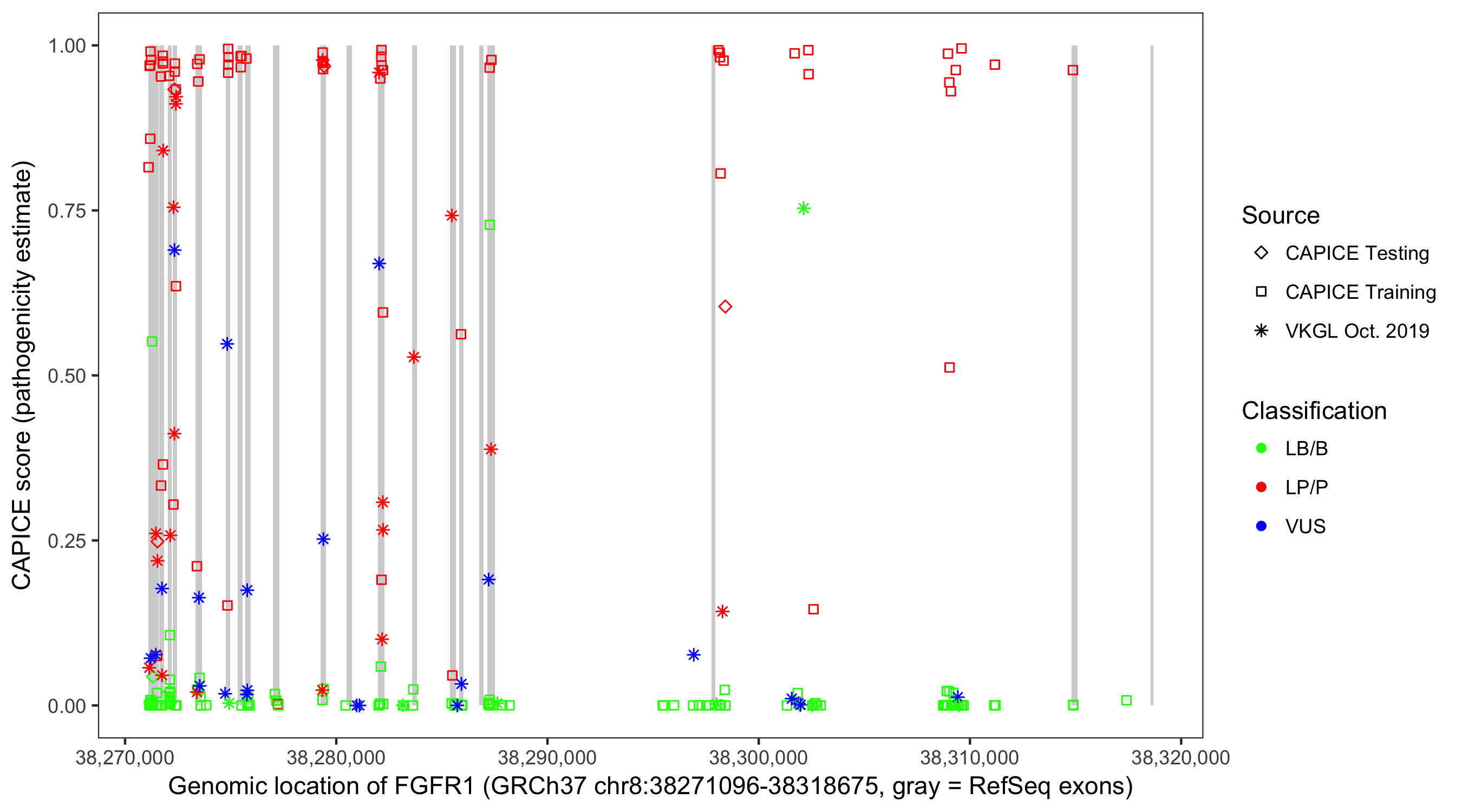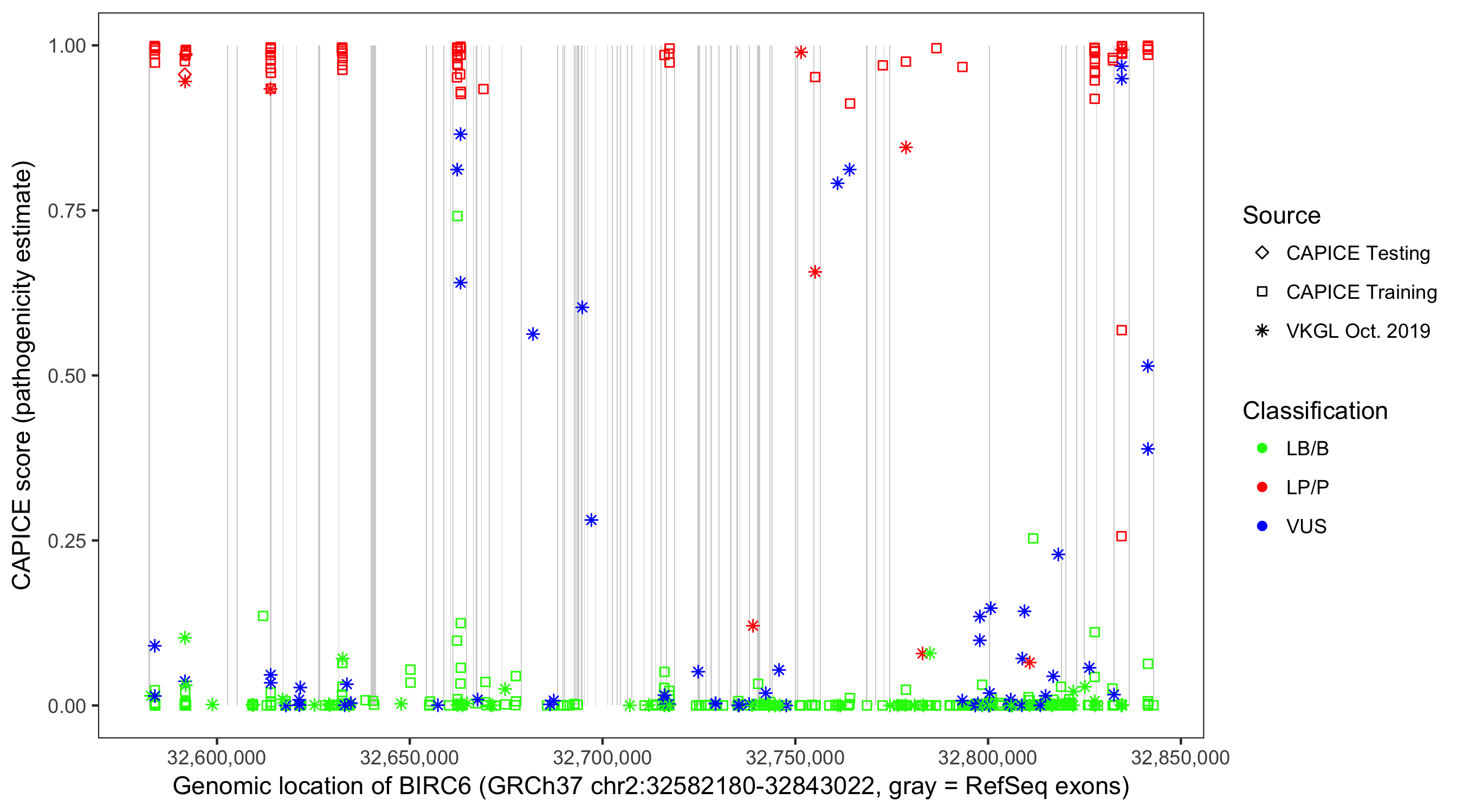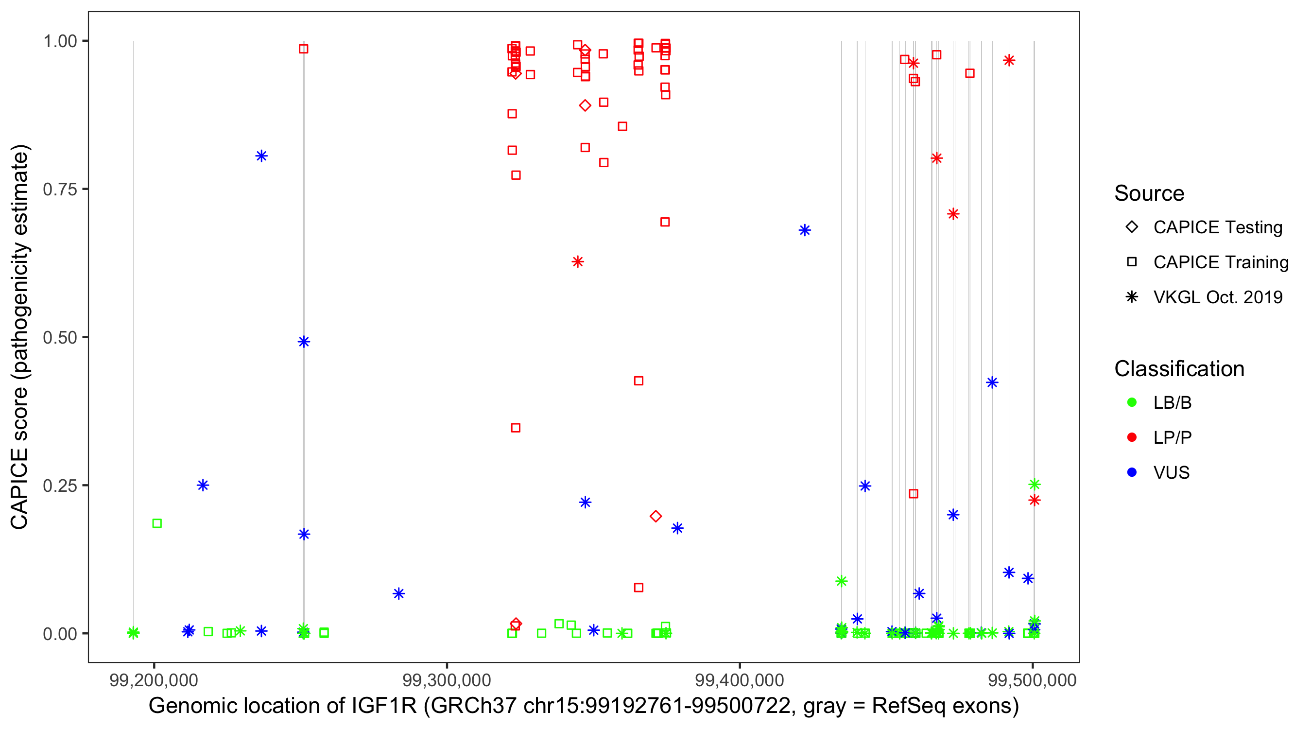 Shown are CAPICE train/test variants plus VKGL Oct 2019.