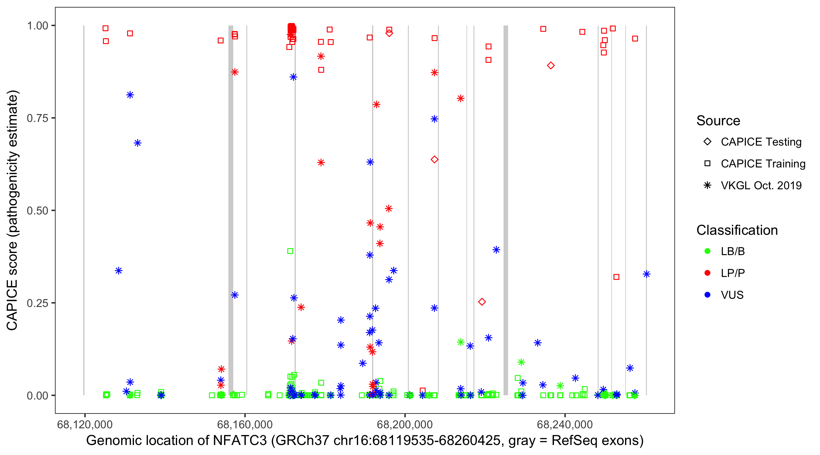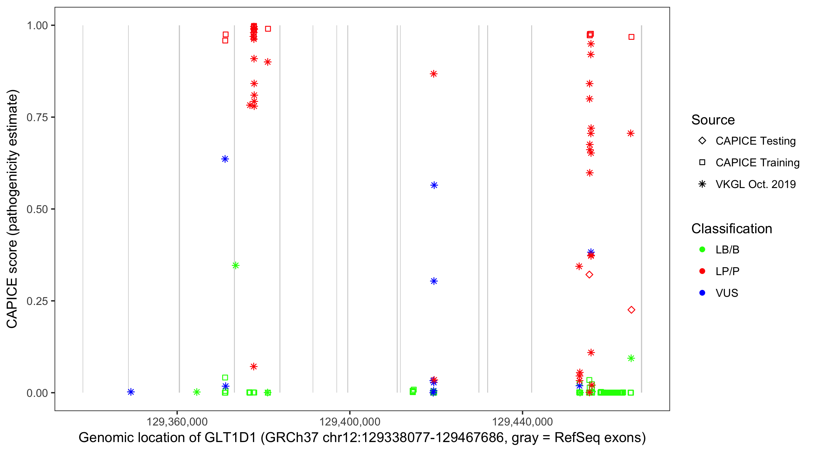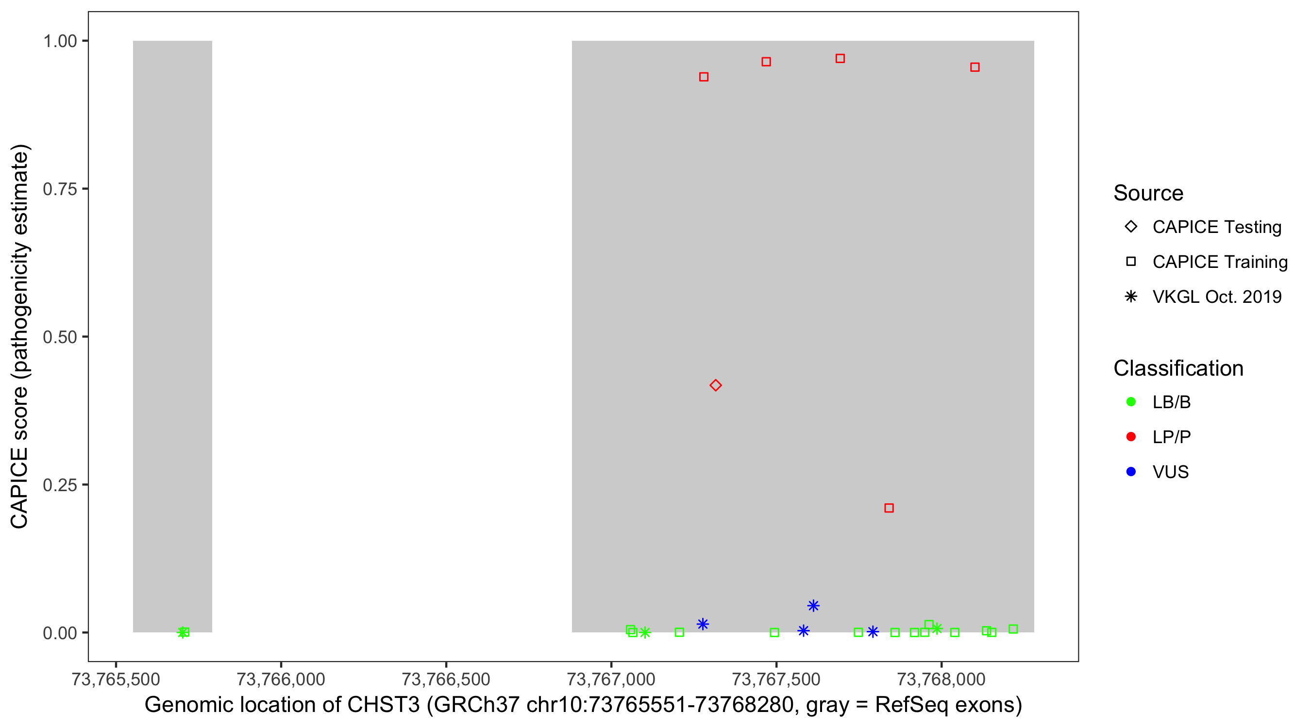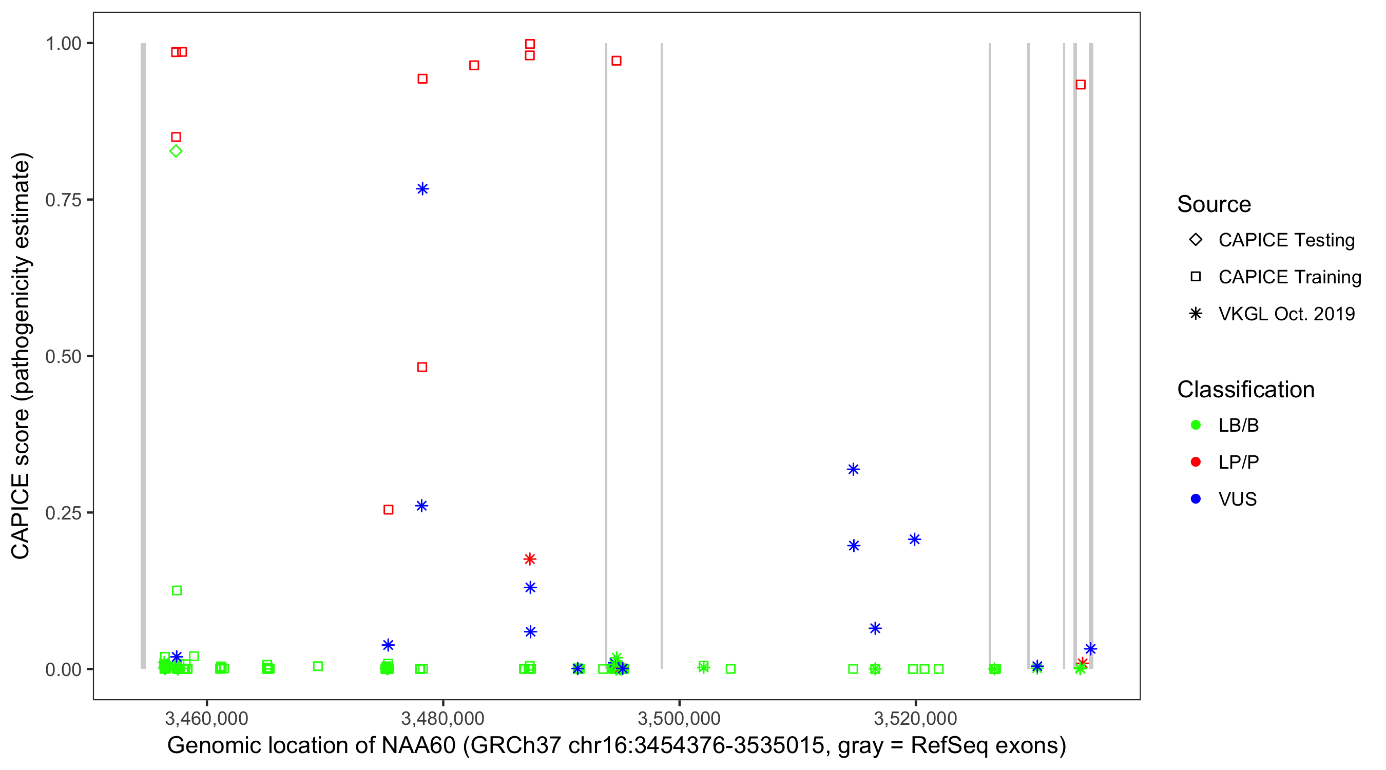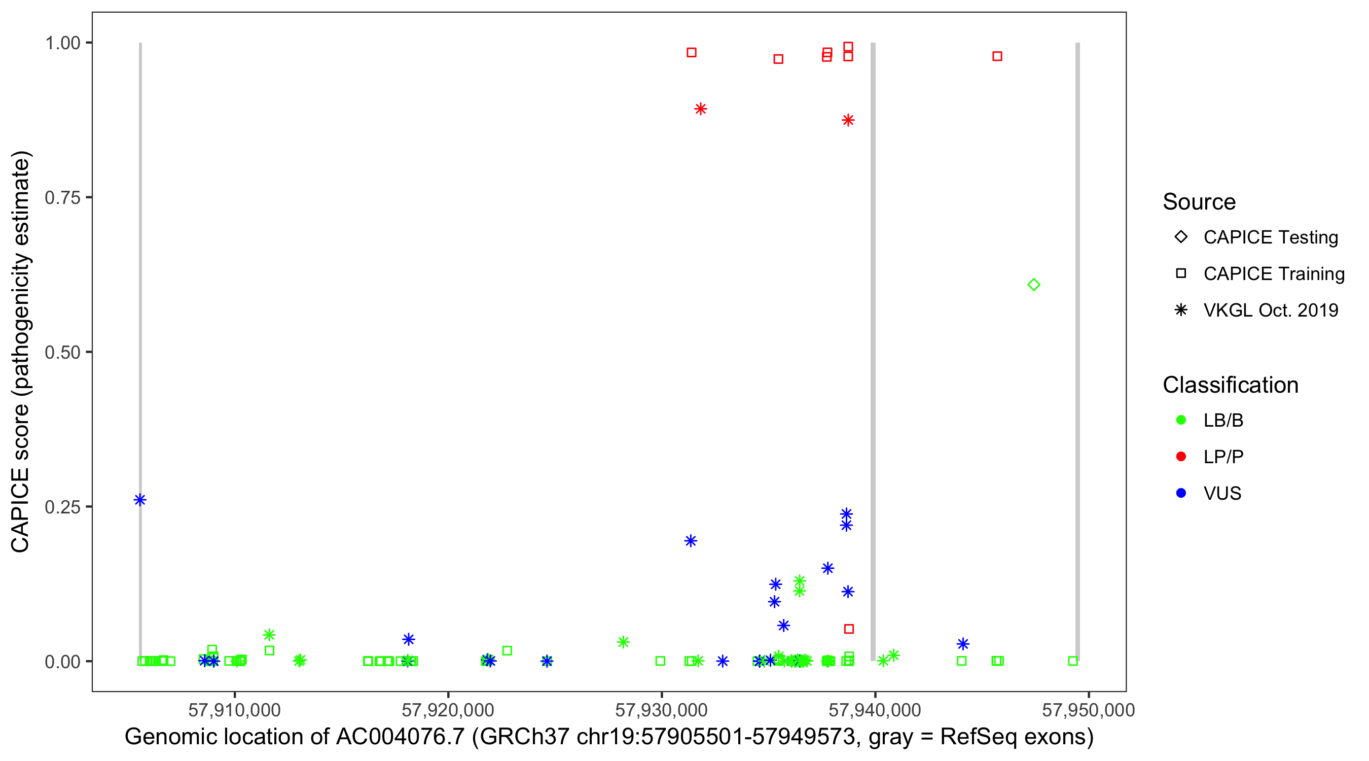 Shown are CAPICE train/test variants plus VKGL Oct 2019.
