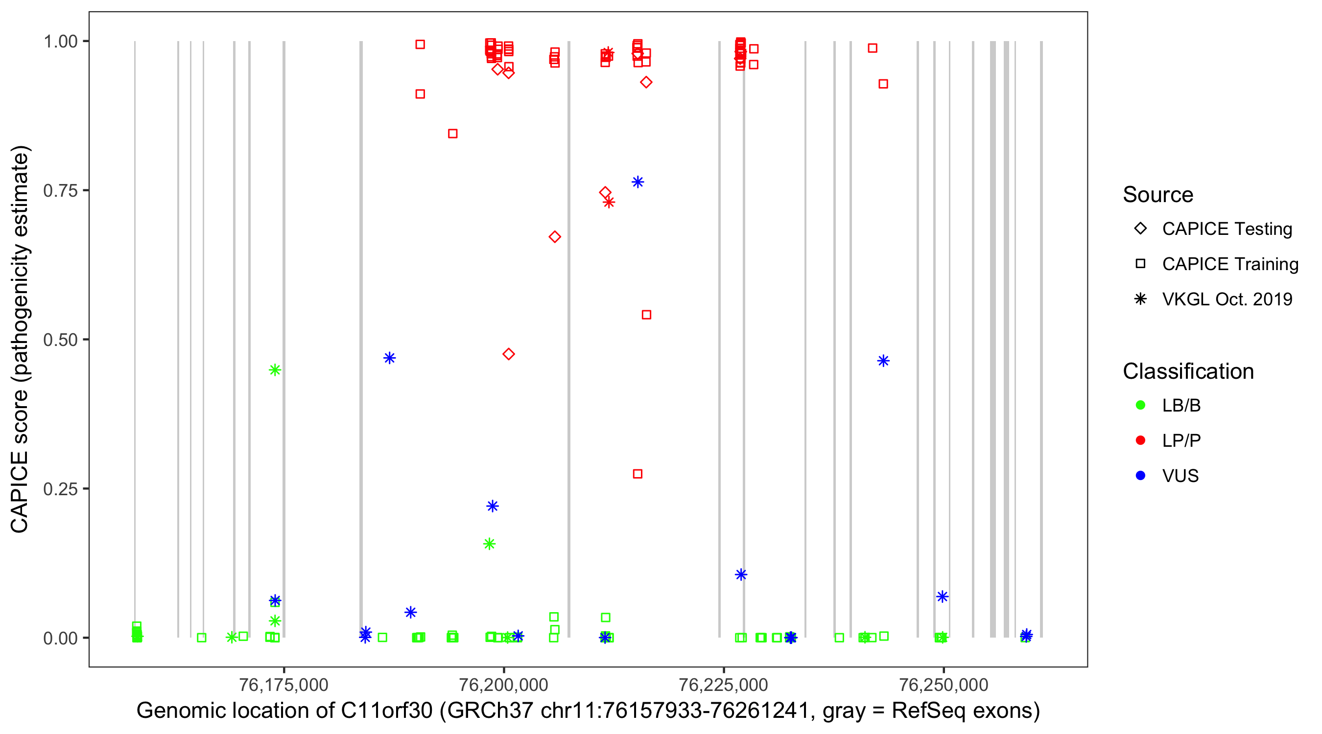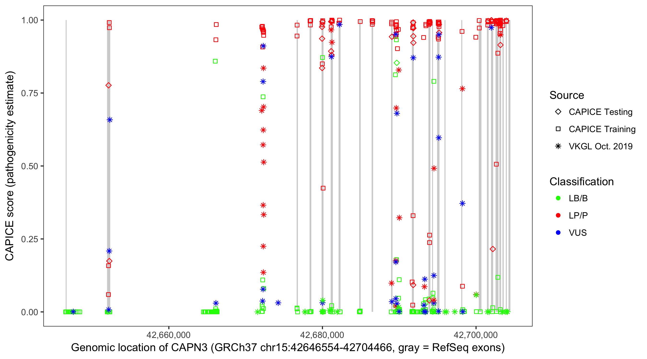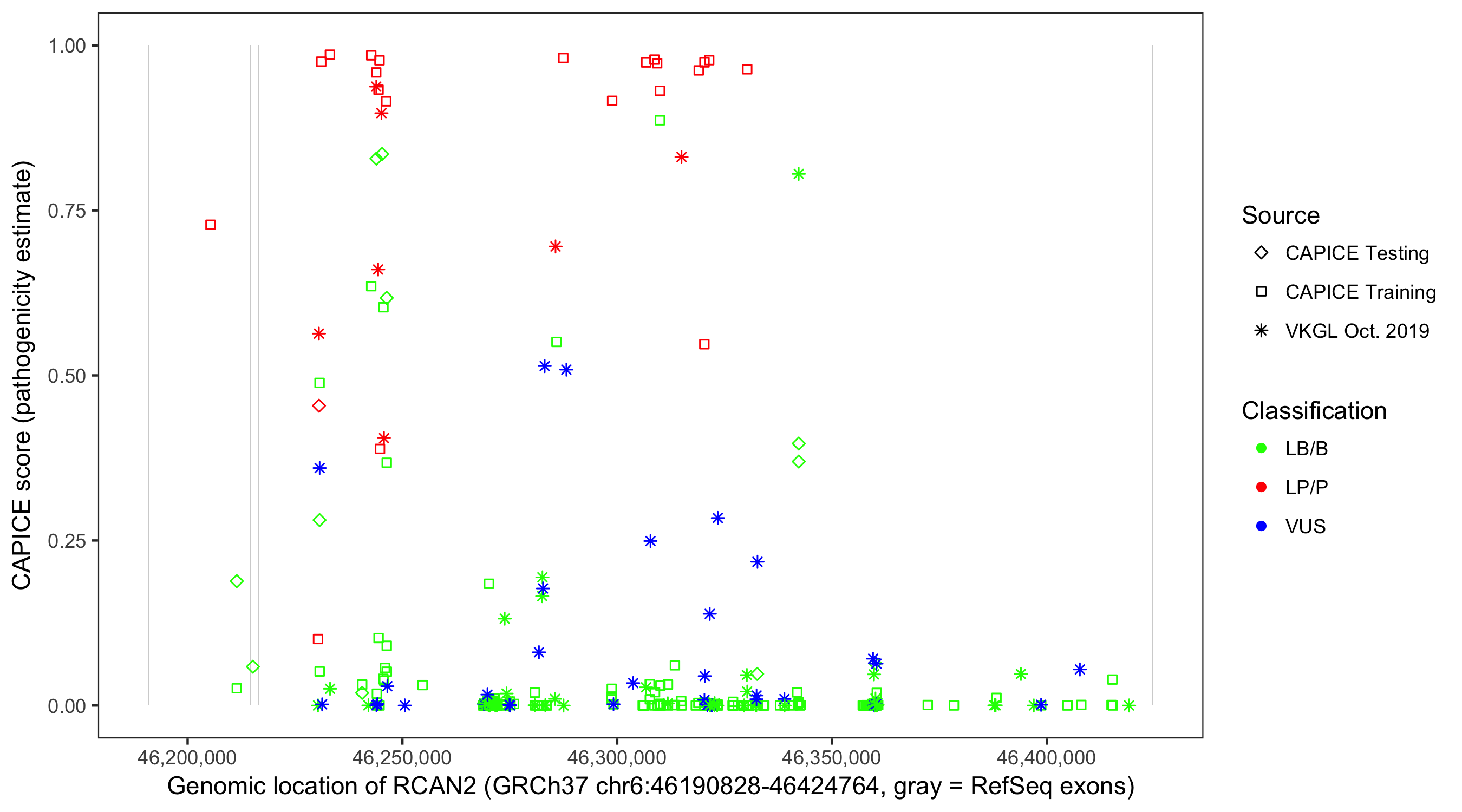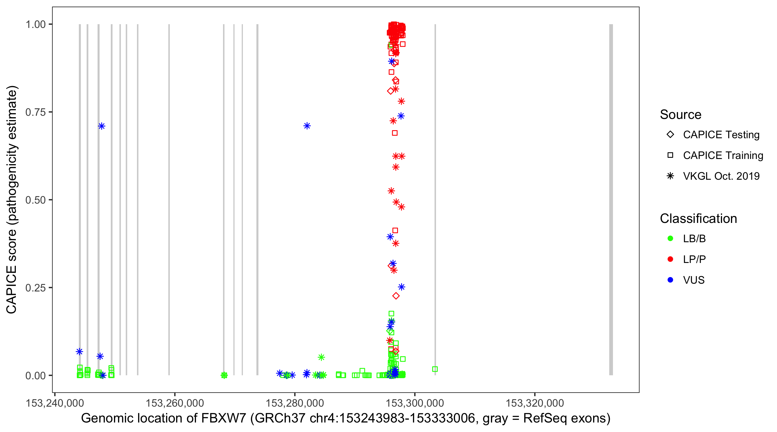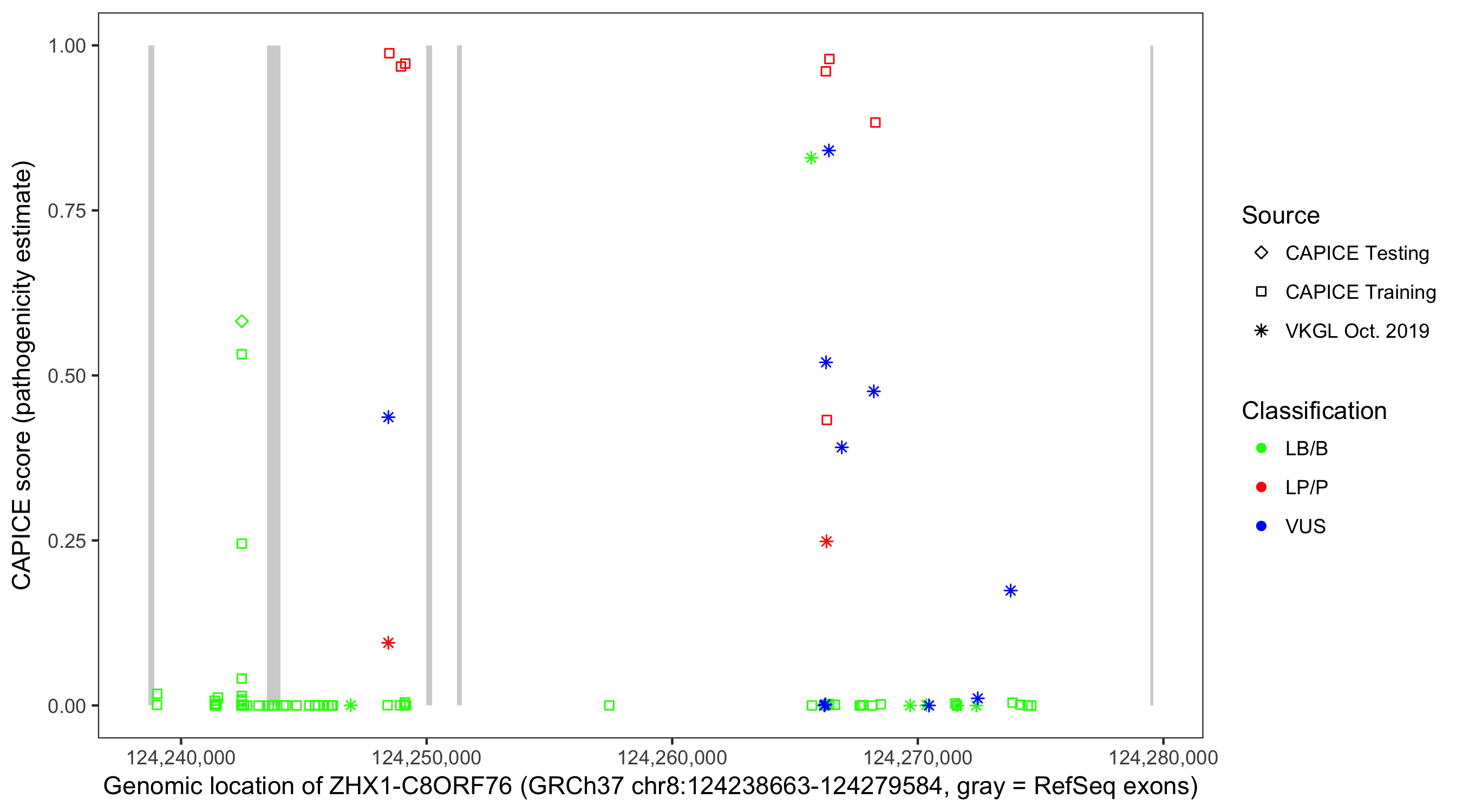 Shown are CAPICE train/test variants plus VKGL Oct 2019.