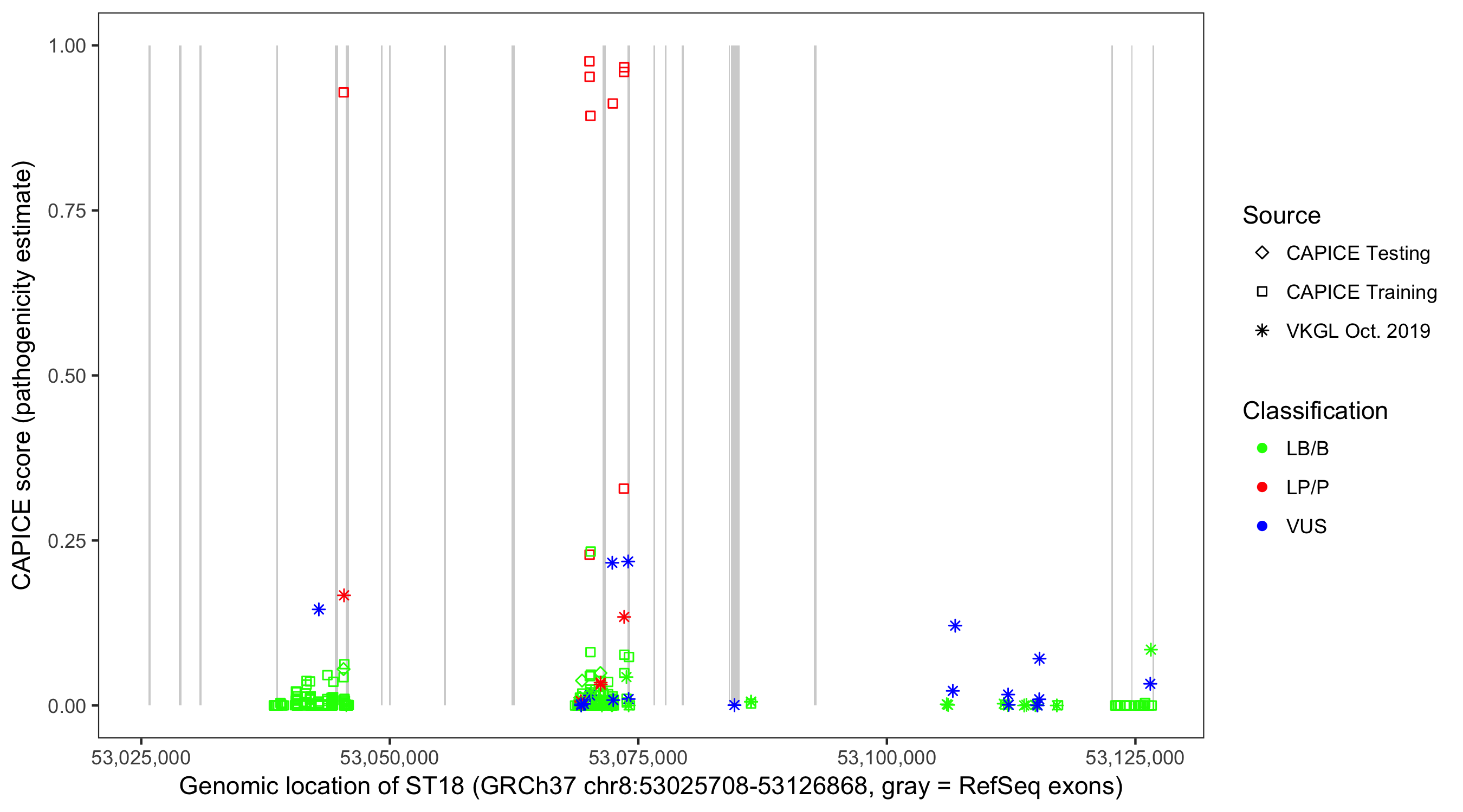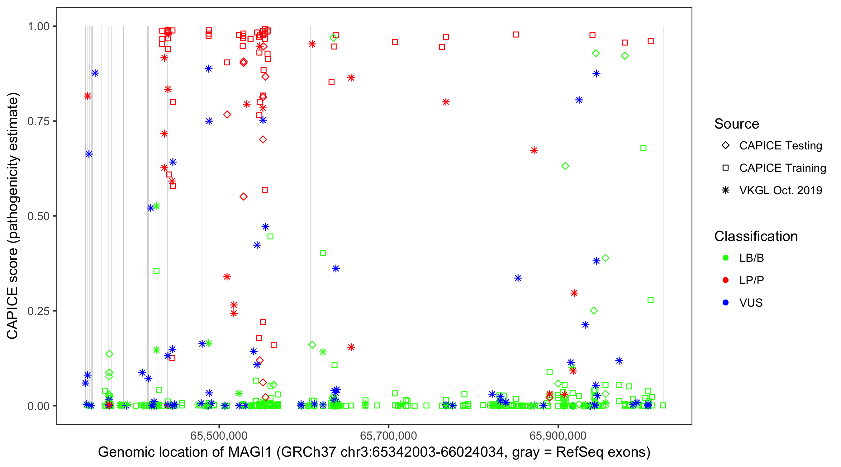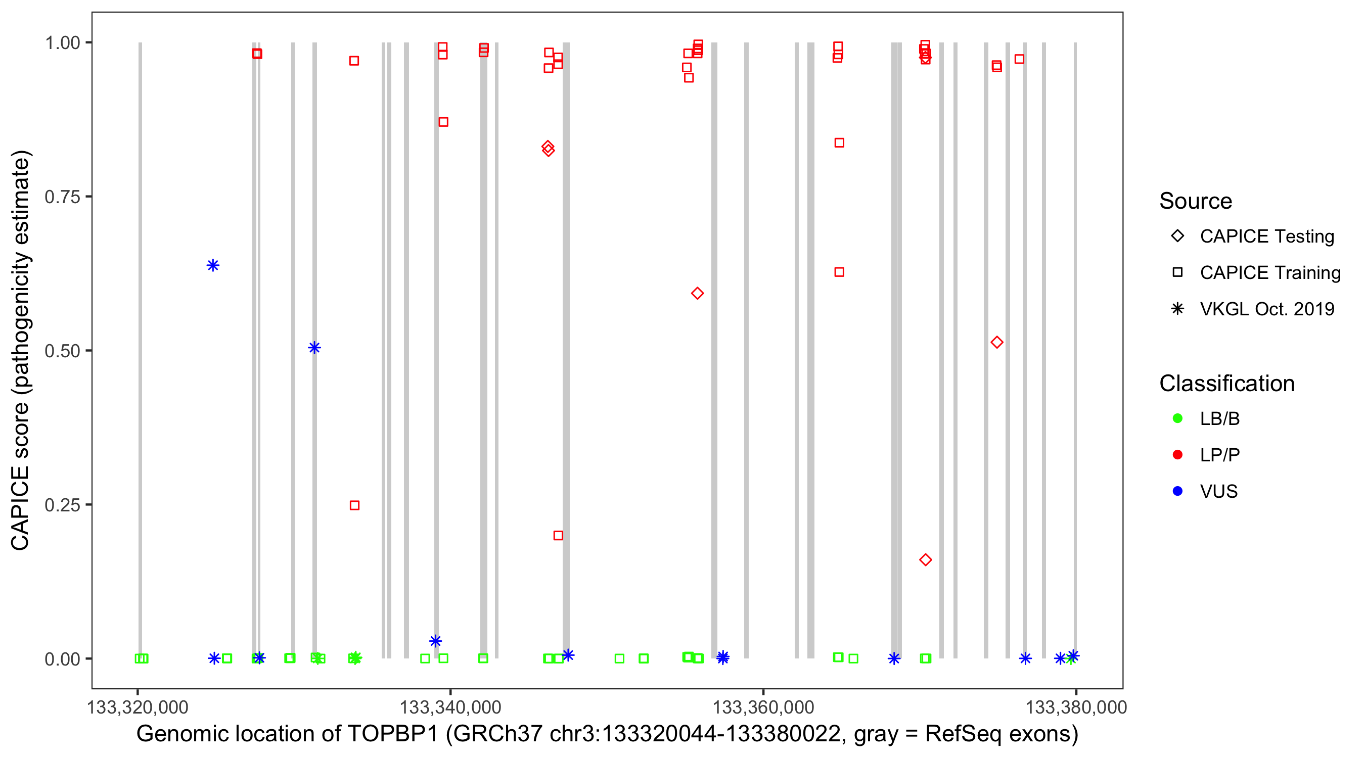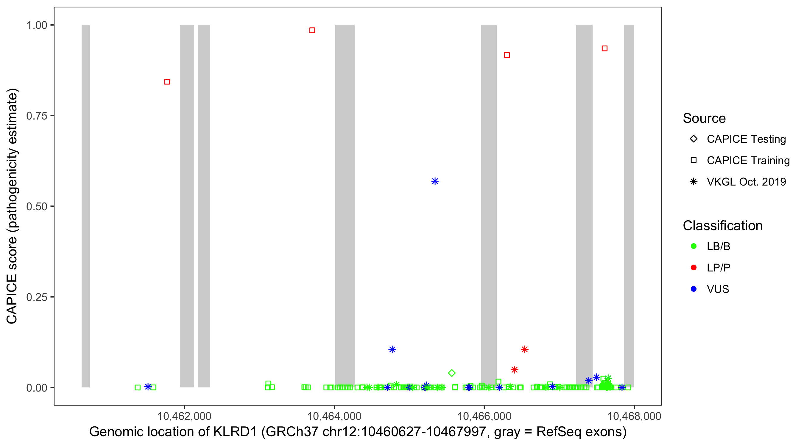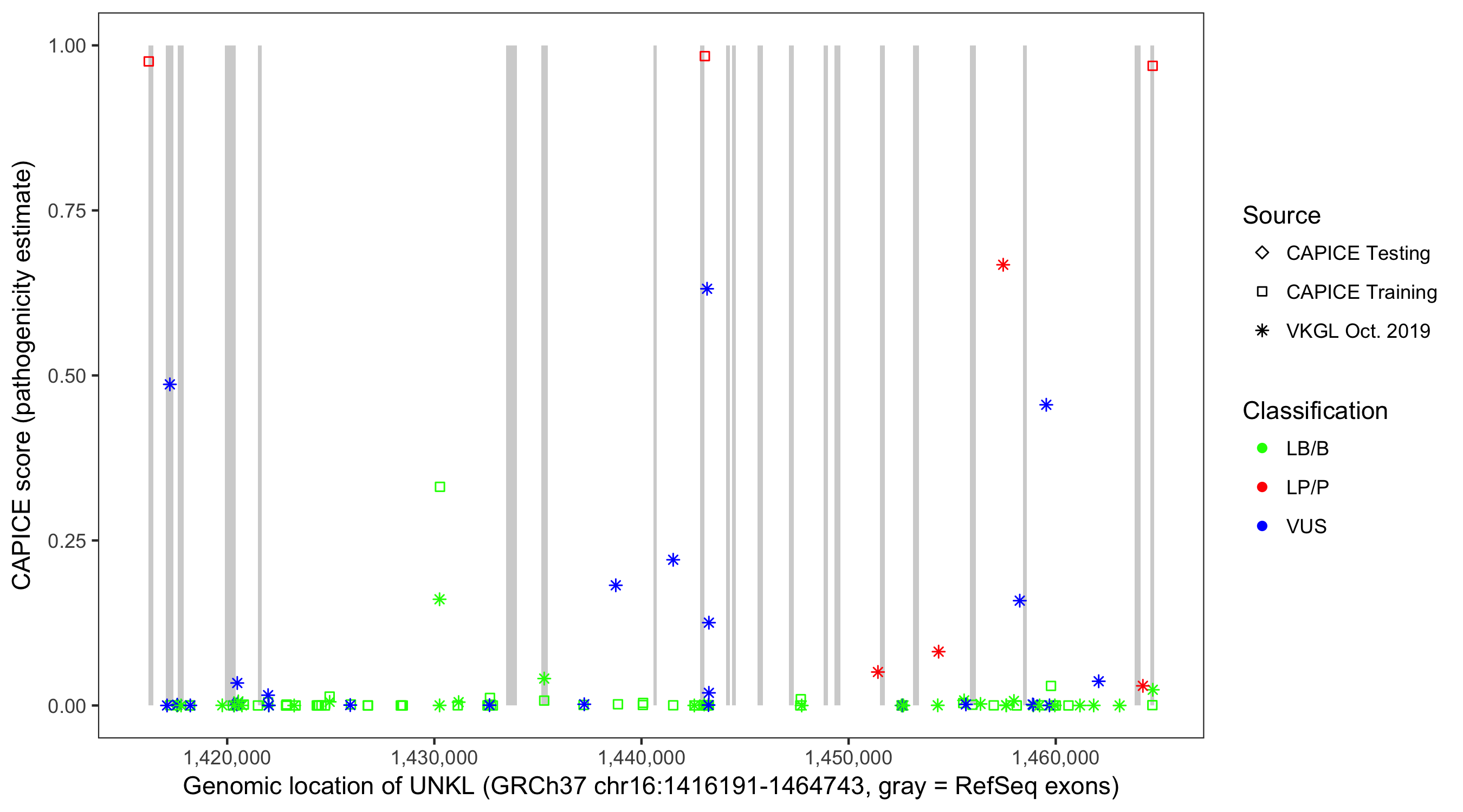 Shown are CAPICE train/test variants plus VKGL Oct 2019.