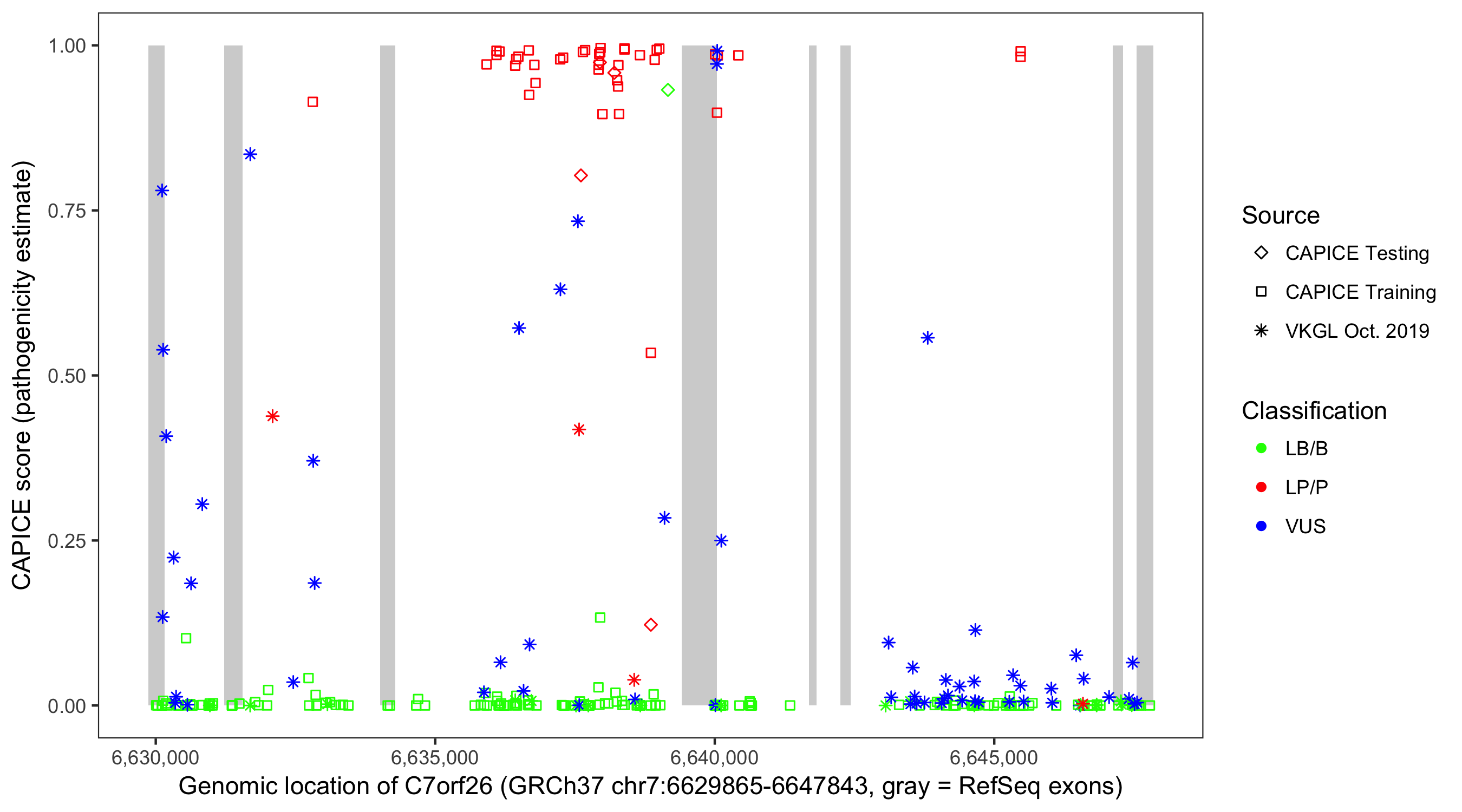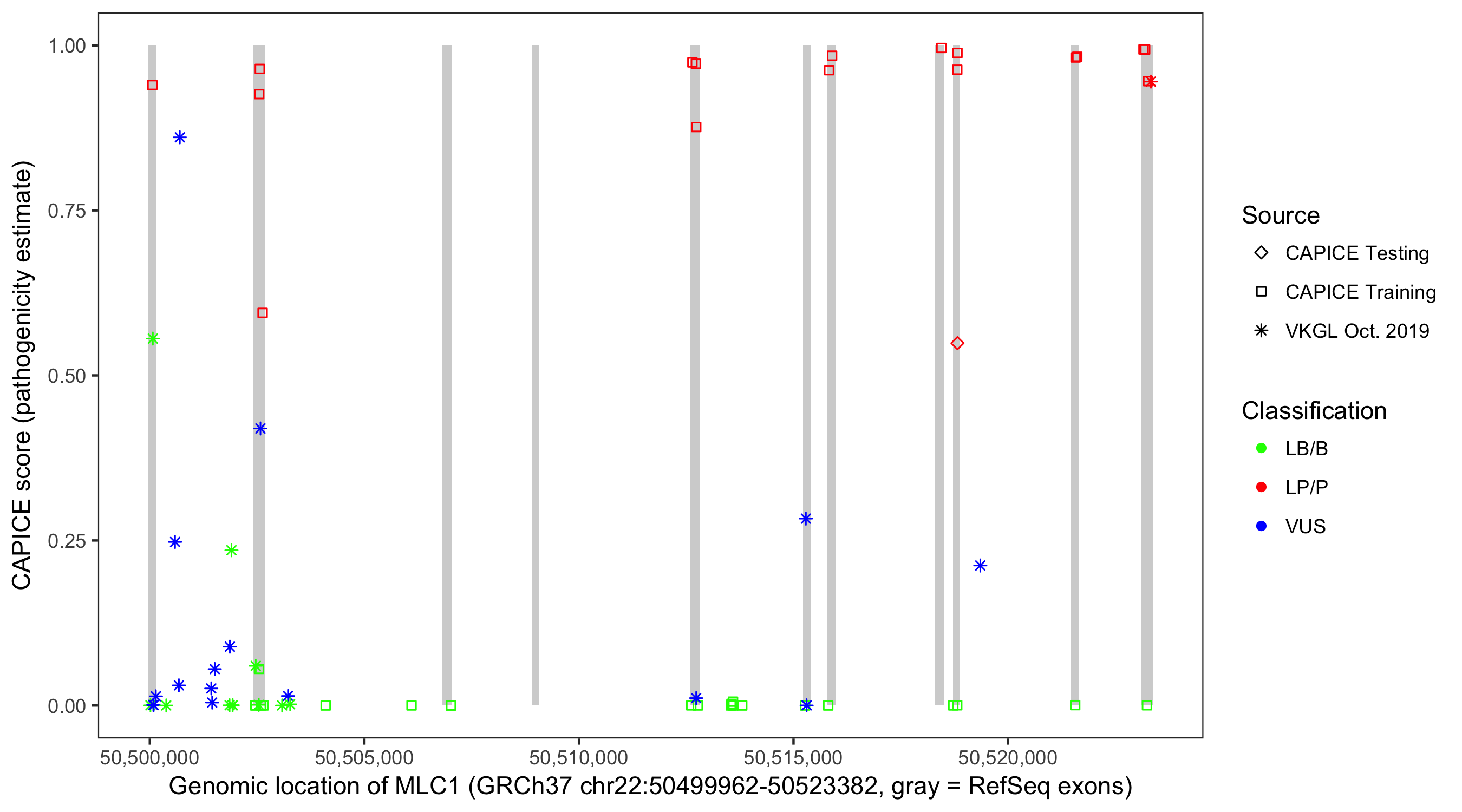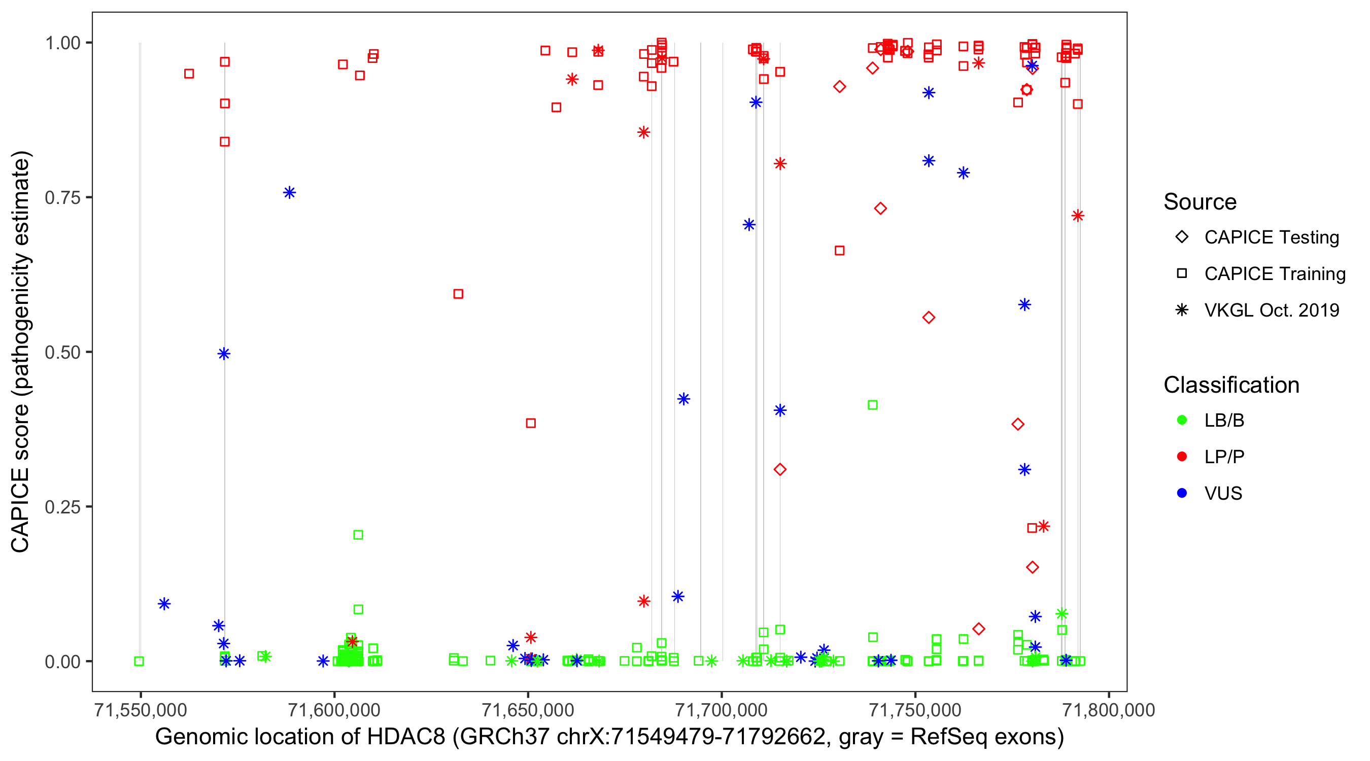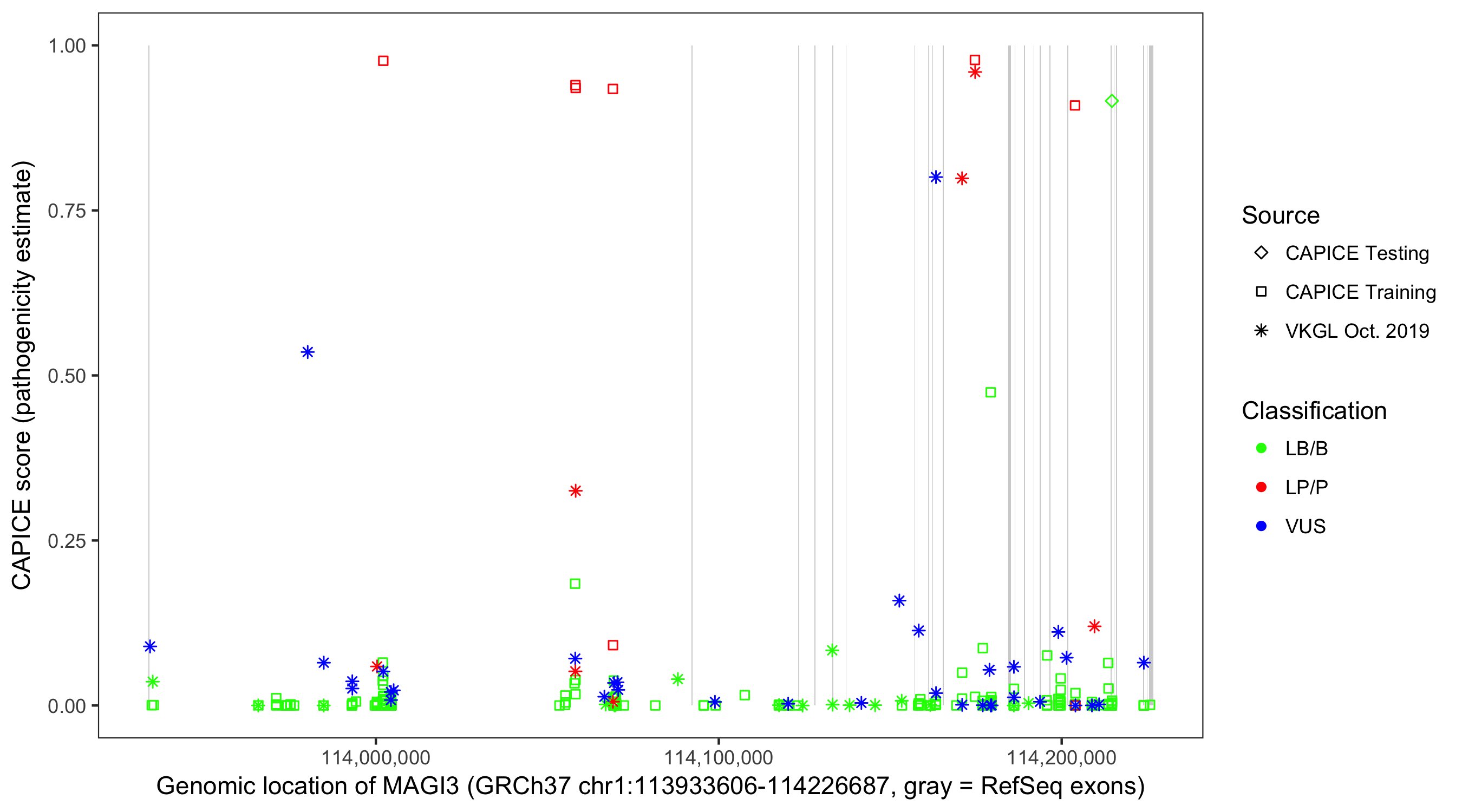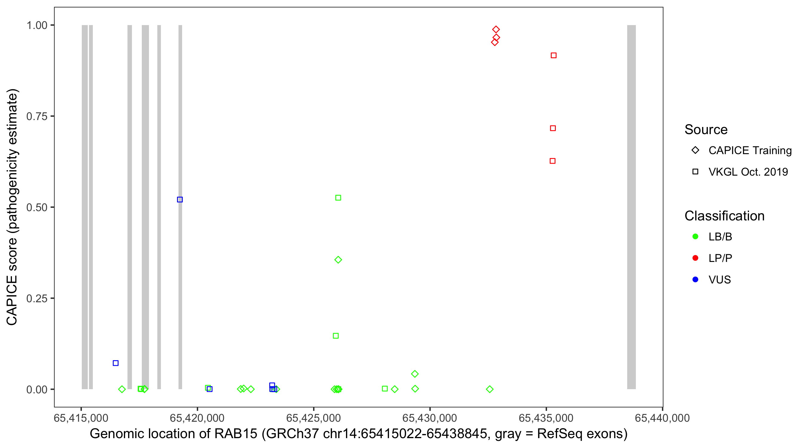 Shown are CAPICE train/test variants plus VKGL Oct 2019.