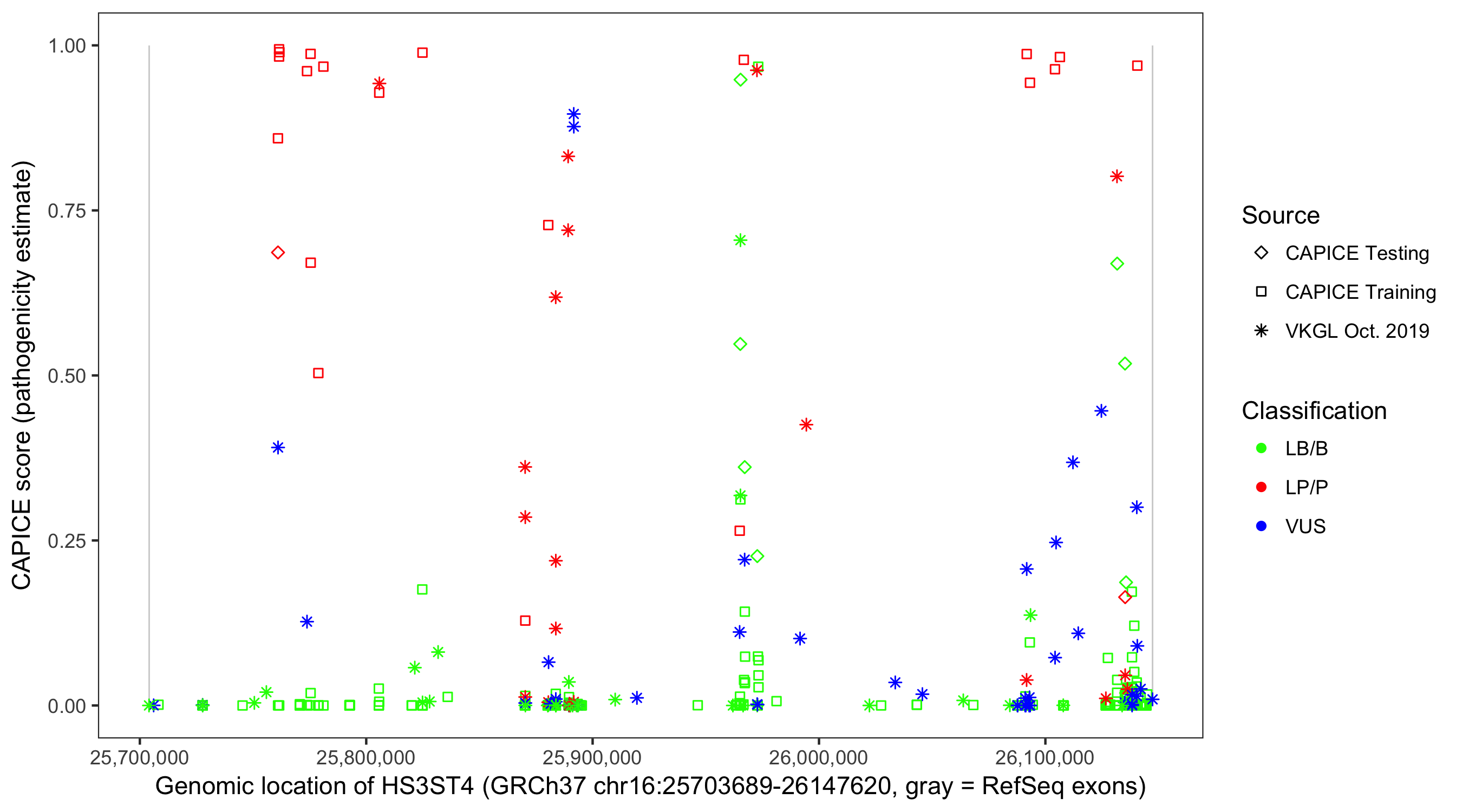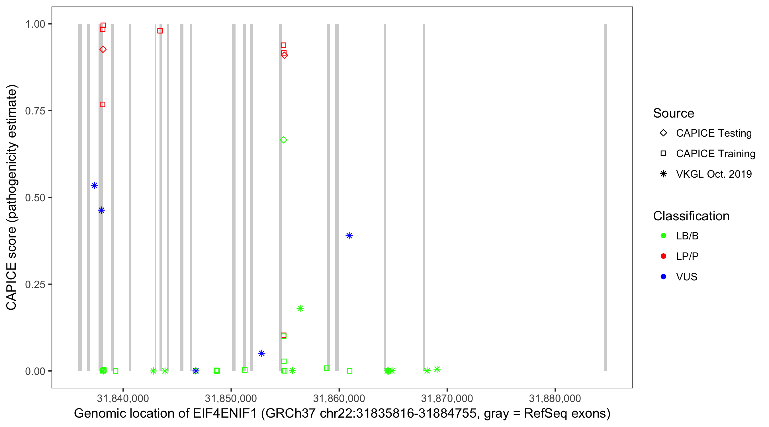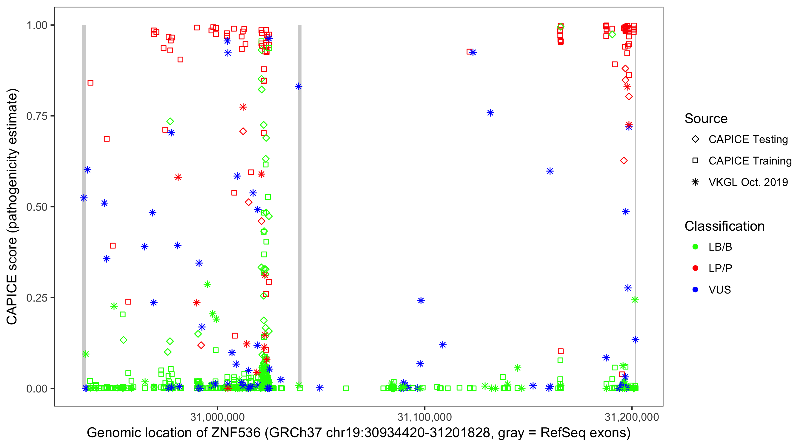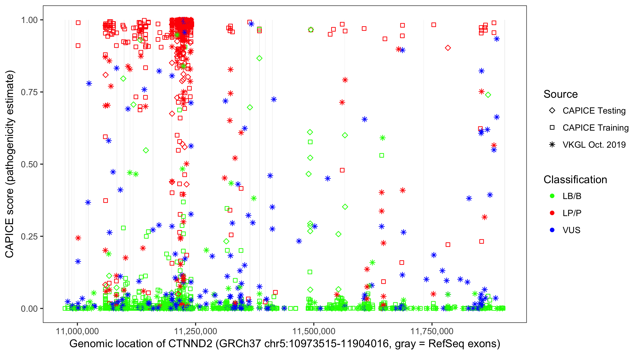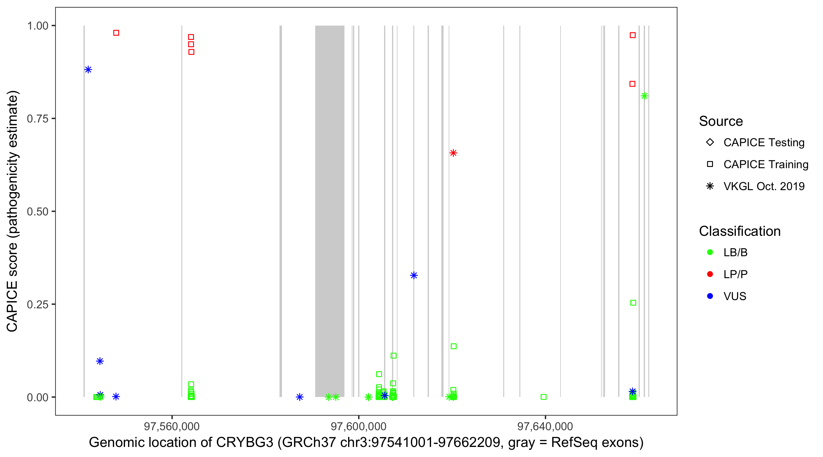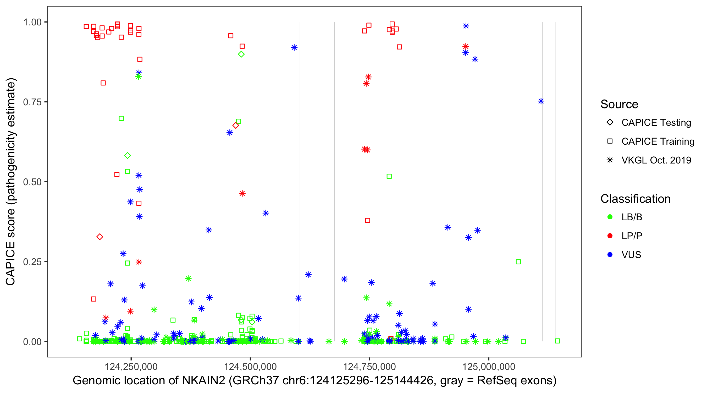 Shown are CAPICE train/test variants plus VKGL Oct 2019.