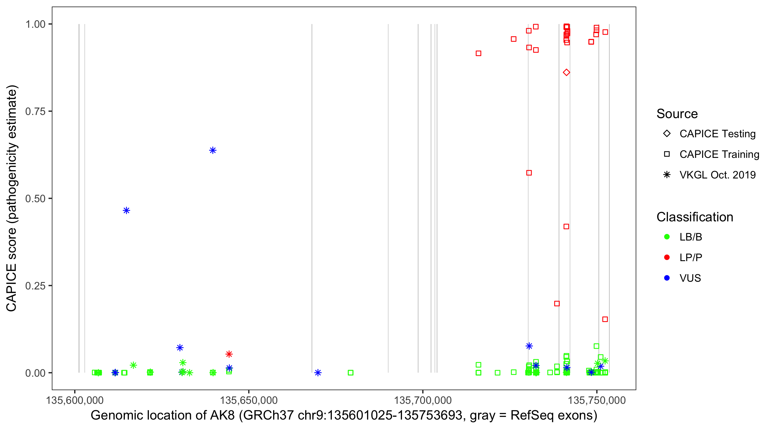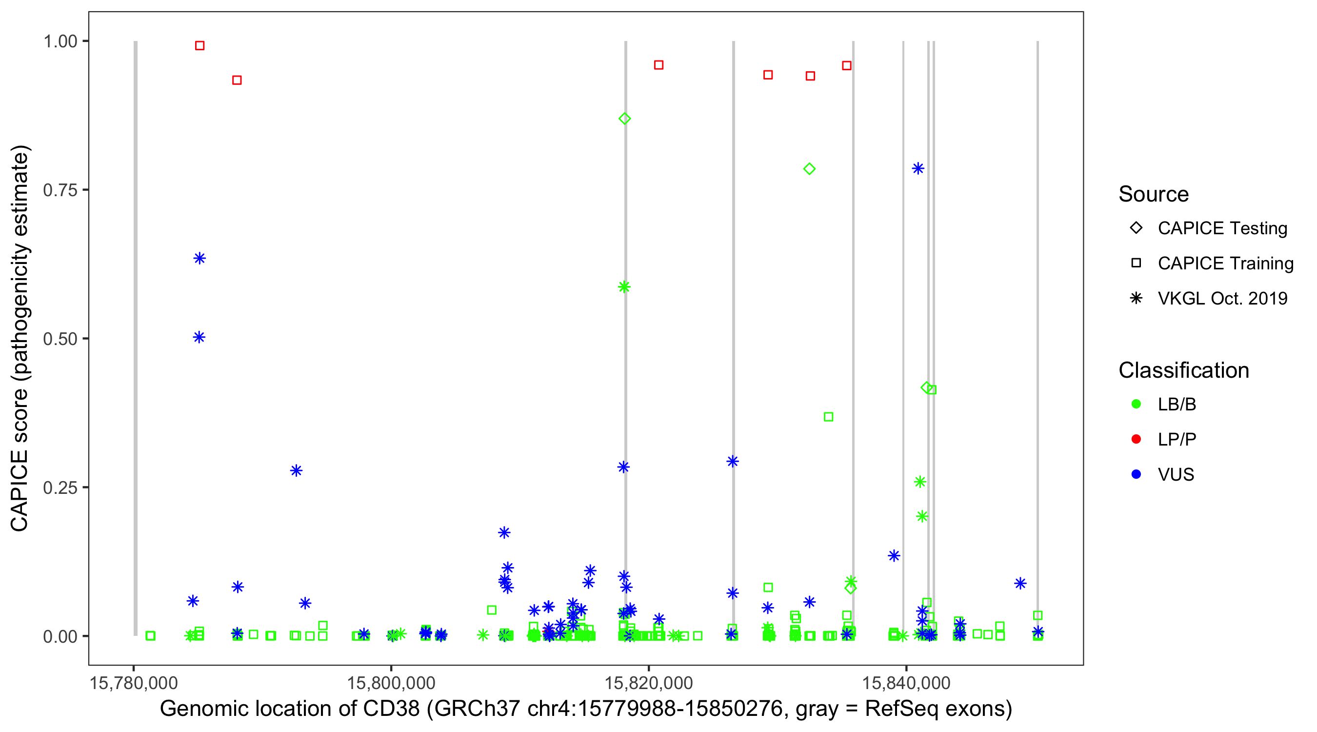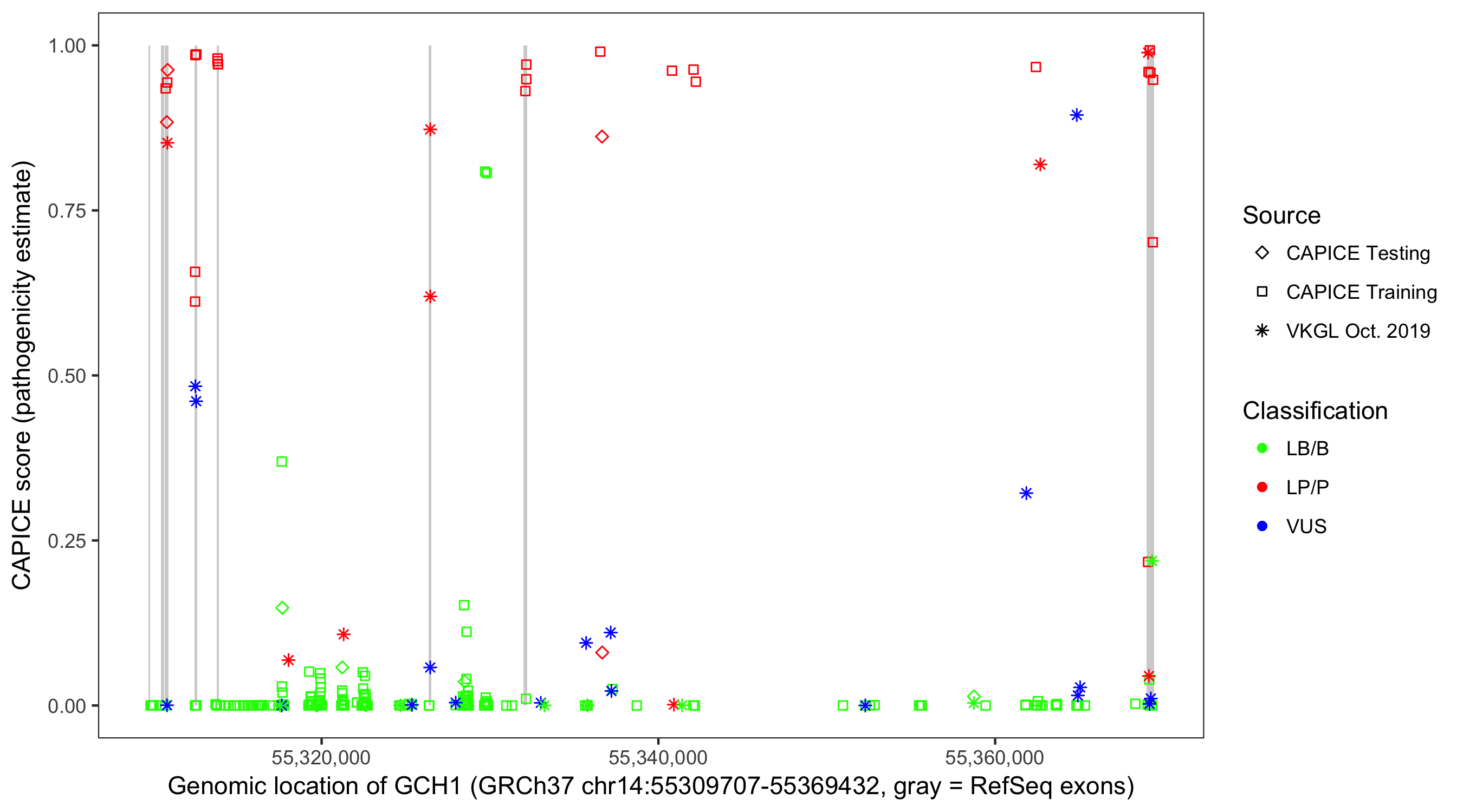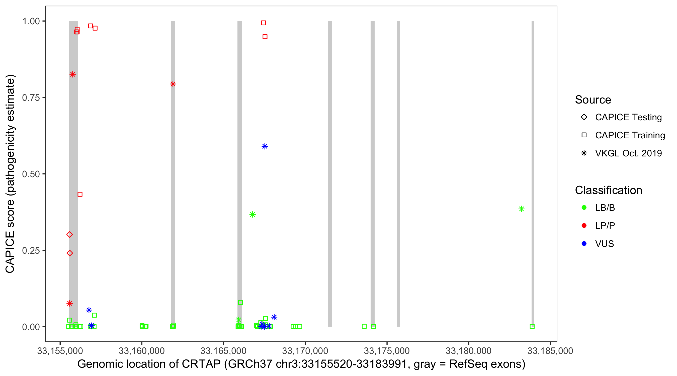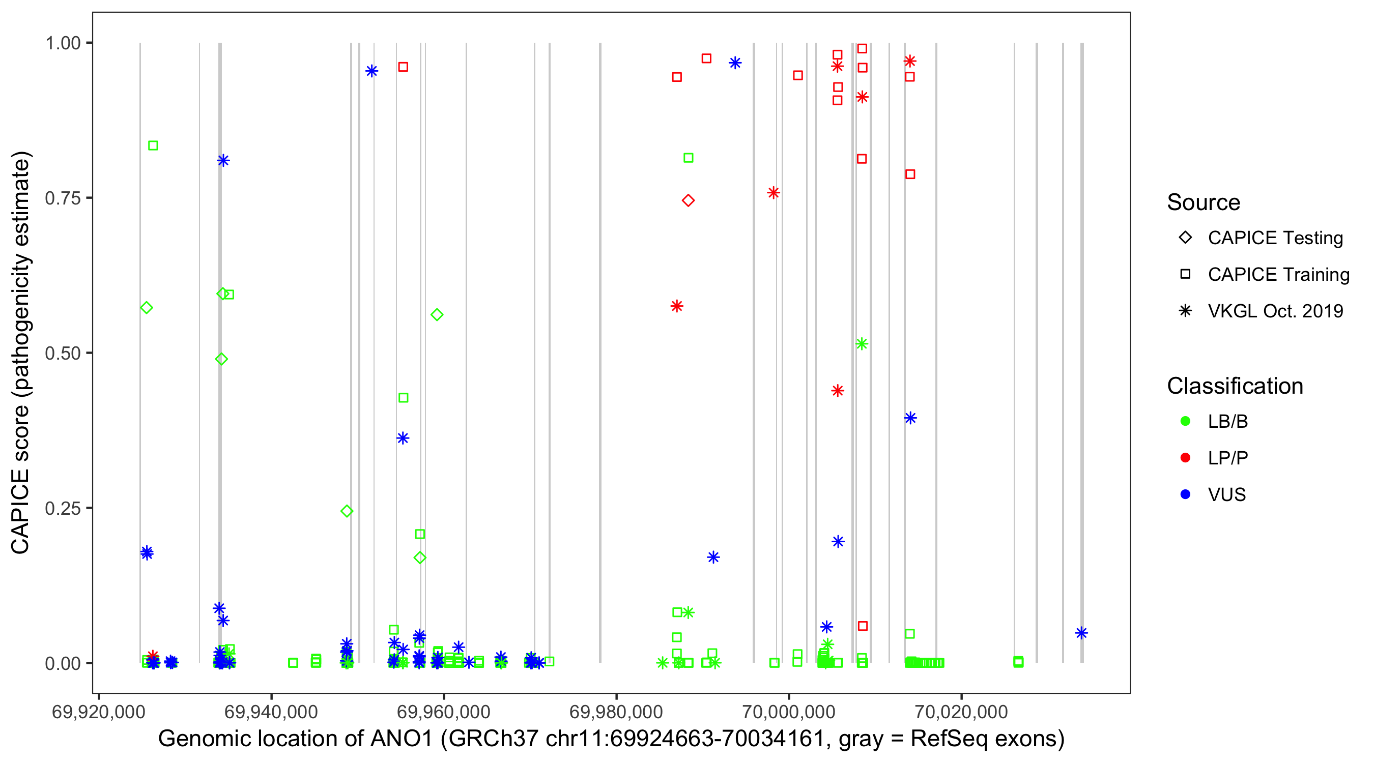 Shown are CAPICE train/test variants plus VKGL Oct 2019.
