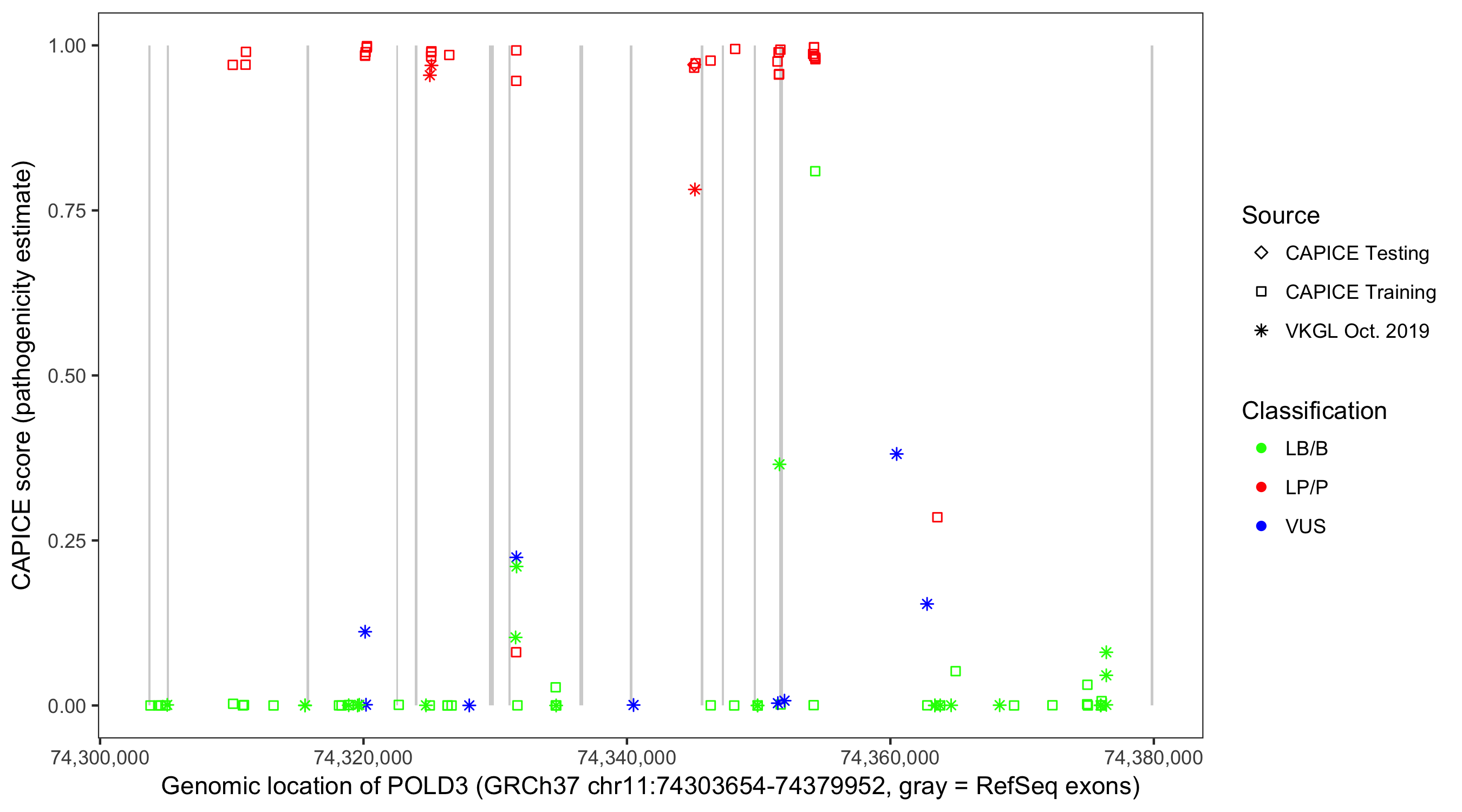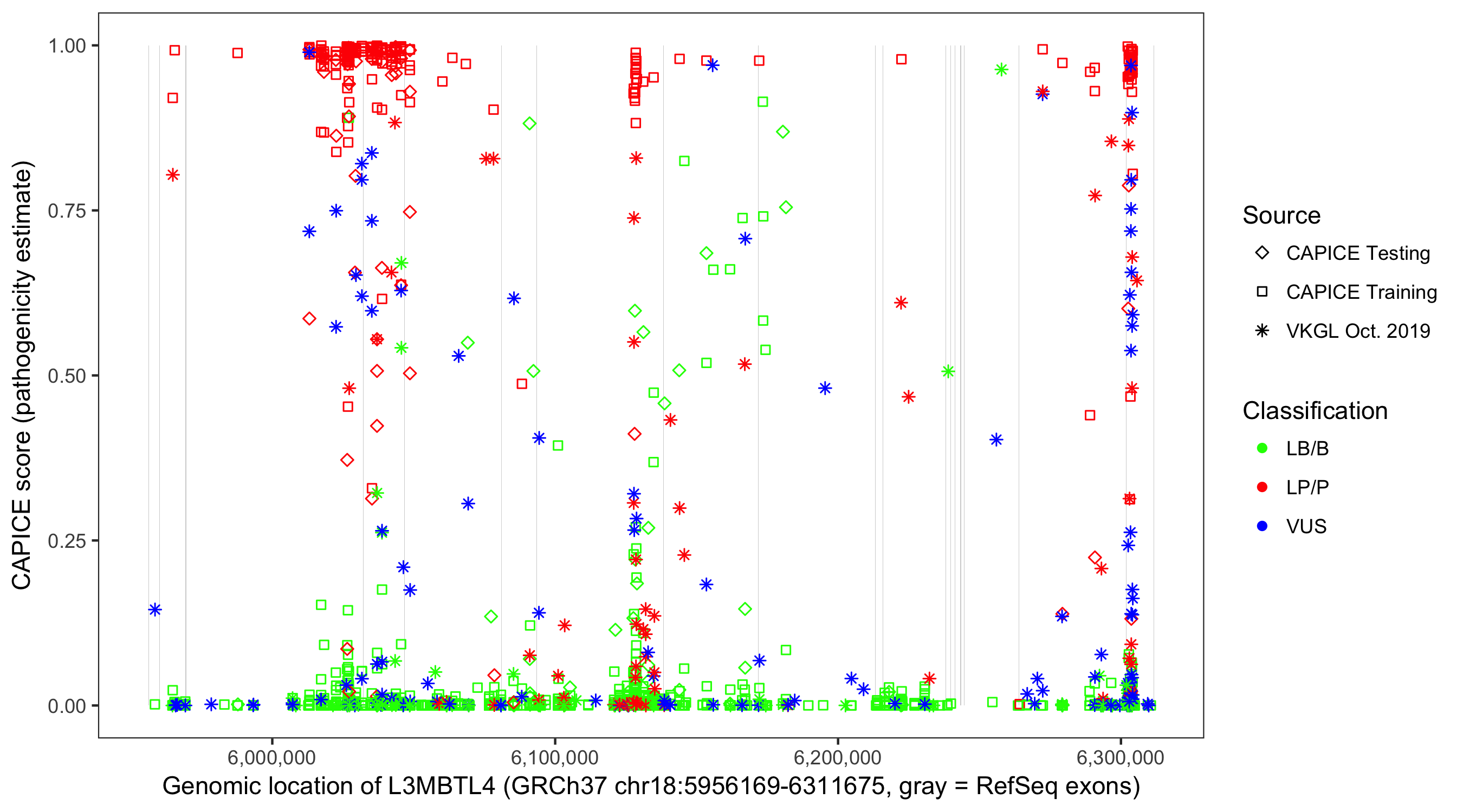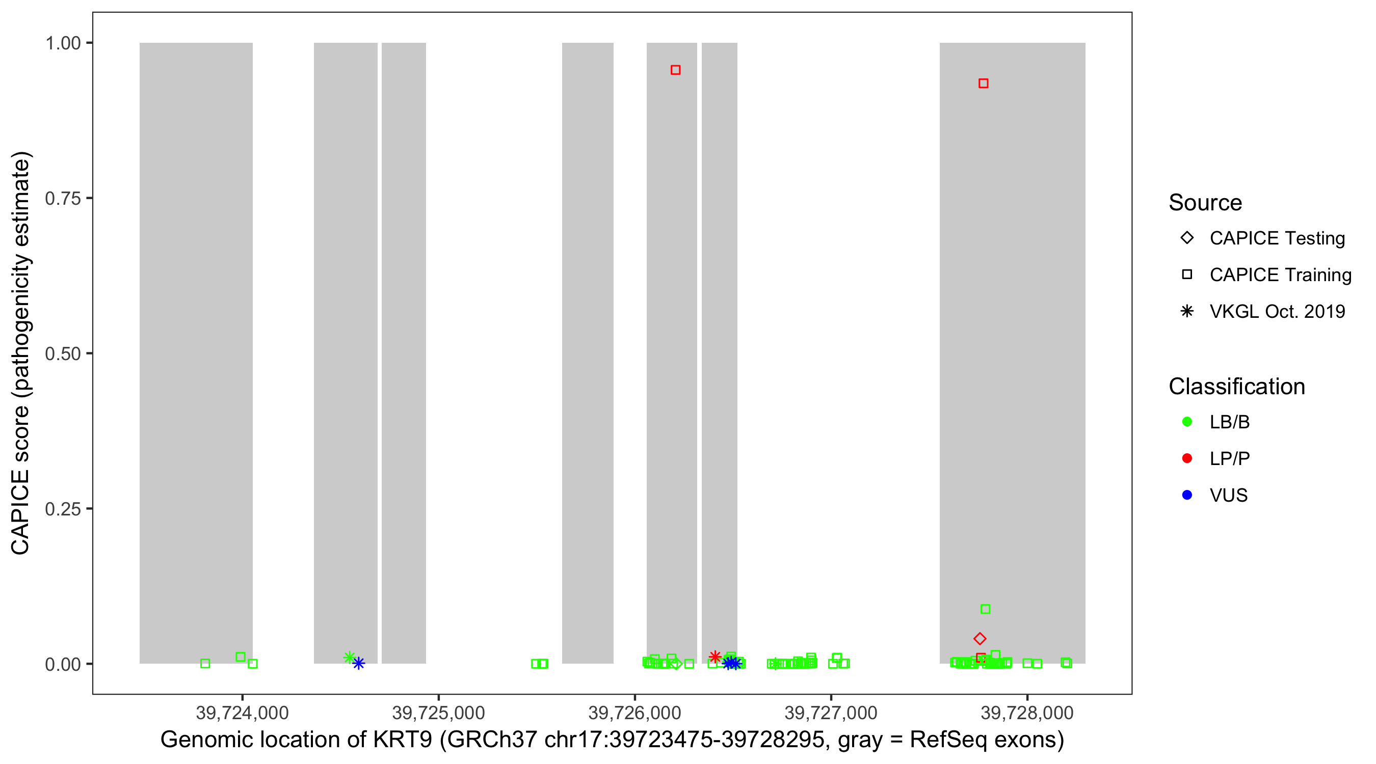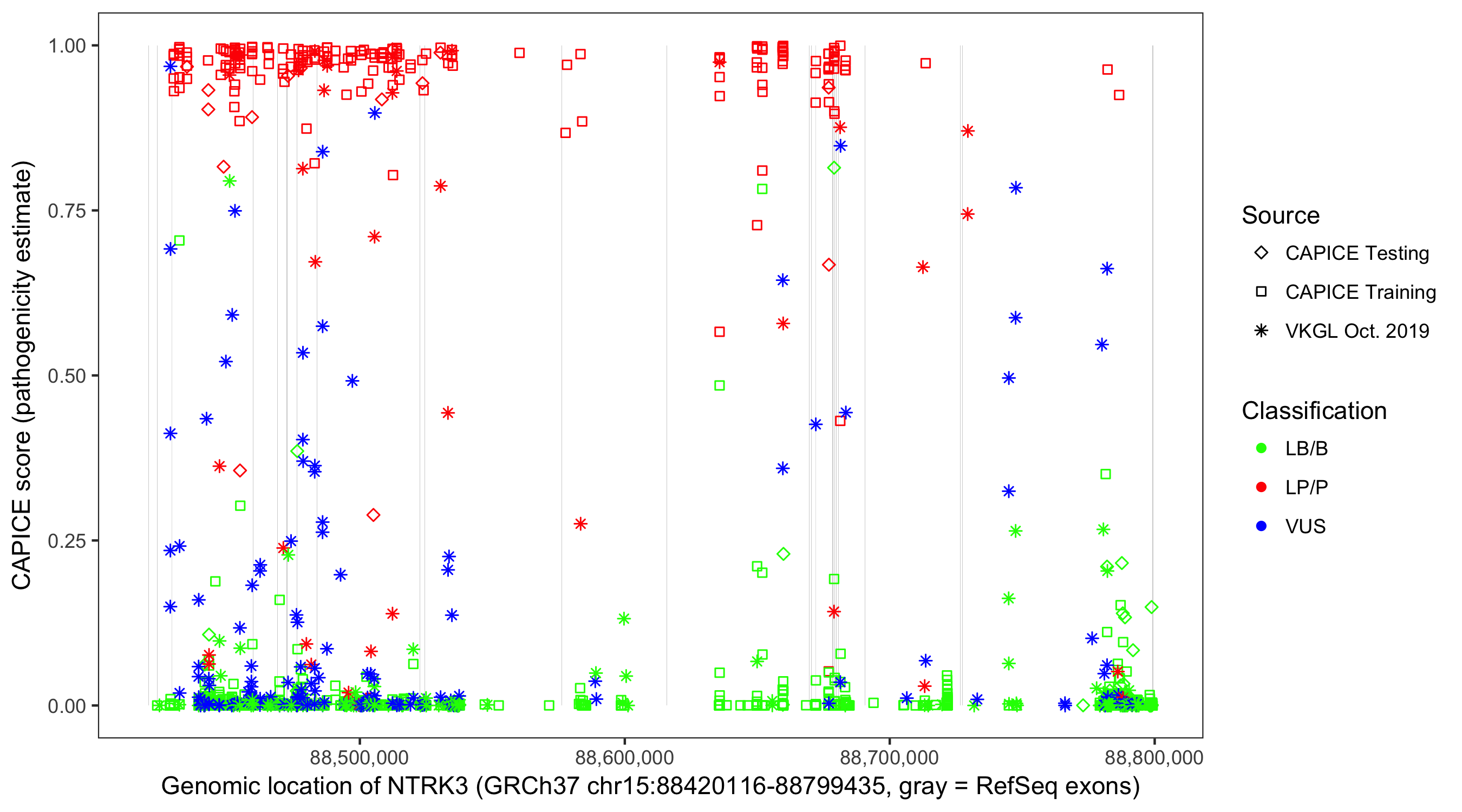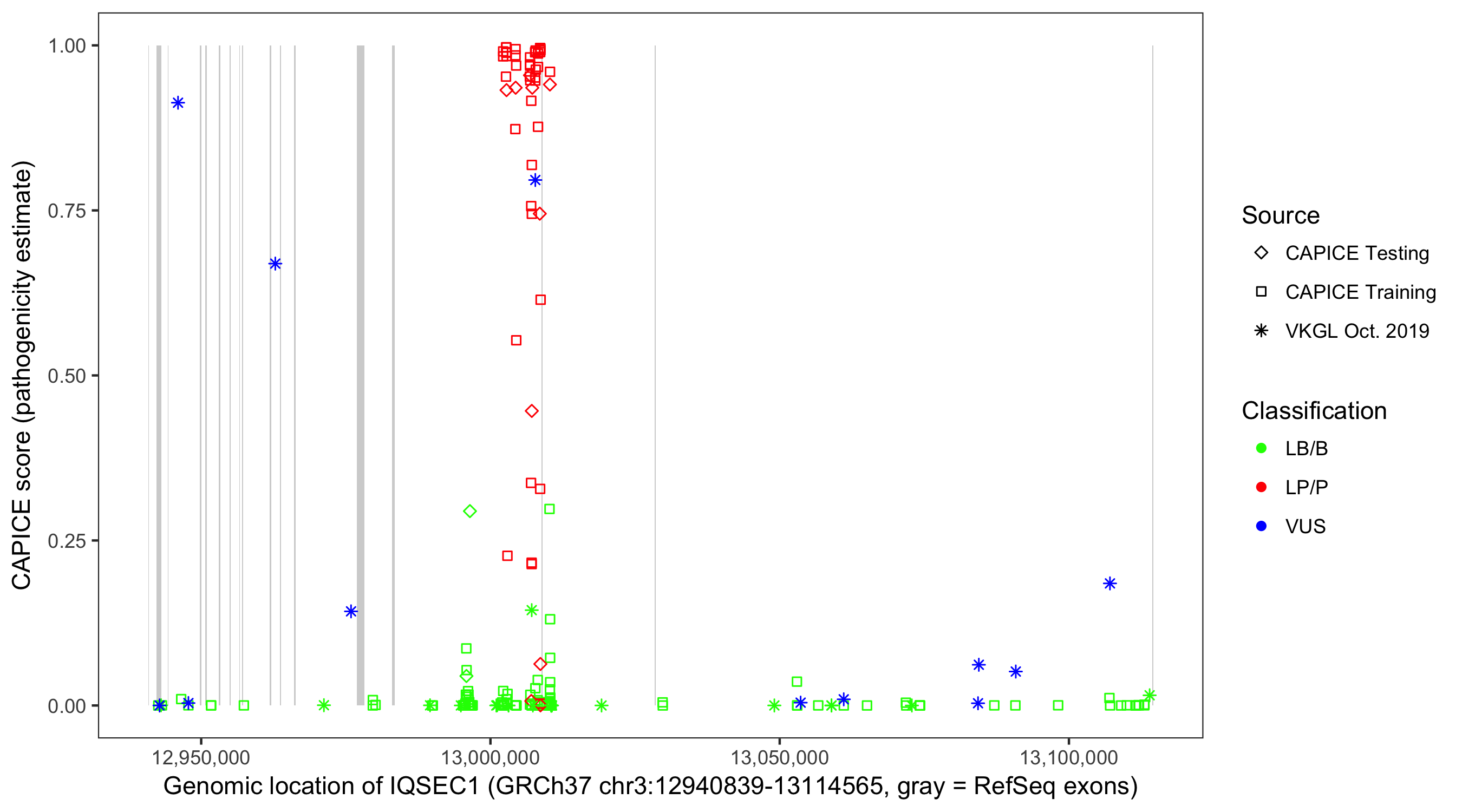 Shown are CAPICE train/test variants plus VKGL Oct 2019.