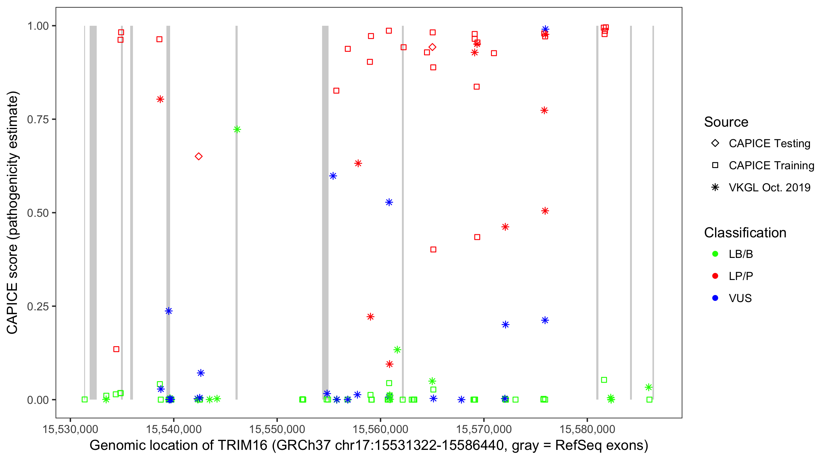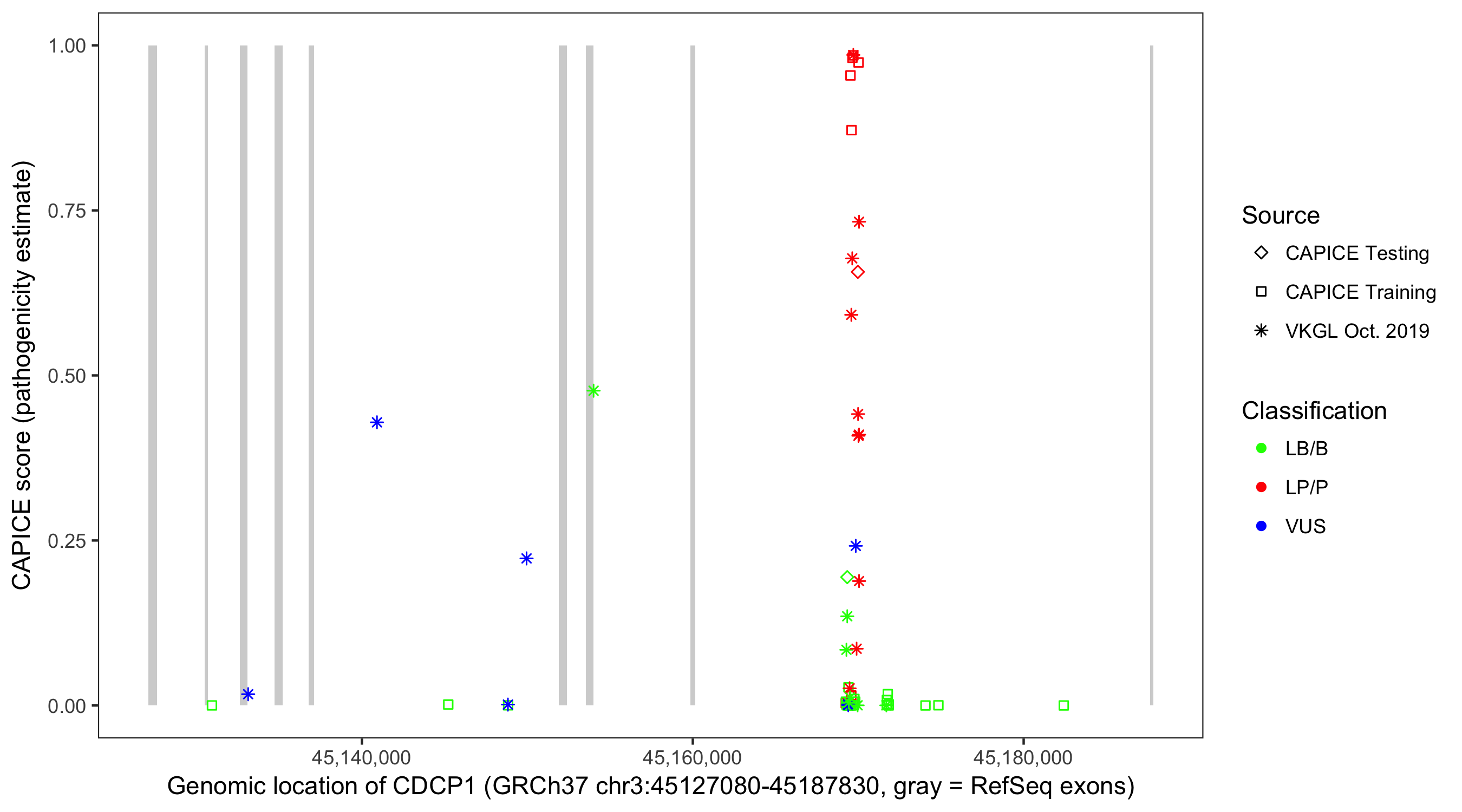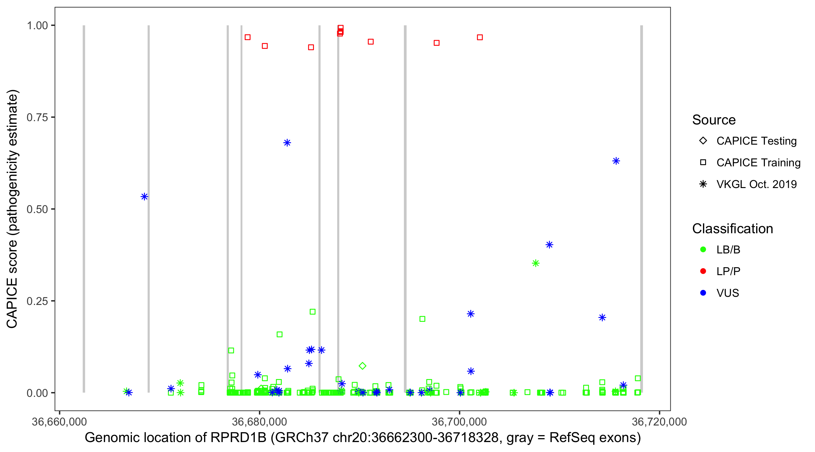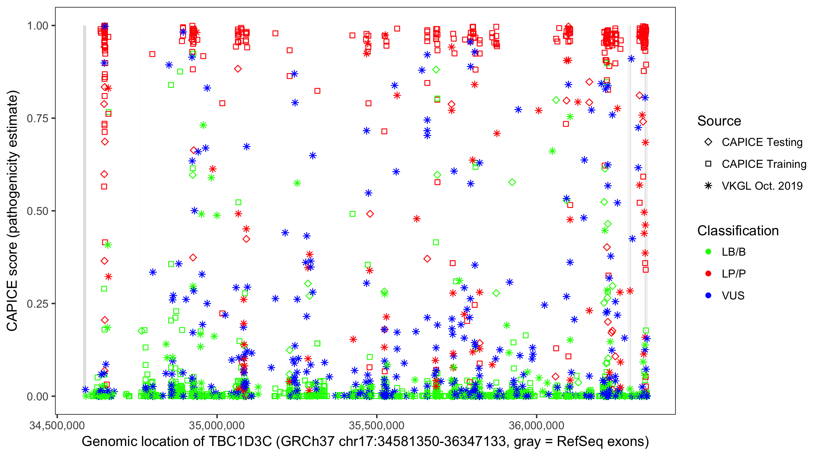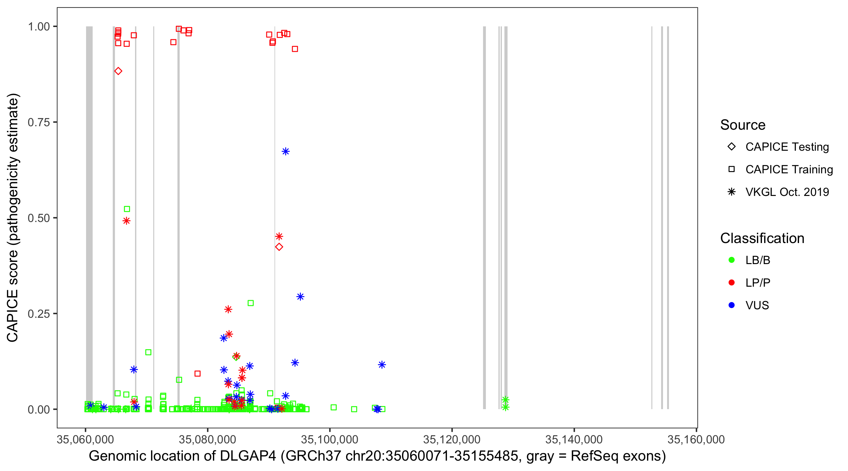 Shown are CAPICE train/test variants plus VKGL Oct 2019.