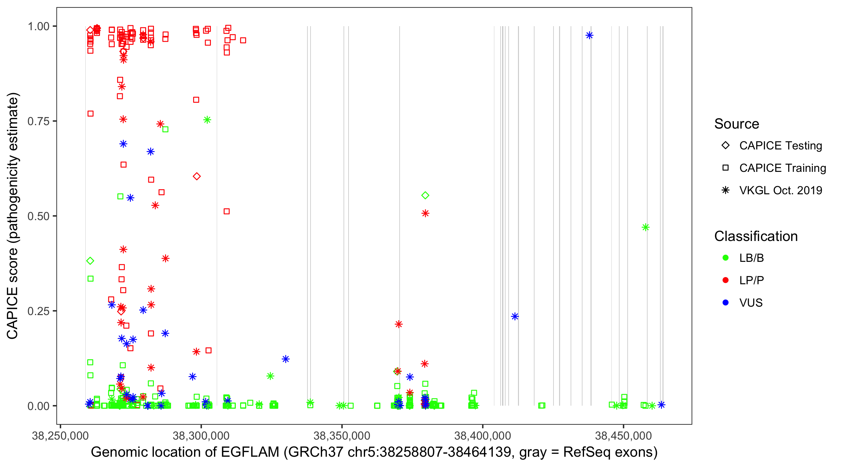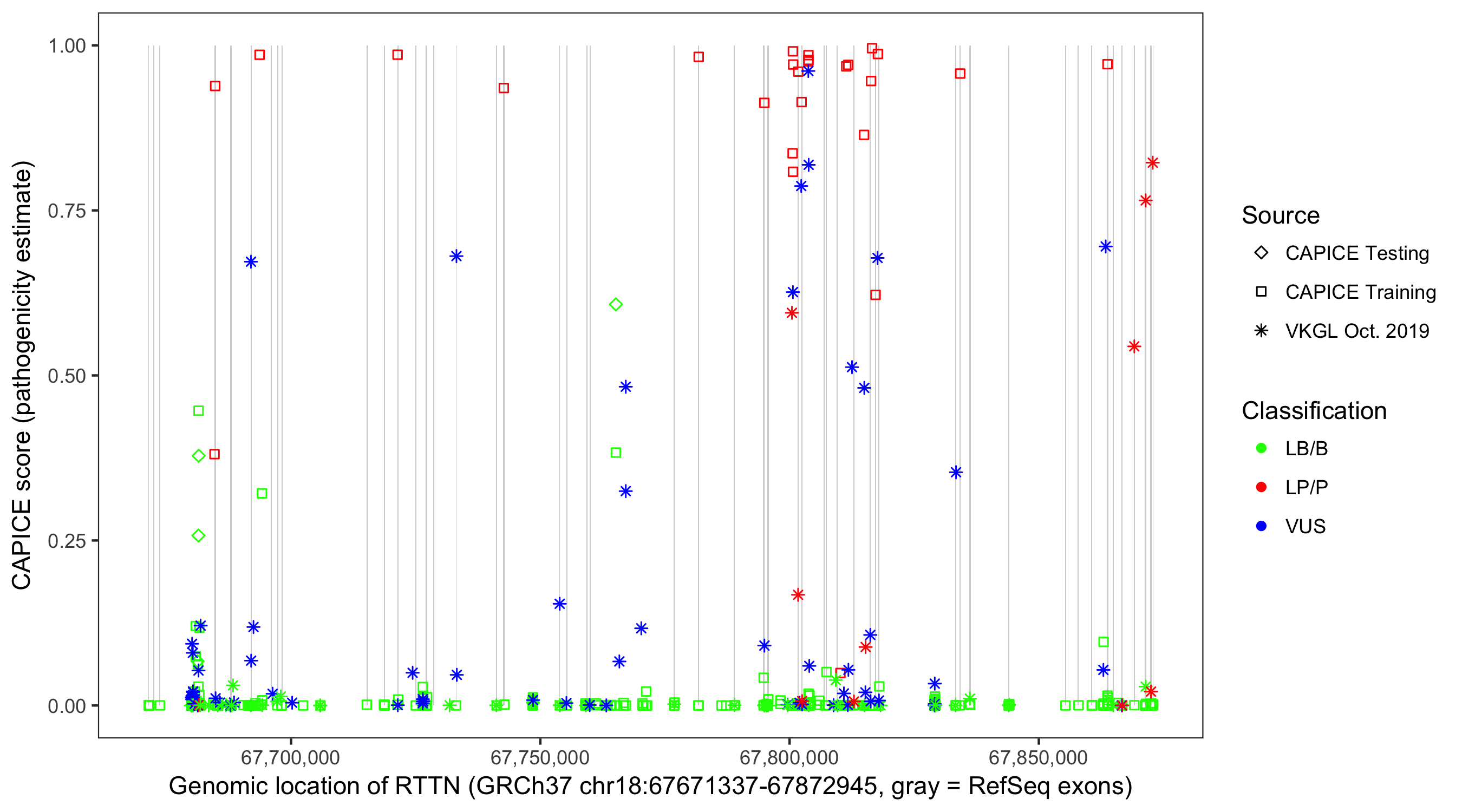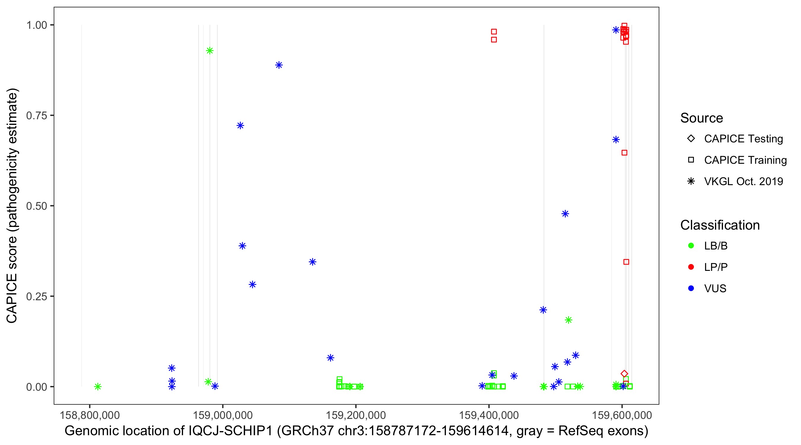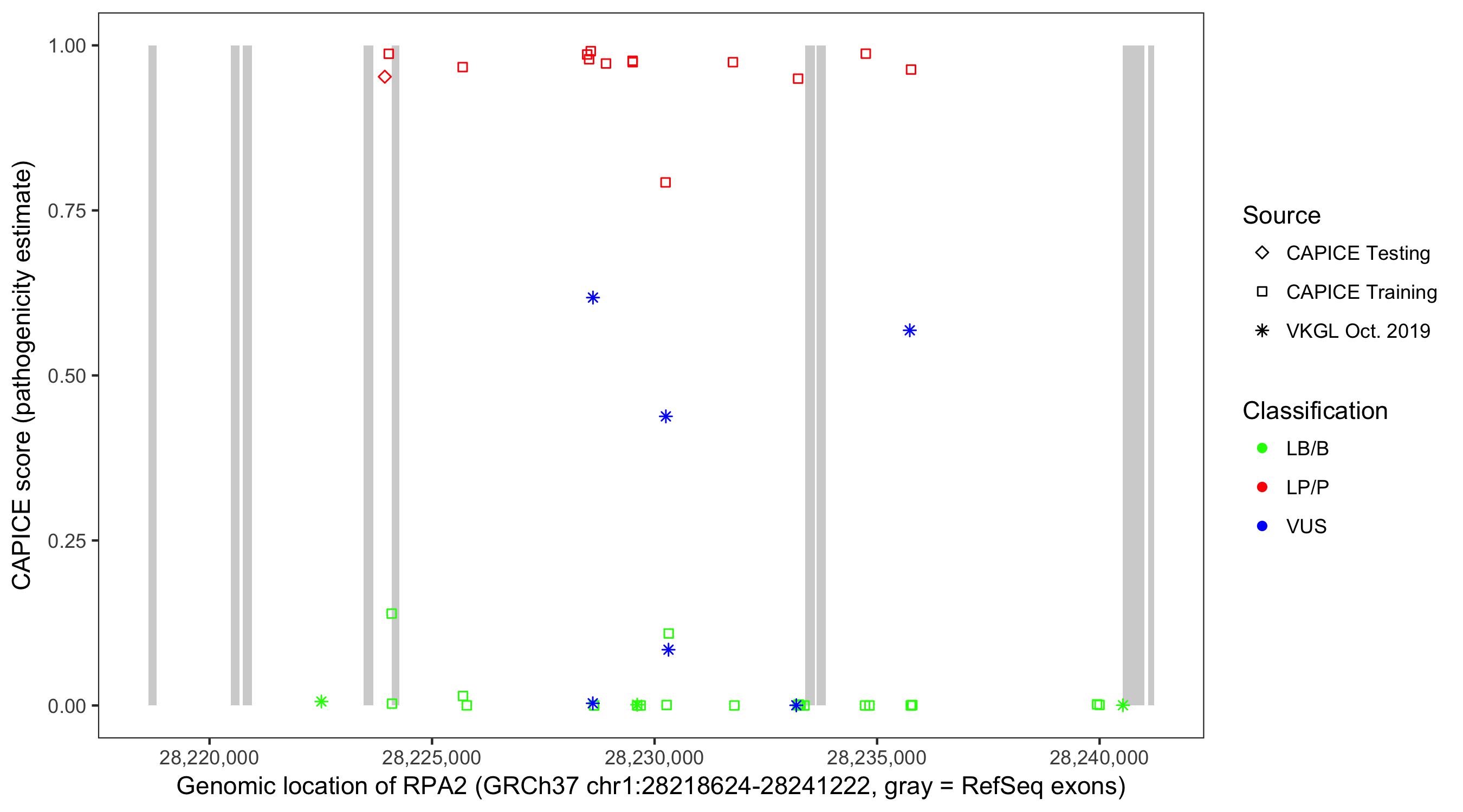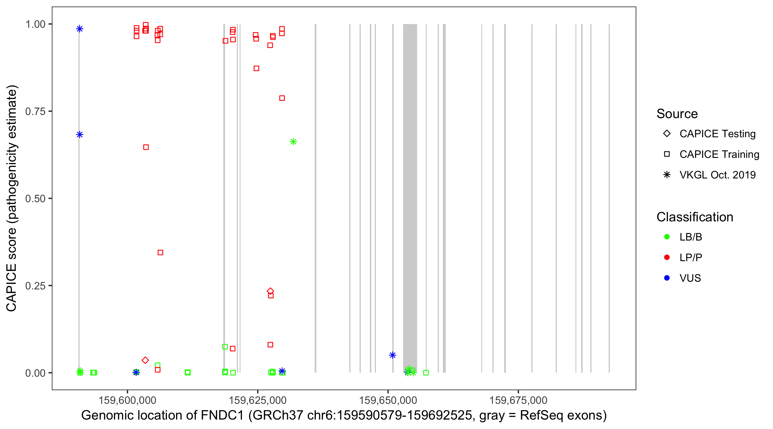 Shown are CAPICE train/test variants plus VKGL Oct 2019.