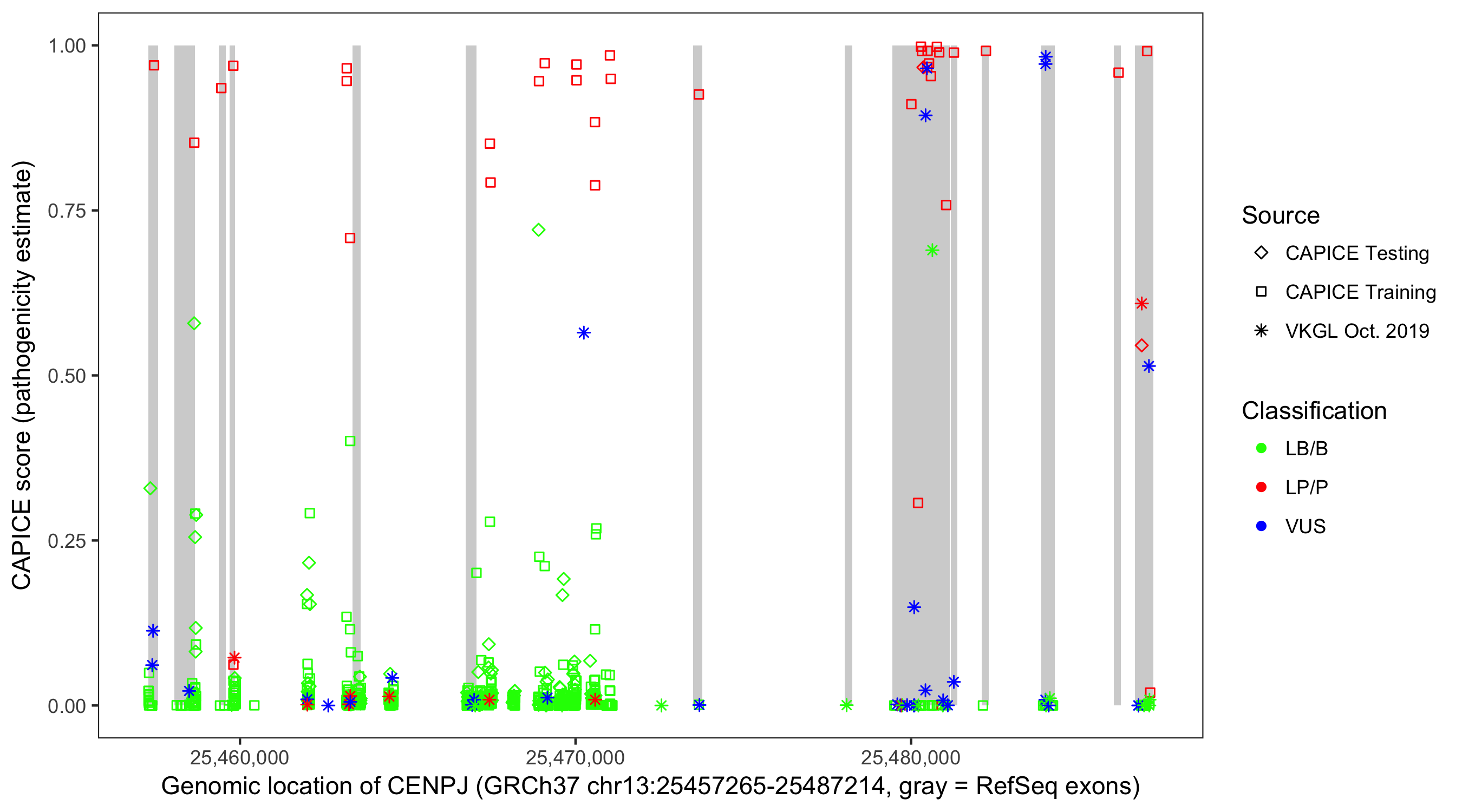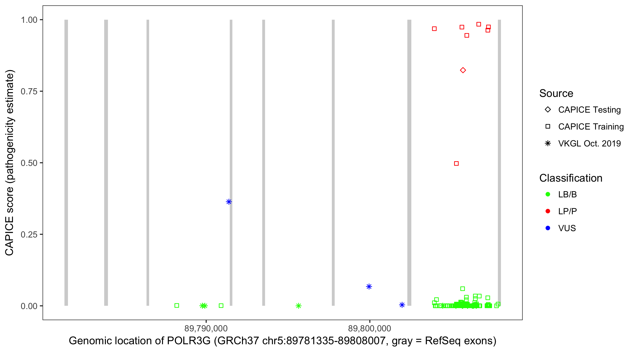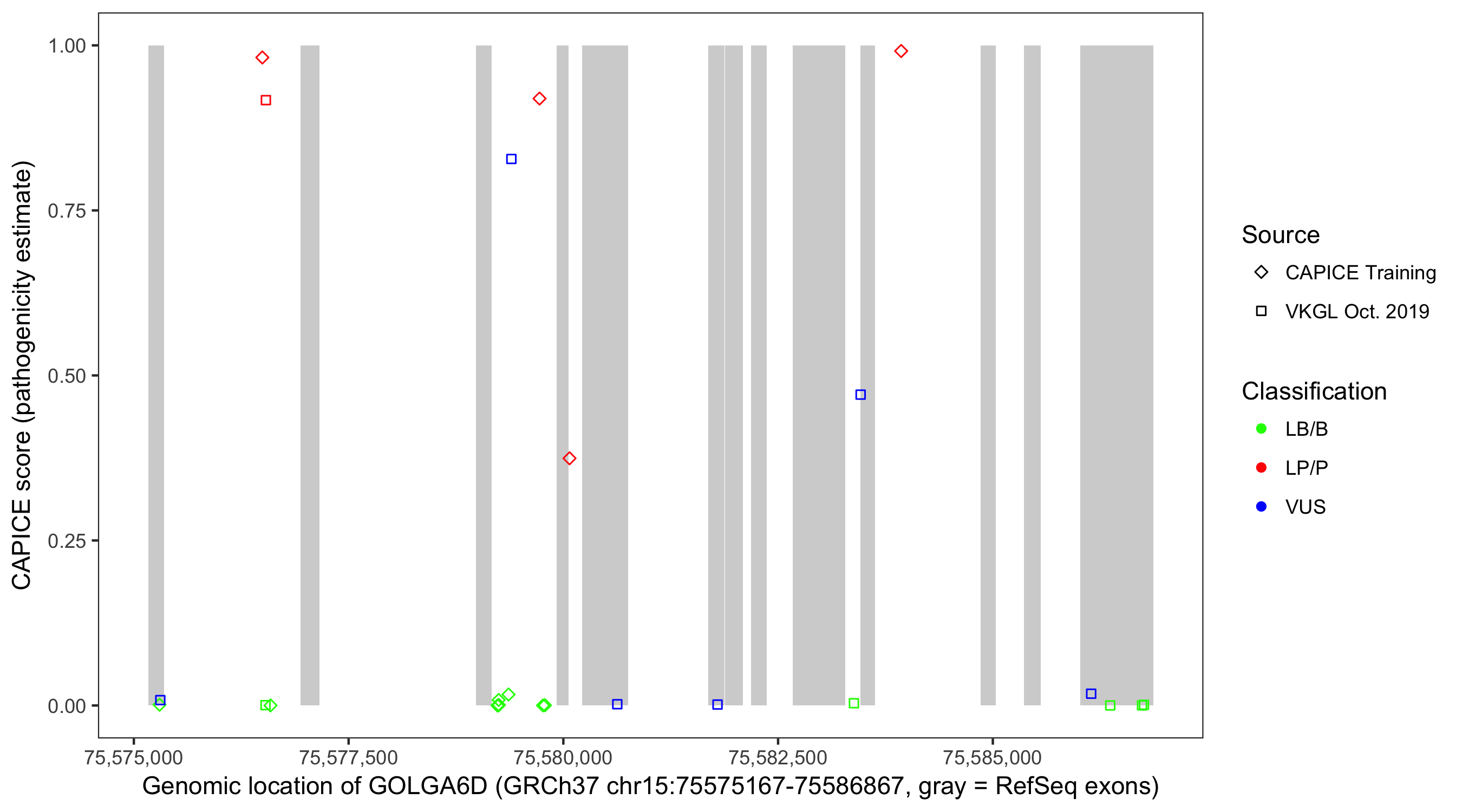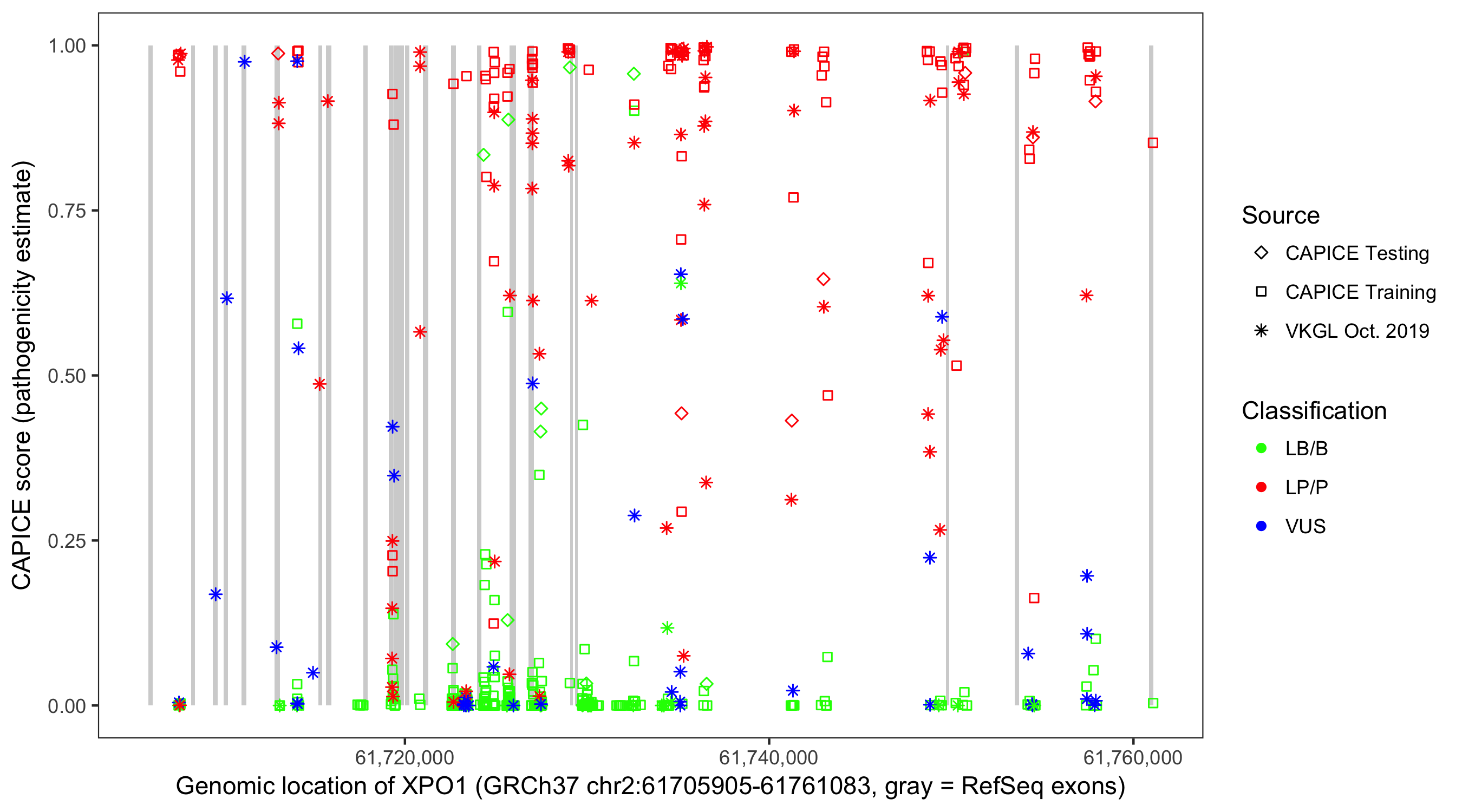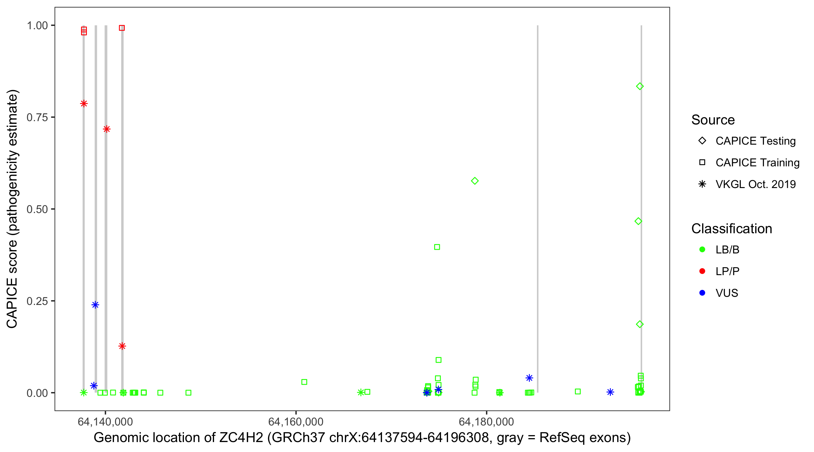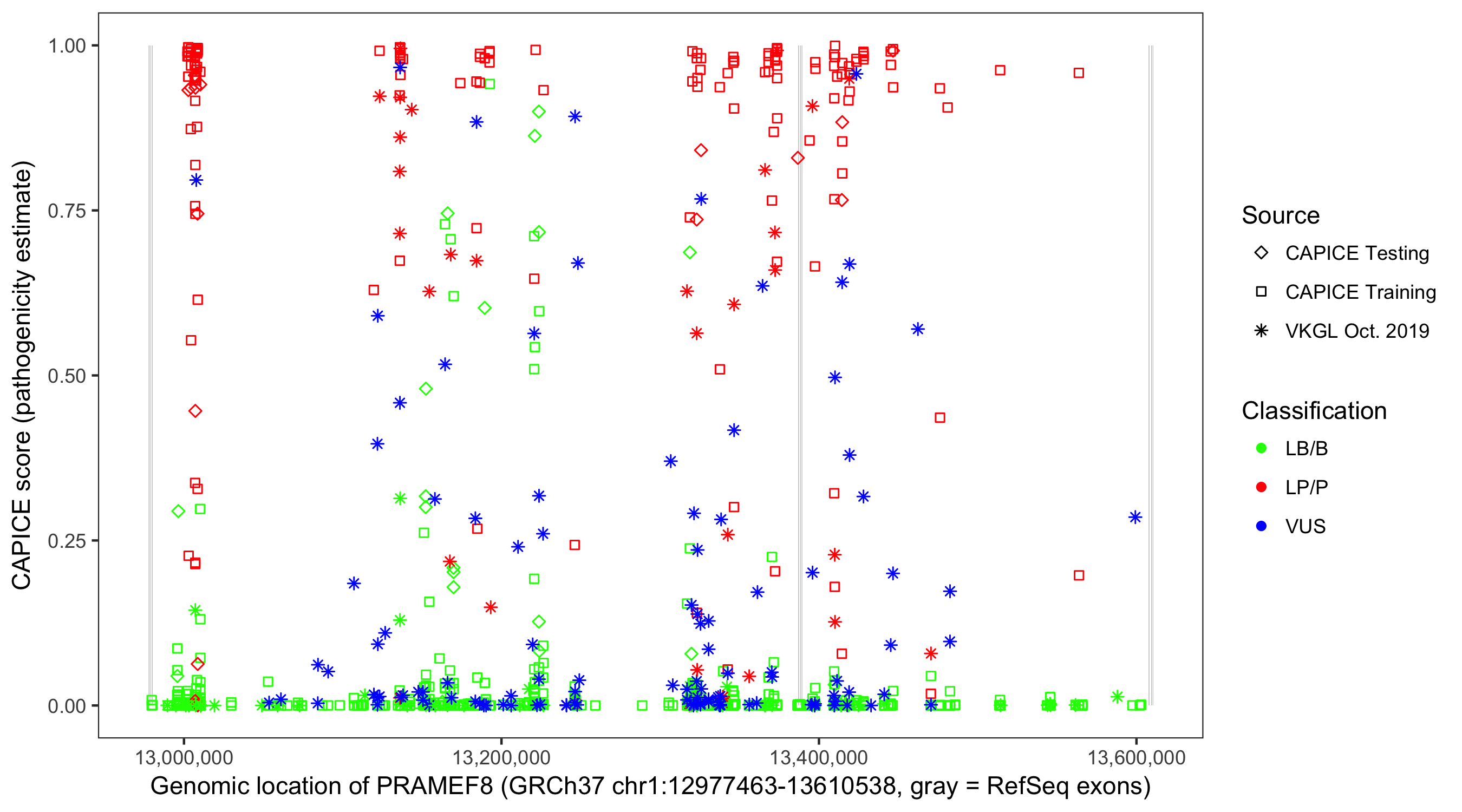 Shown are CAPICE train/test variants plus VKGL Oct 2019.