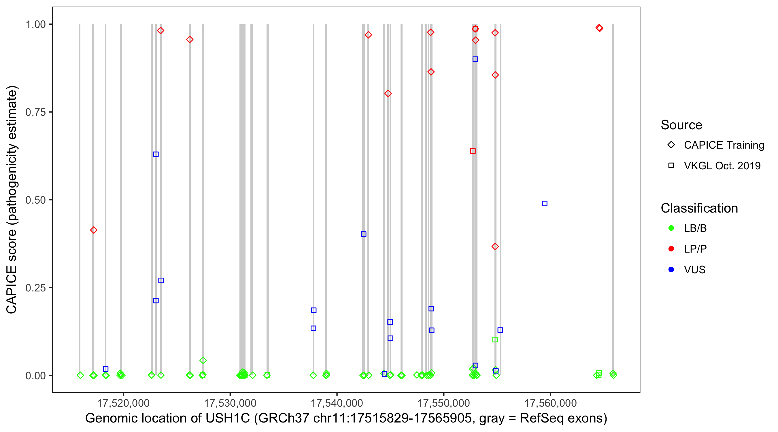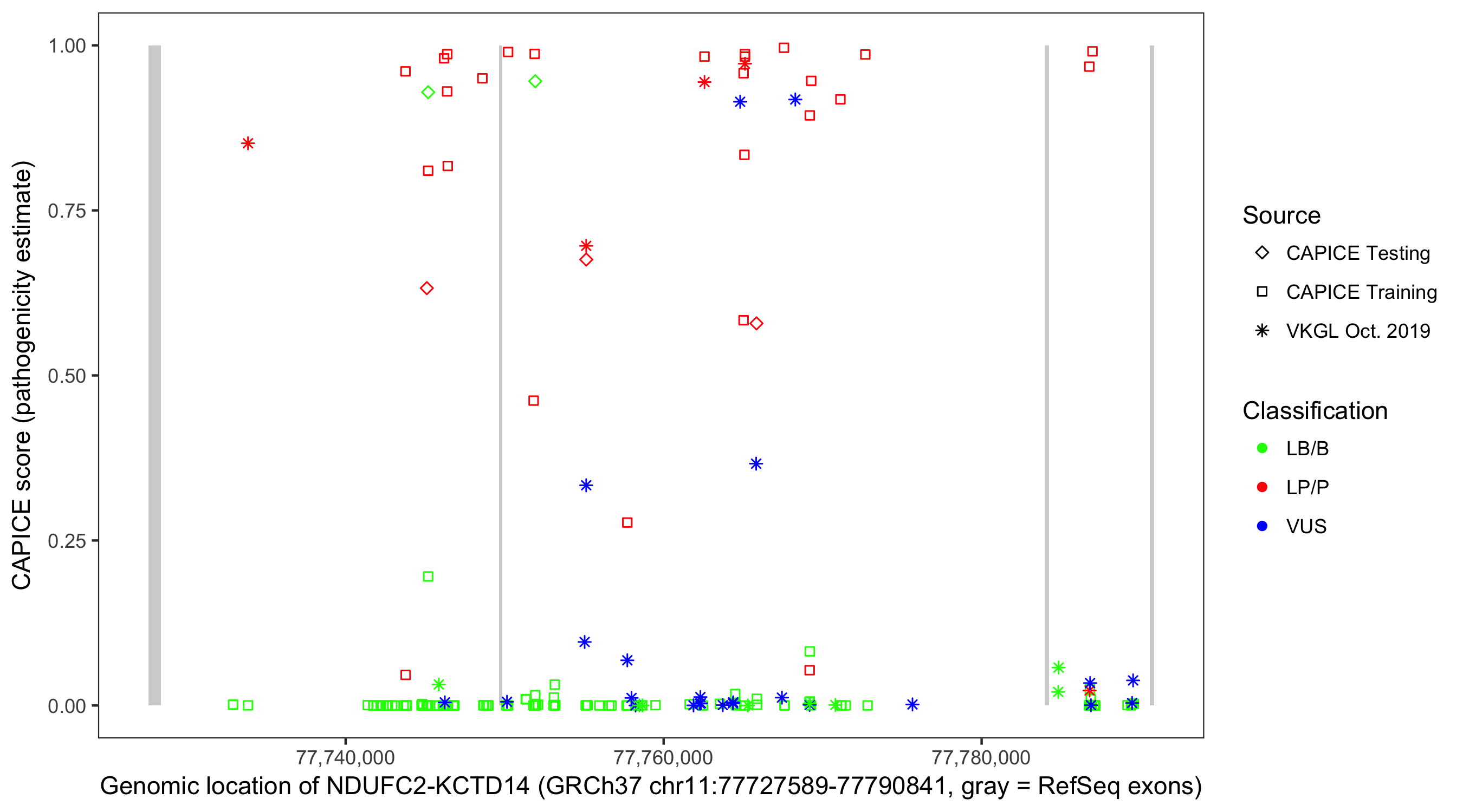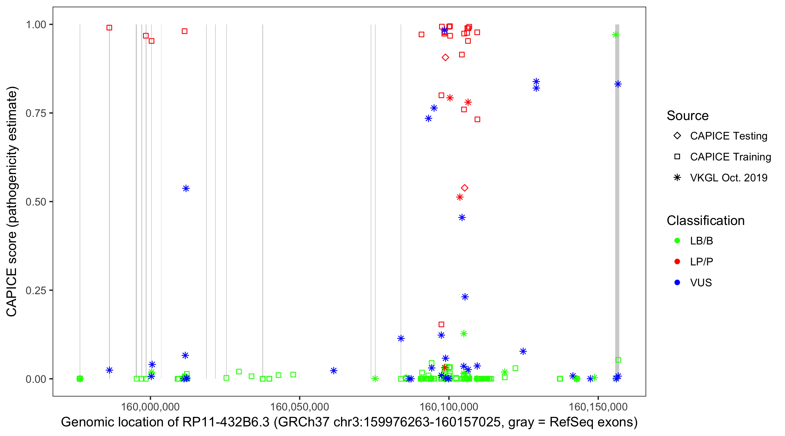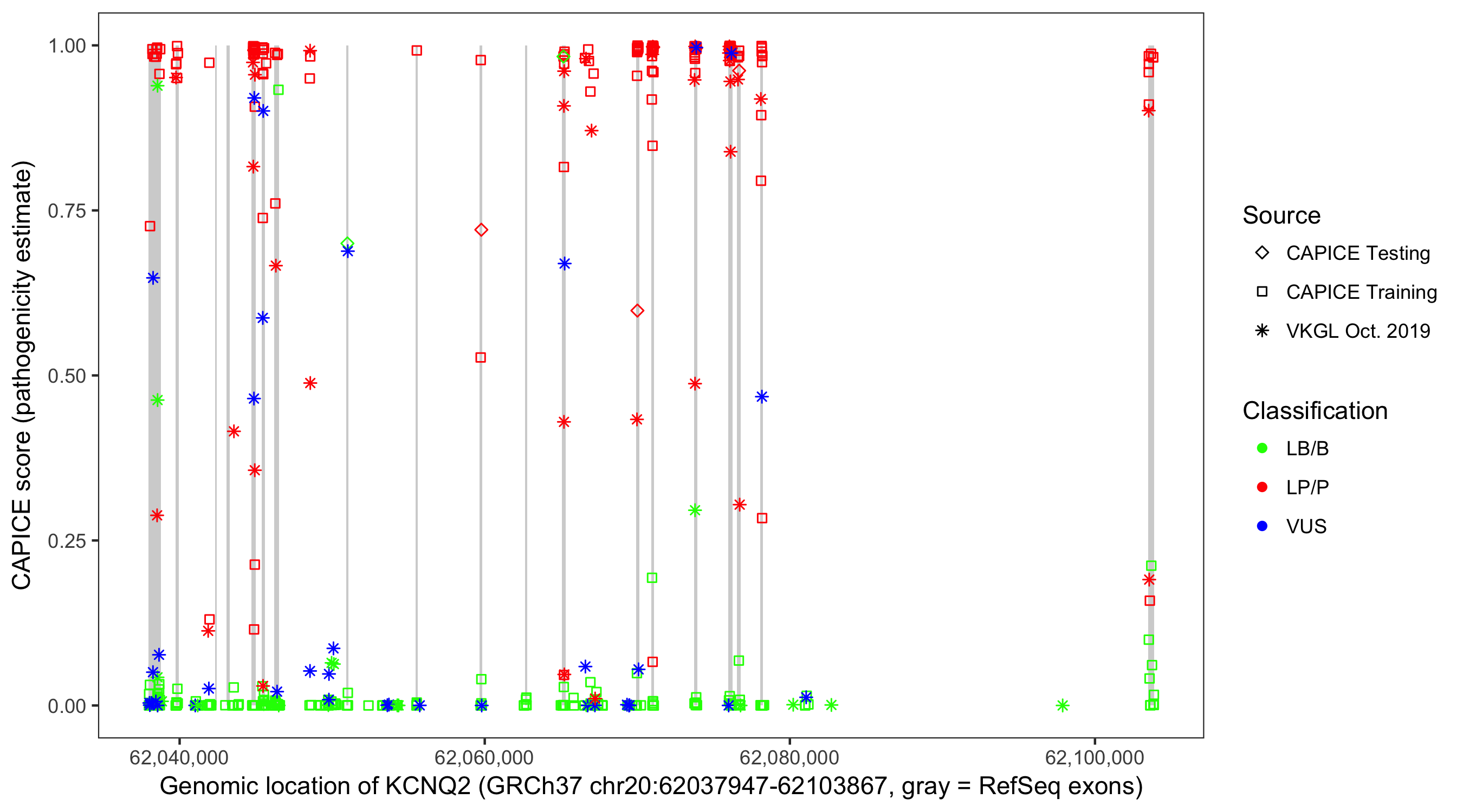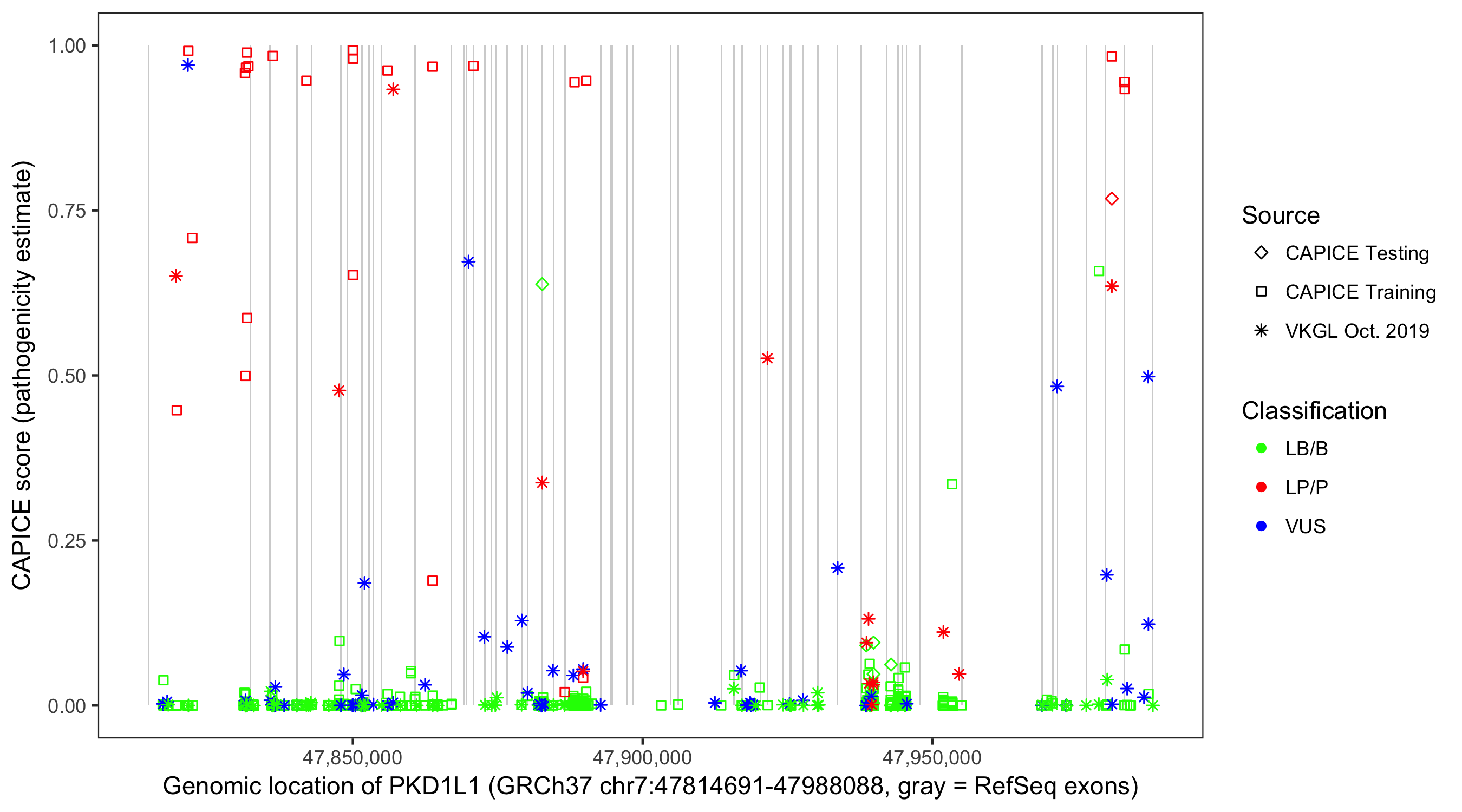 Shown are CAPICE train/test variants plus VKGL Oct 2019.