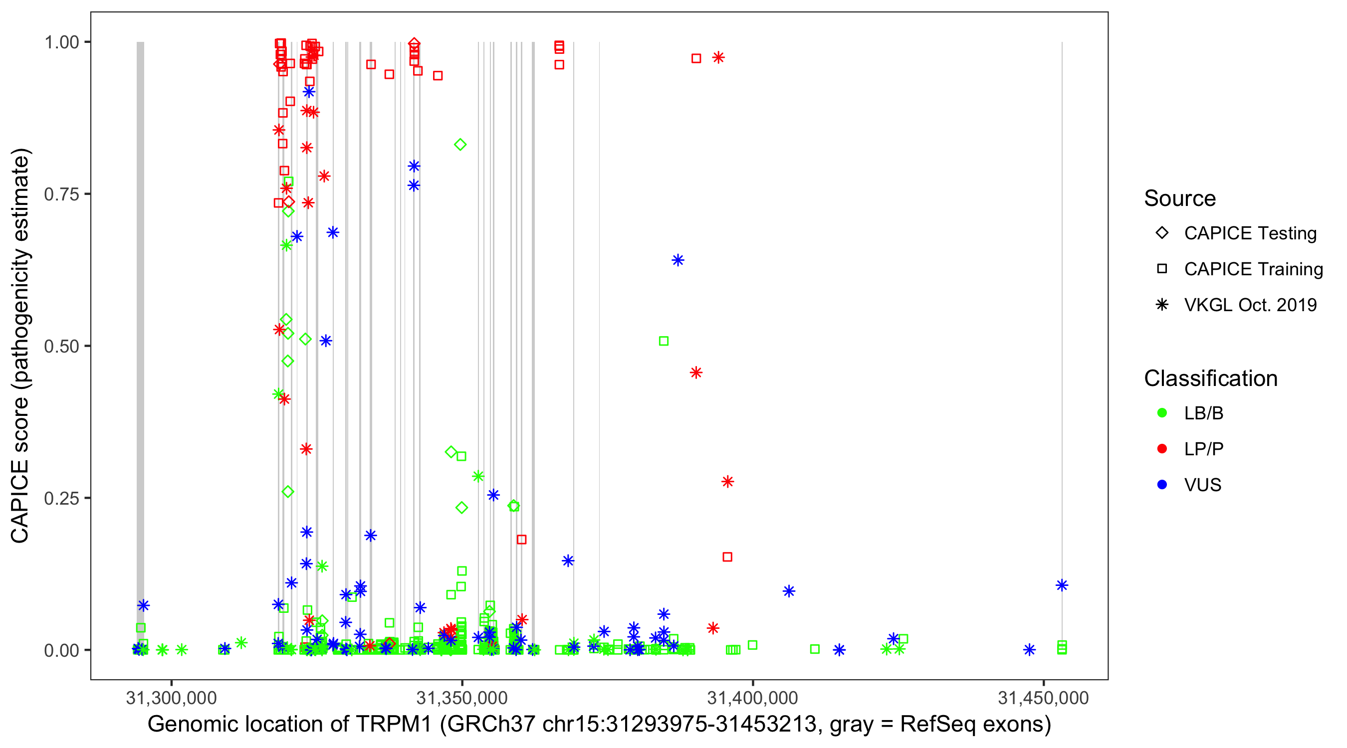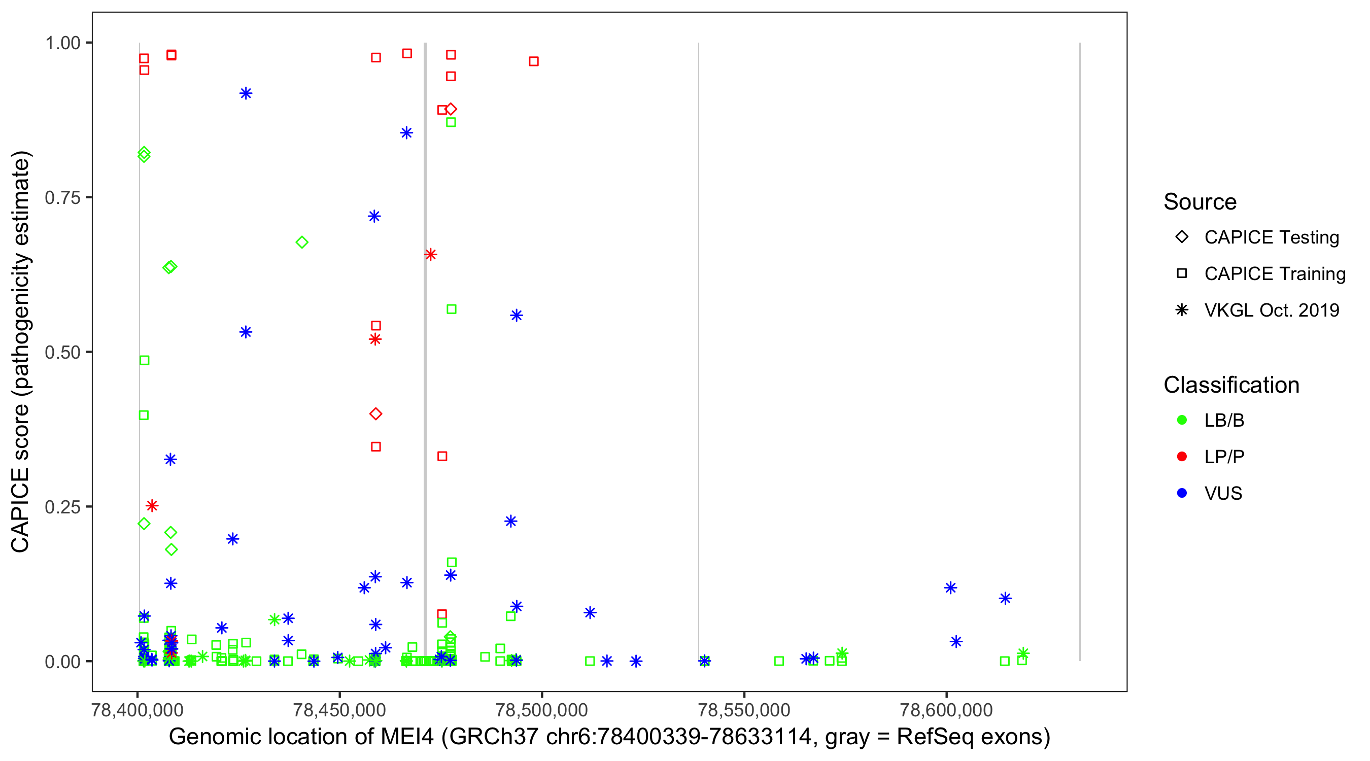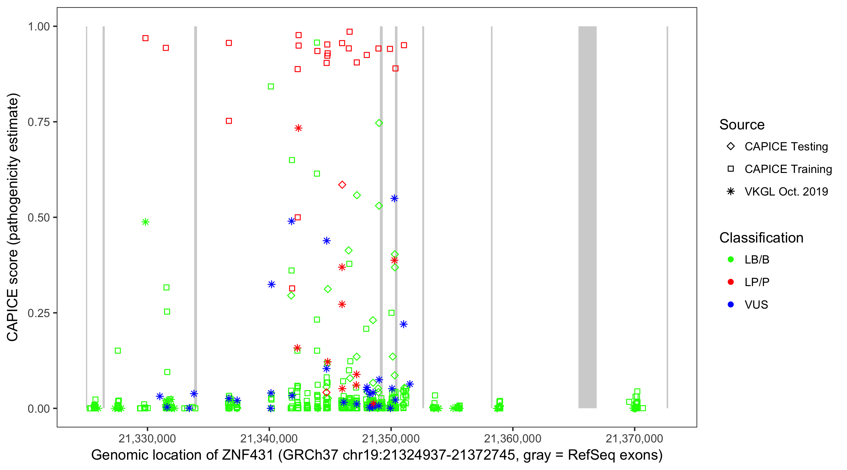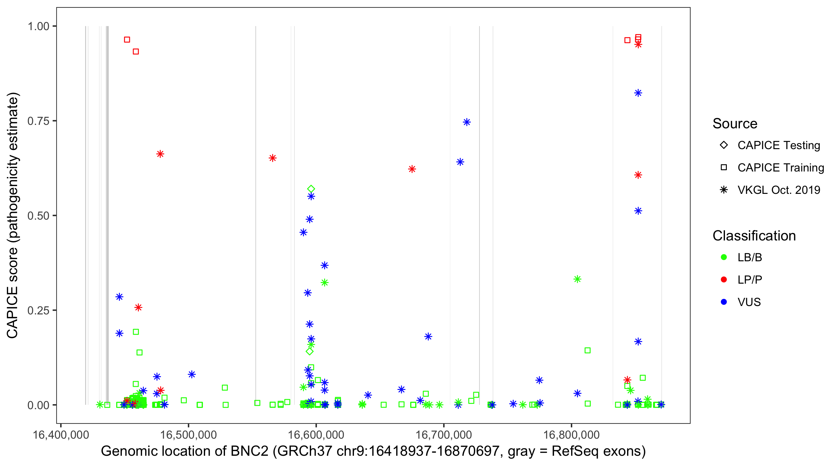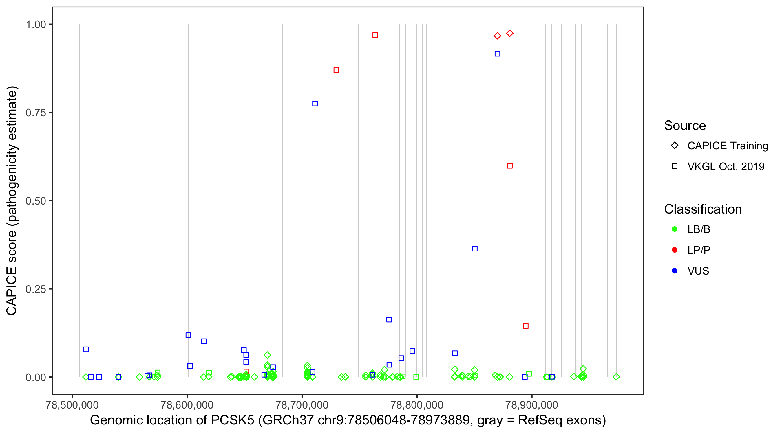 Shown are CAPICE train/test variants plus VKGL Oct 2019.