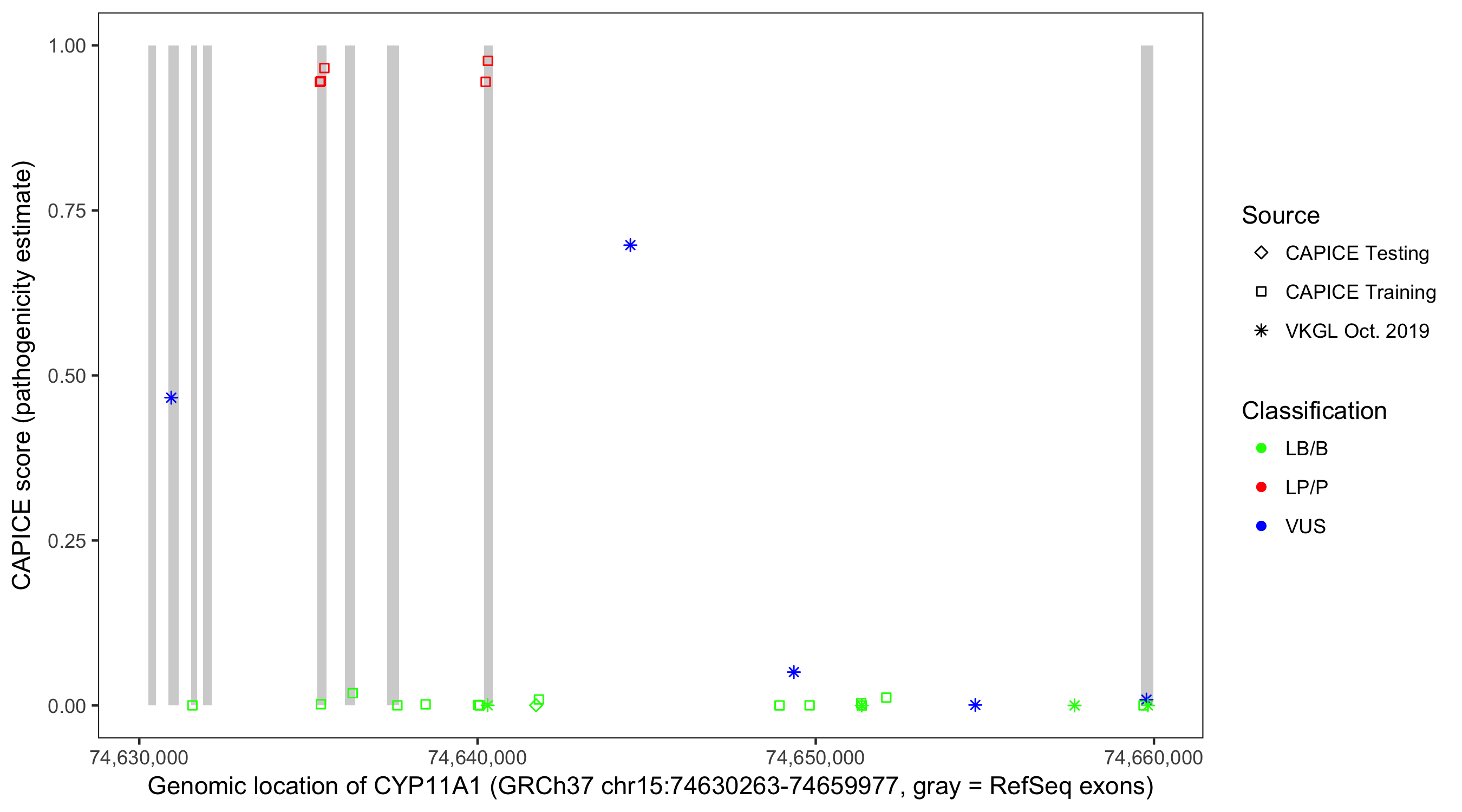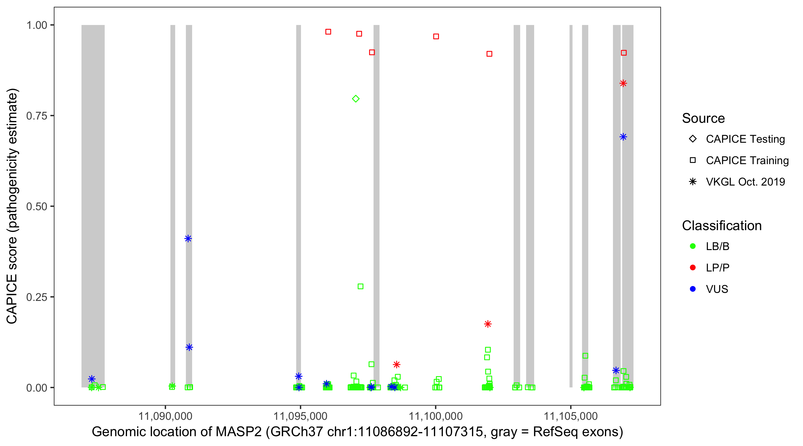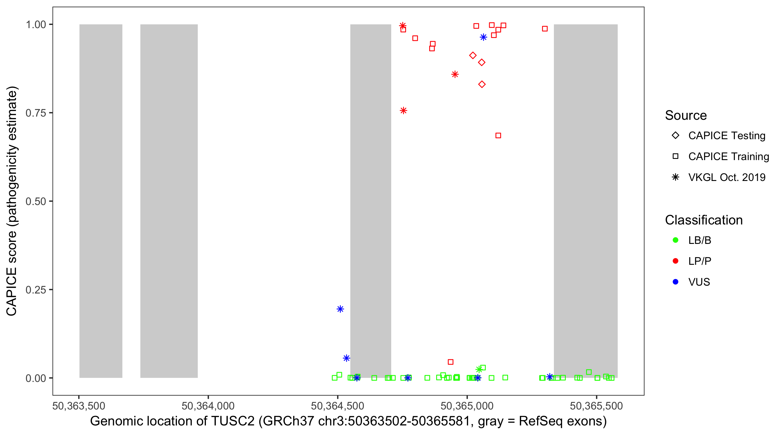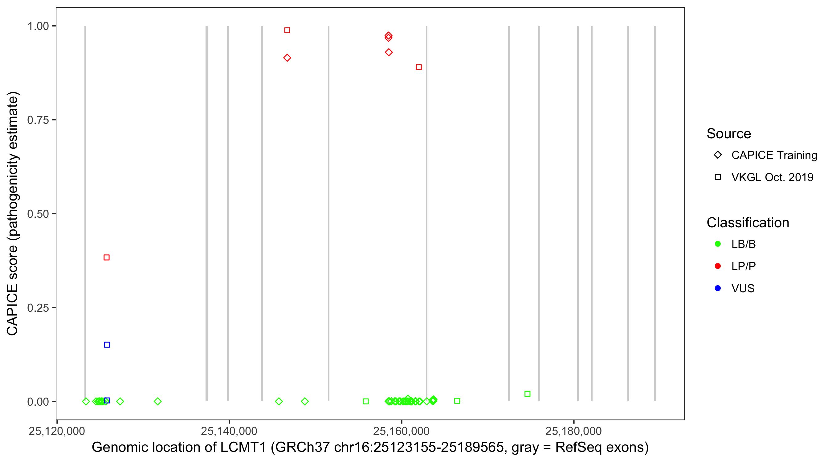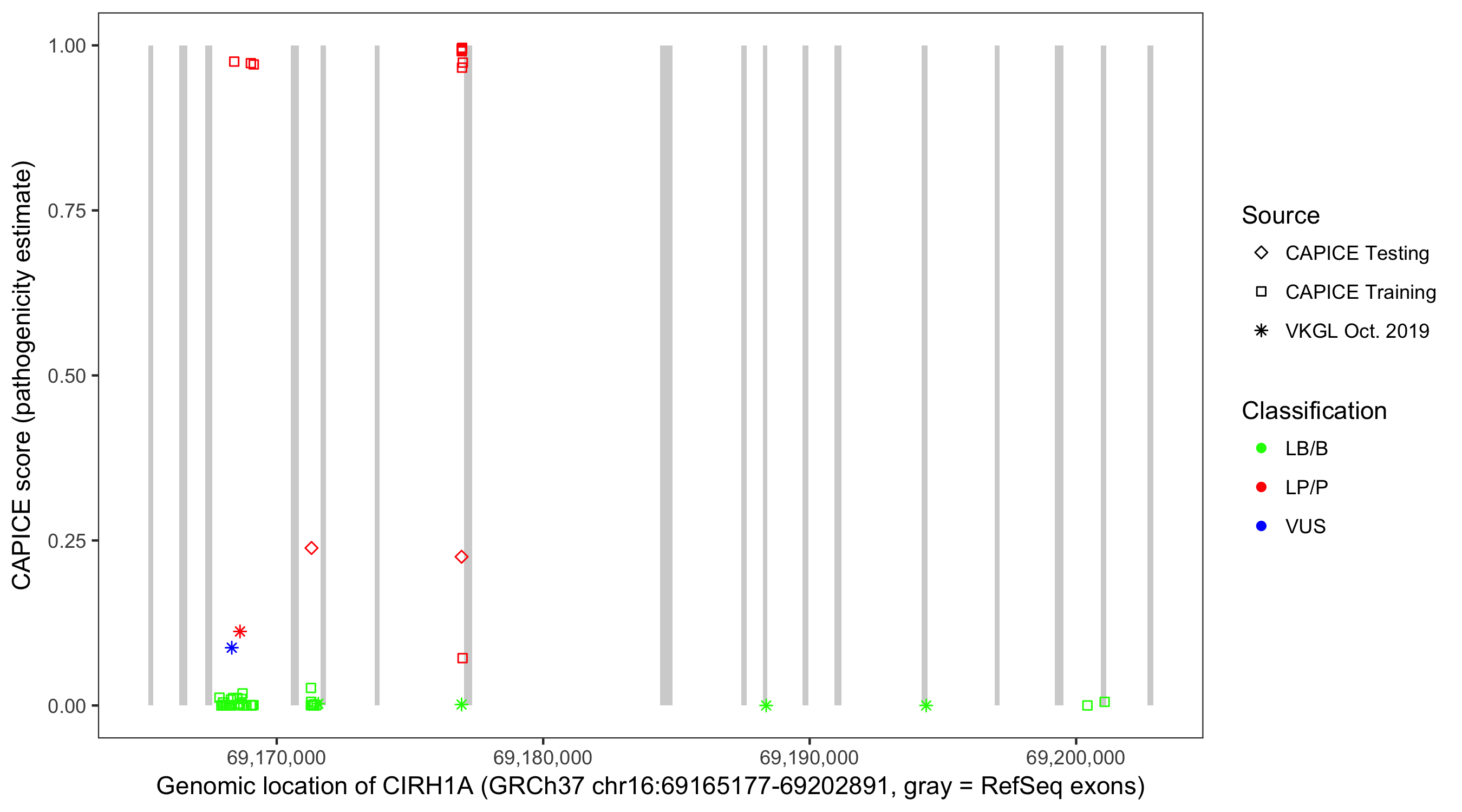 Shown are CAPICE train/test variants plus VKGL Oct 2019.