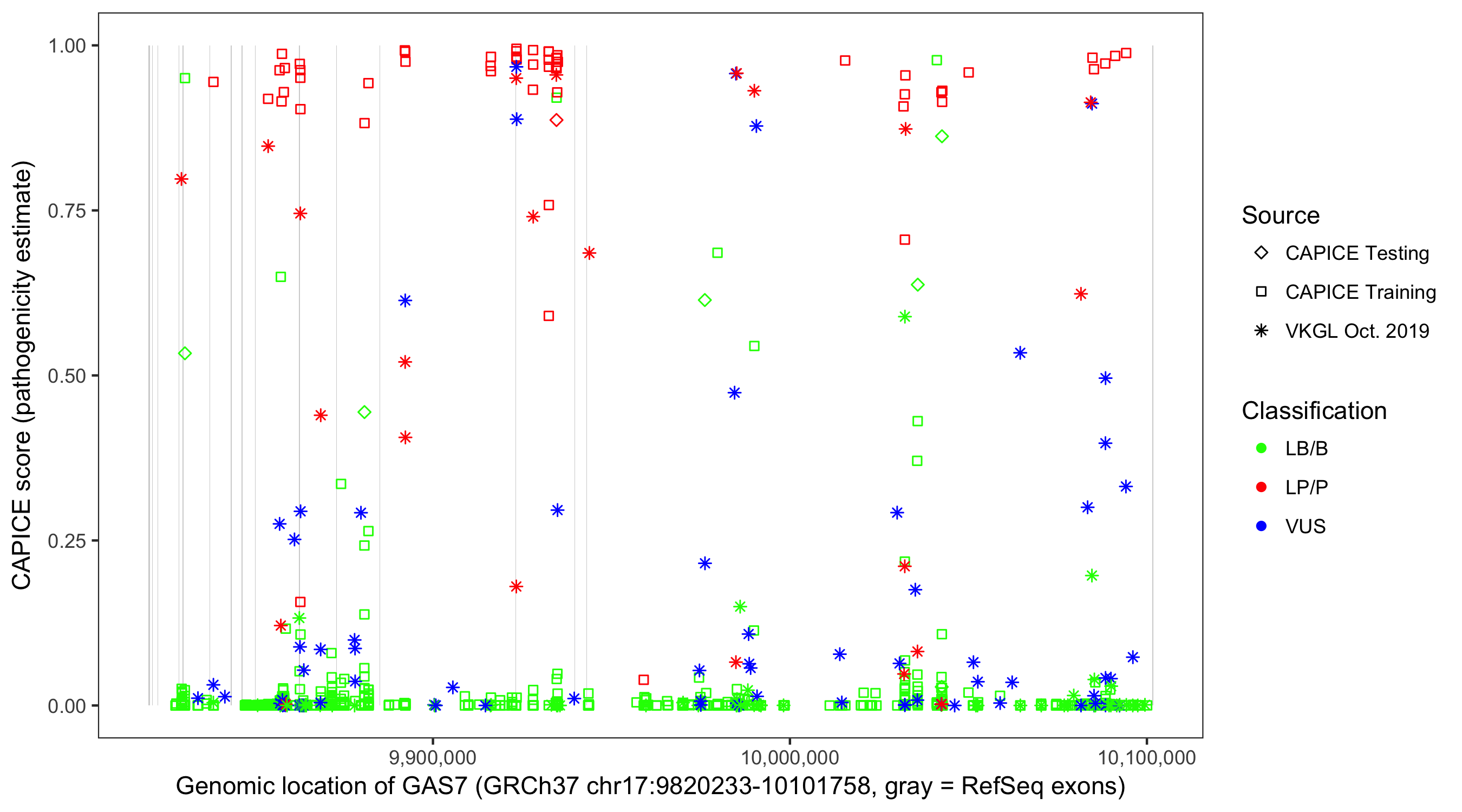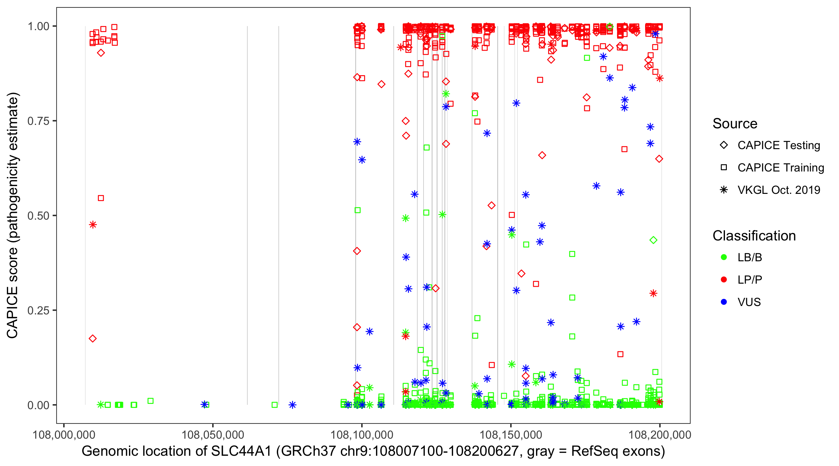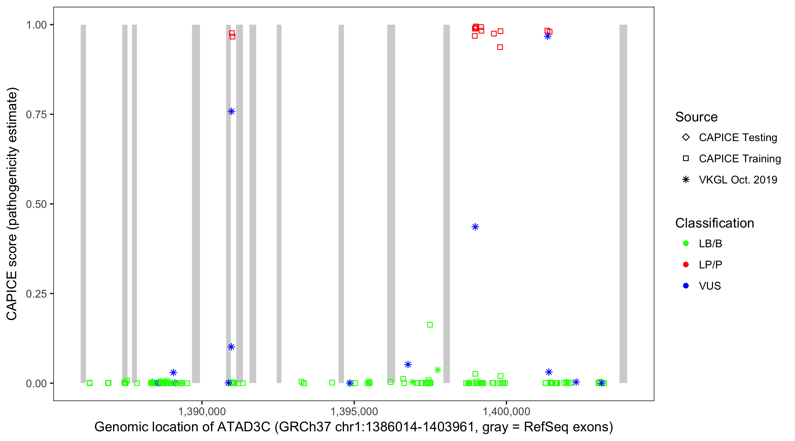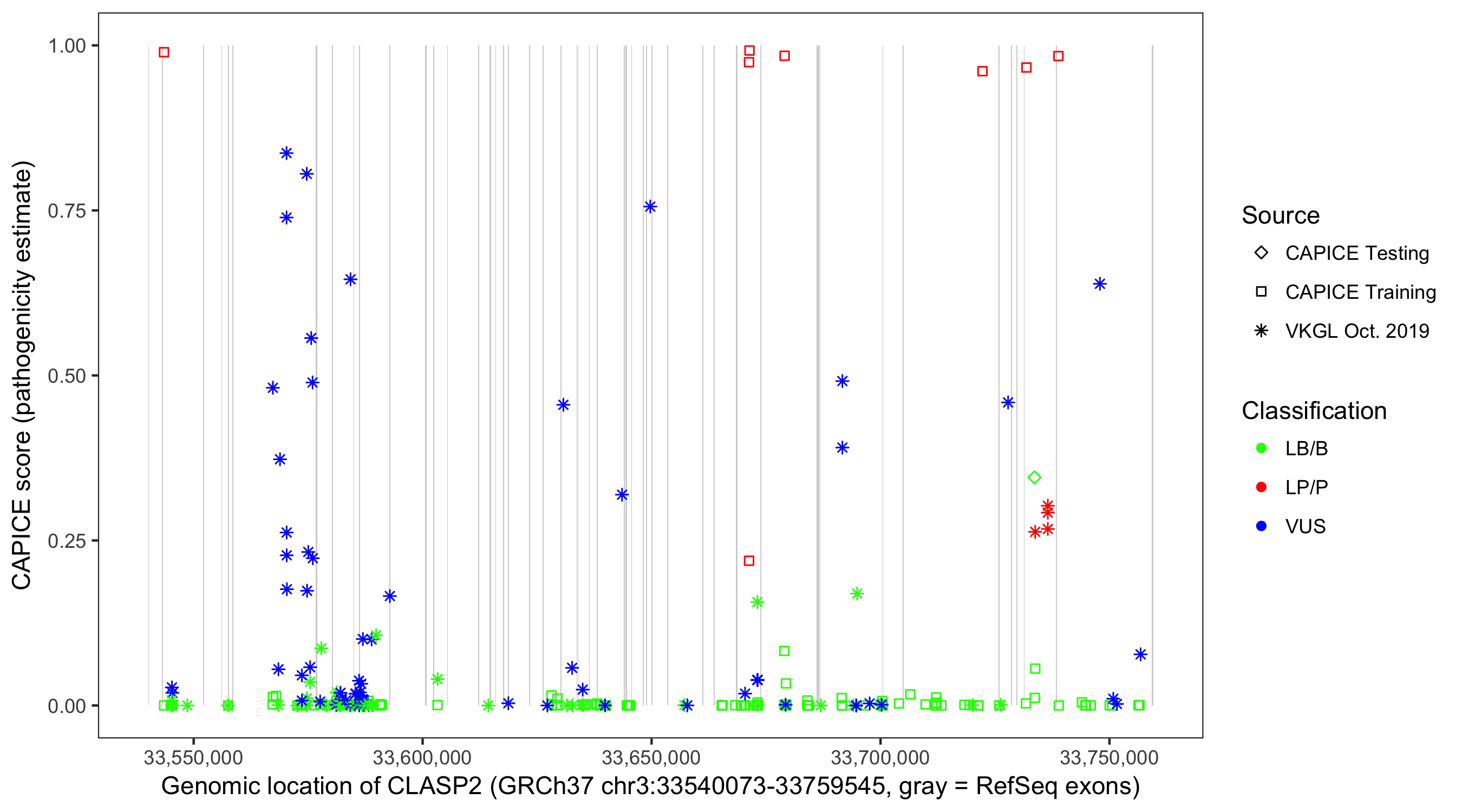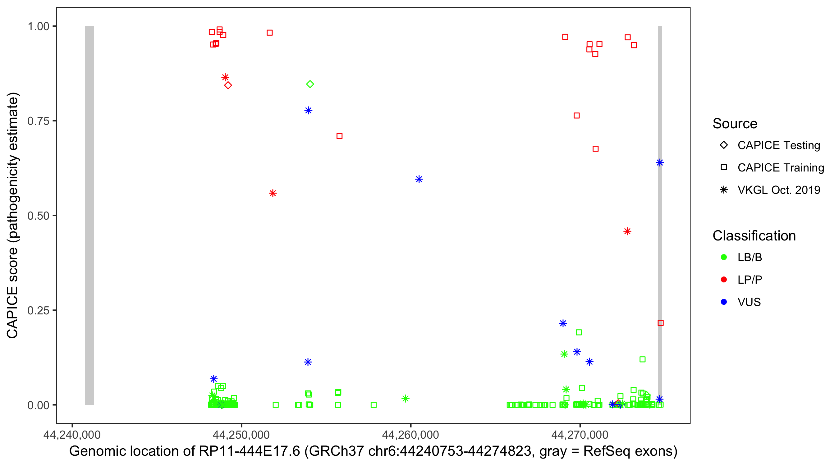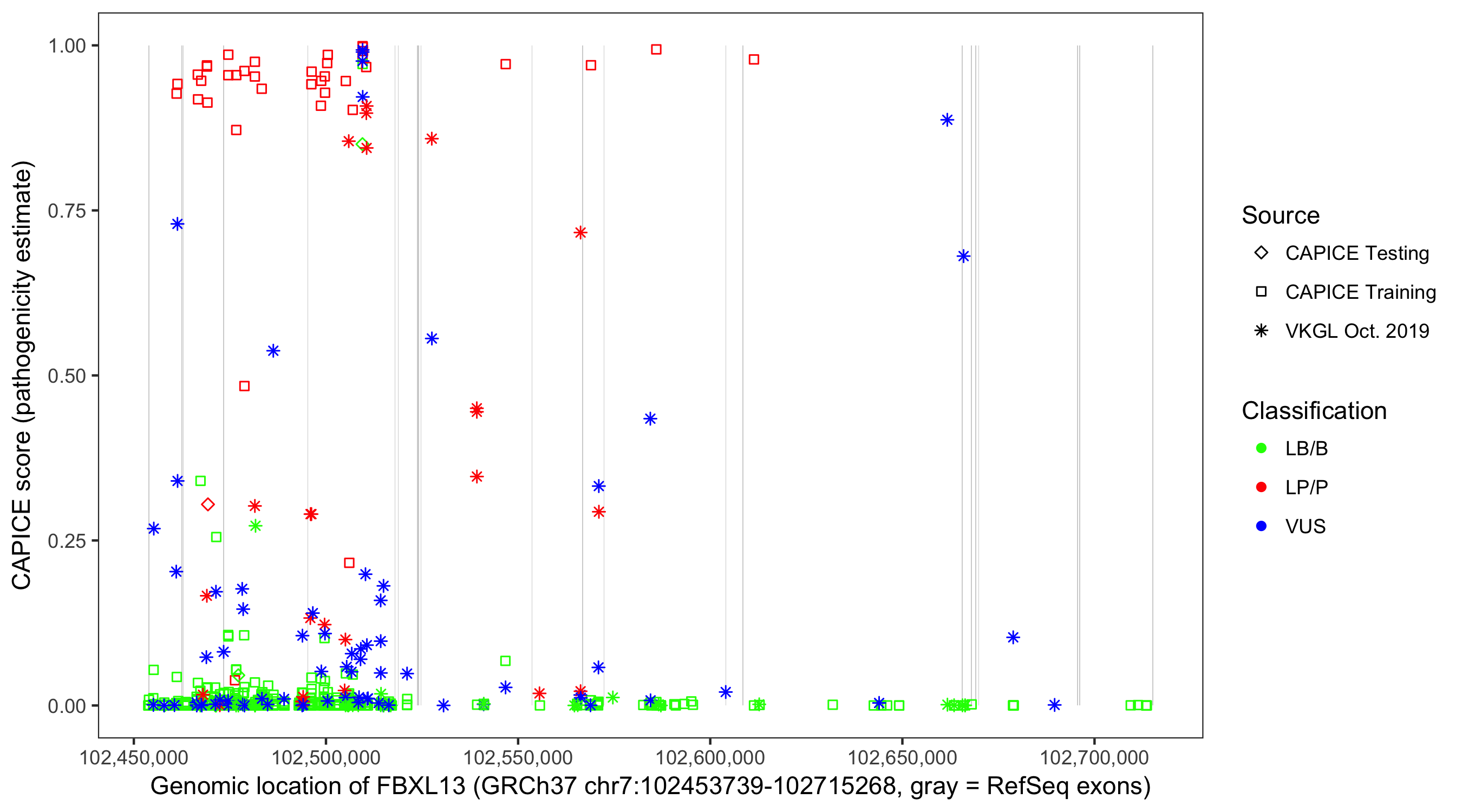 Shown are CAPICE train/test variants plus VKGL Oct 2019.