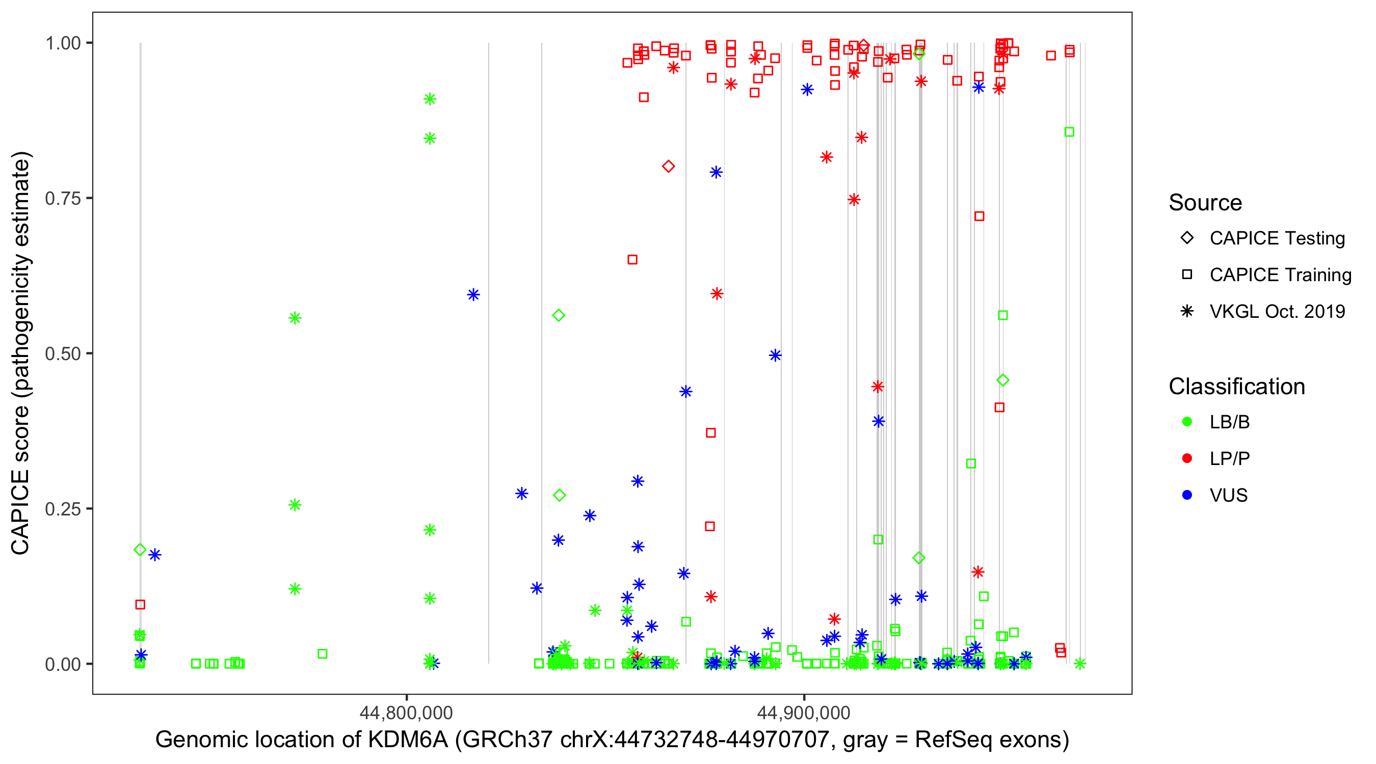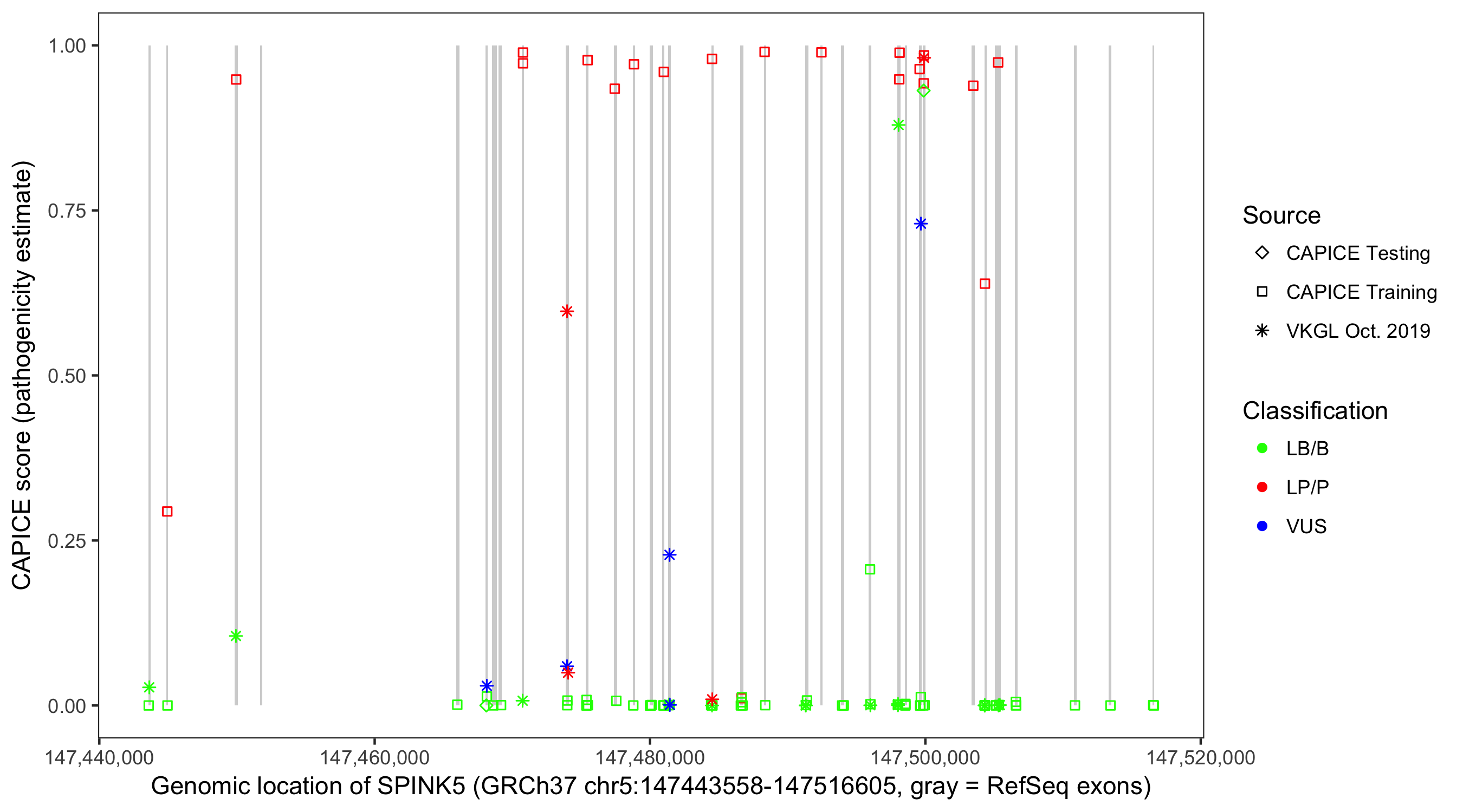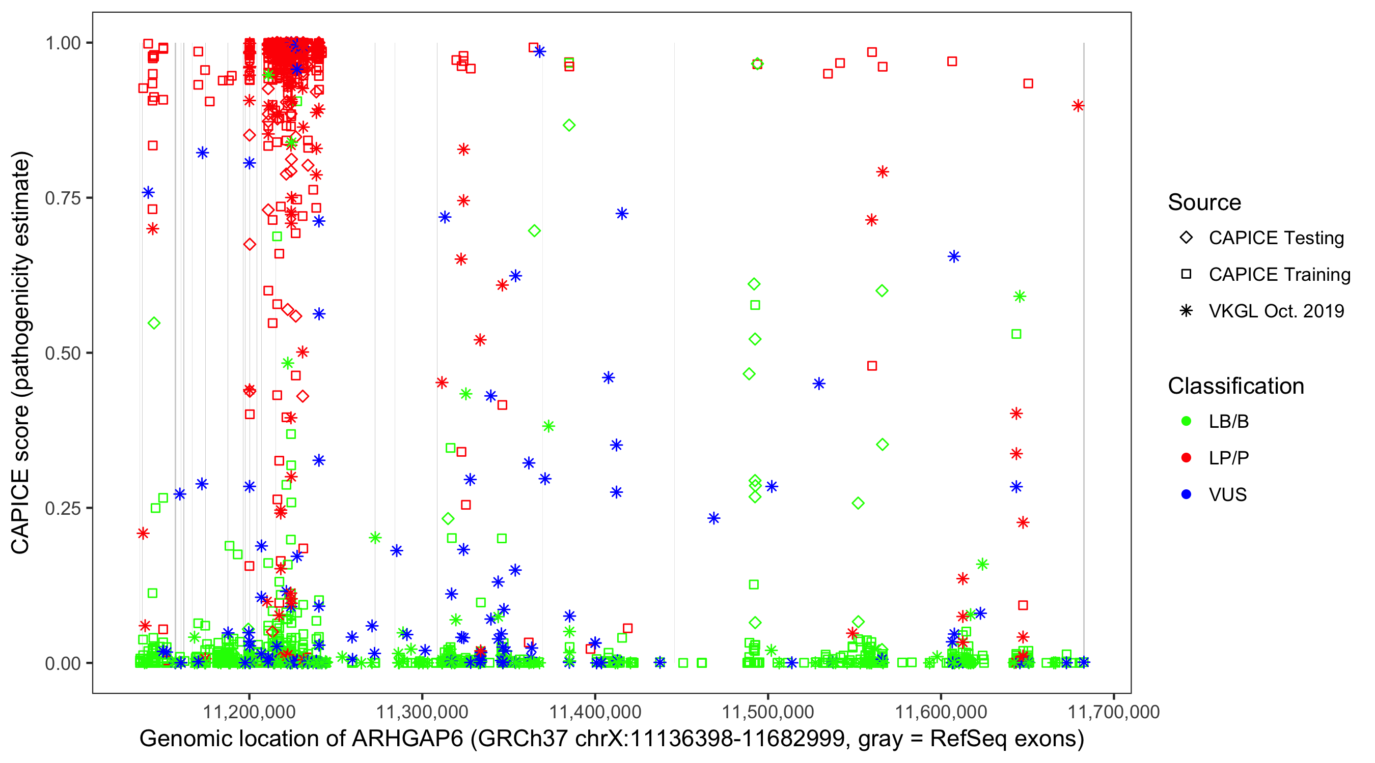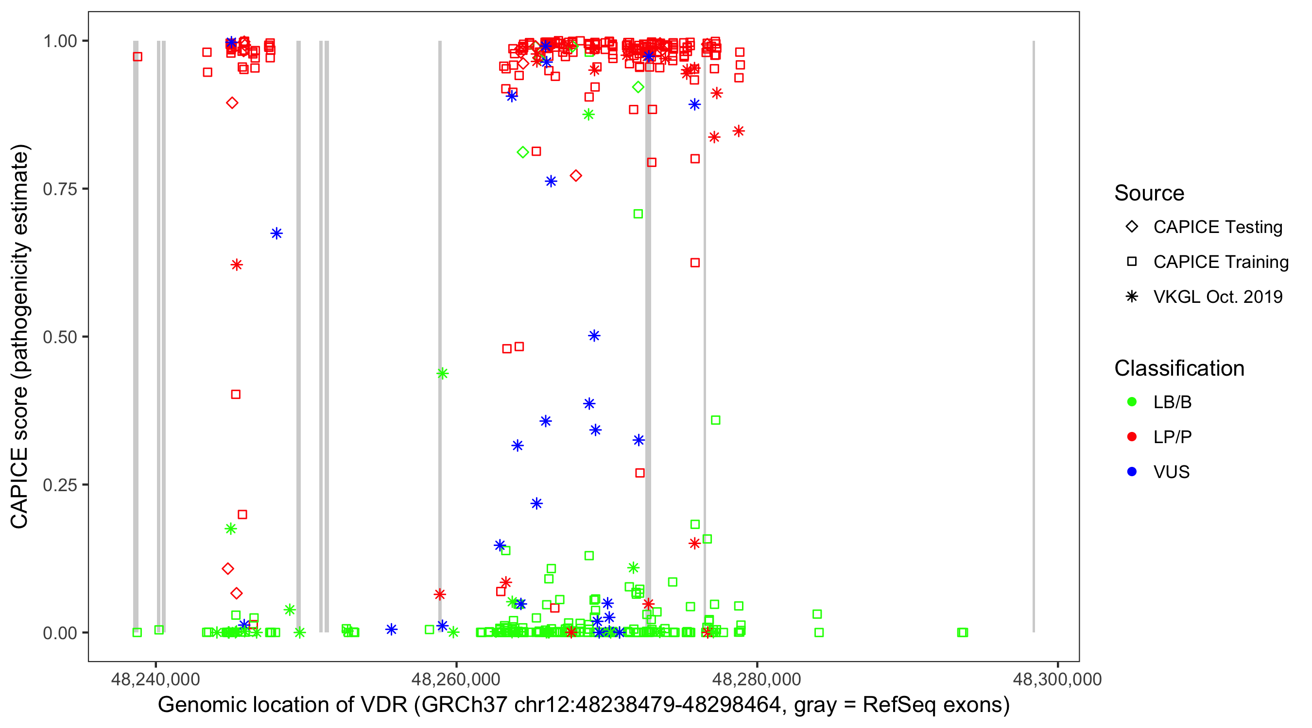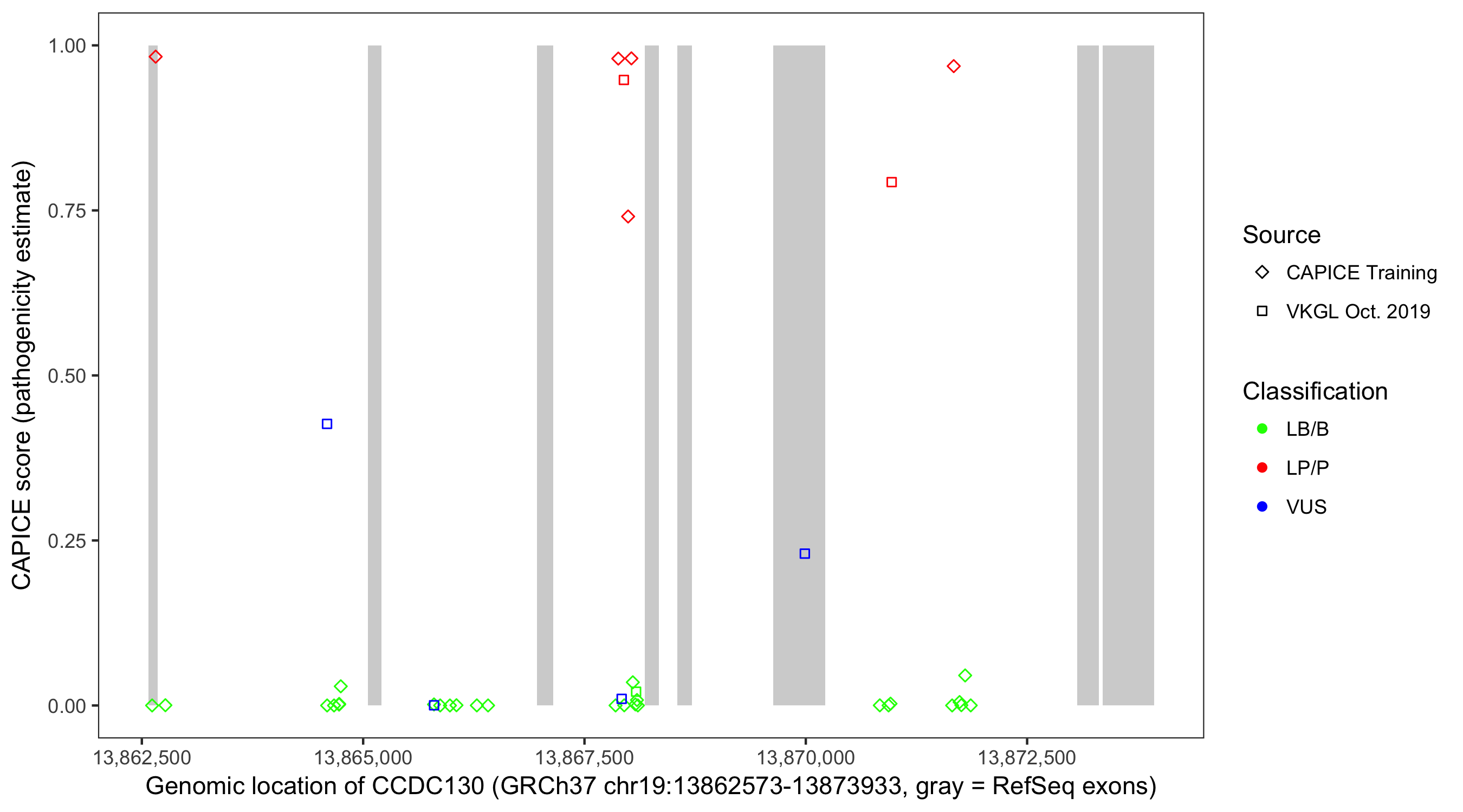 Shown are CAPICE train/test variants plus VKGL Oct 2019.