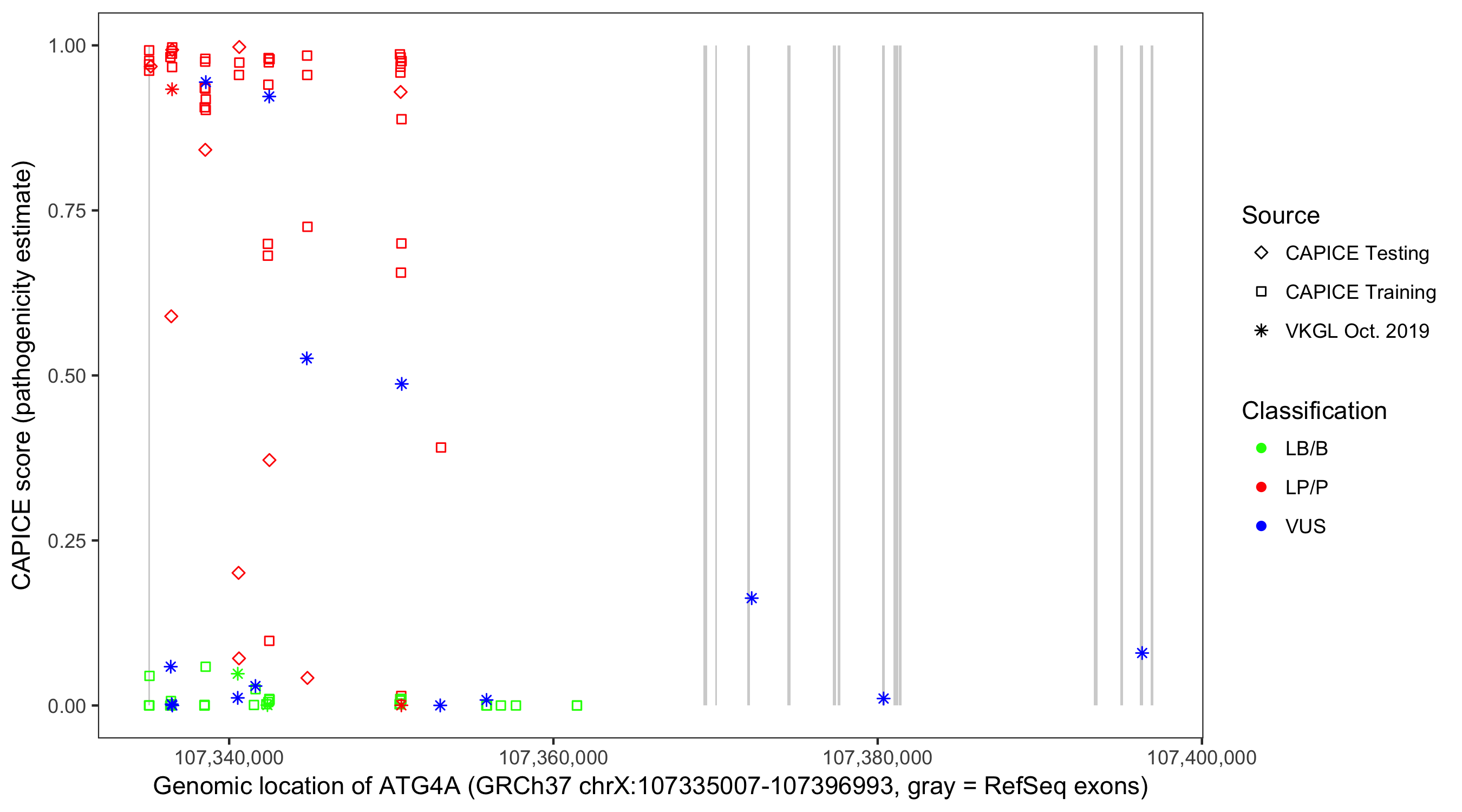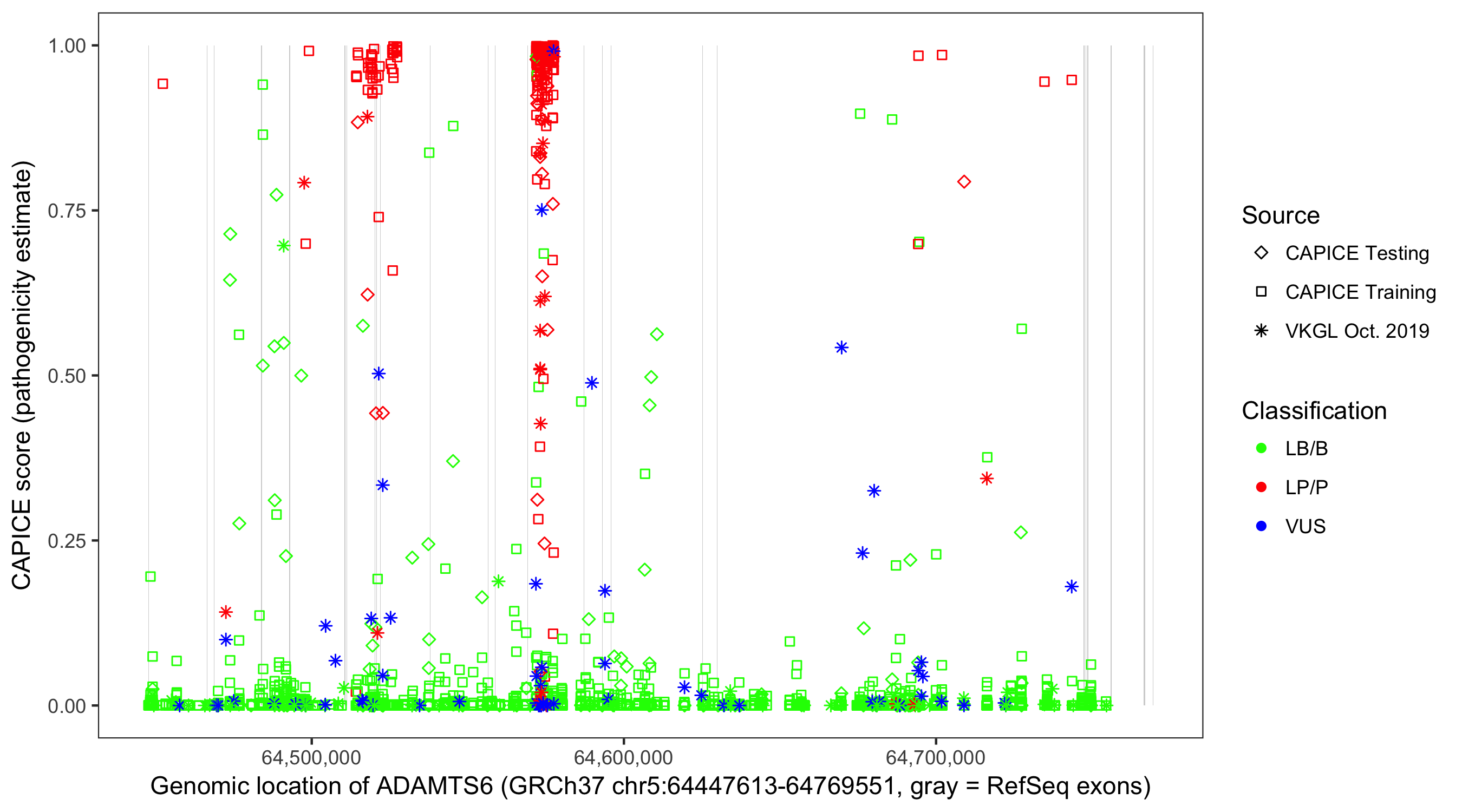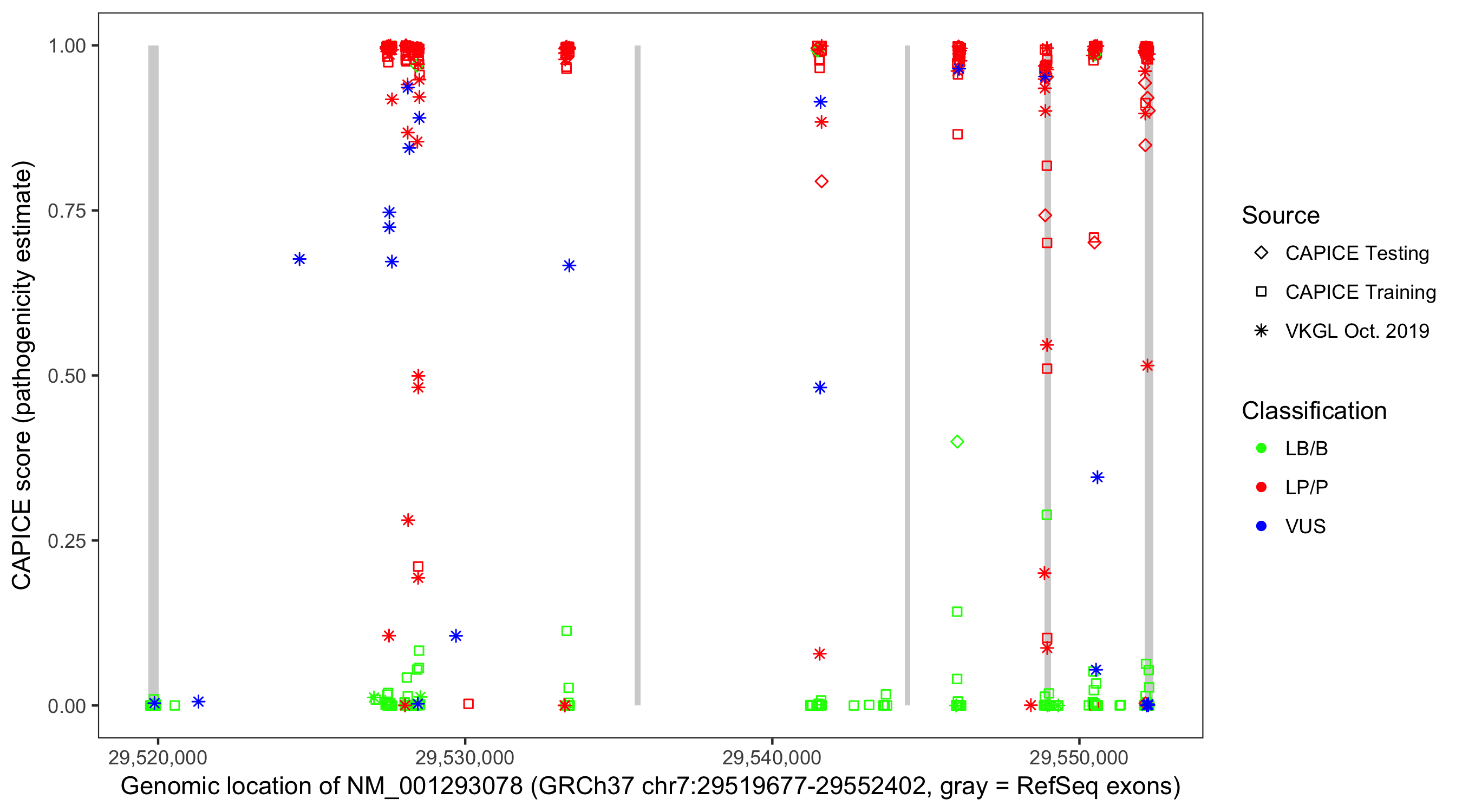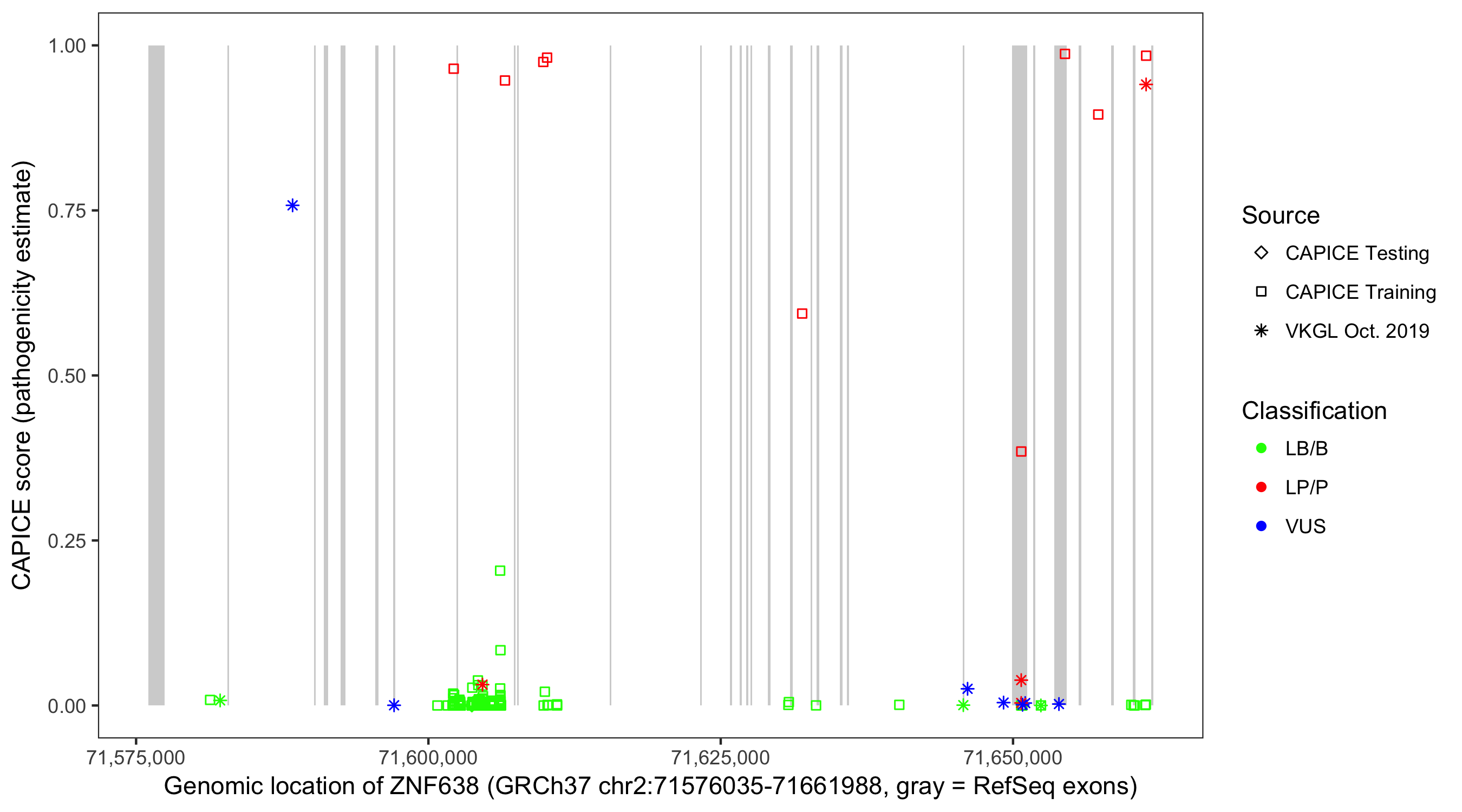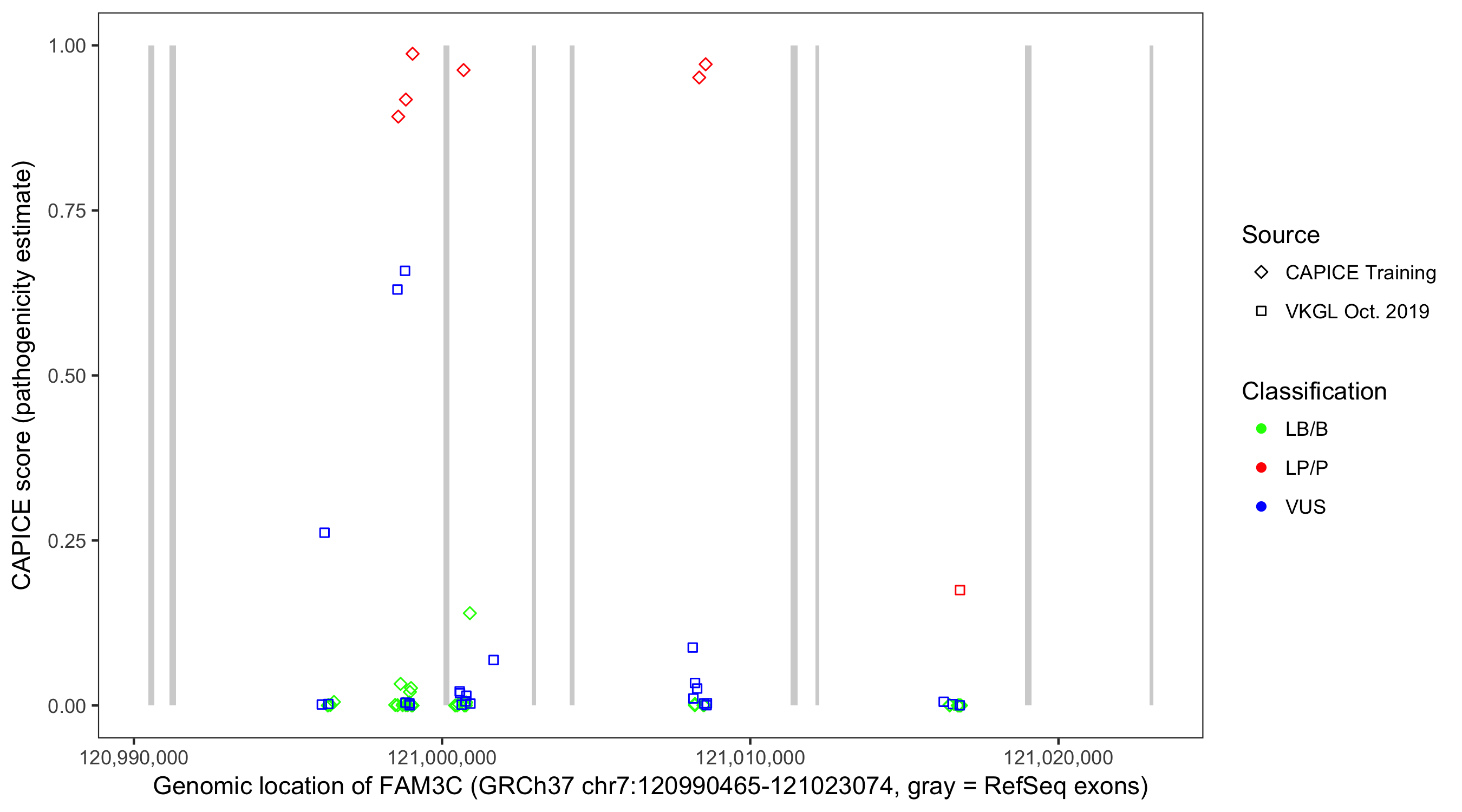 Shown are CAPICE train/test variants plus VKGL Oct 2019.