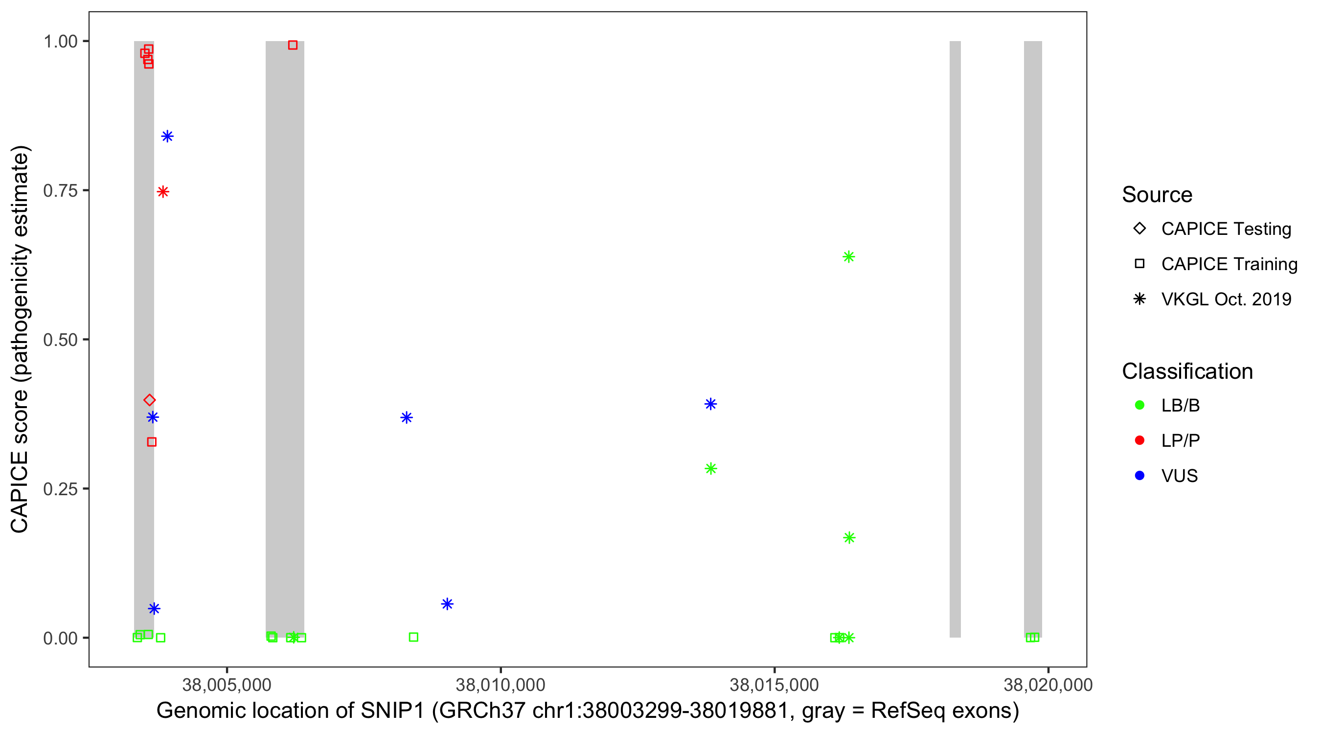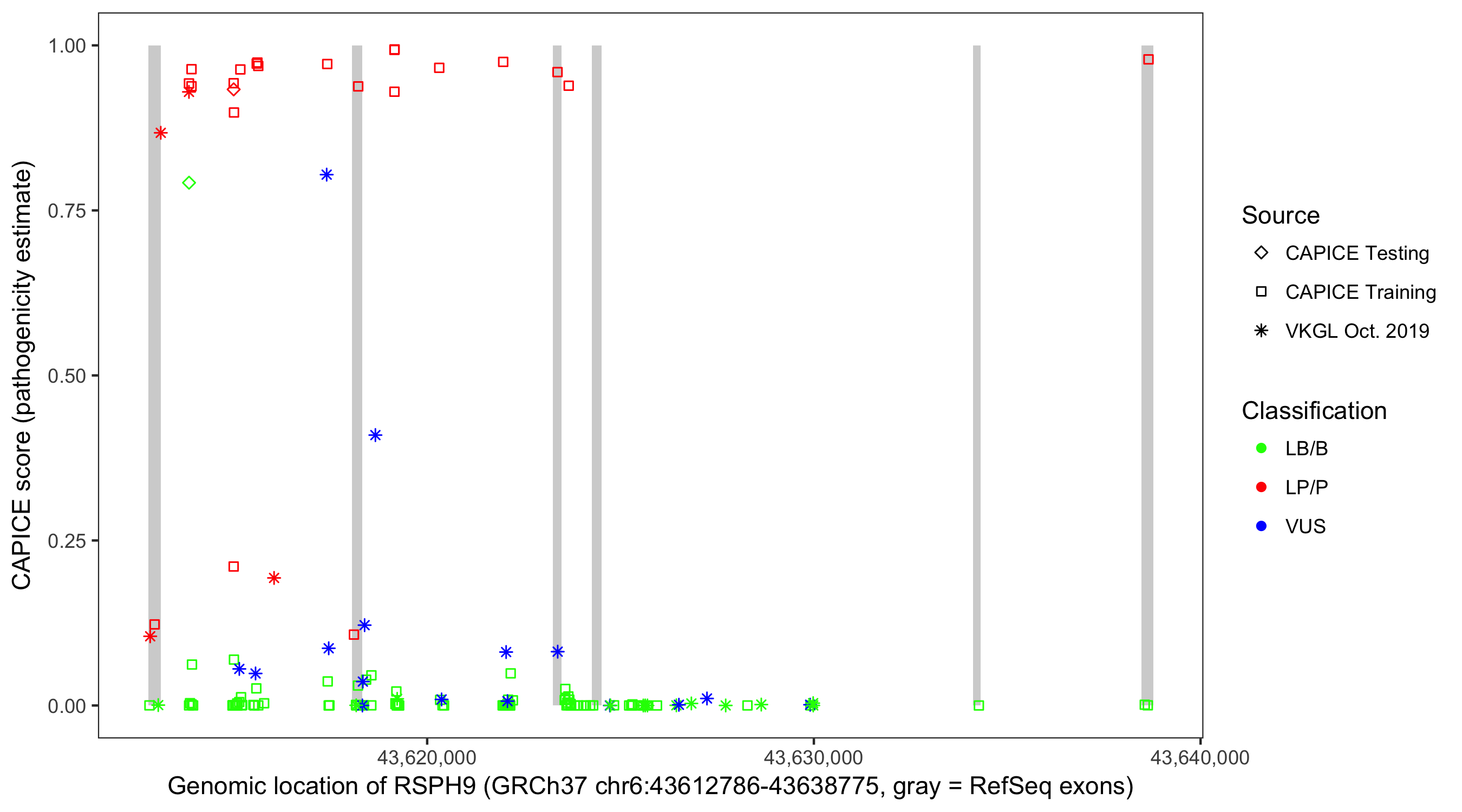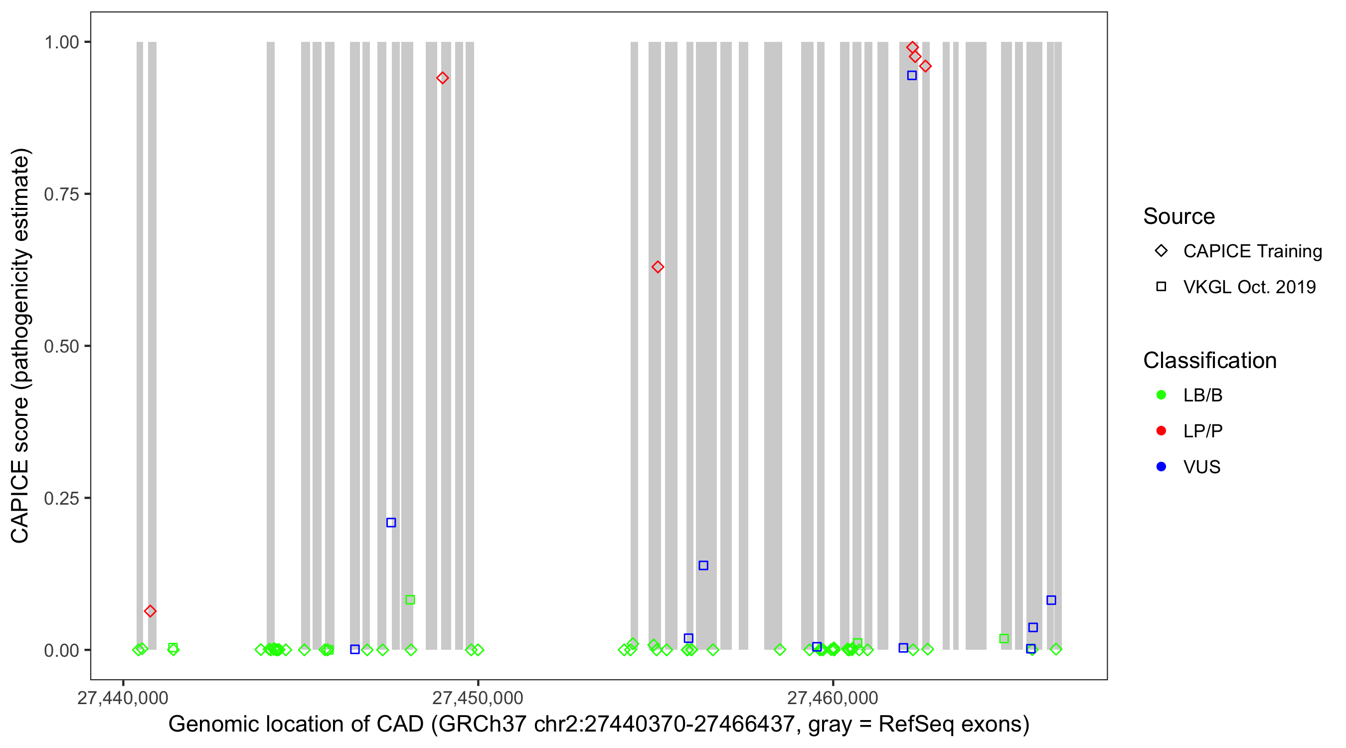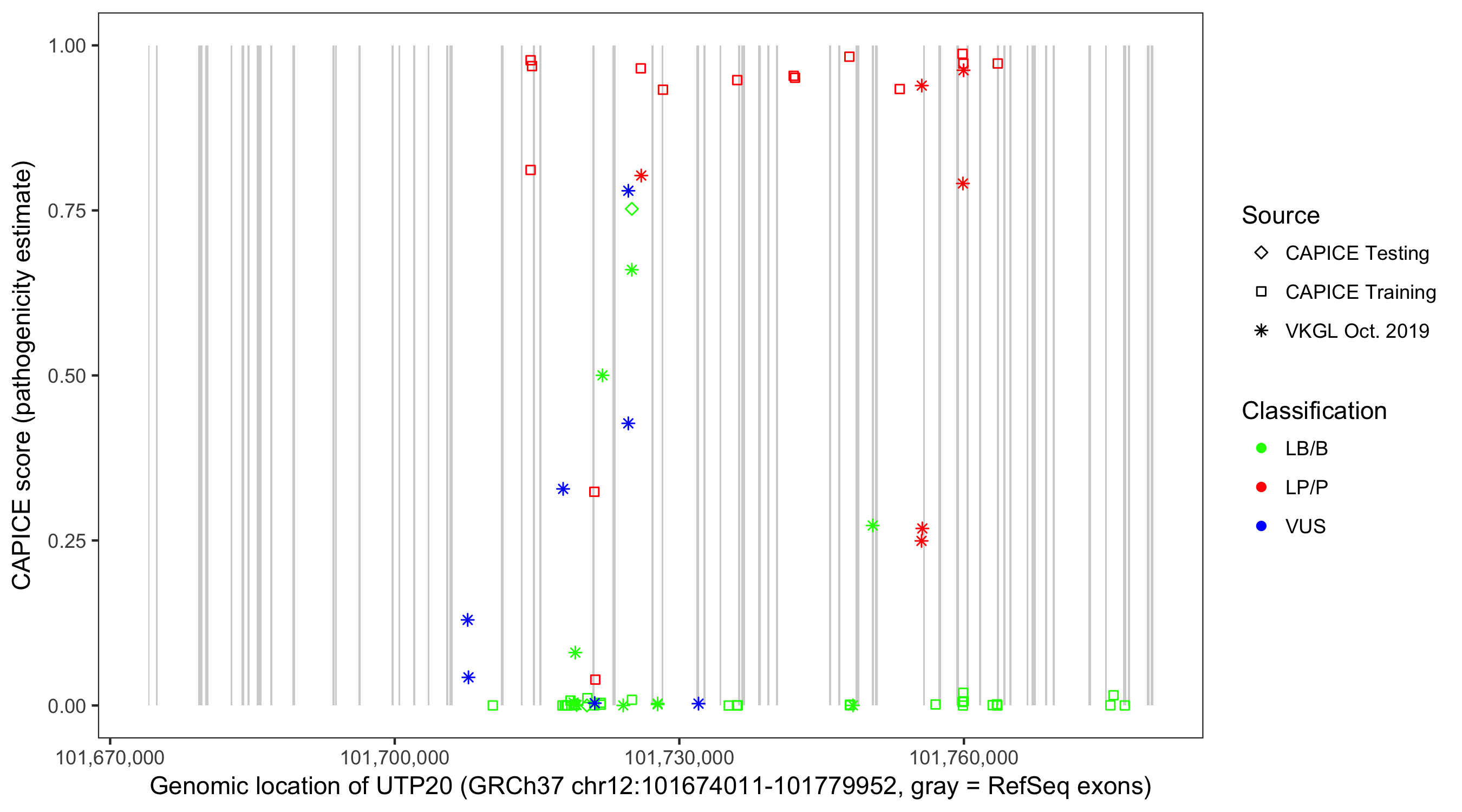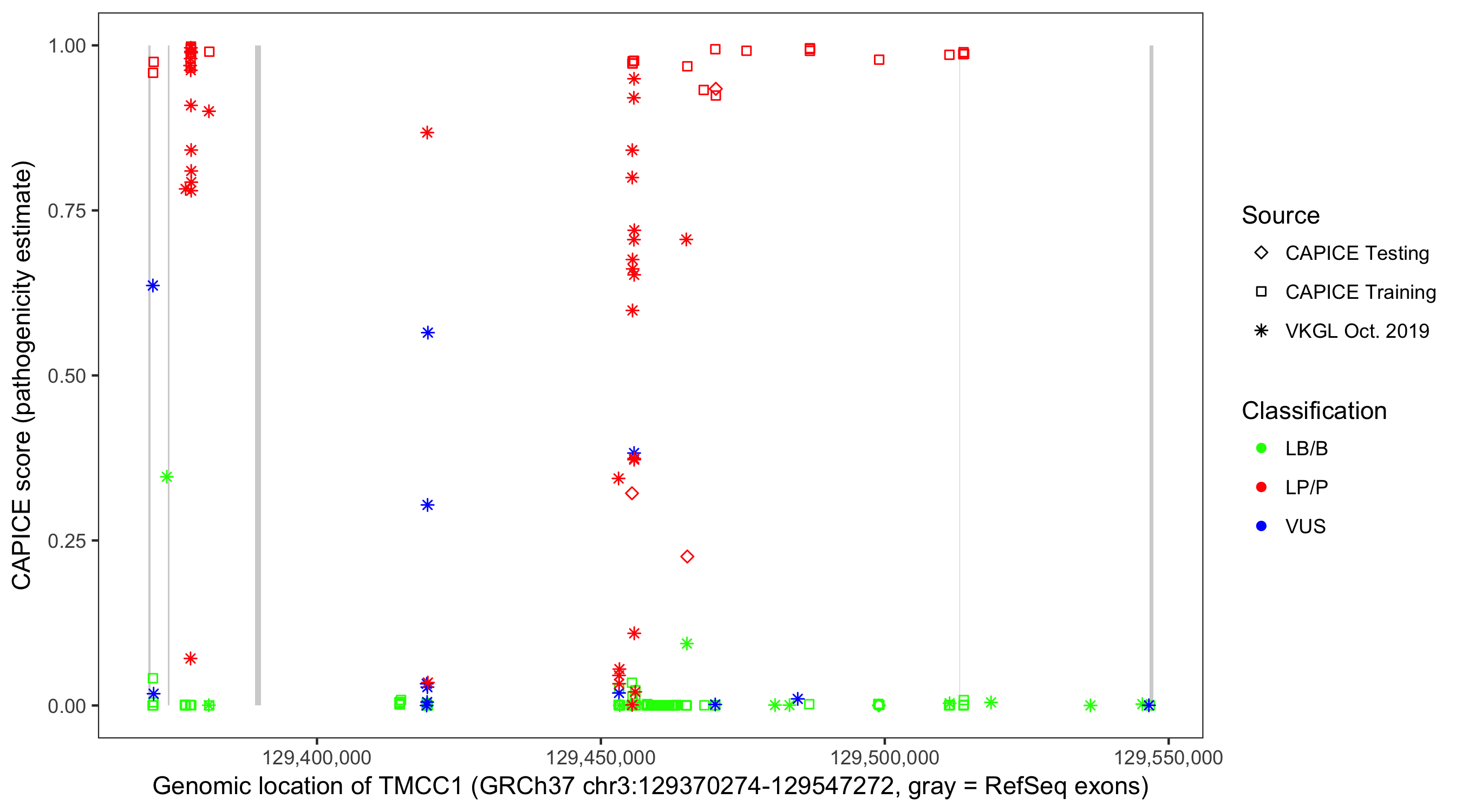 Shown are CAPICE train/test variants plus VKGL Oct 2019.