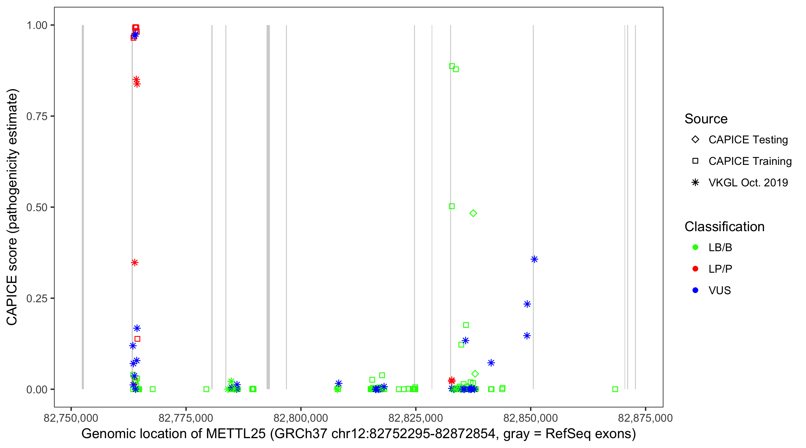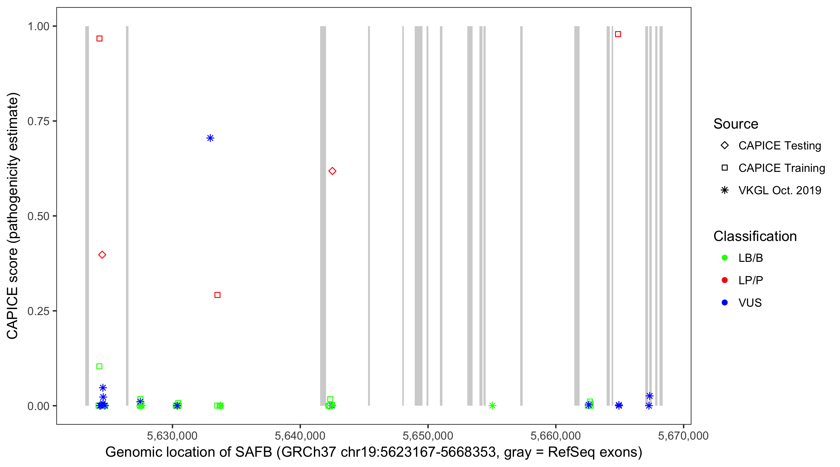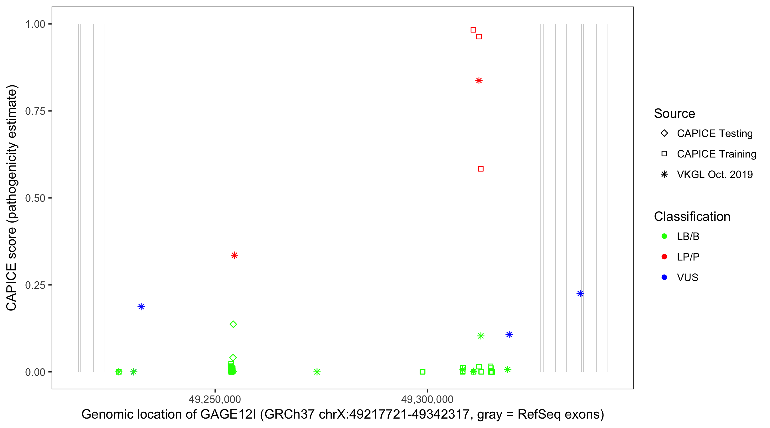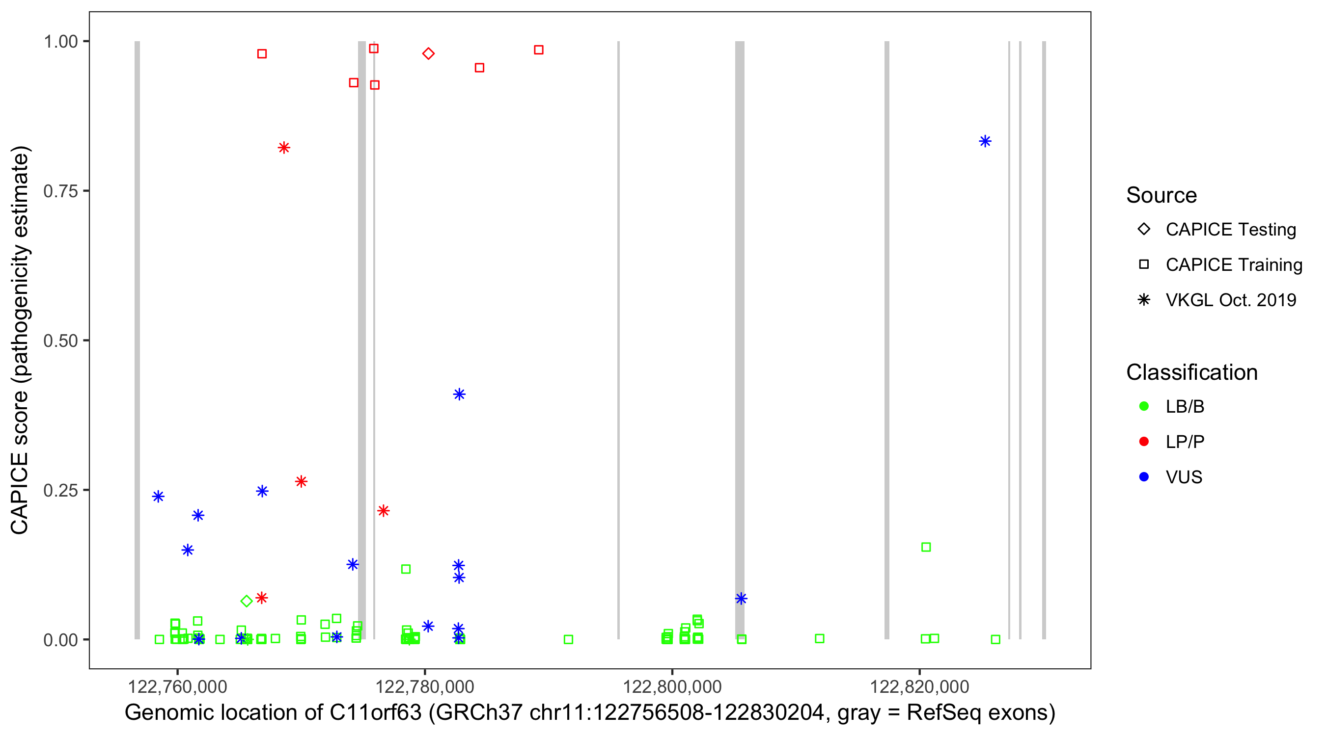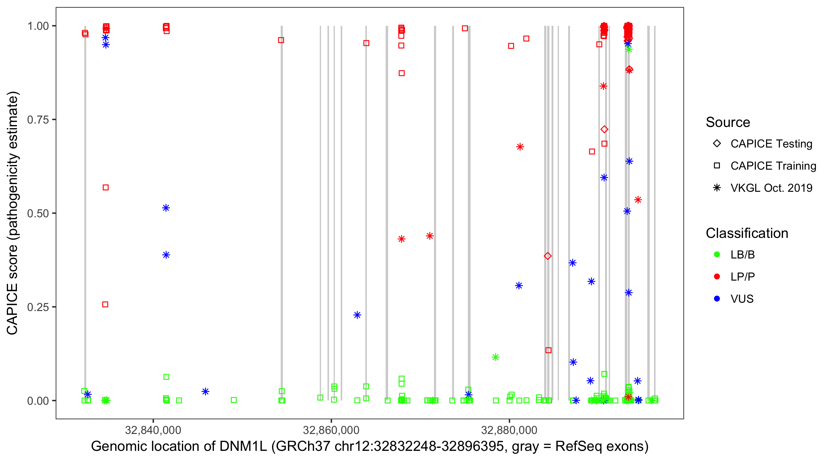 Shown are CAPICE train/test variants plus VKGL Oct 2019.