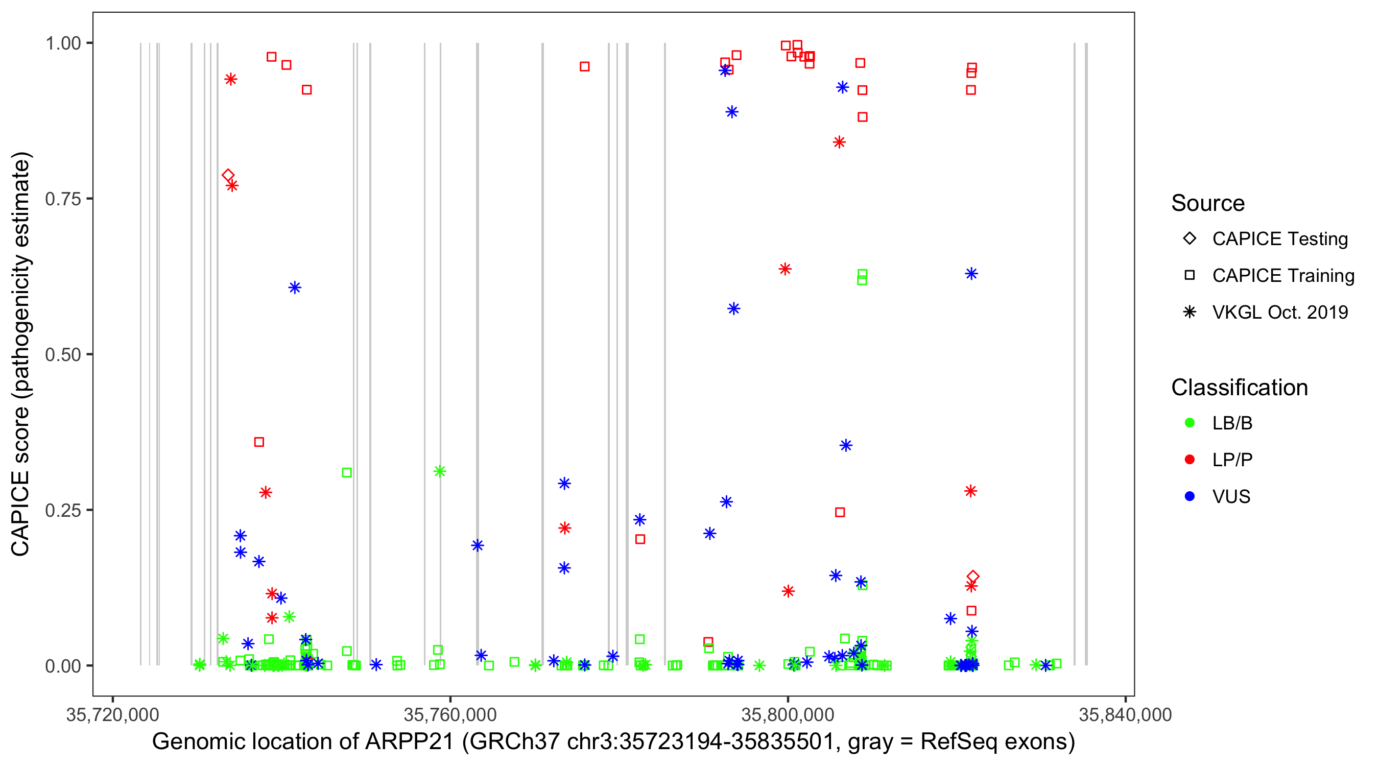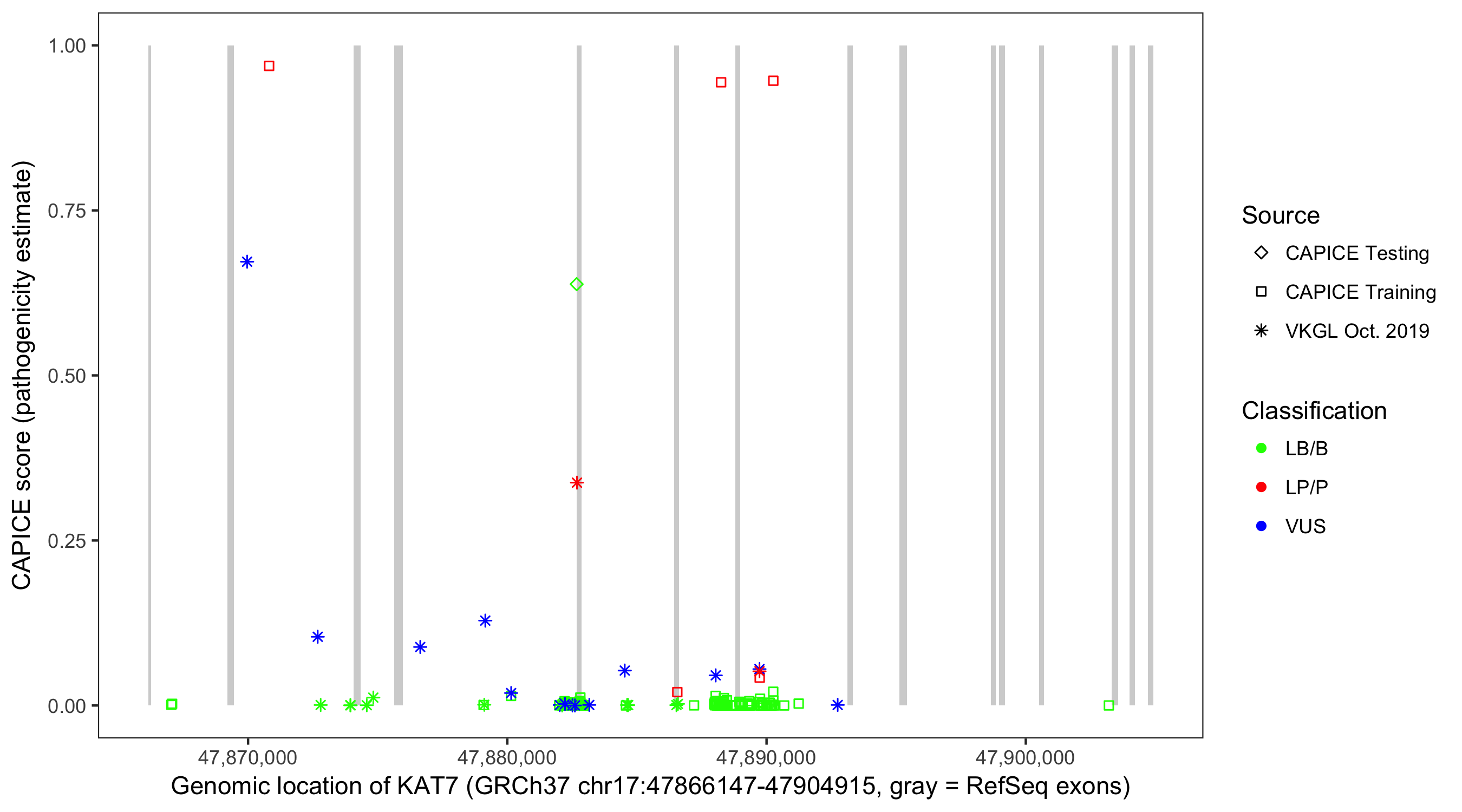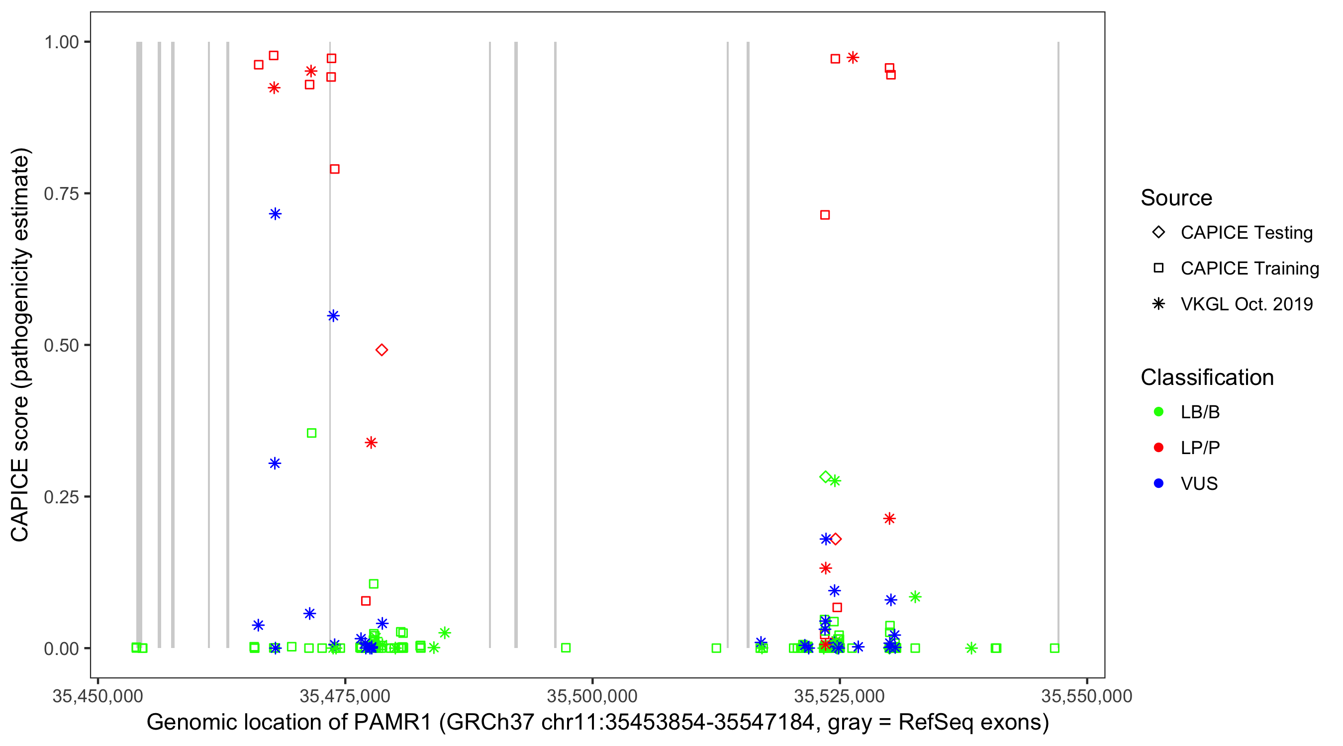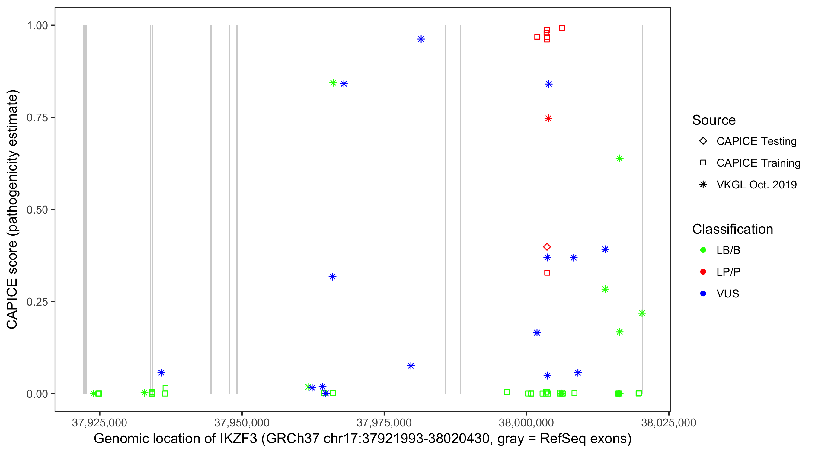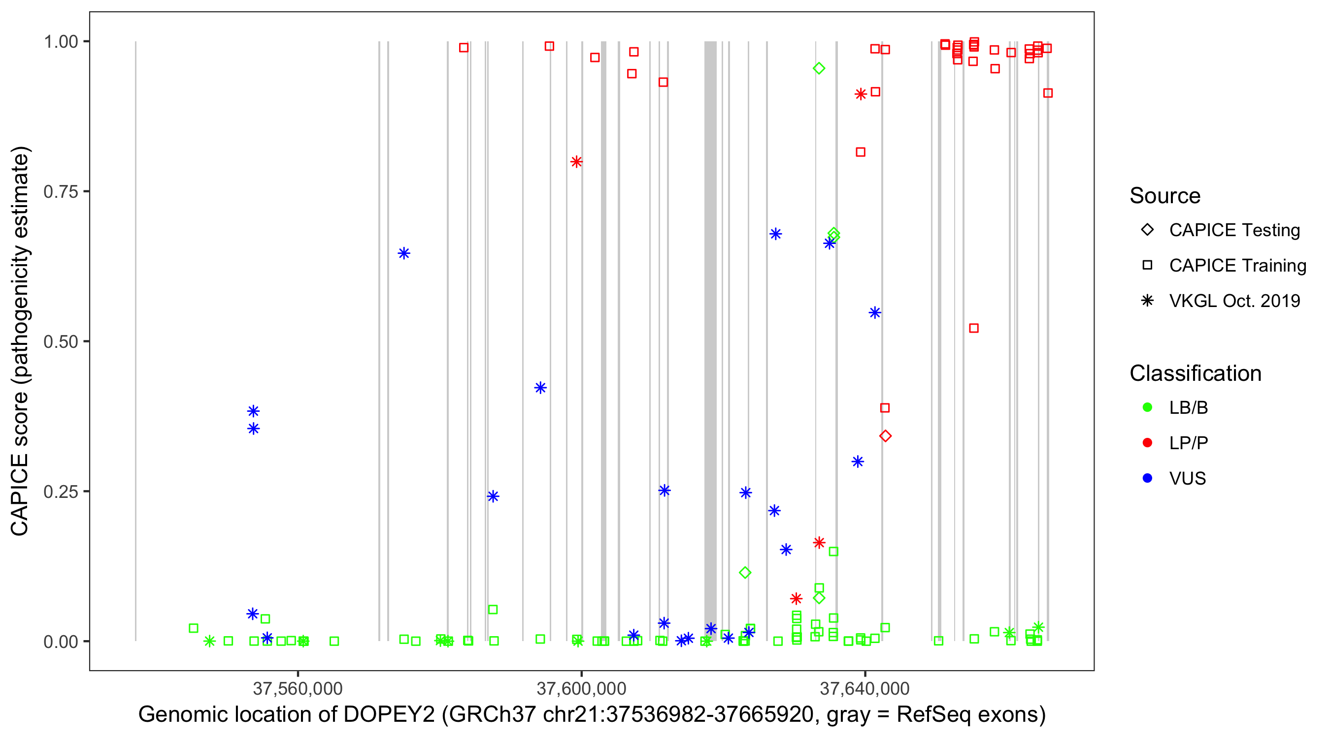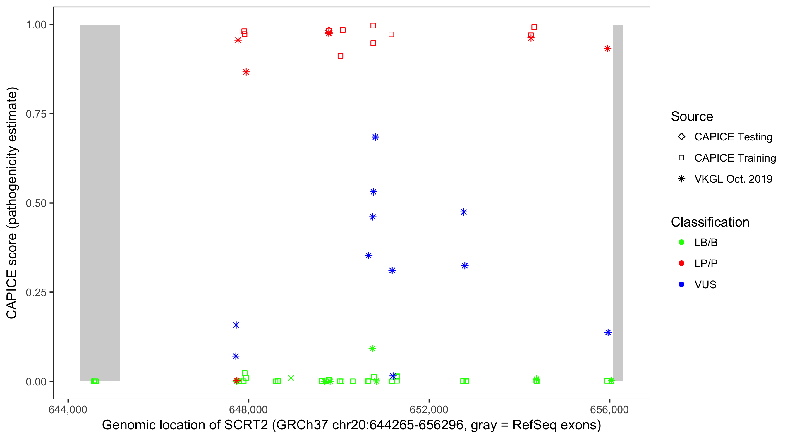 Shown are CAPICE train/test variants plus VKGL Oct 2019.