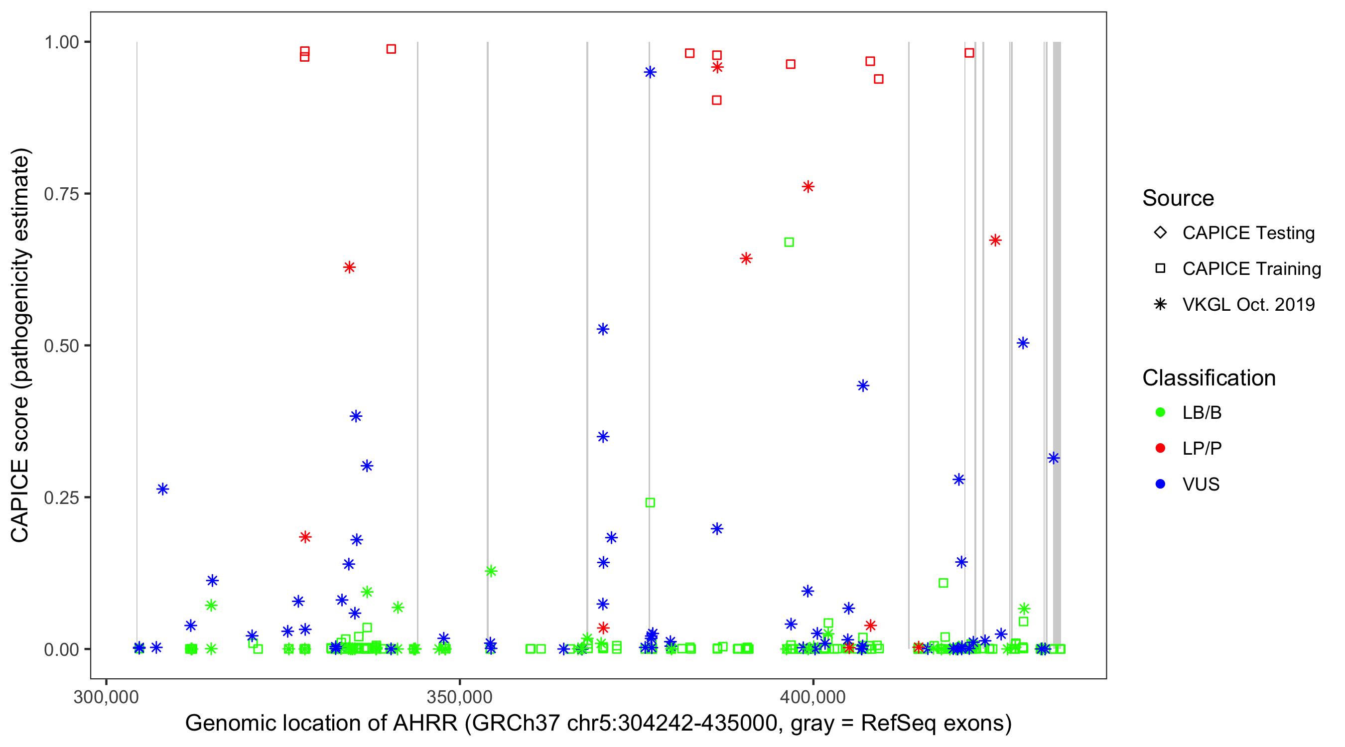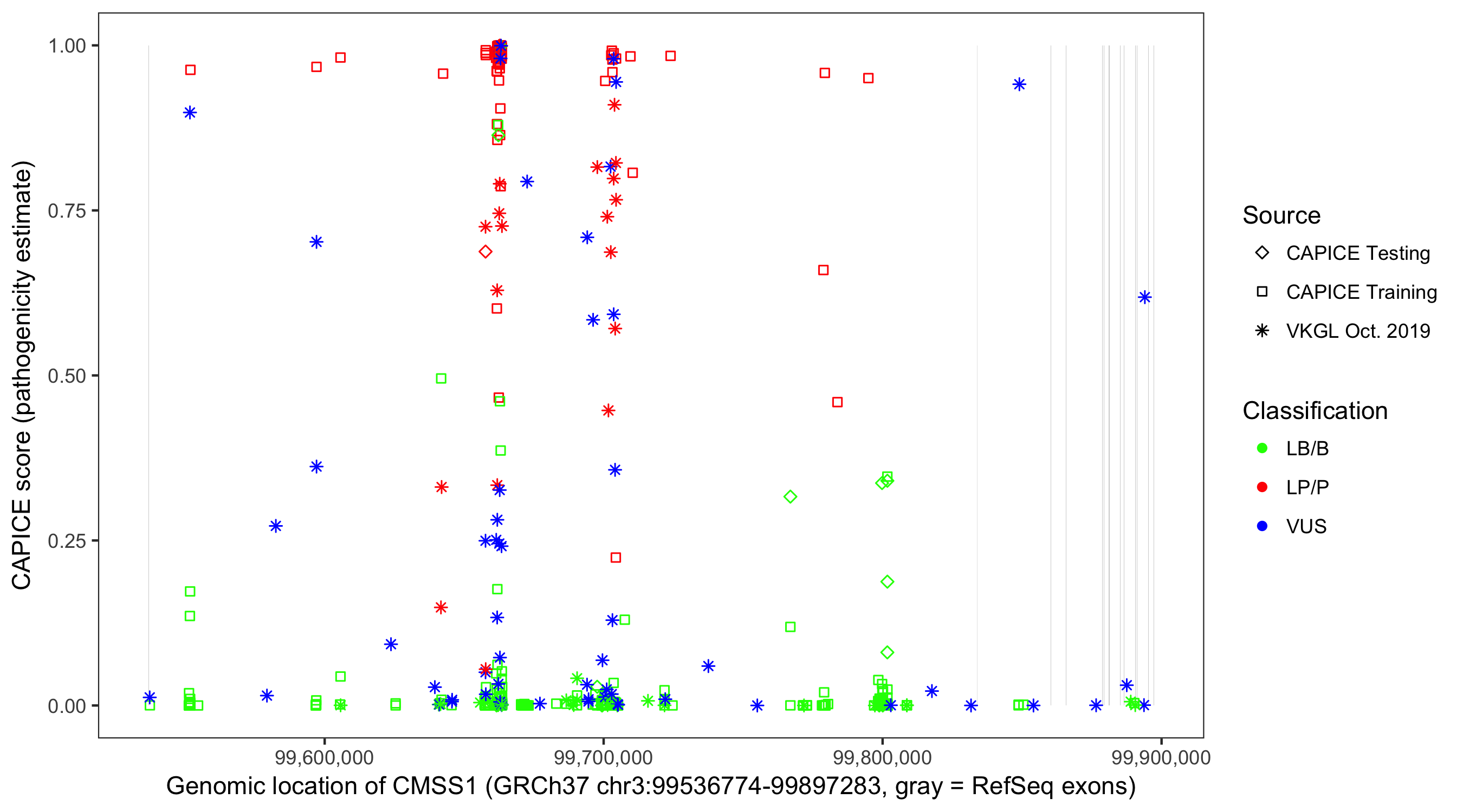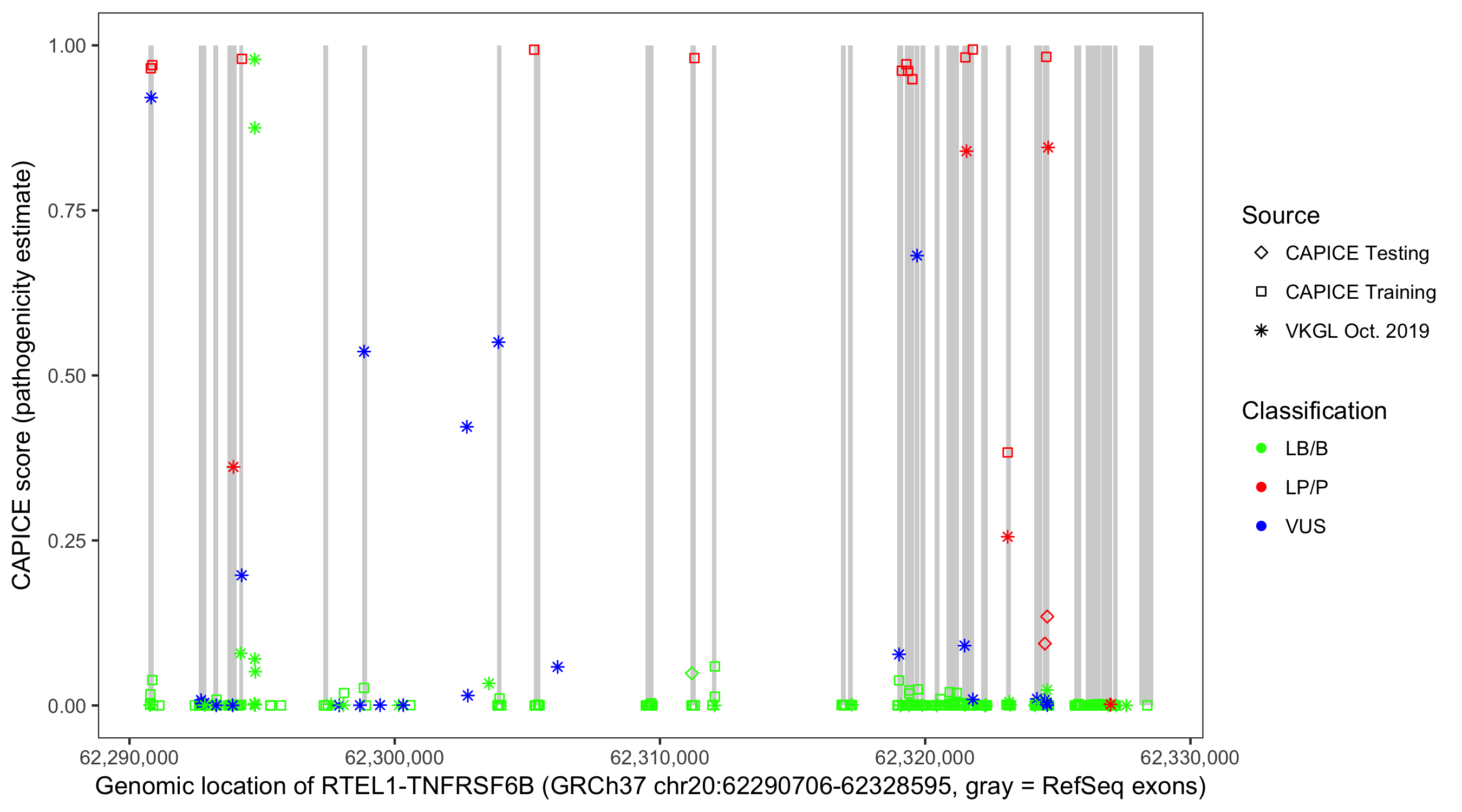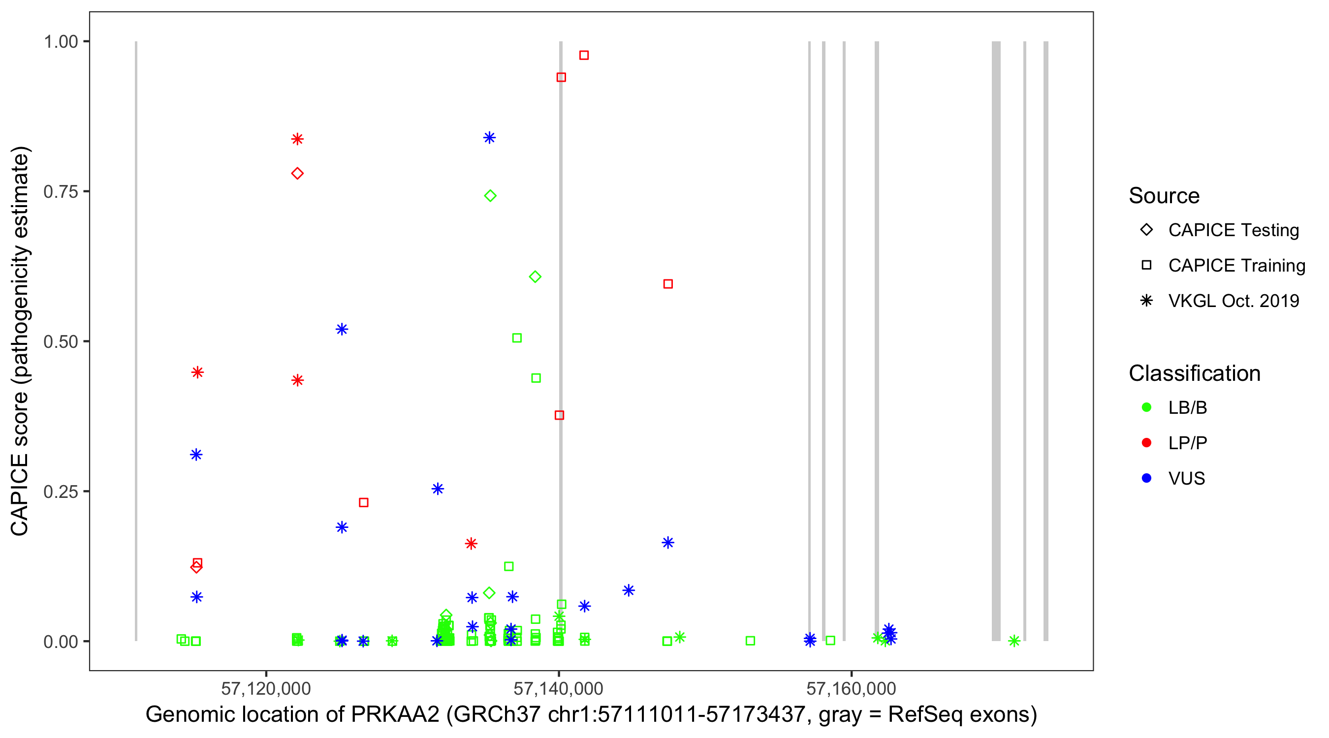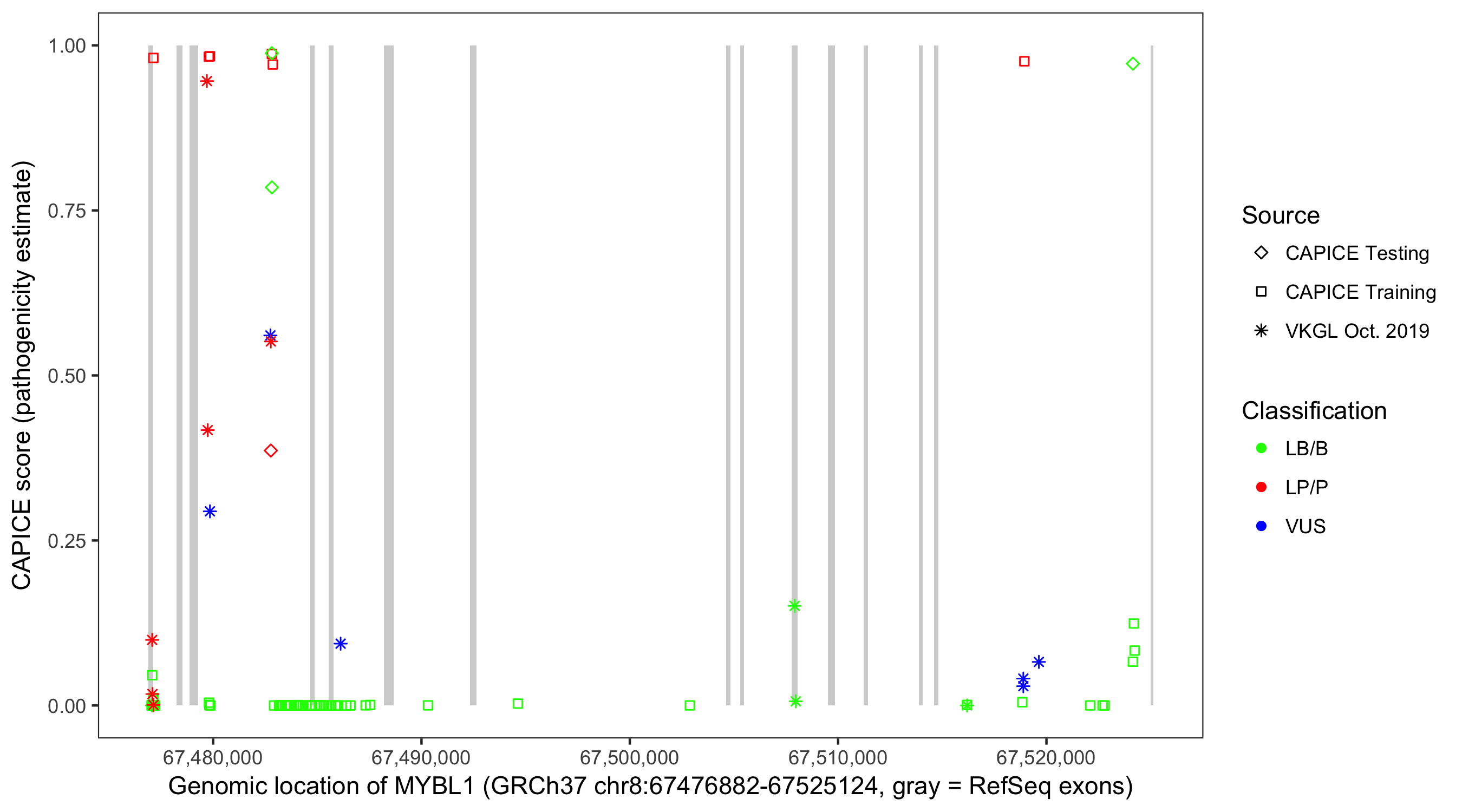 Shown are CAPICE train/test variants plus VKGL Oct 2019.