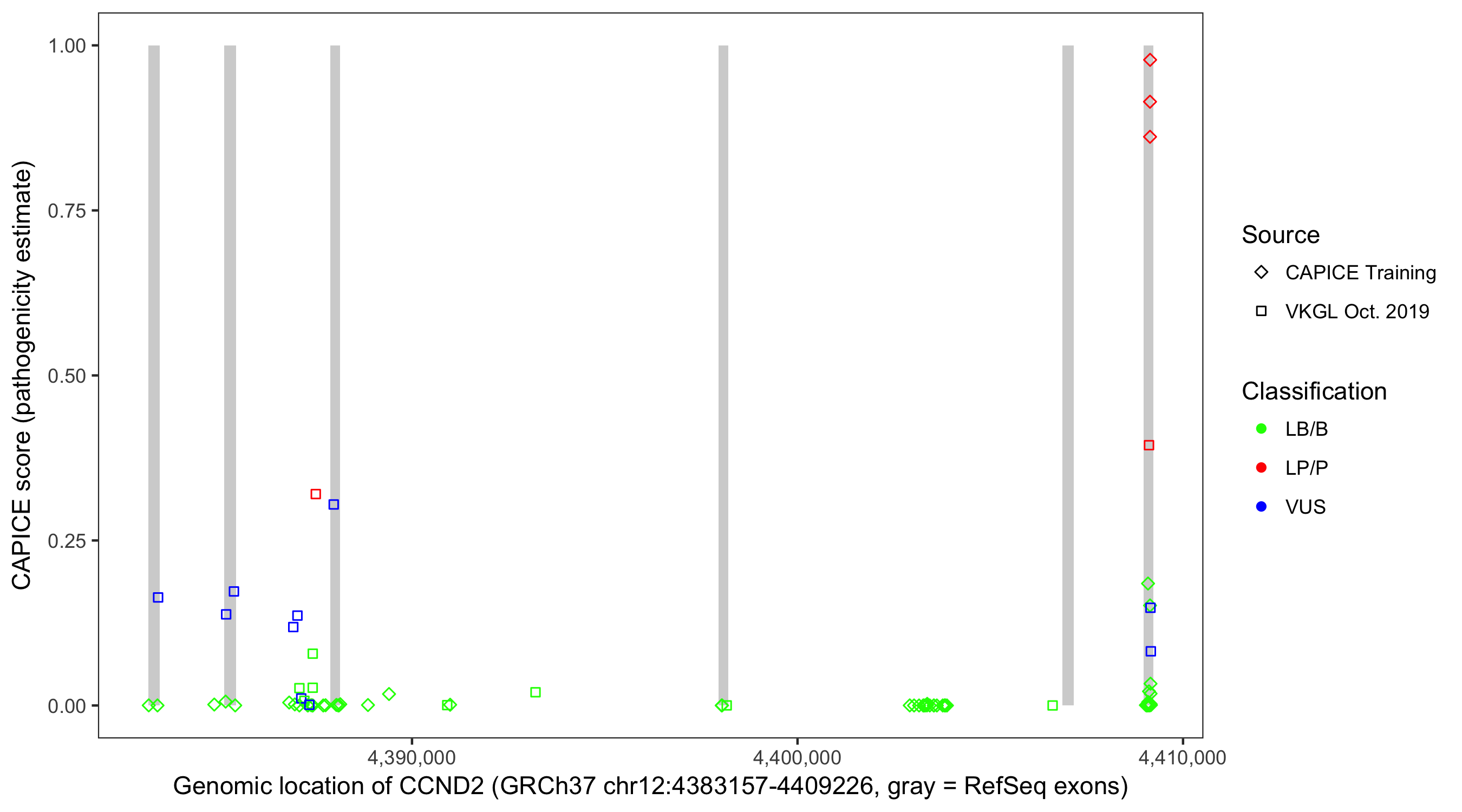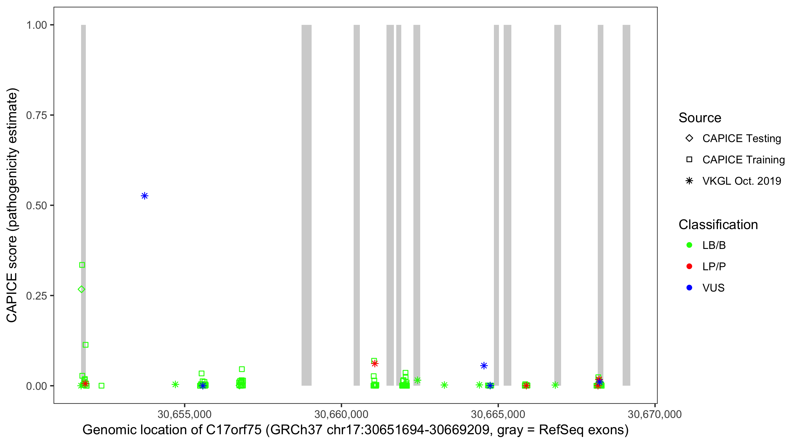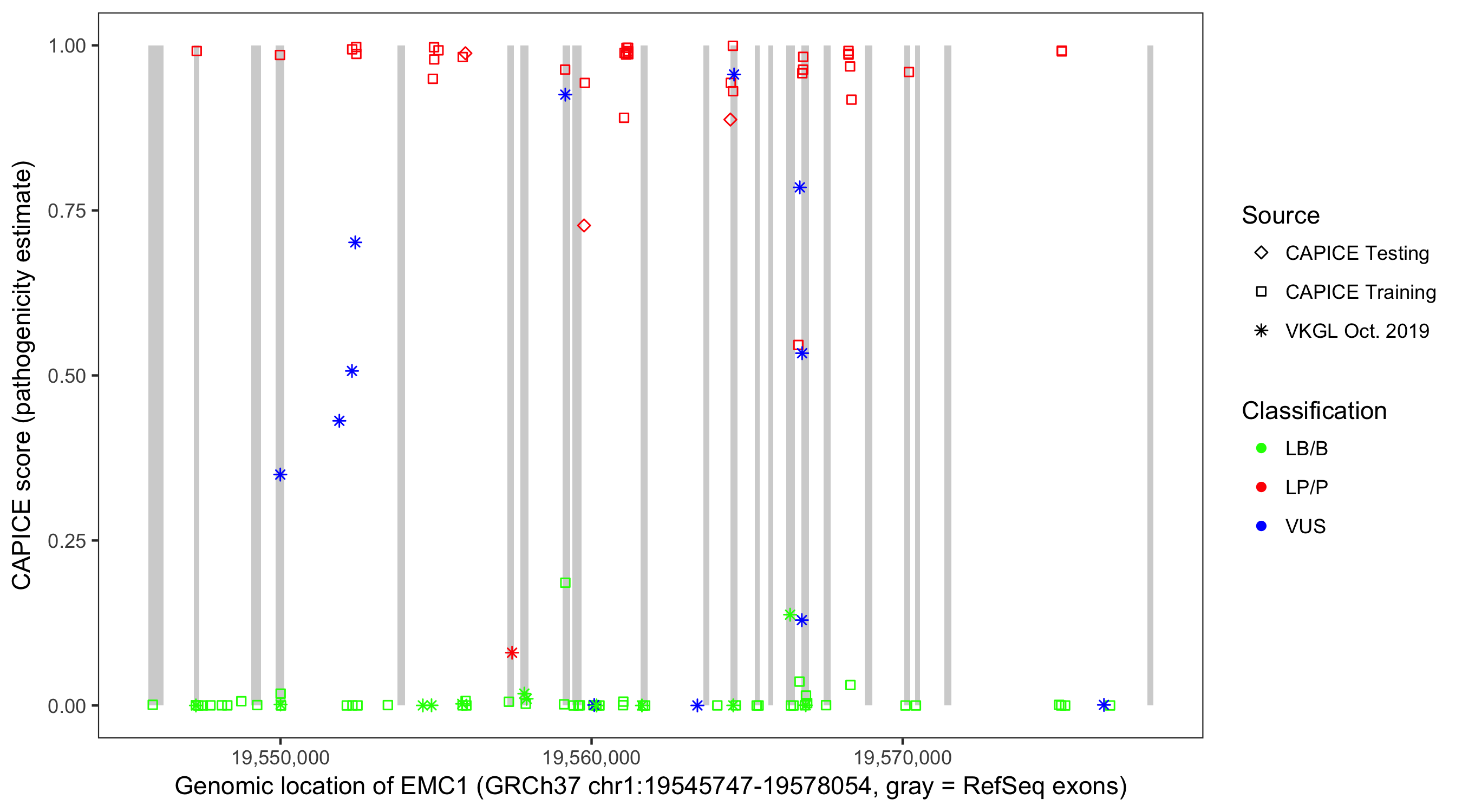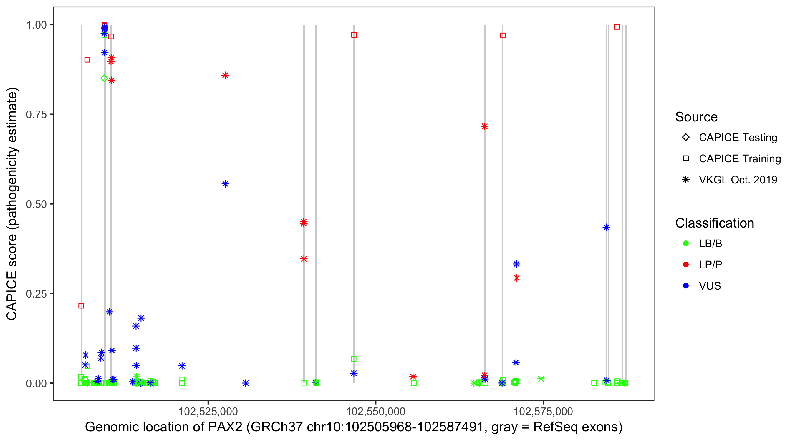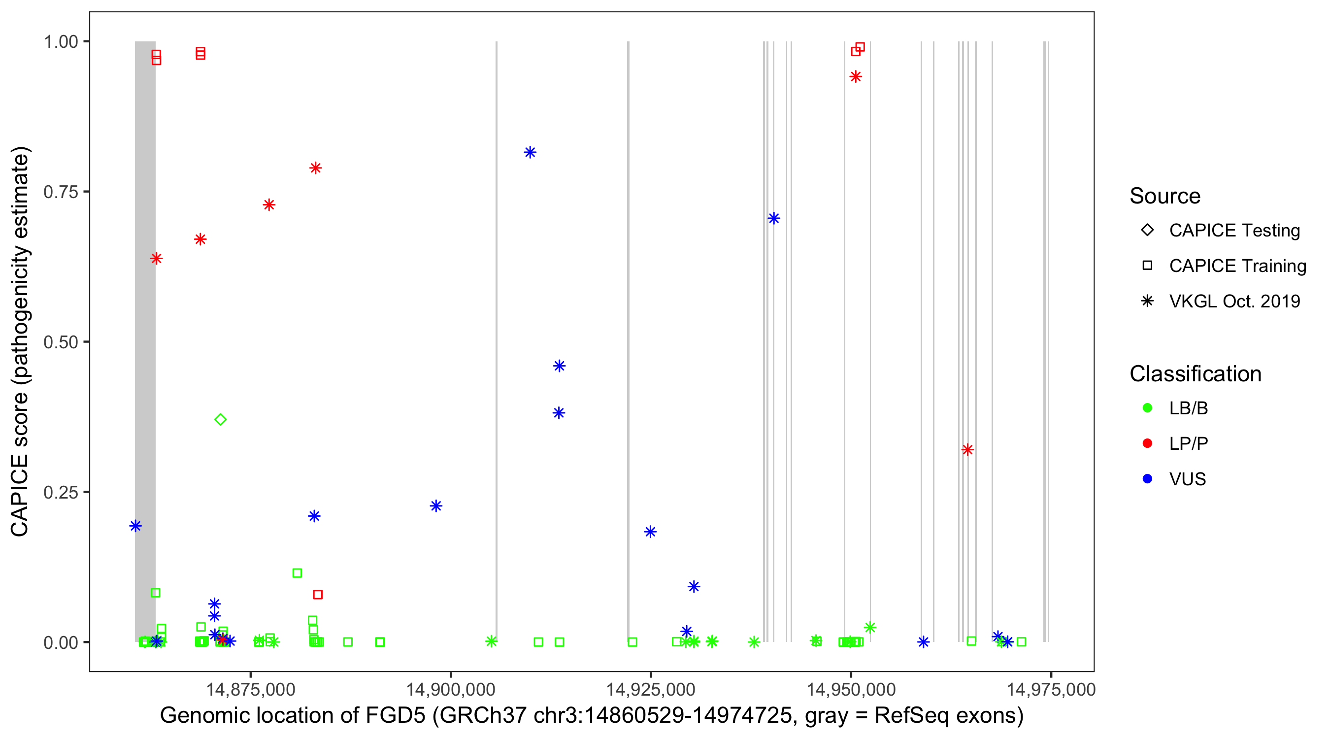 Shown are CAPICE train/test variants plus VKGL Oct 2019.