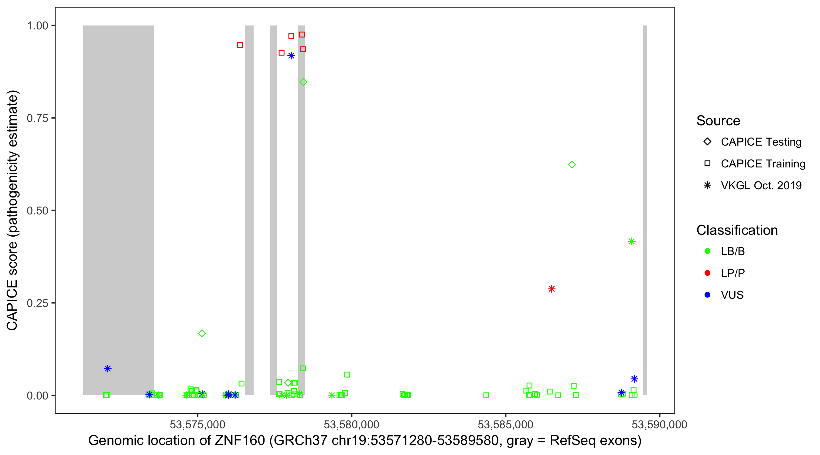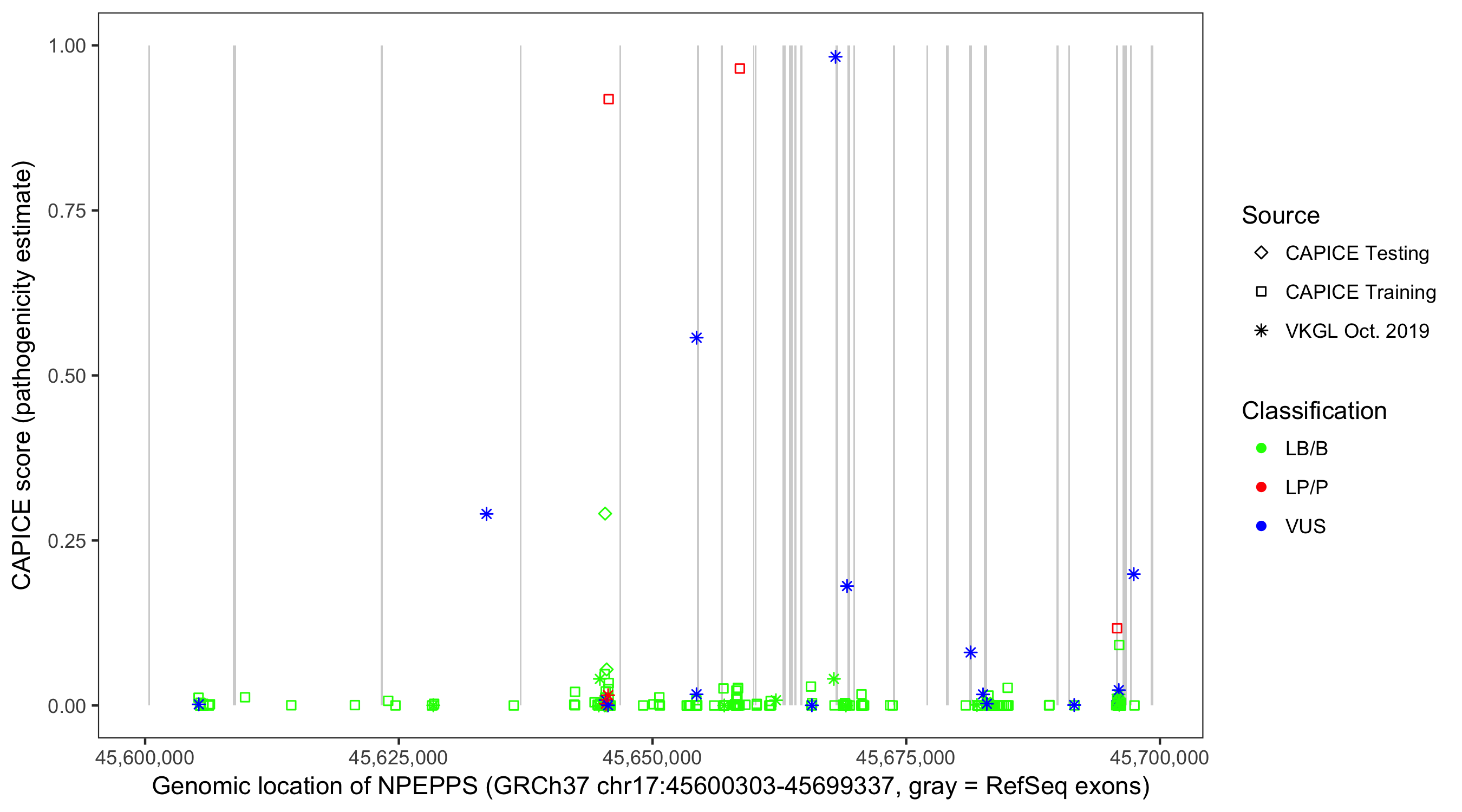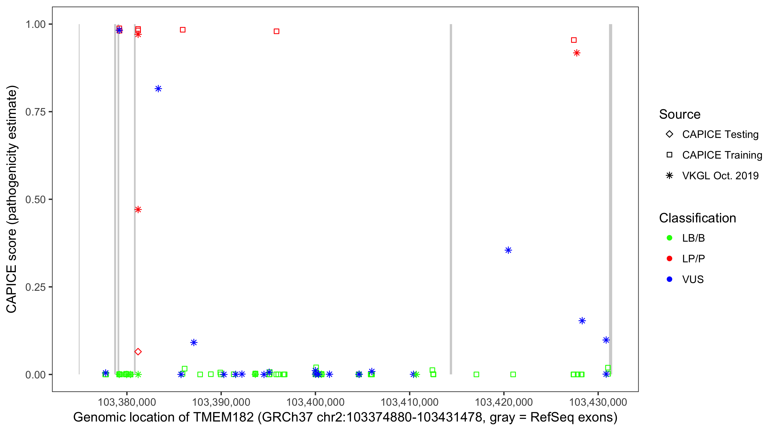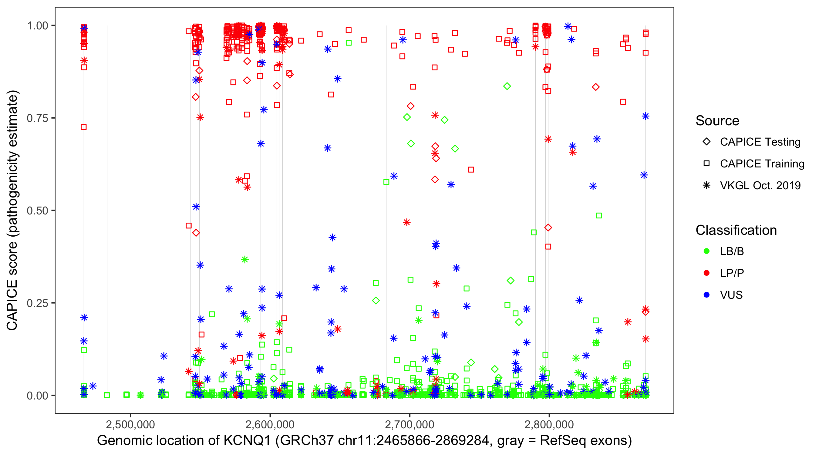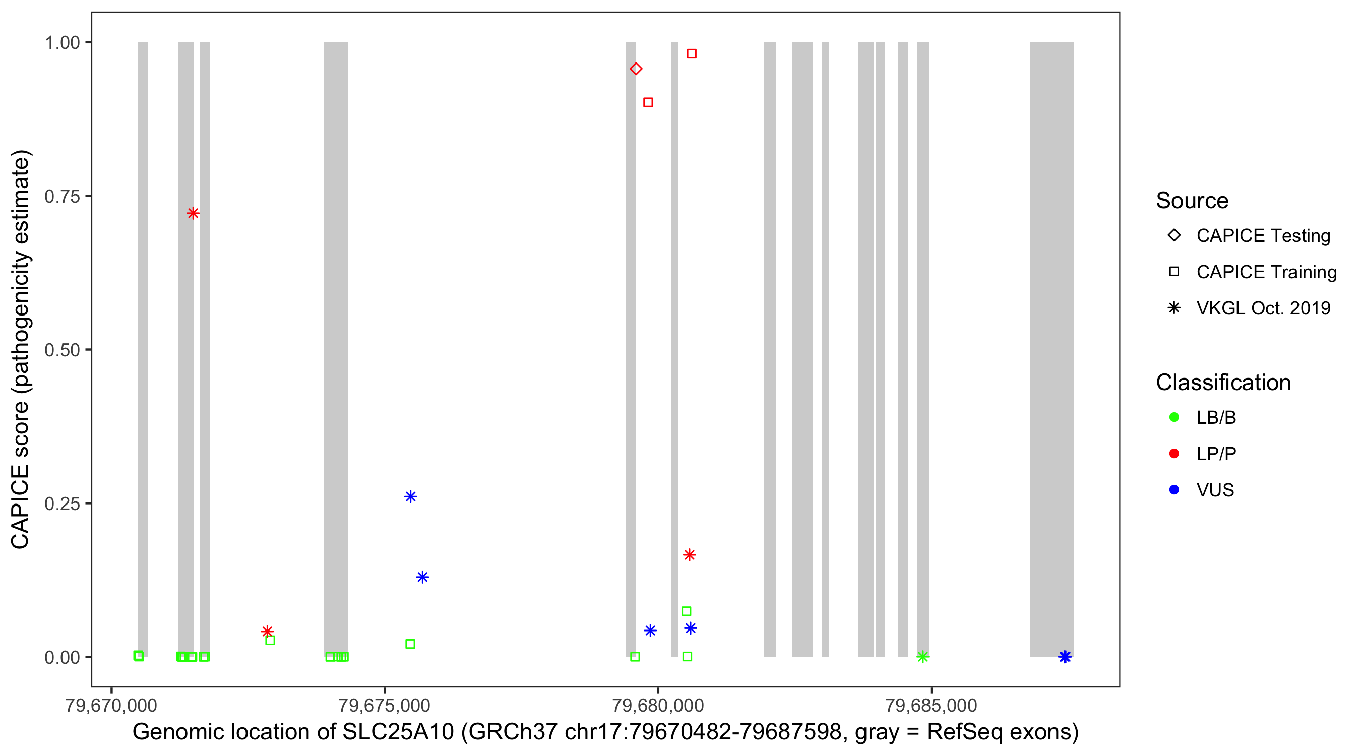 Shown are CAPICE train/test variants plus VKGL Oct 2019.