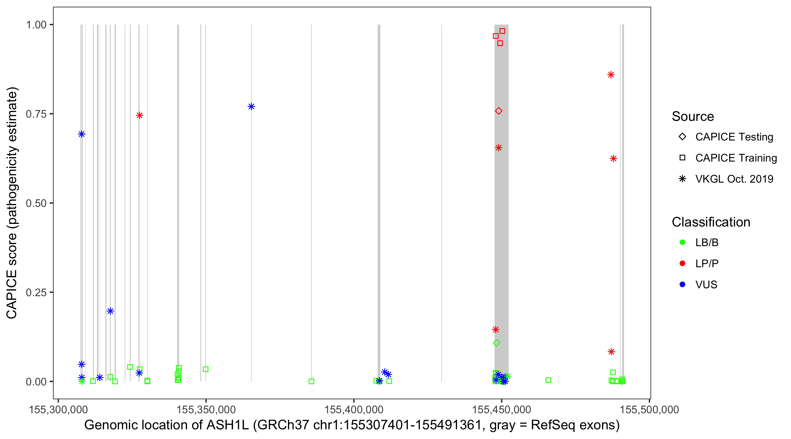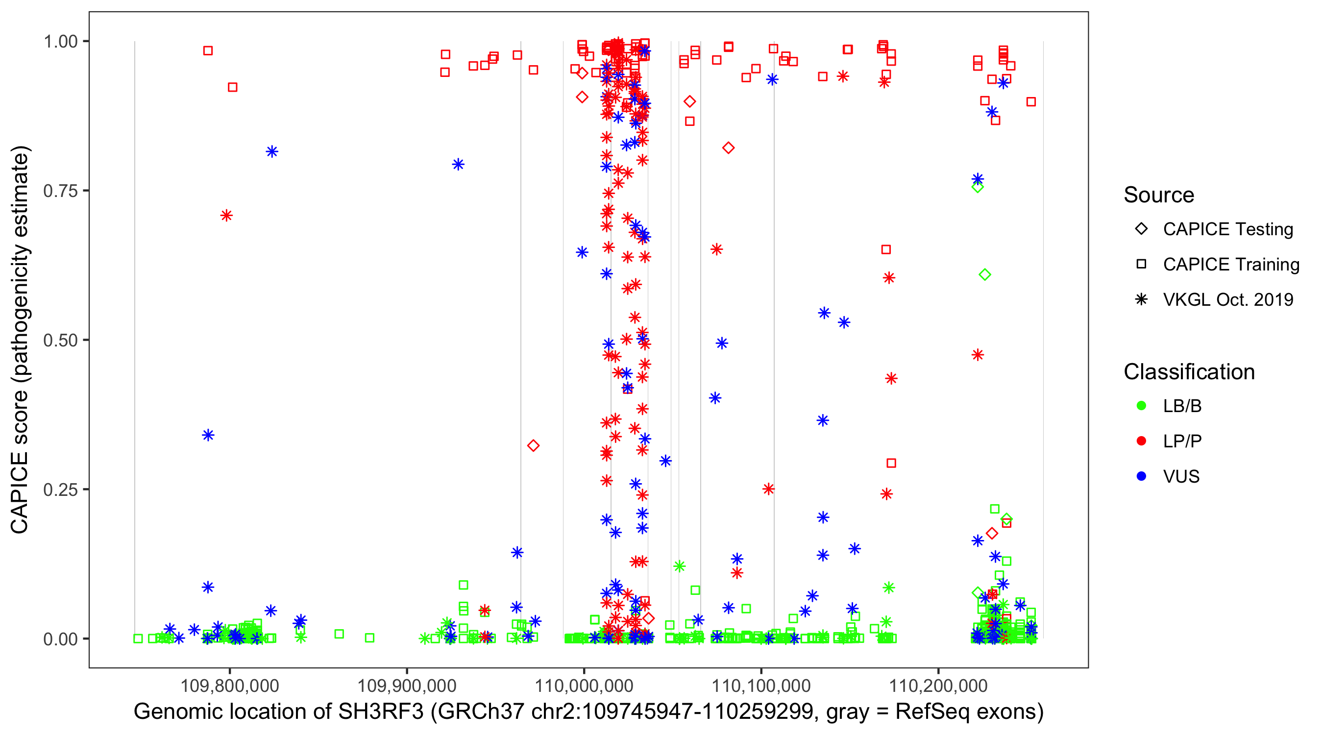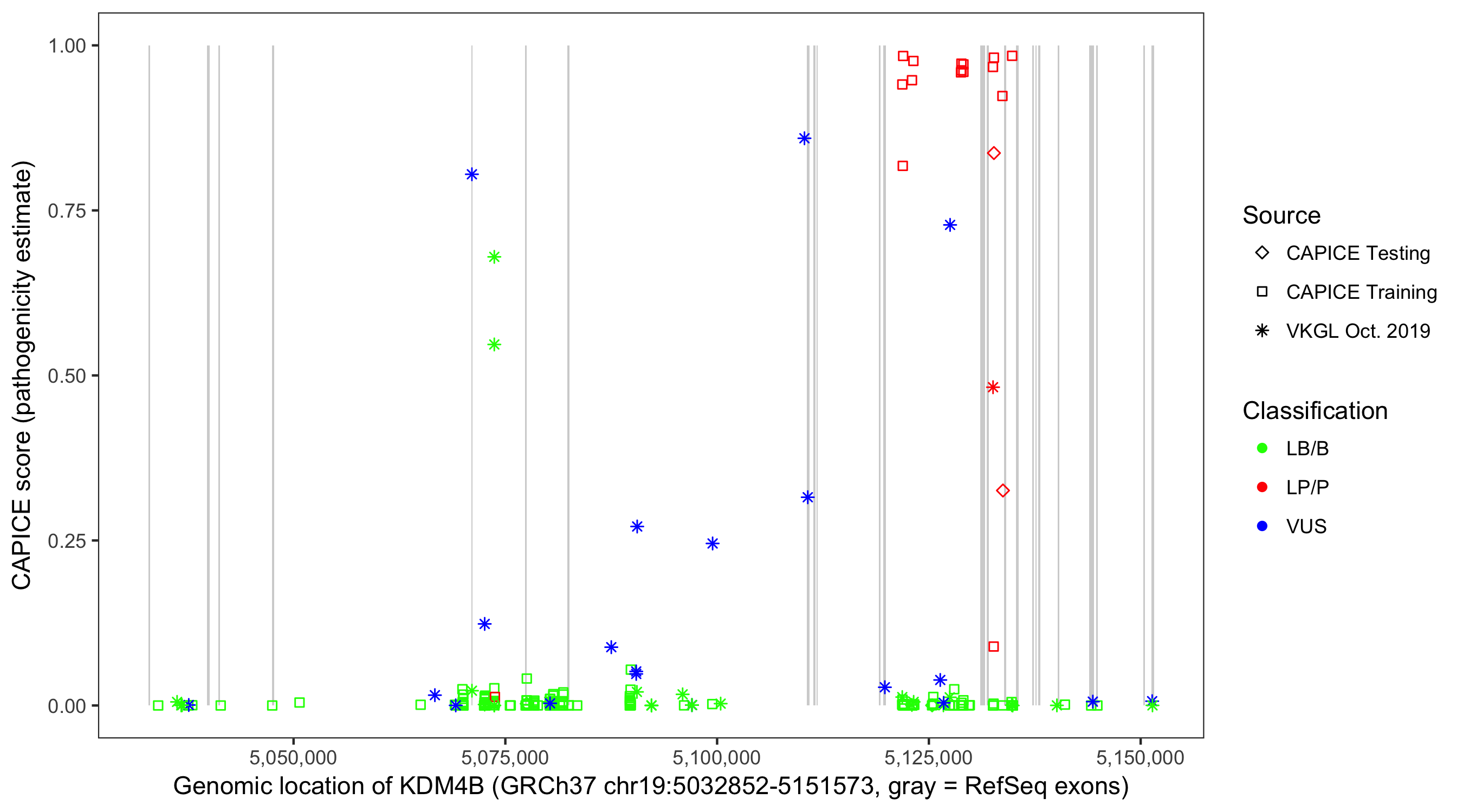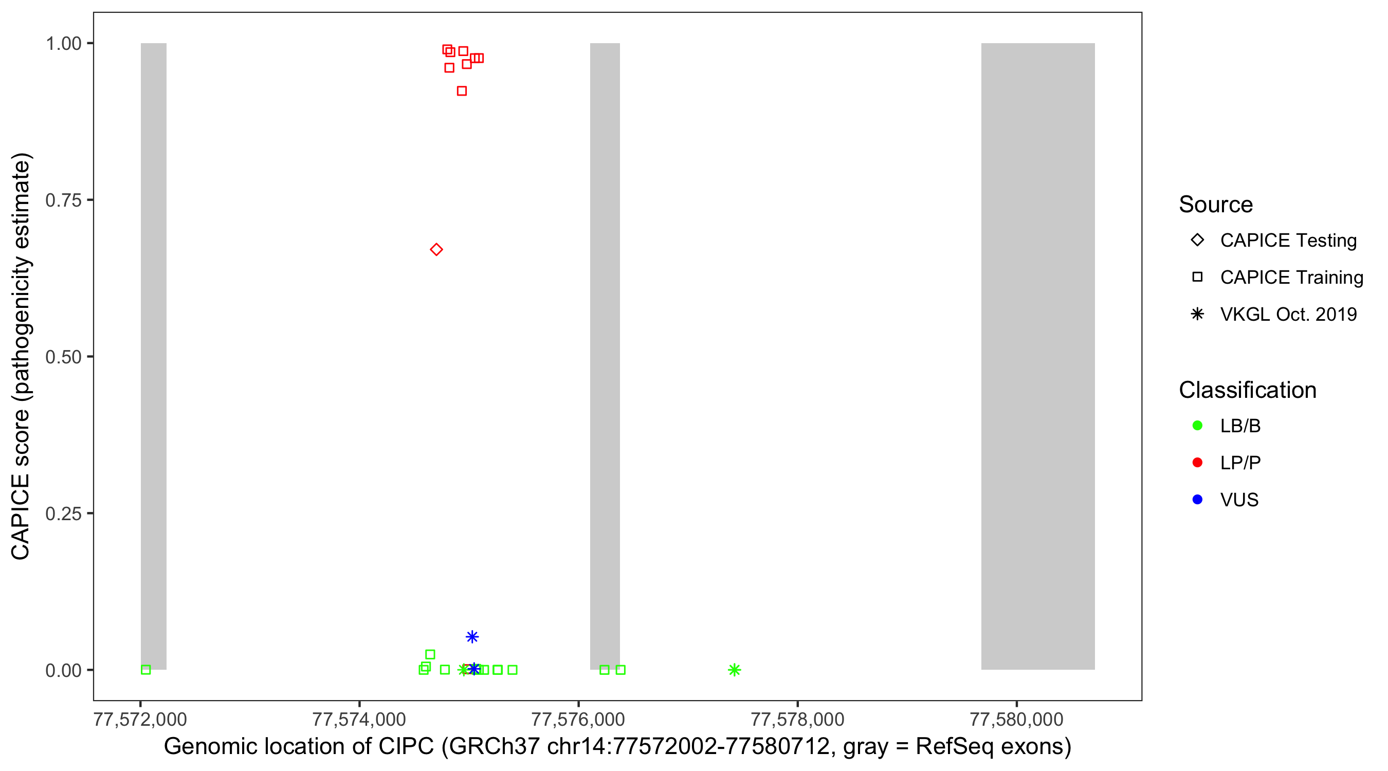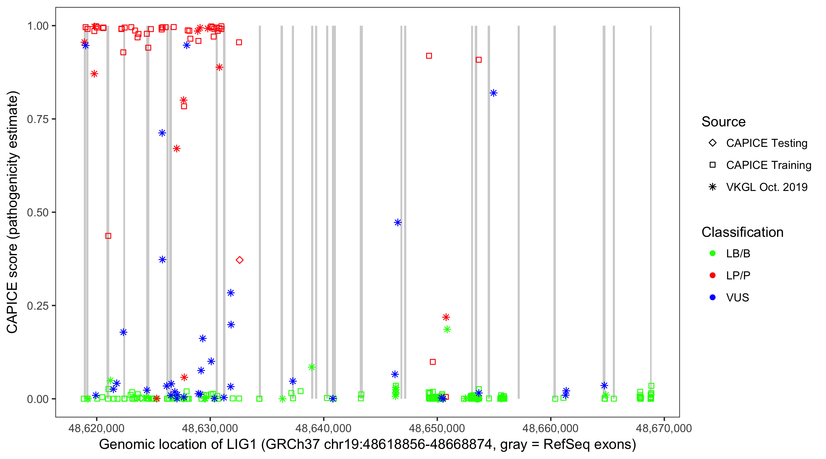 Shown are CAPICE train/test variants plus VKGL Oct 2019.