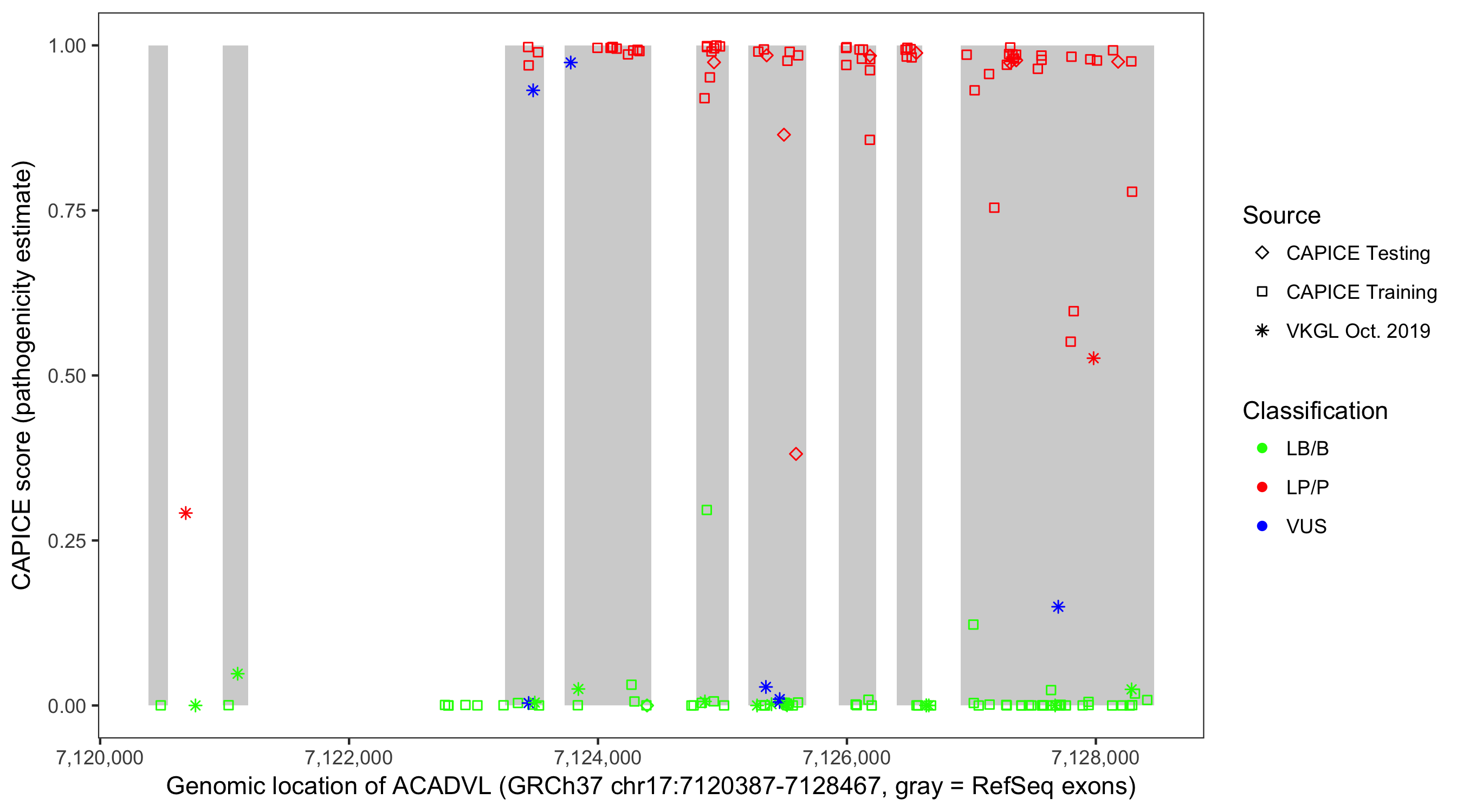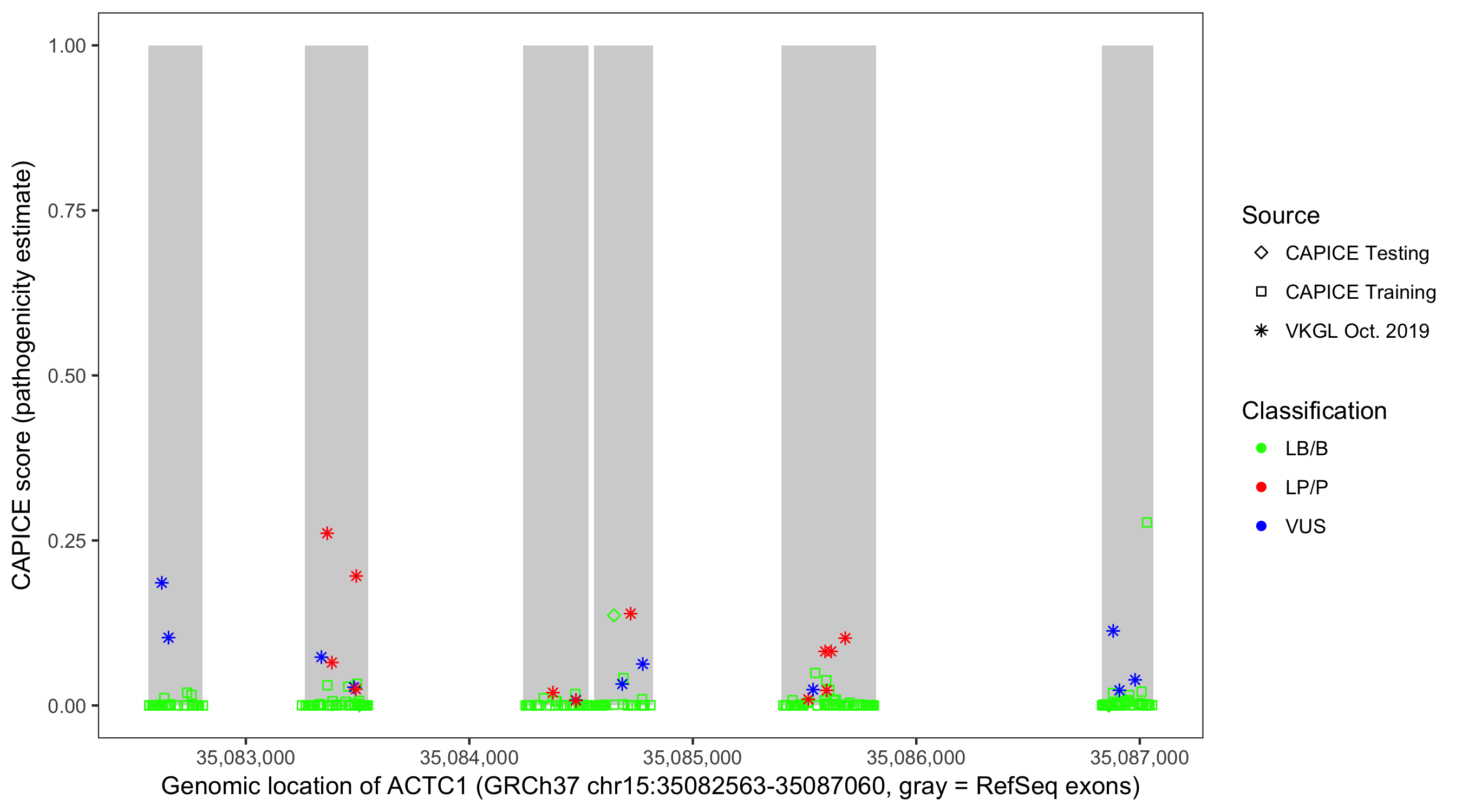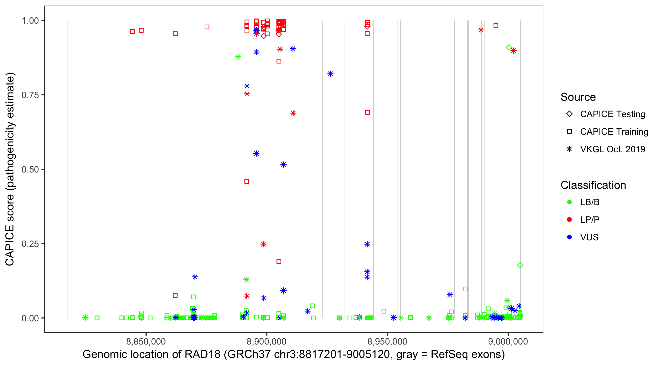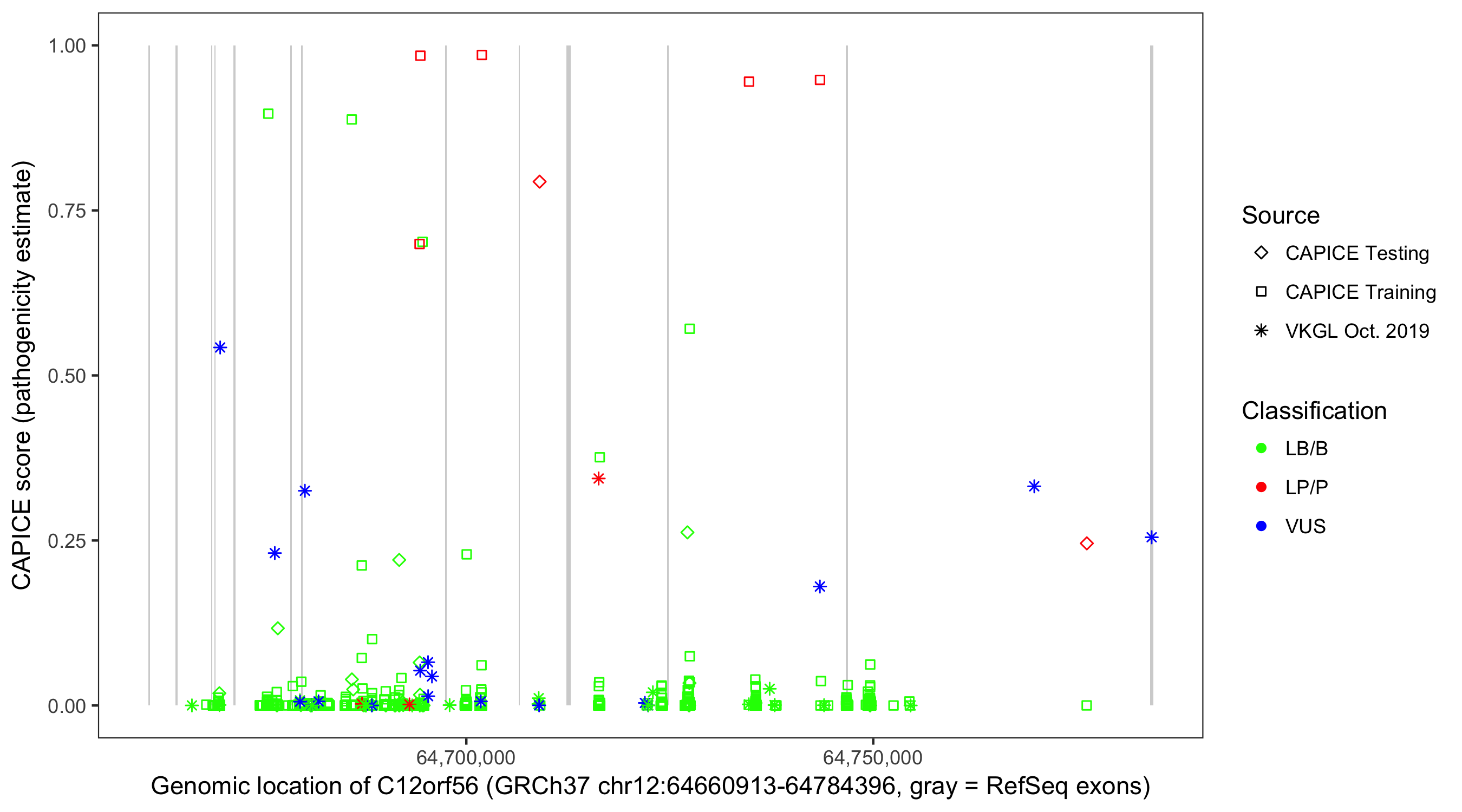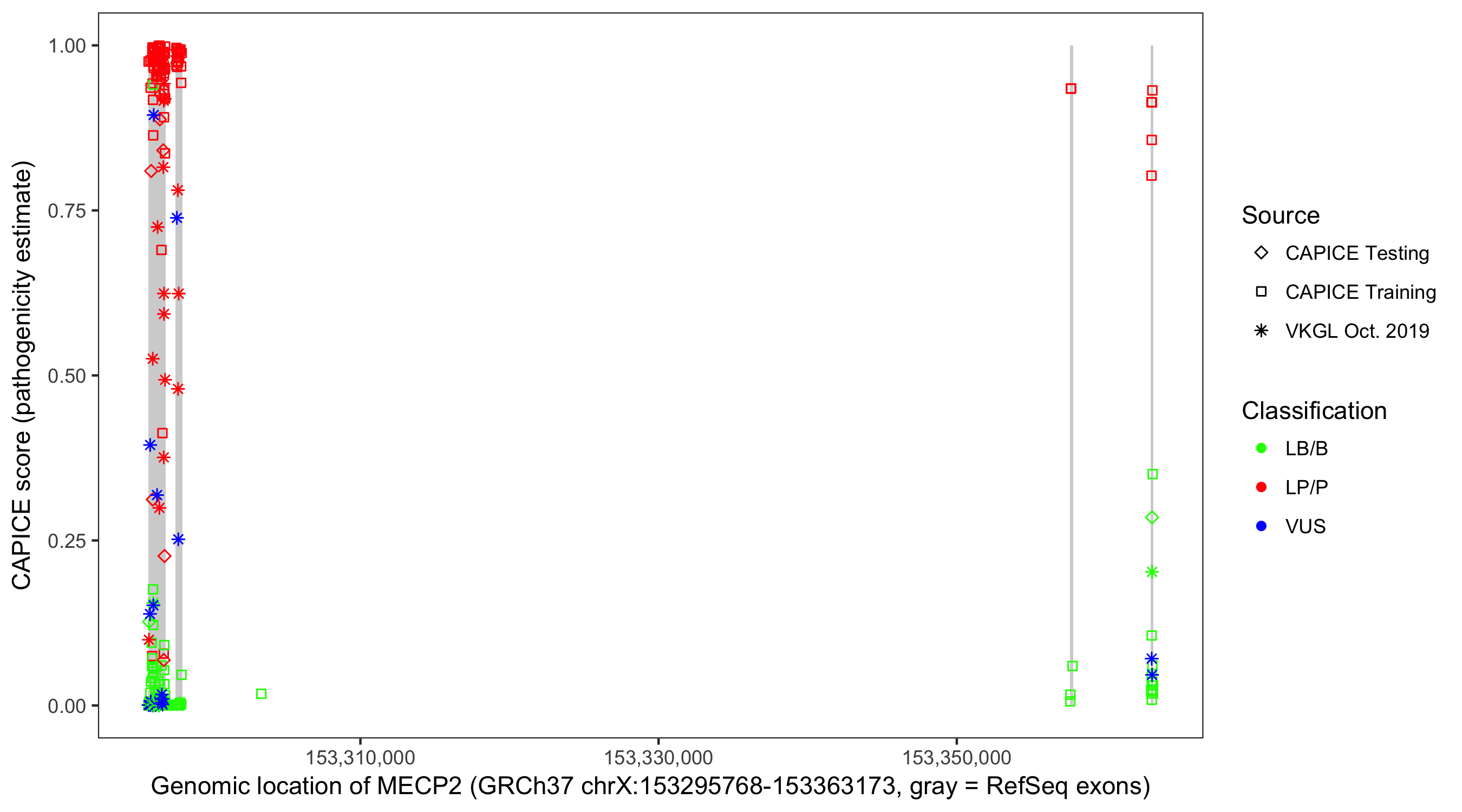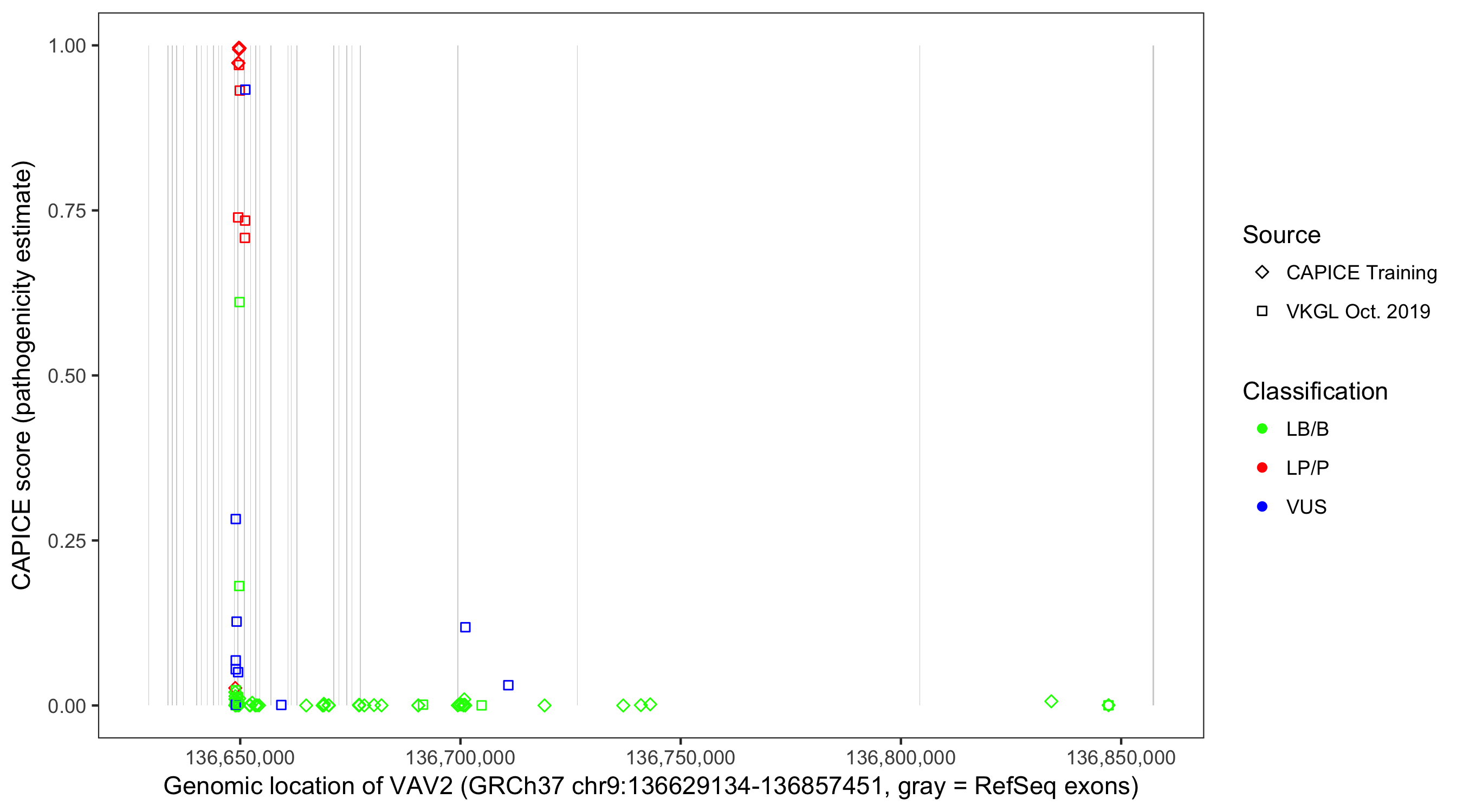 Shown are CAPICE train/test variants plus VKGL Oct 2019.