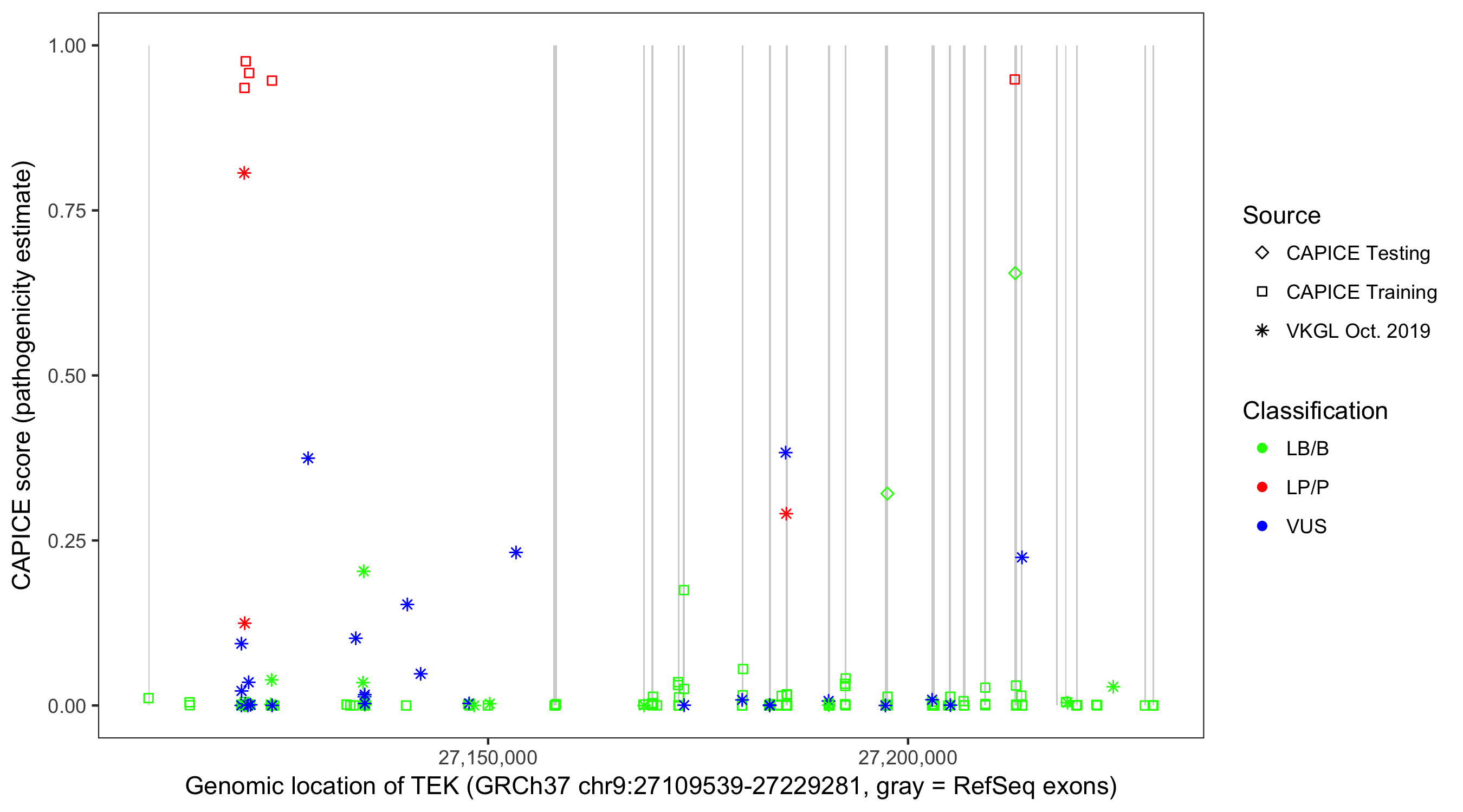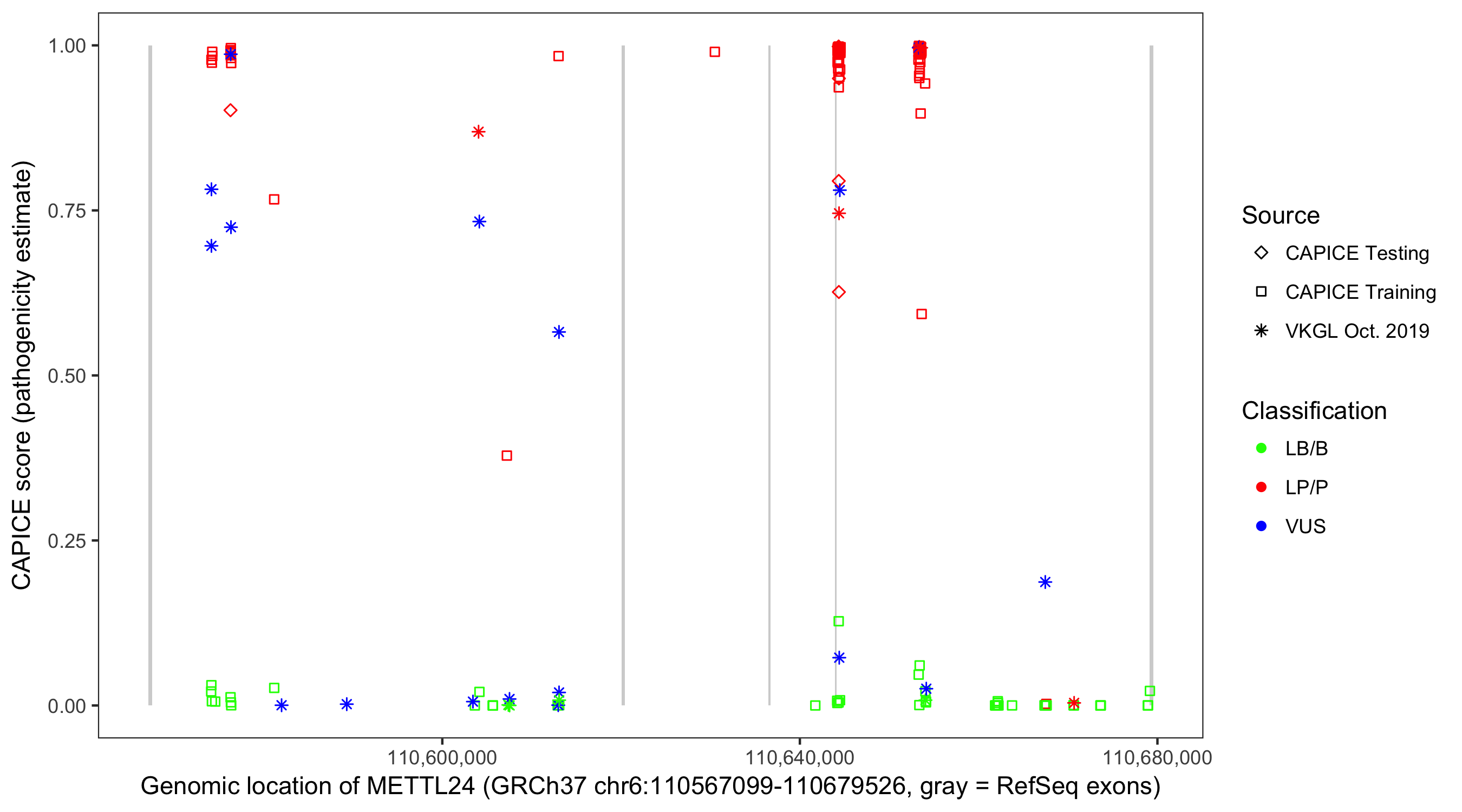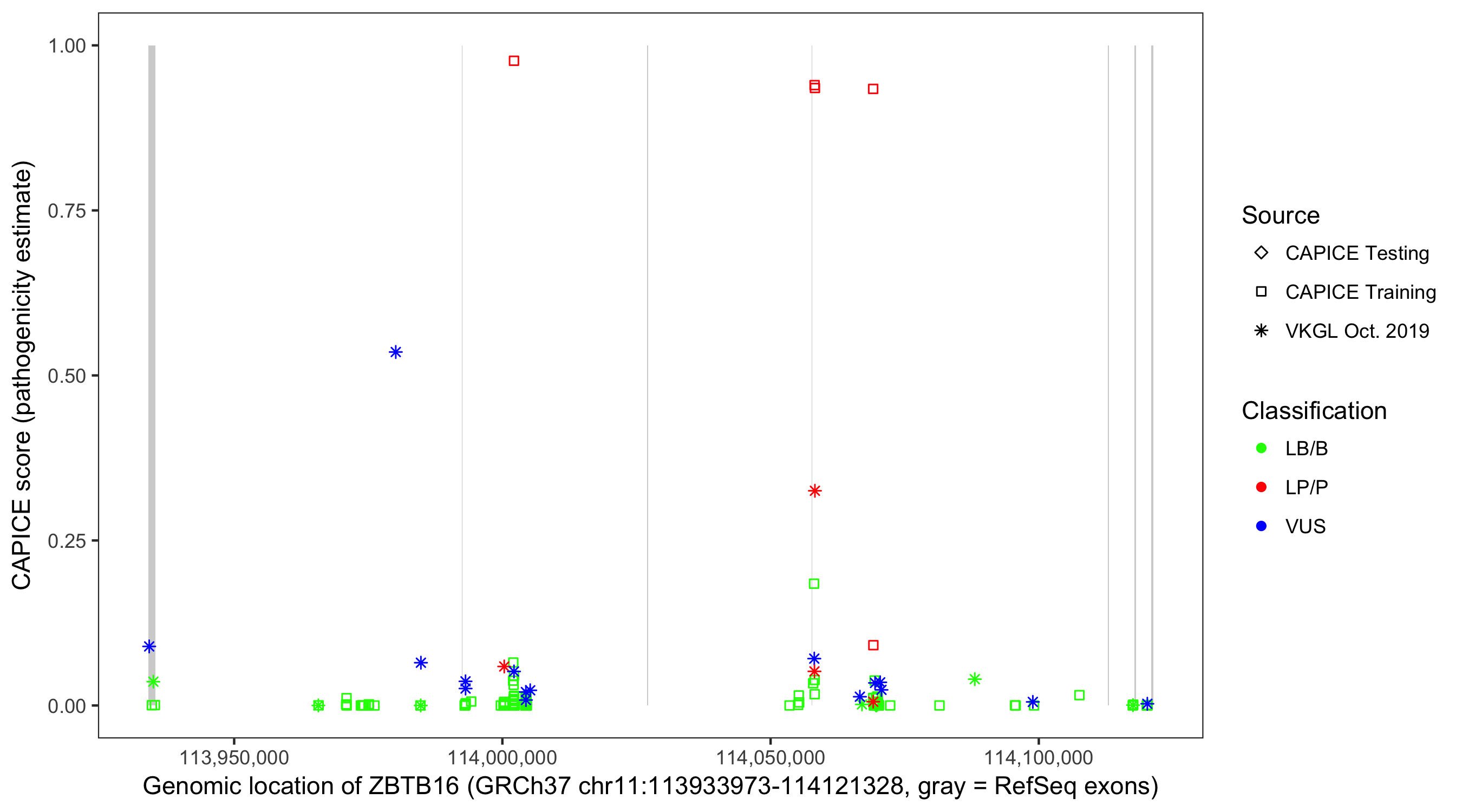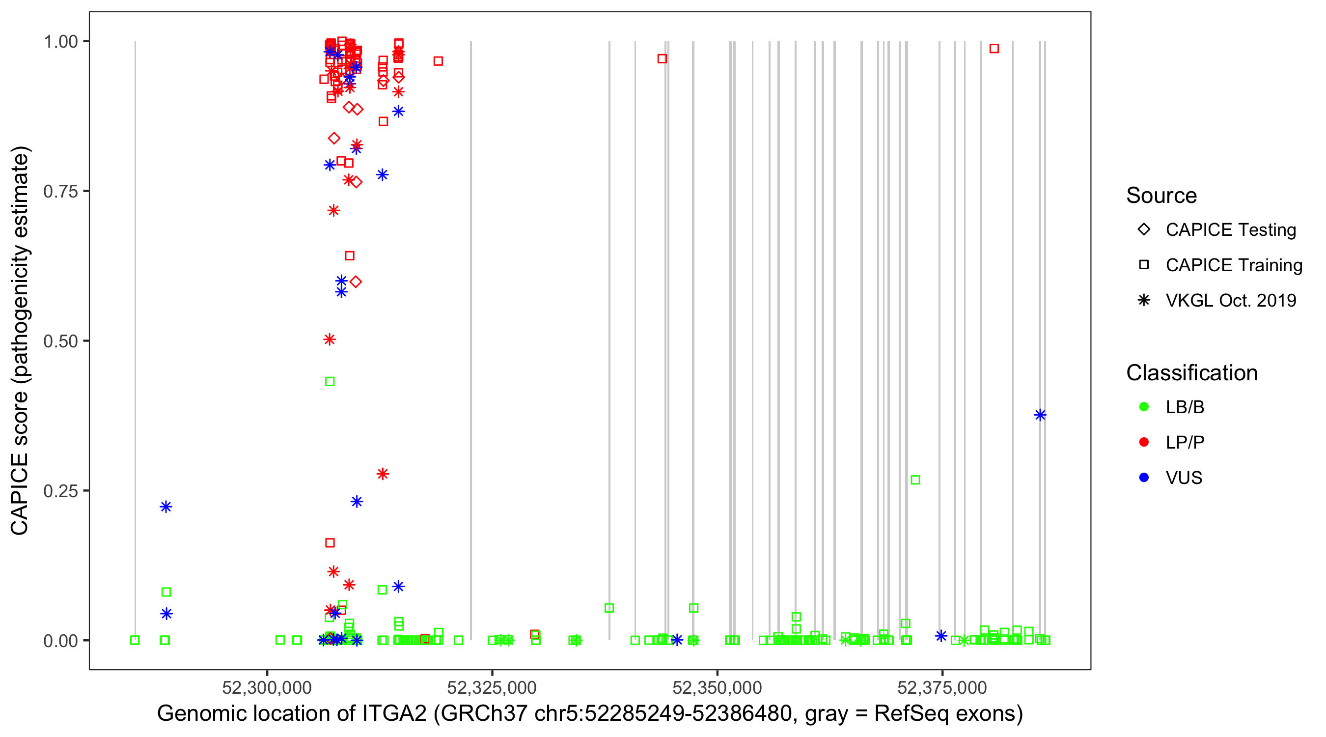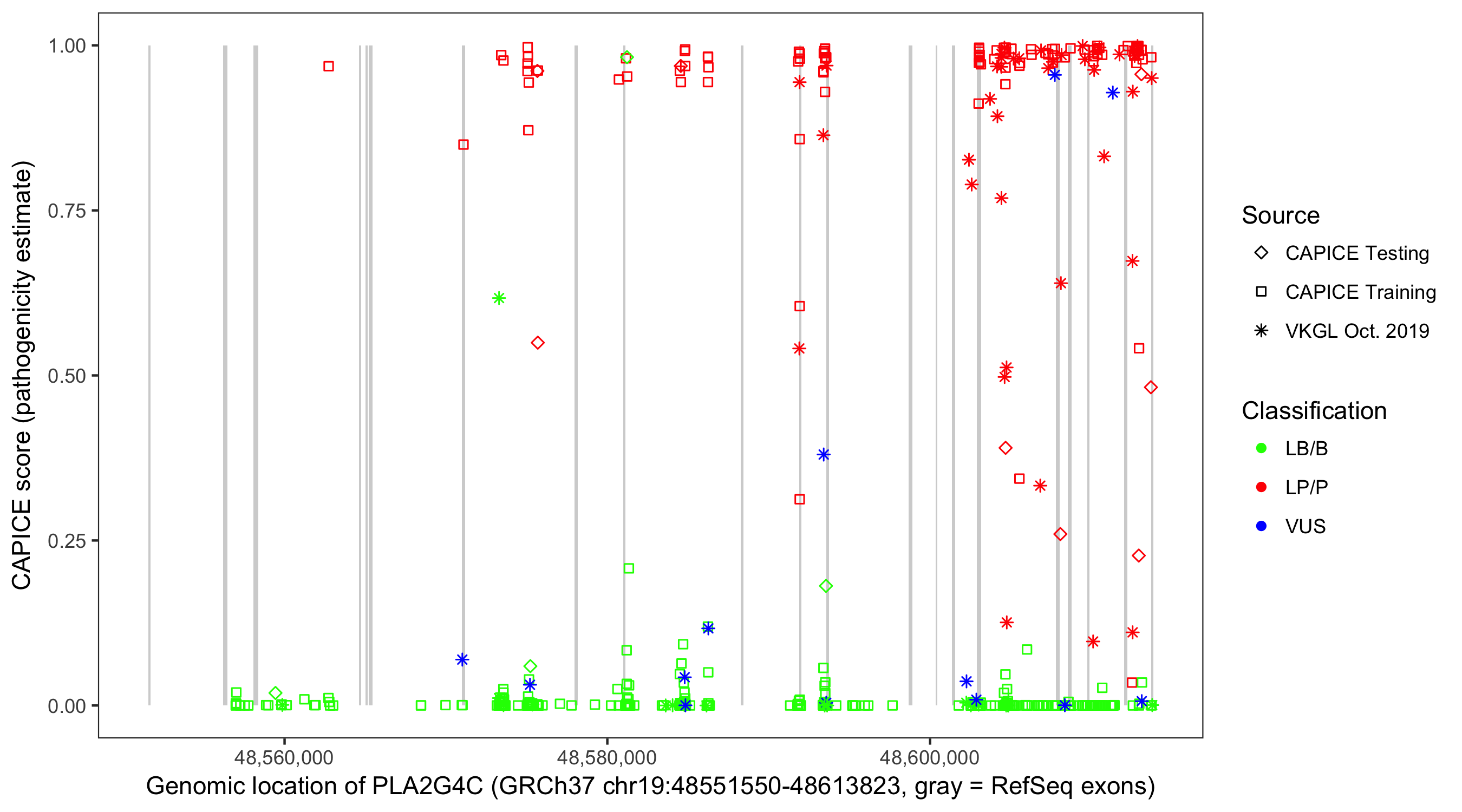 Shown are CAPICE train/test variants plus VKGL Oct 2019.