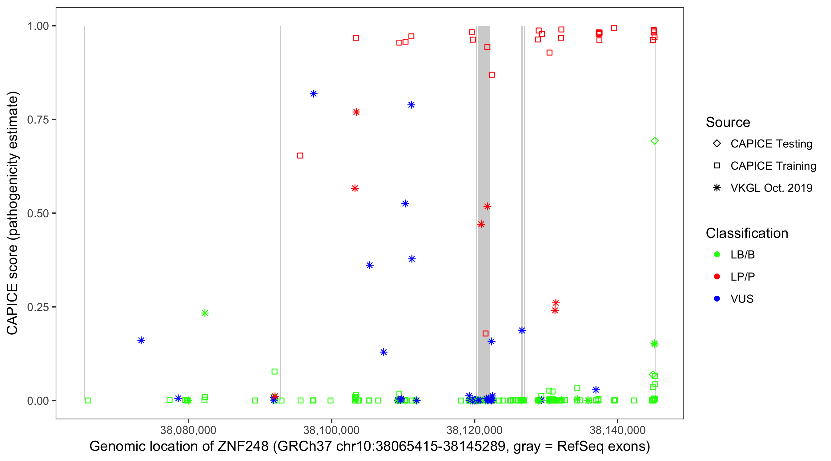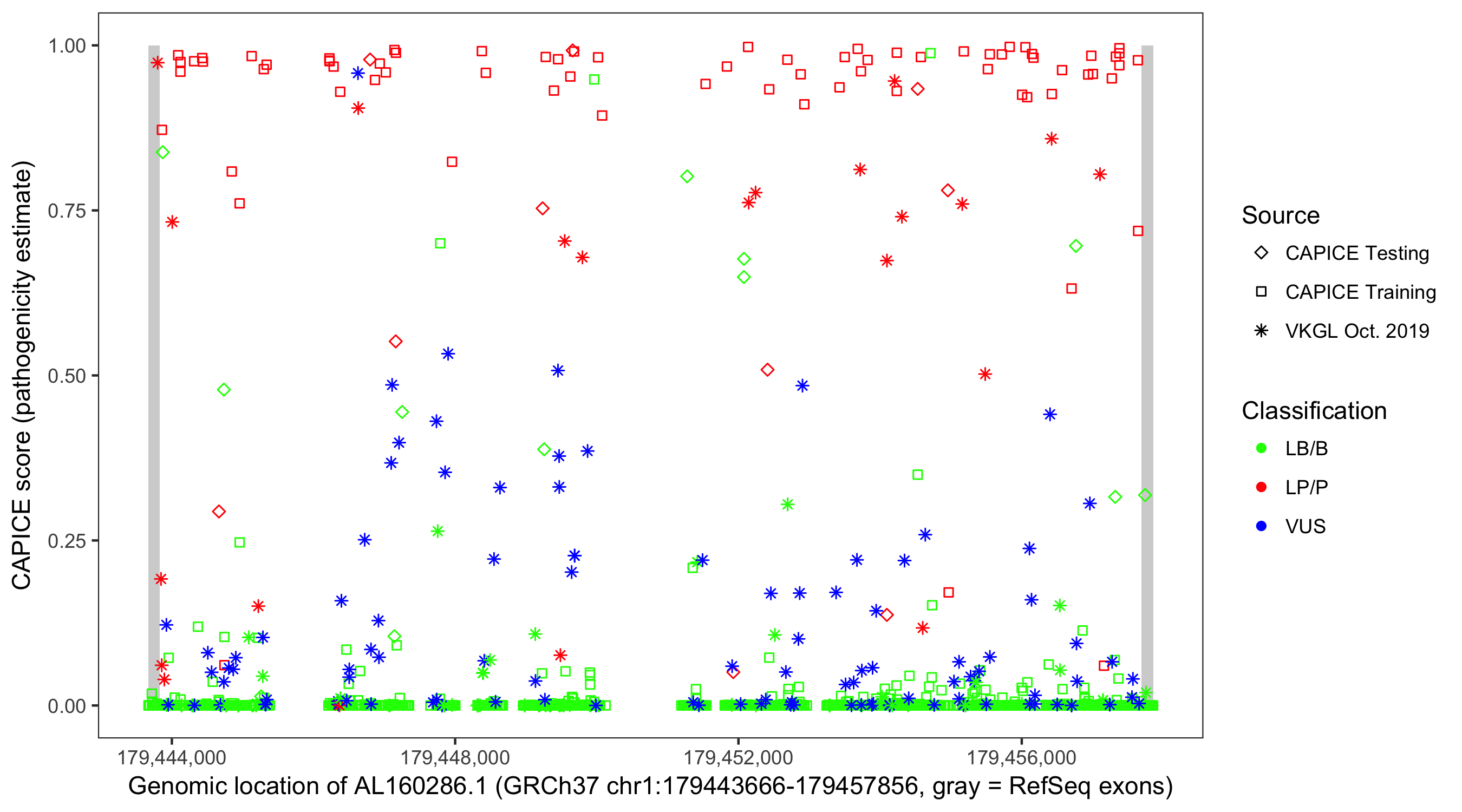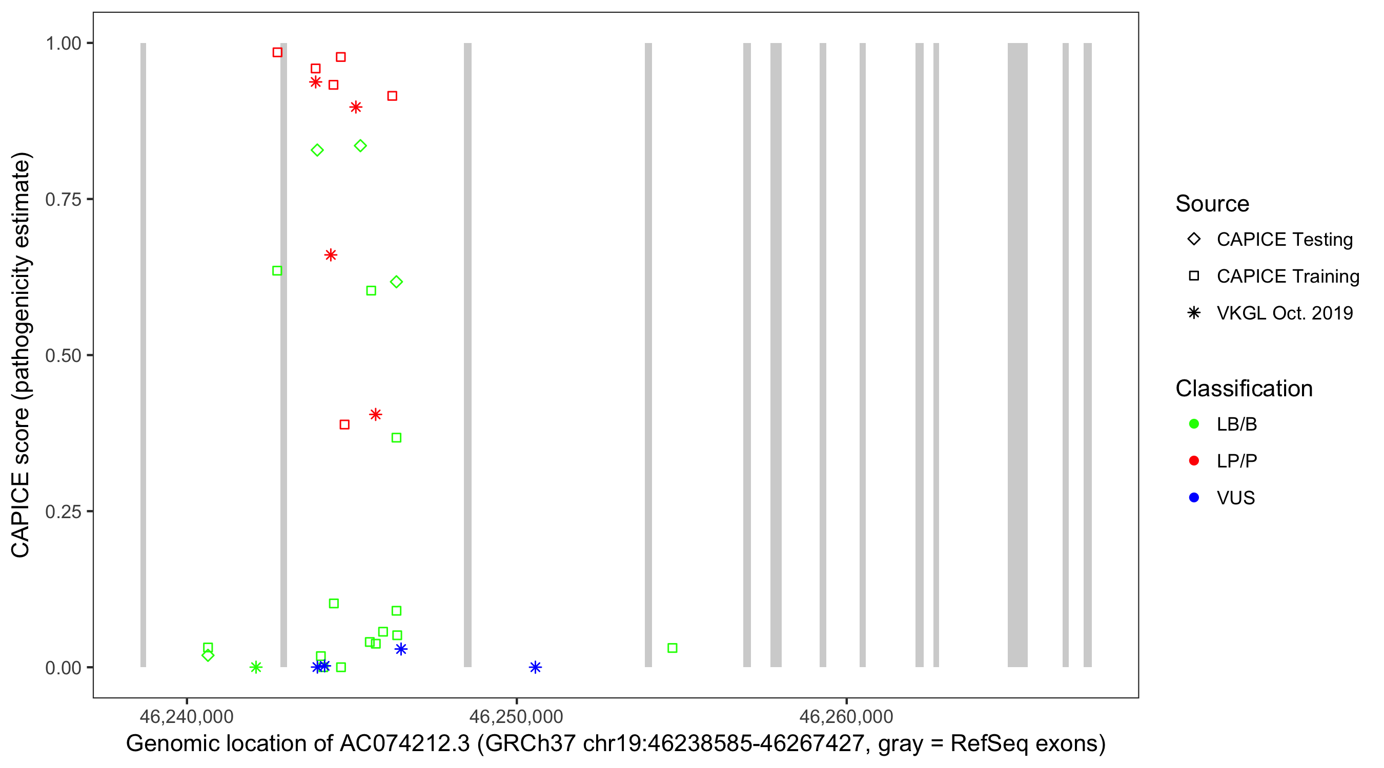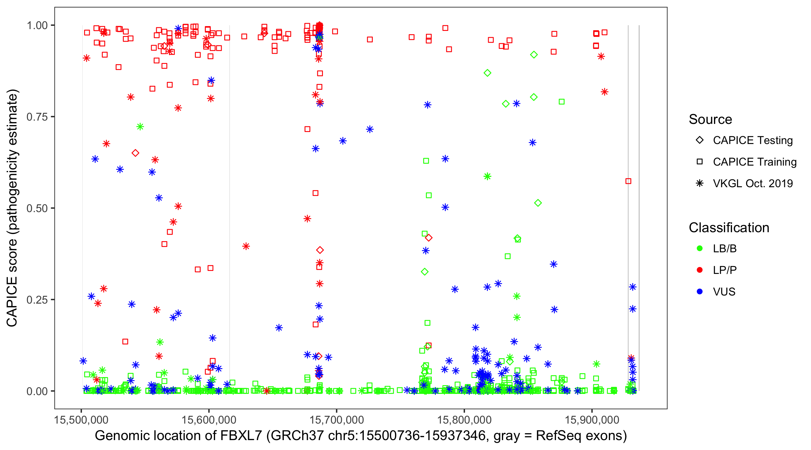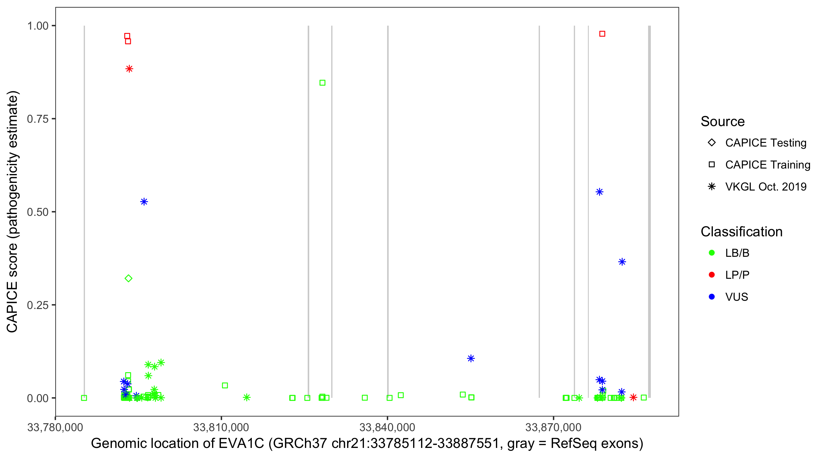 Shown are CAPICE train/test variants plus VKGL Oct 2019.