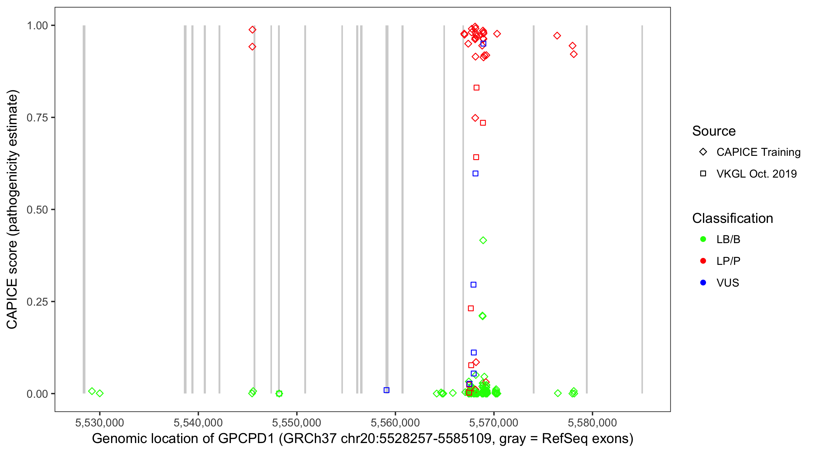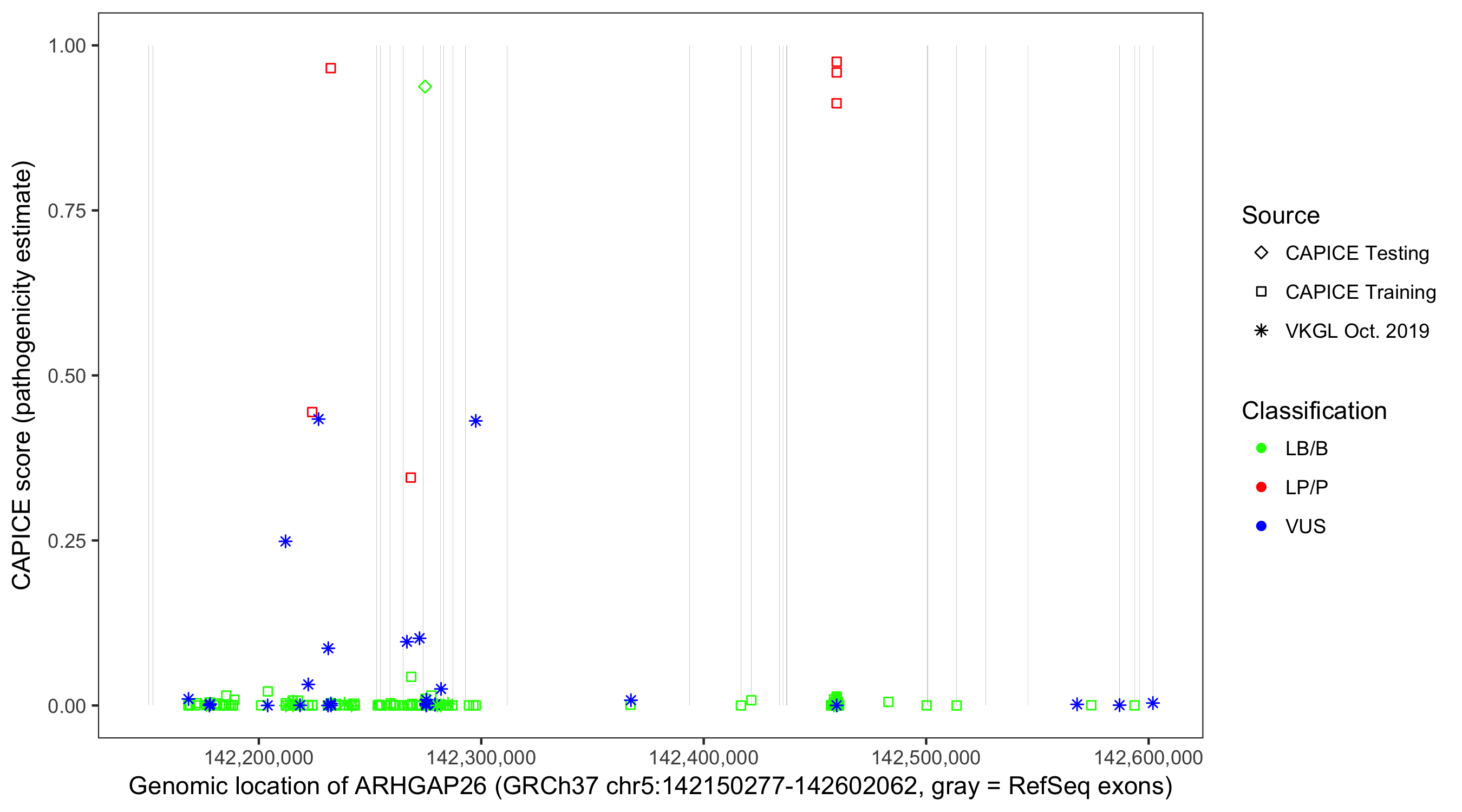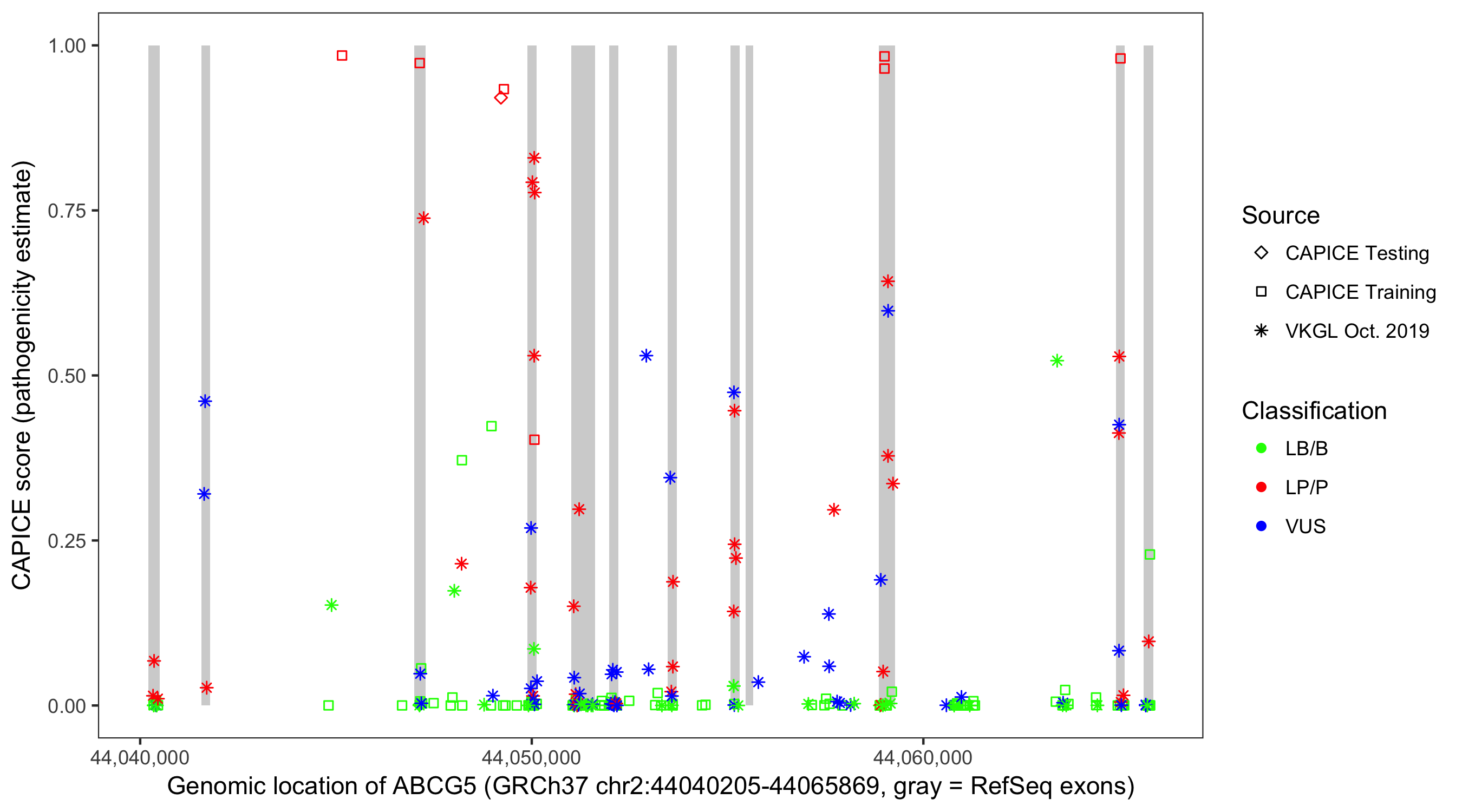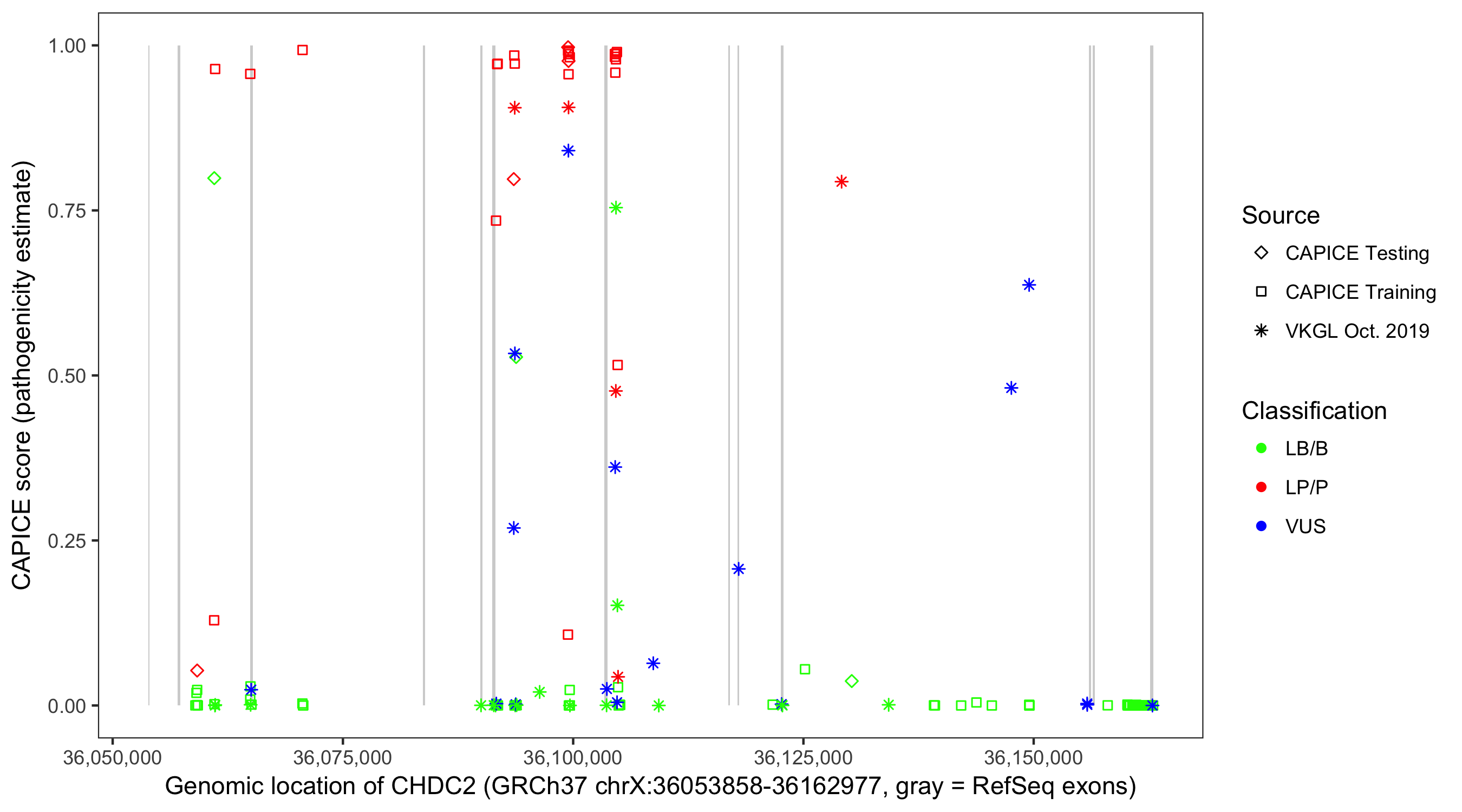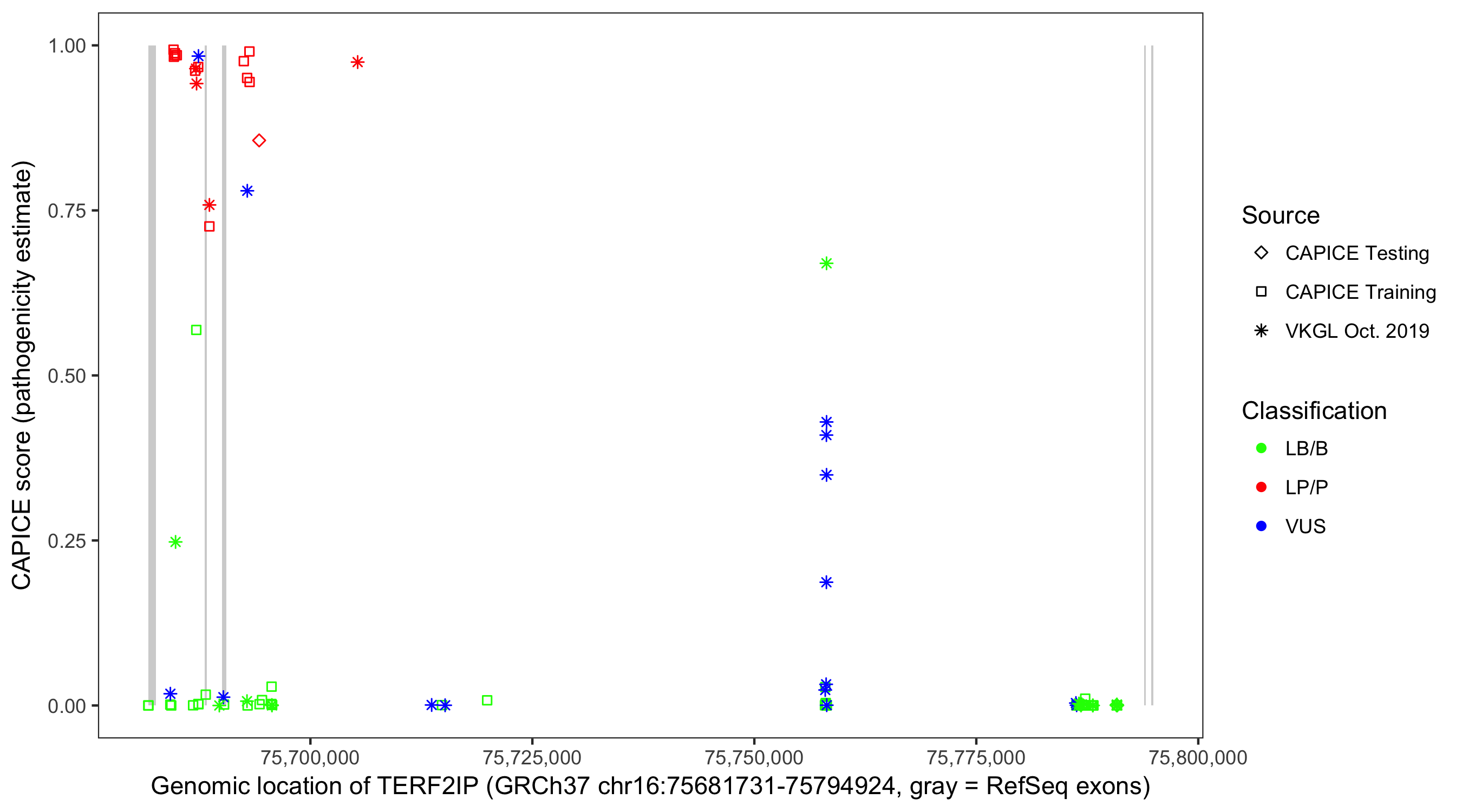 Shown are CAPICE train/test variants plus VKGL Oct 2019.