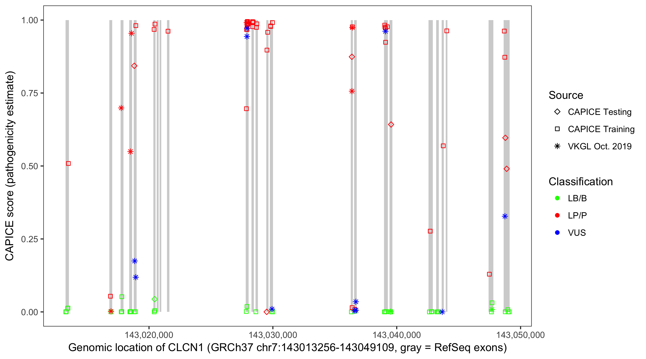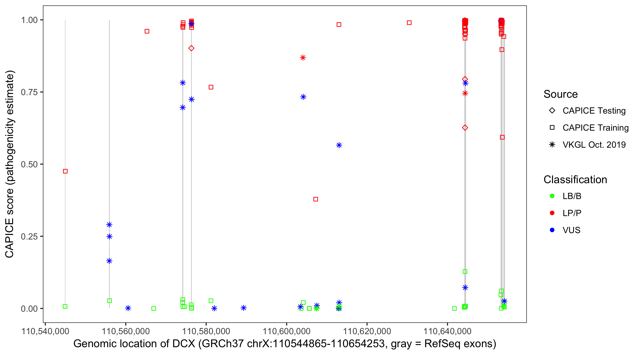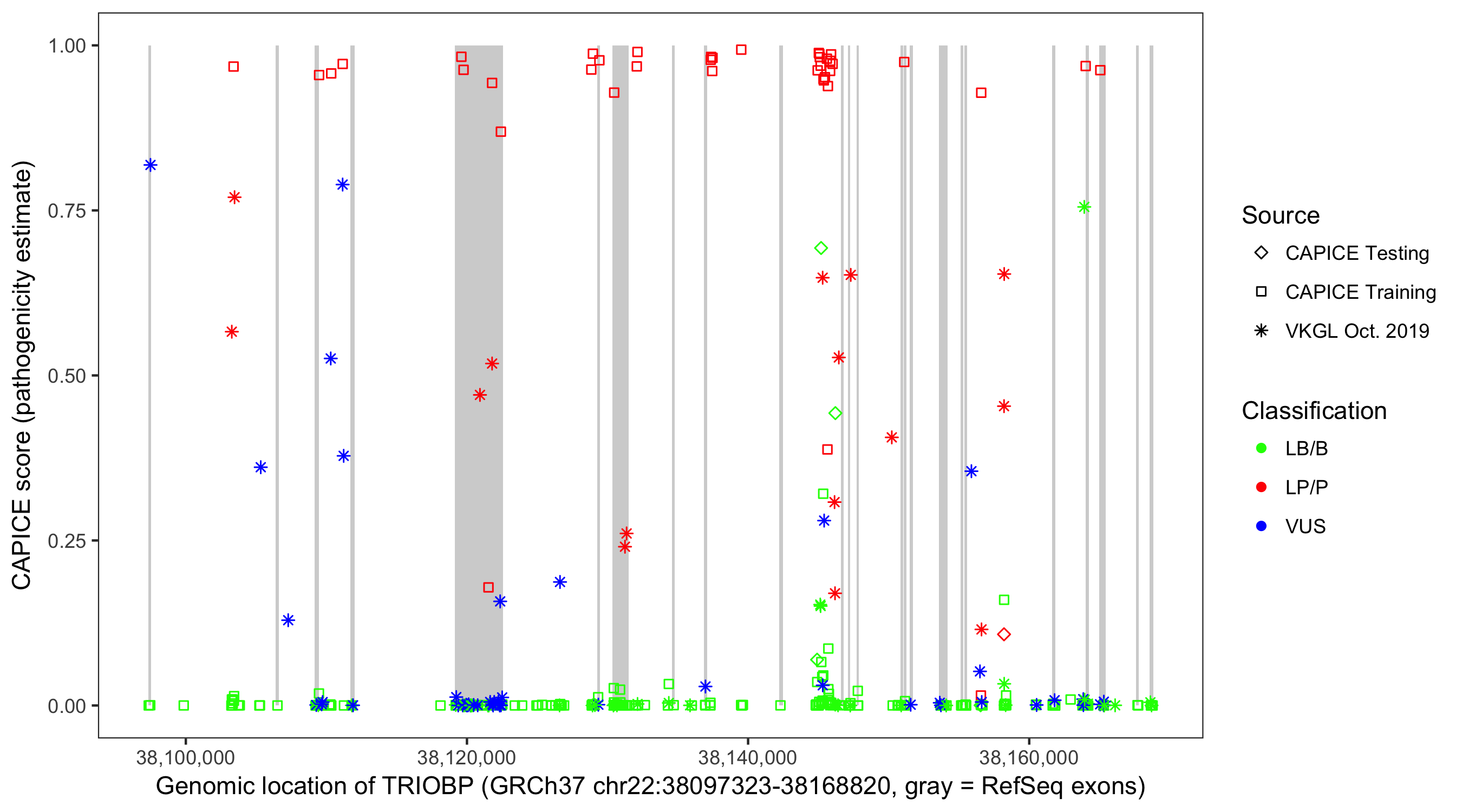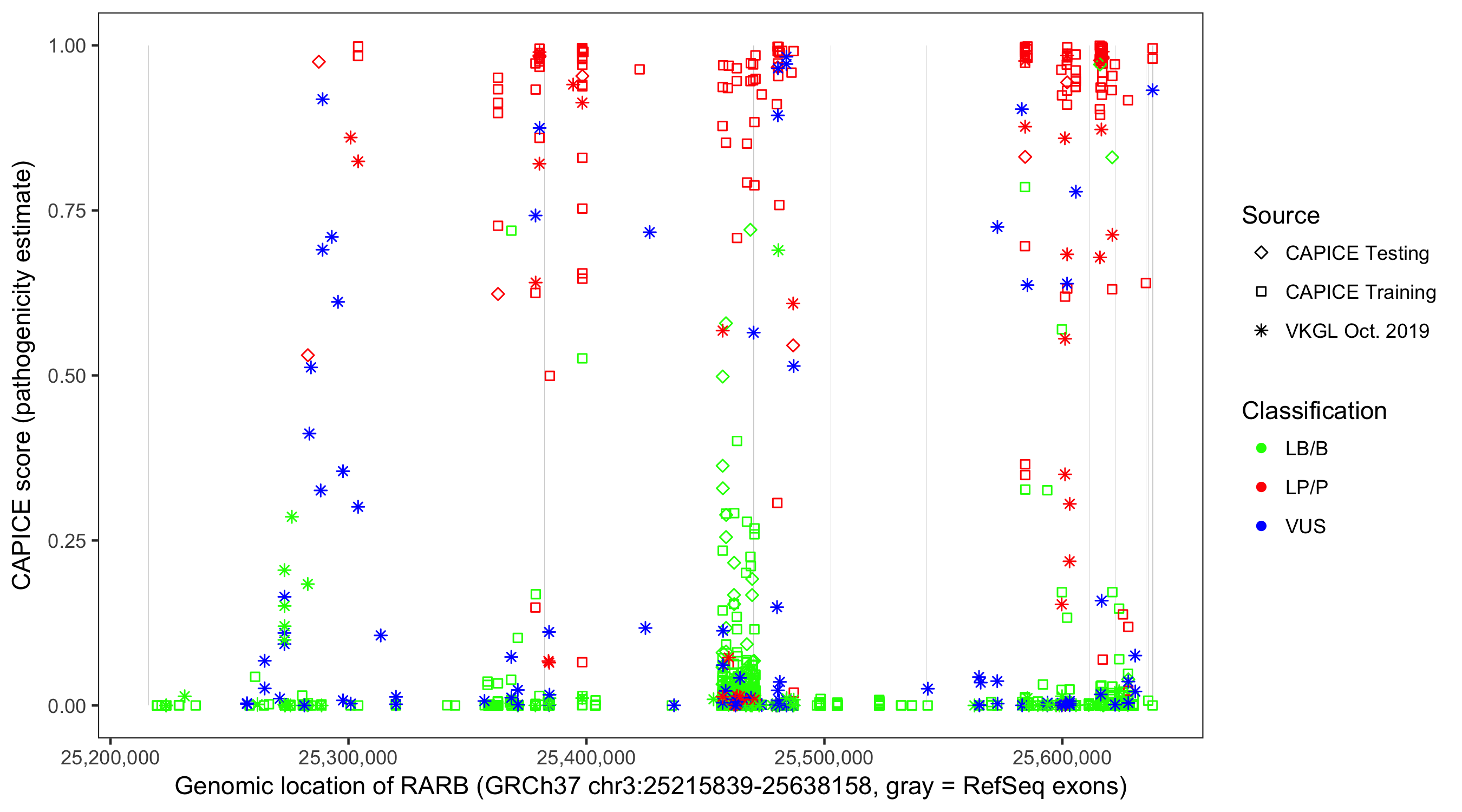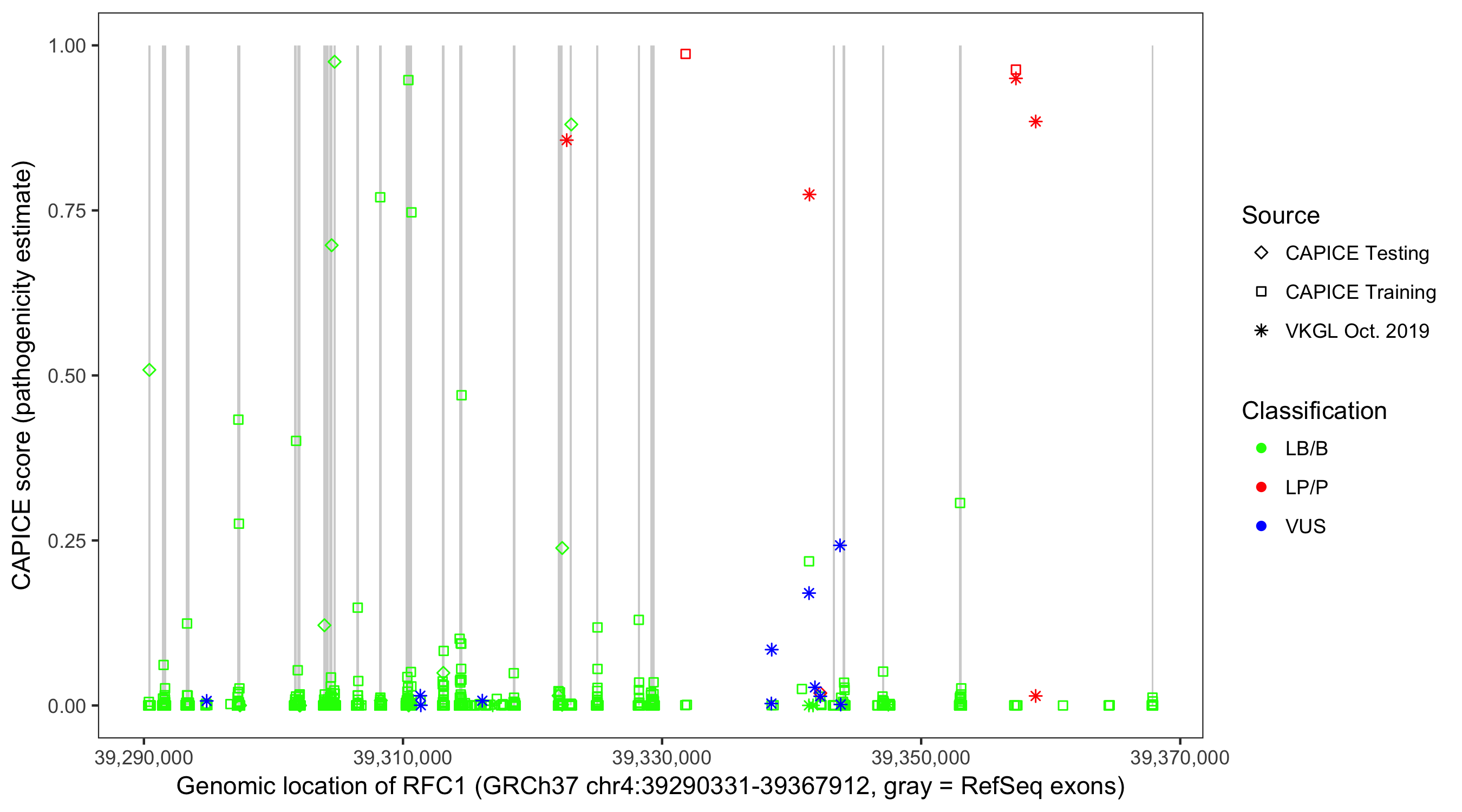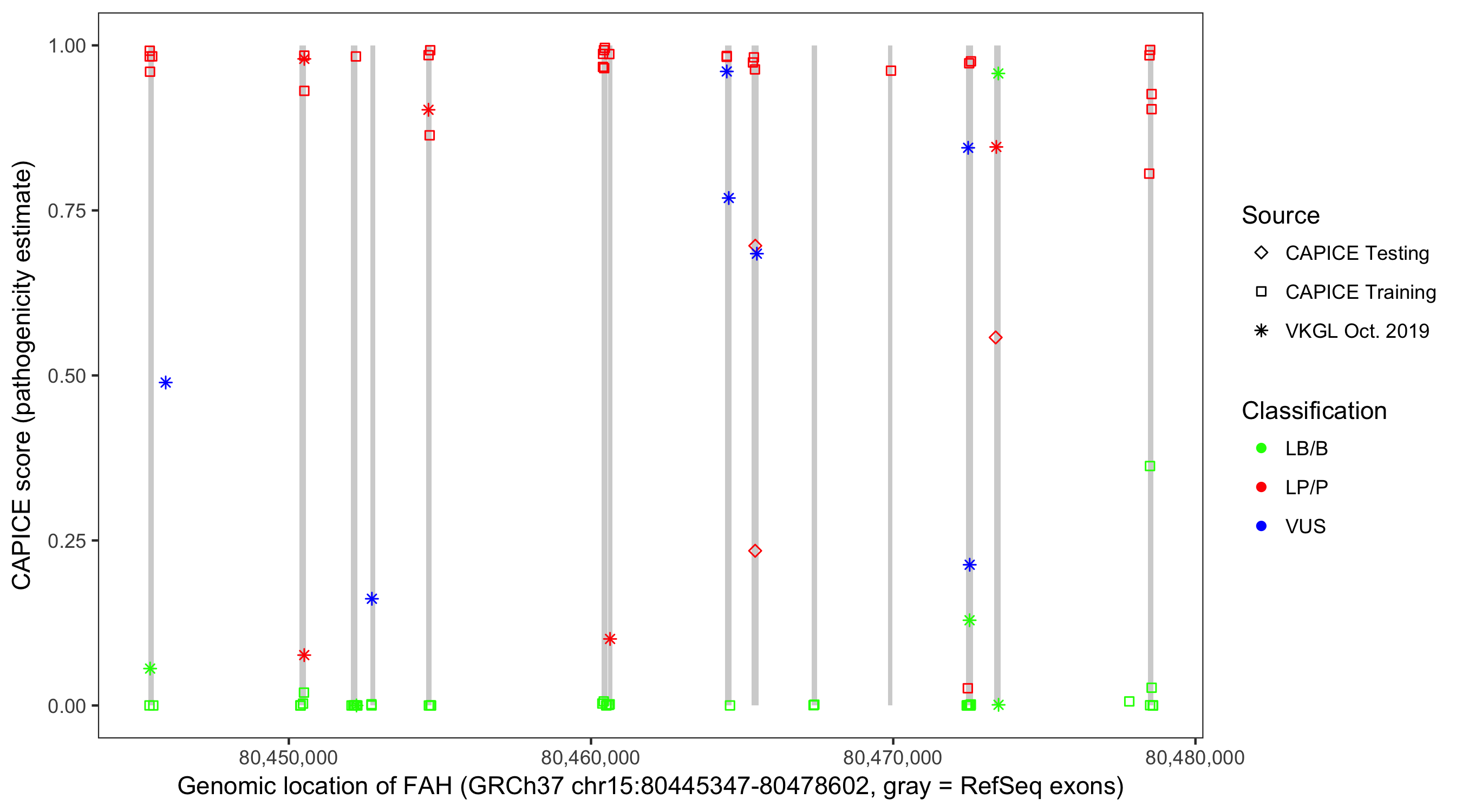Shown are CAPICE train/test variants plus VKGL Oct 2019.