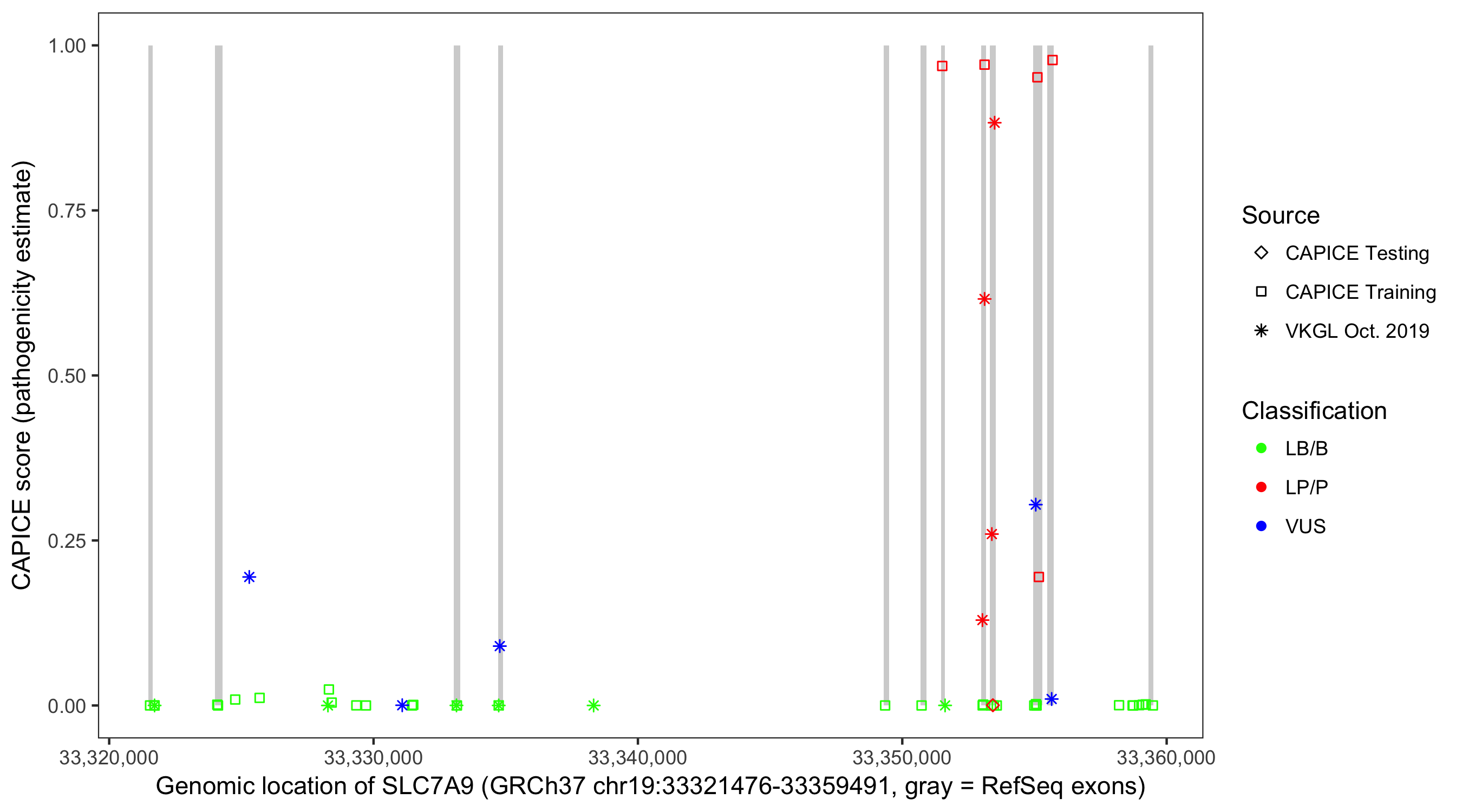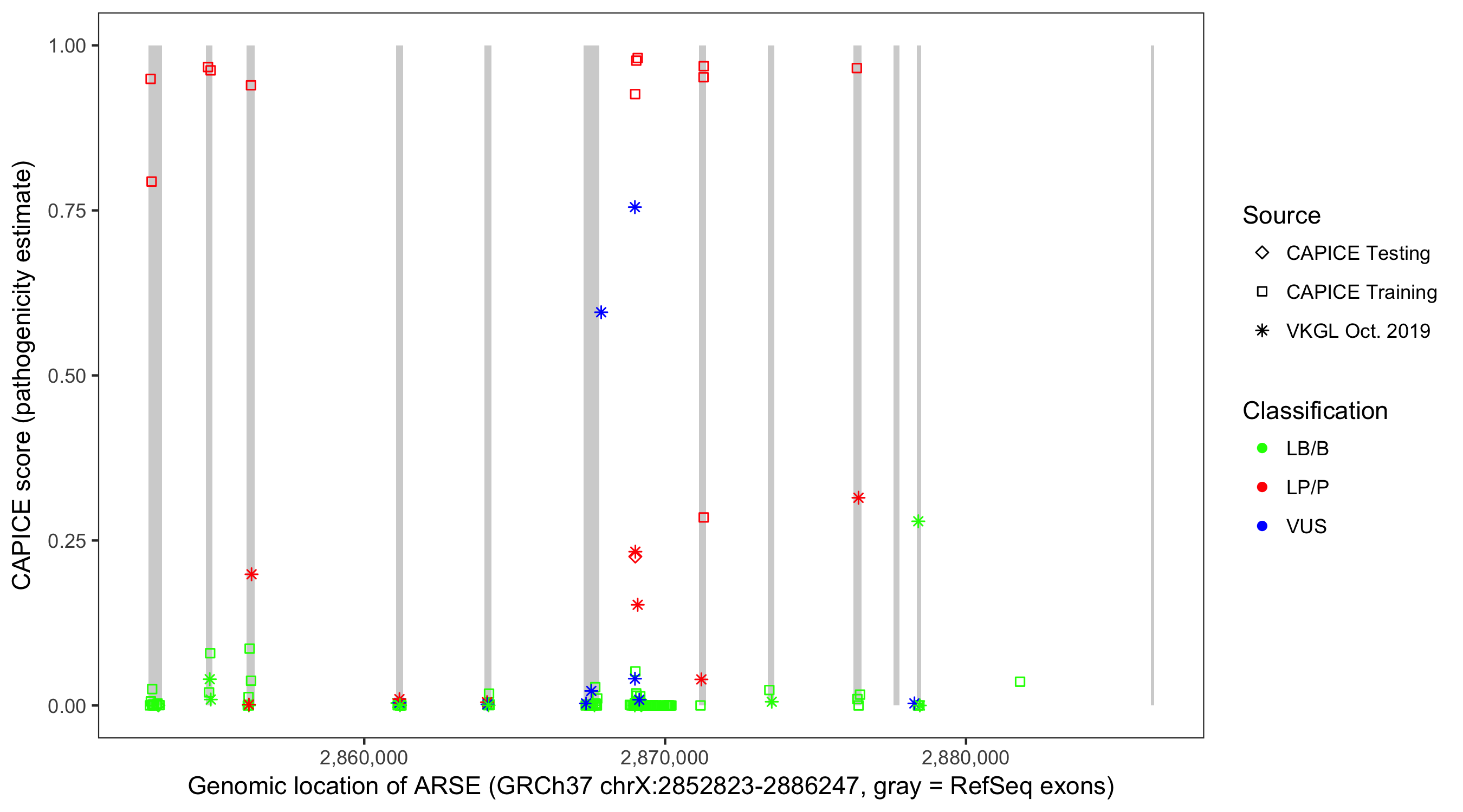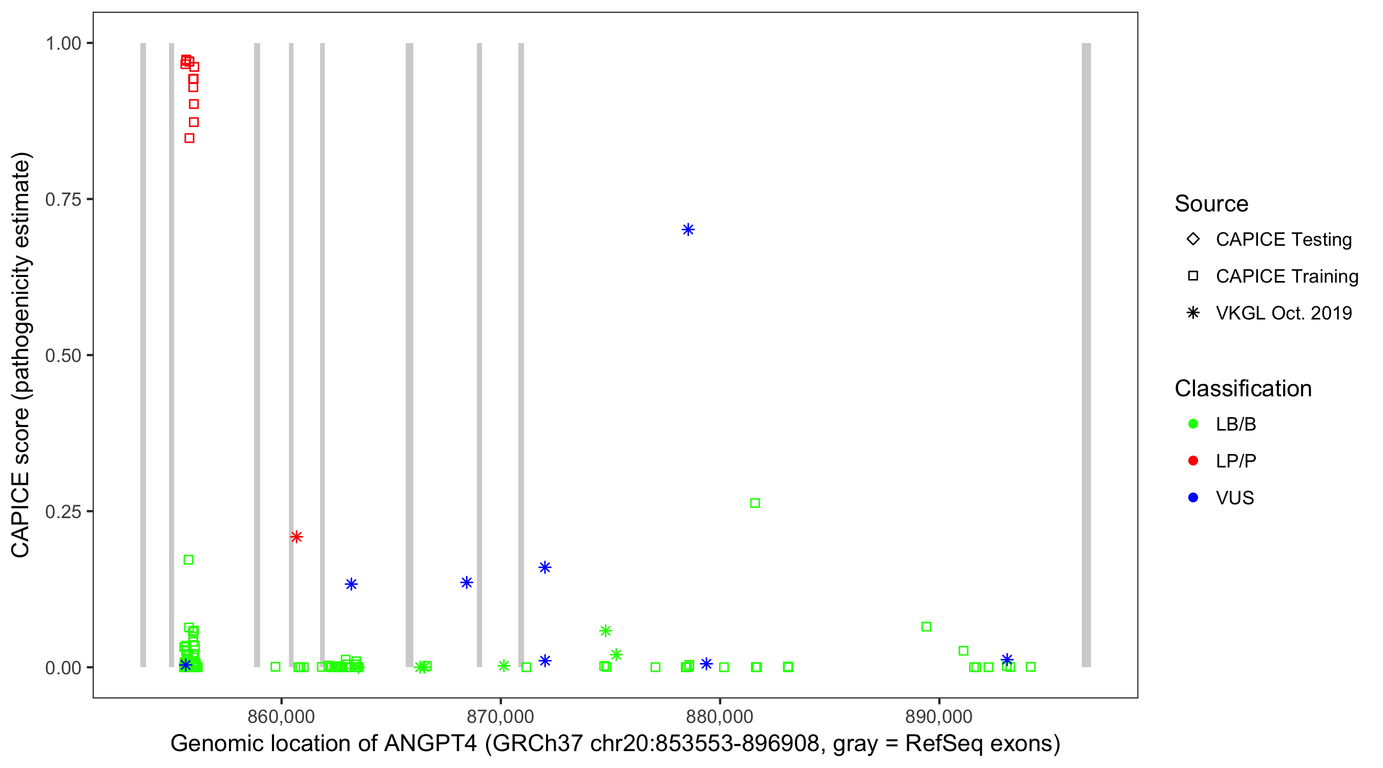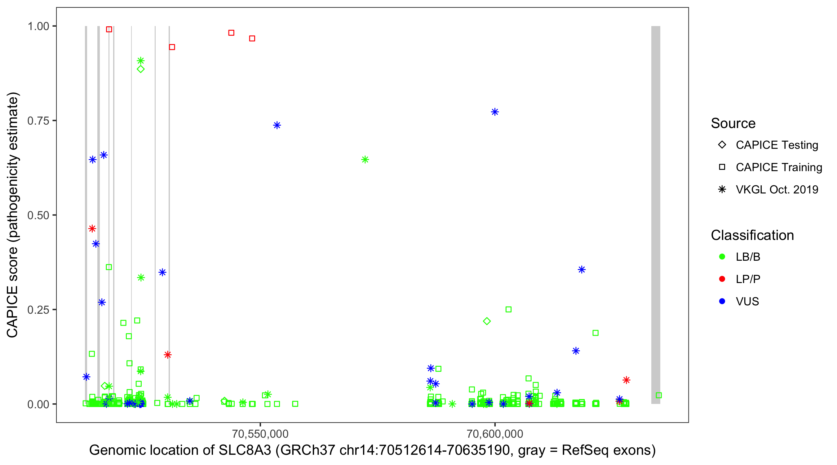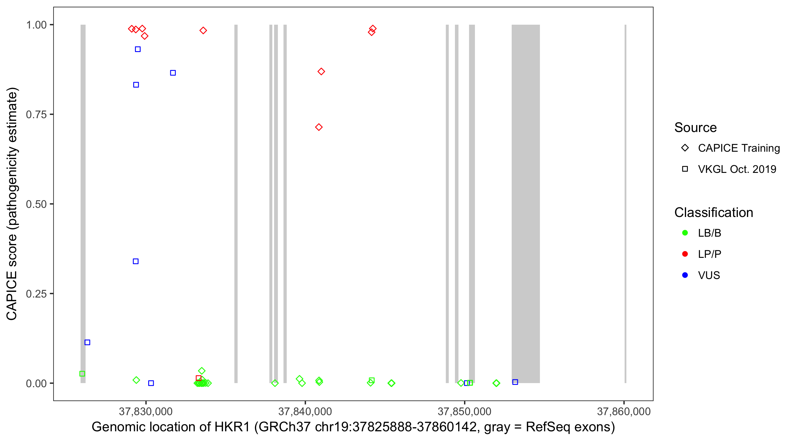 Shown are CAPICE train/test variants plus VKGL Oct 2019.