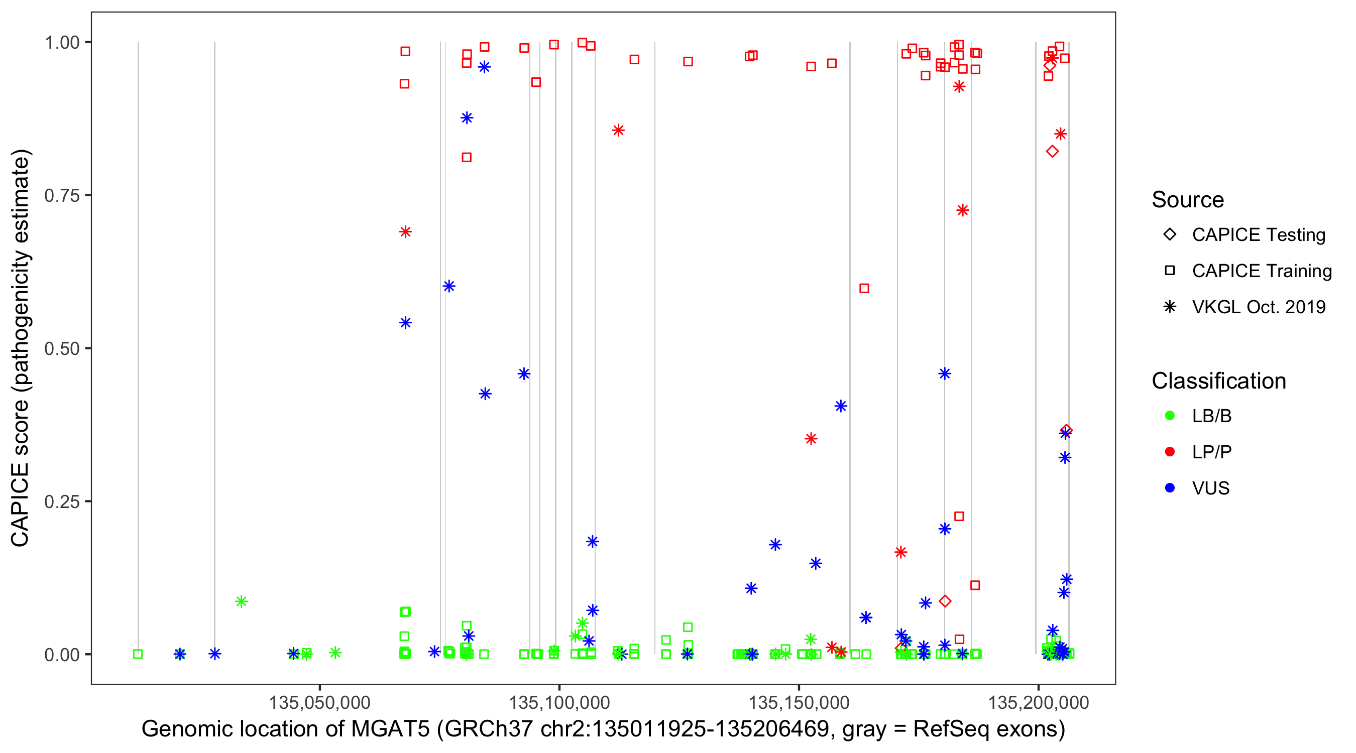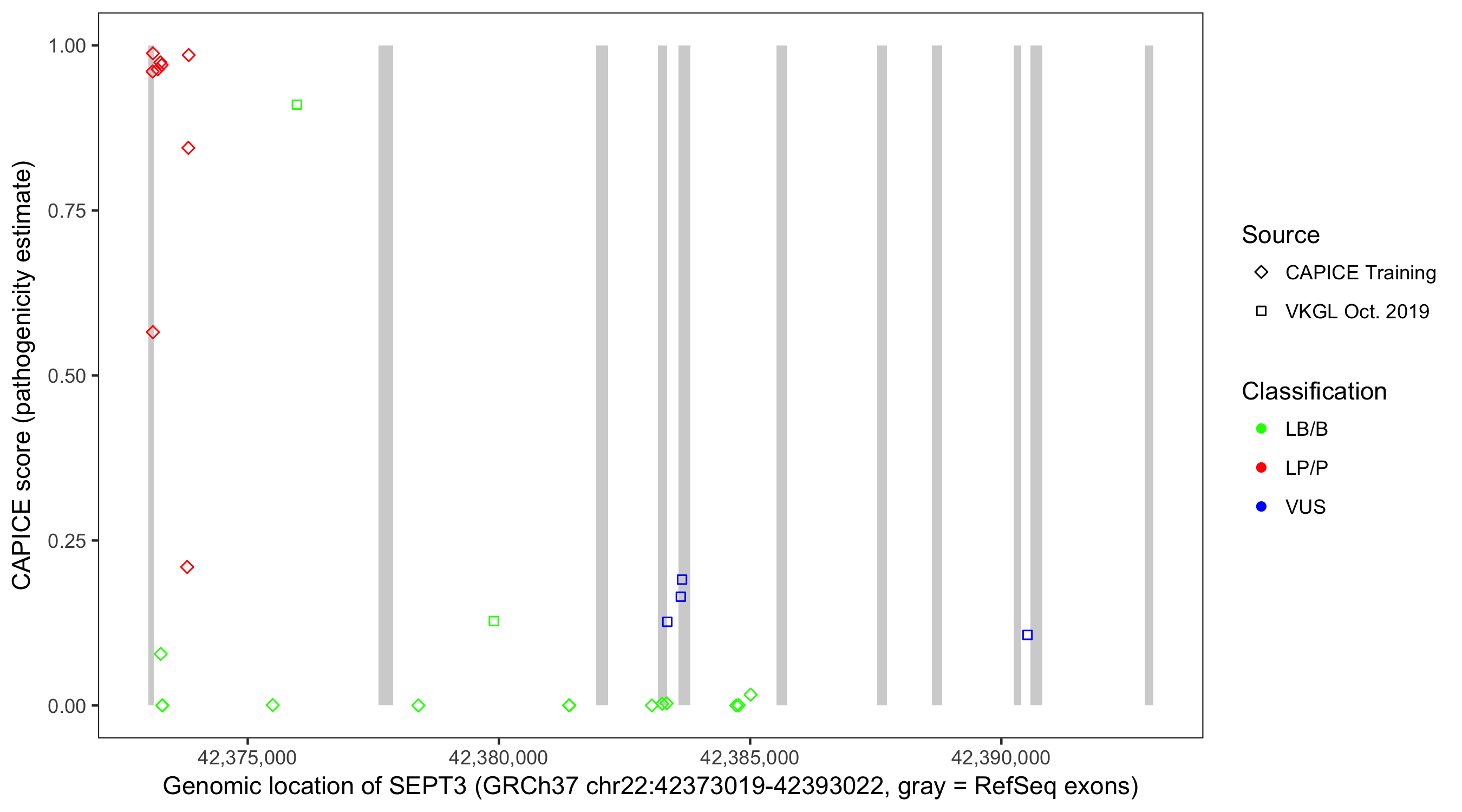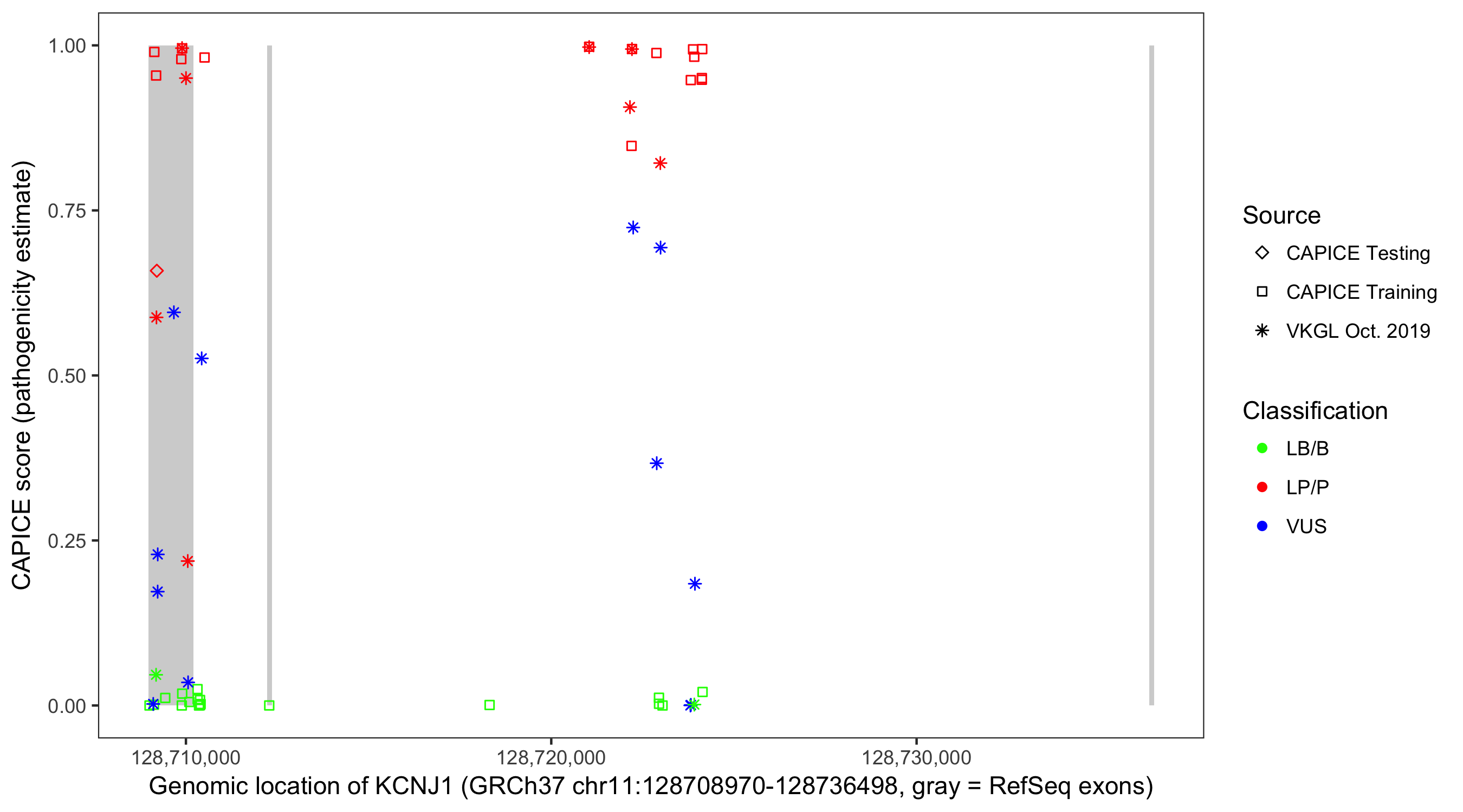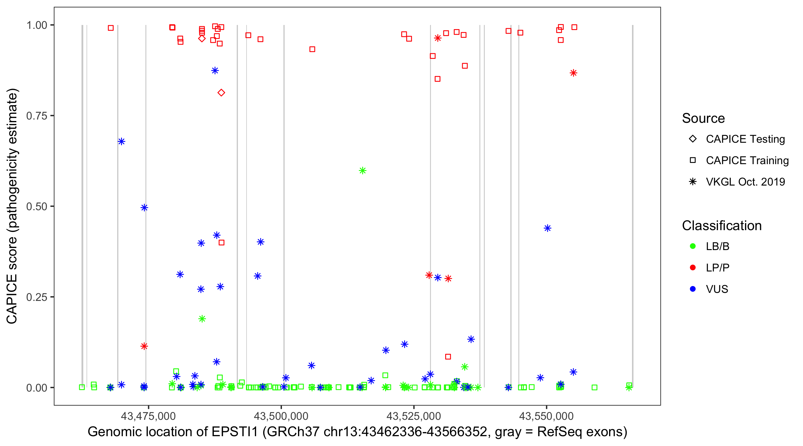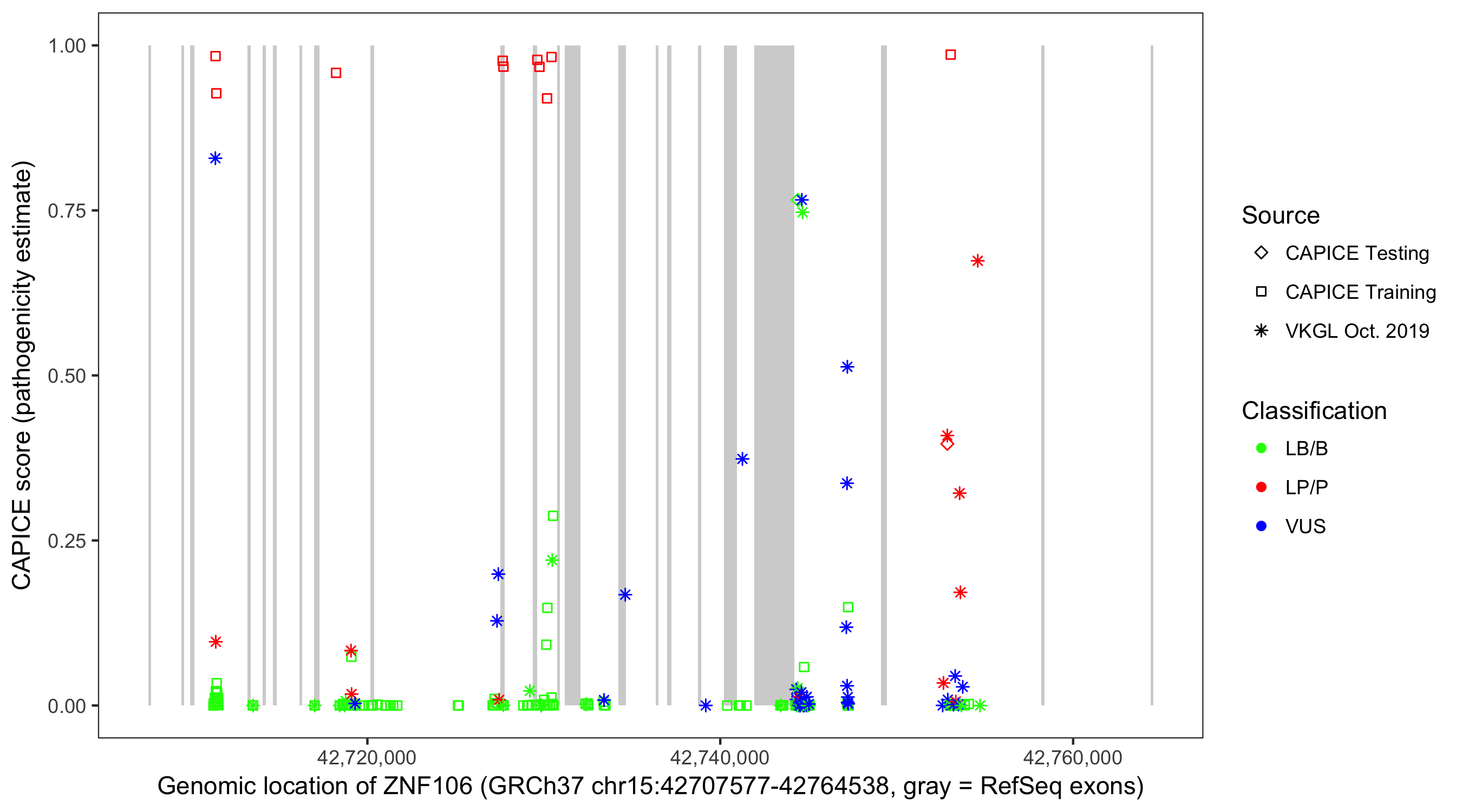 Shown are CAPICE train/test variants plus VKGL Oct 2019.