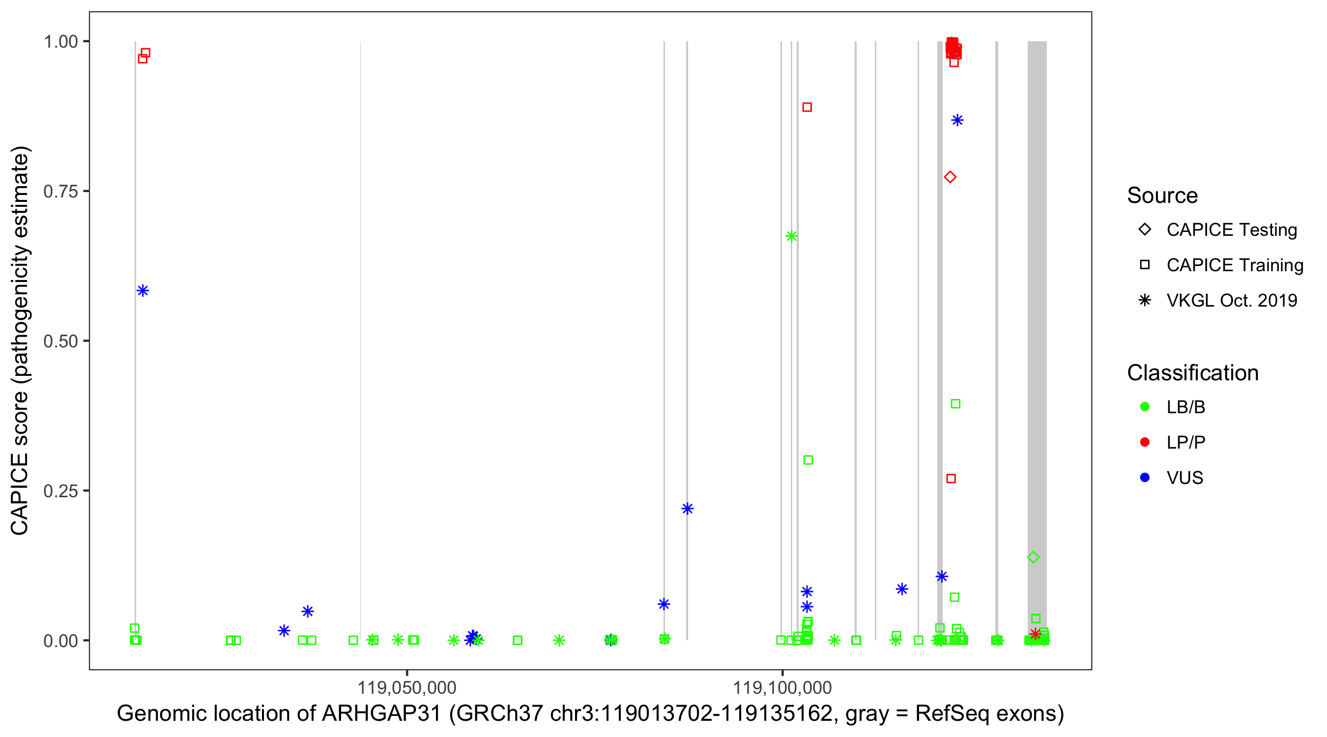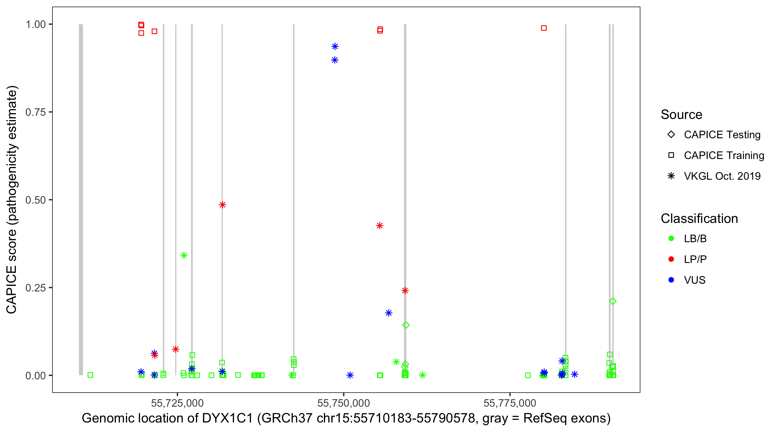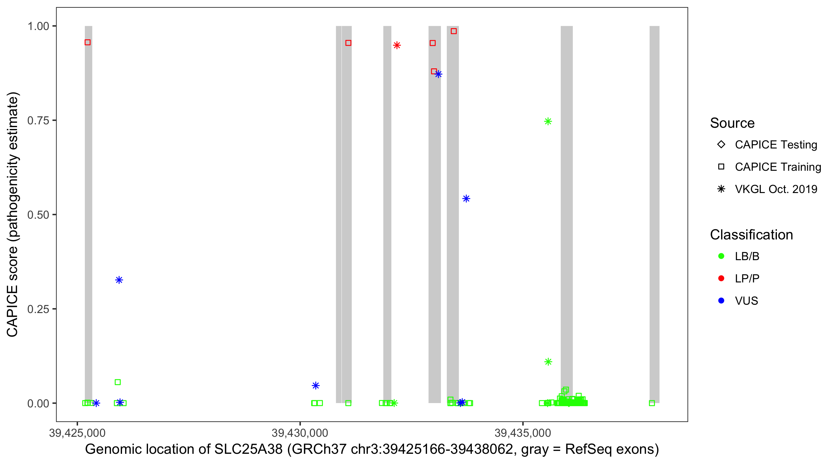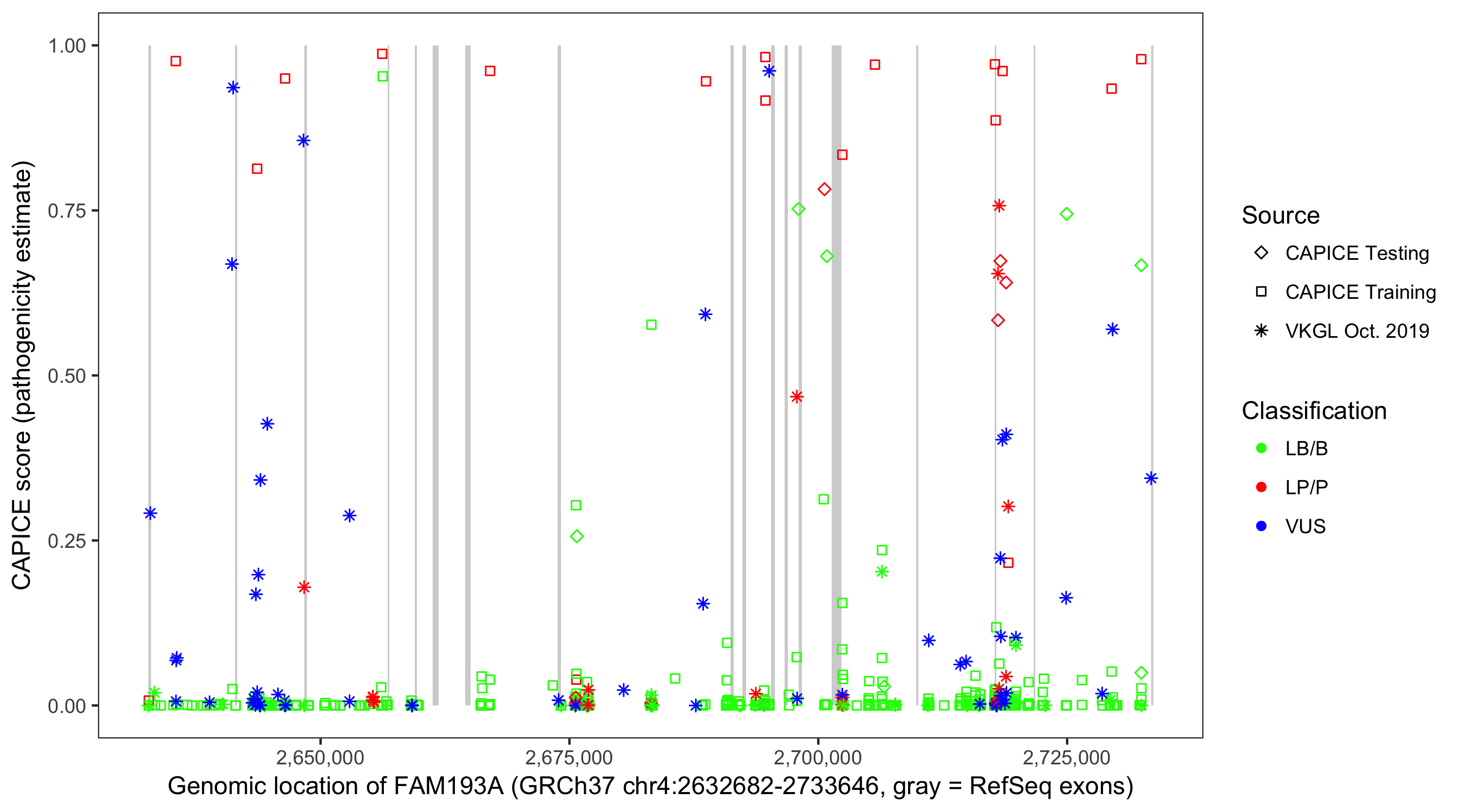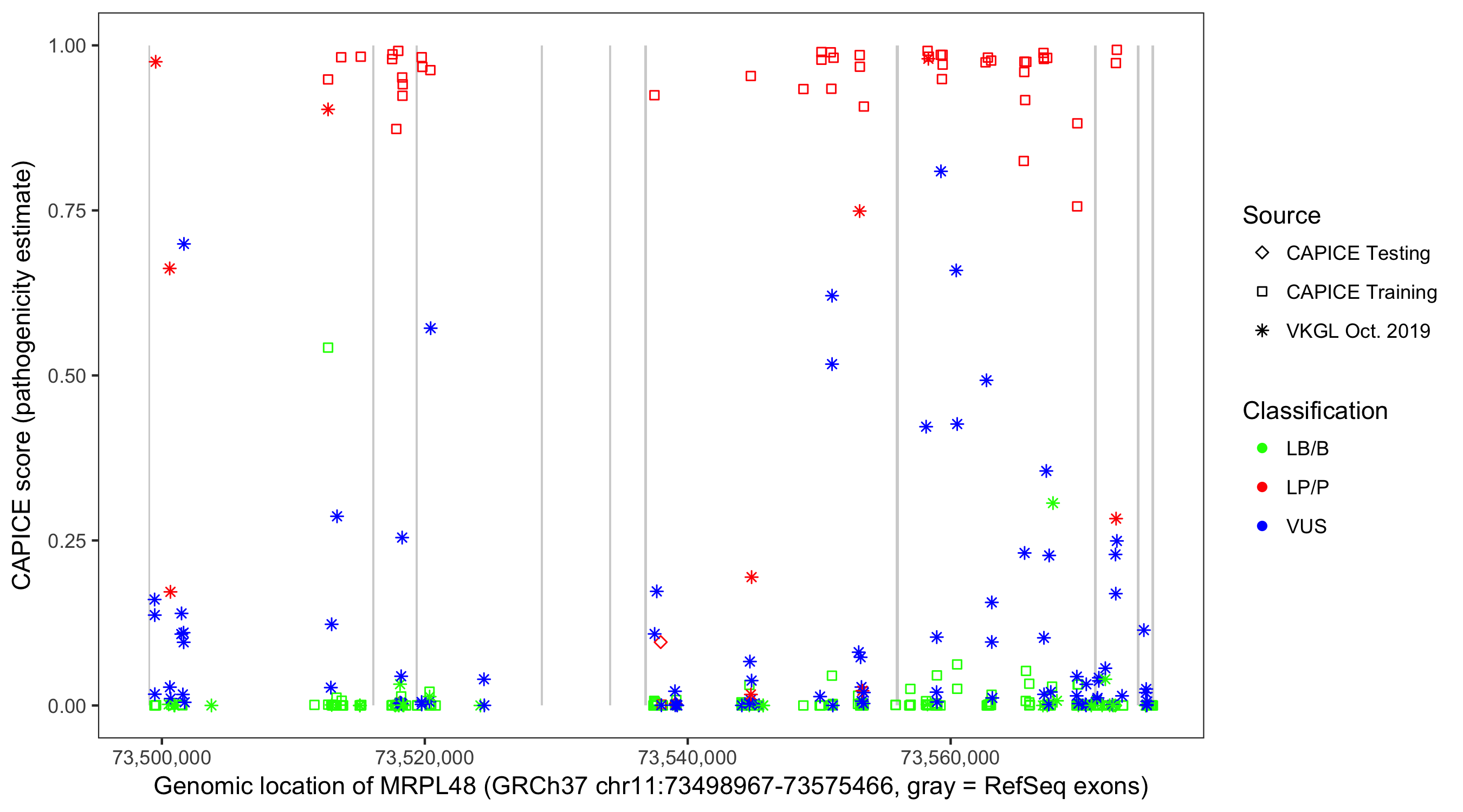 Shown are CAPICE train/test variants plus VKGL Oct 2019.