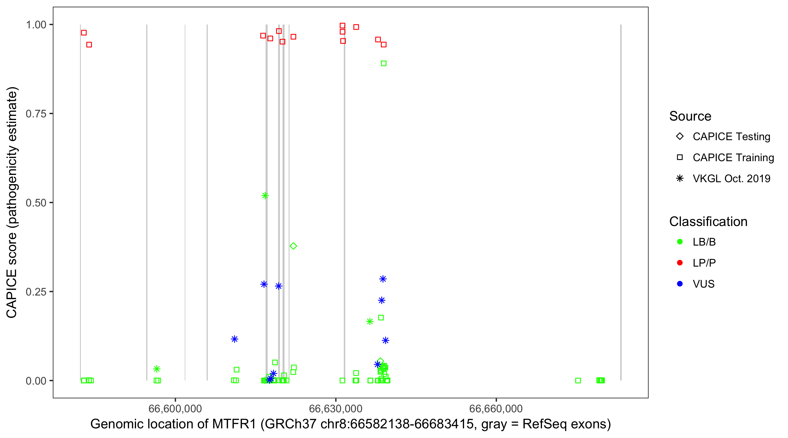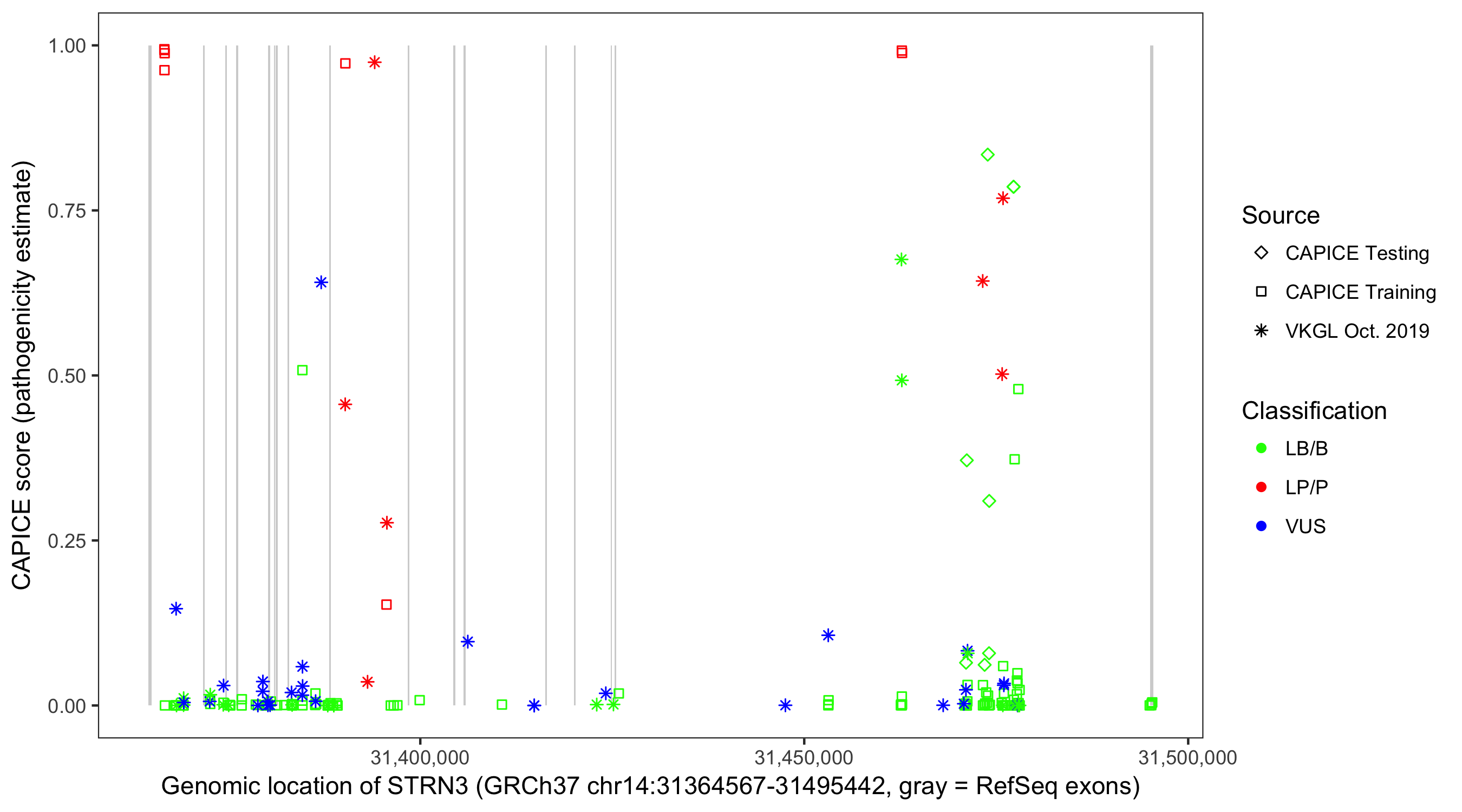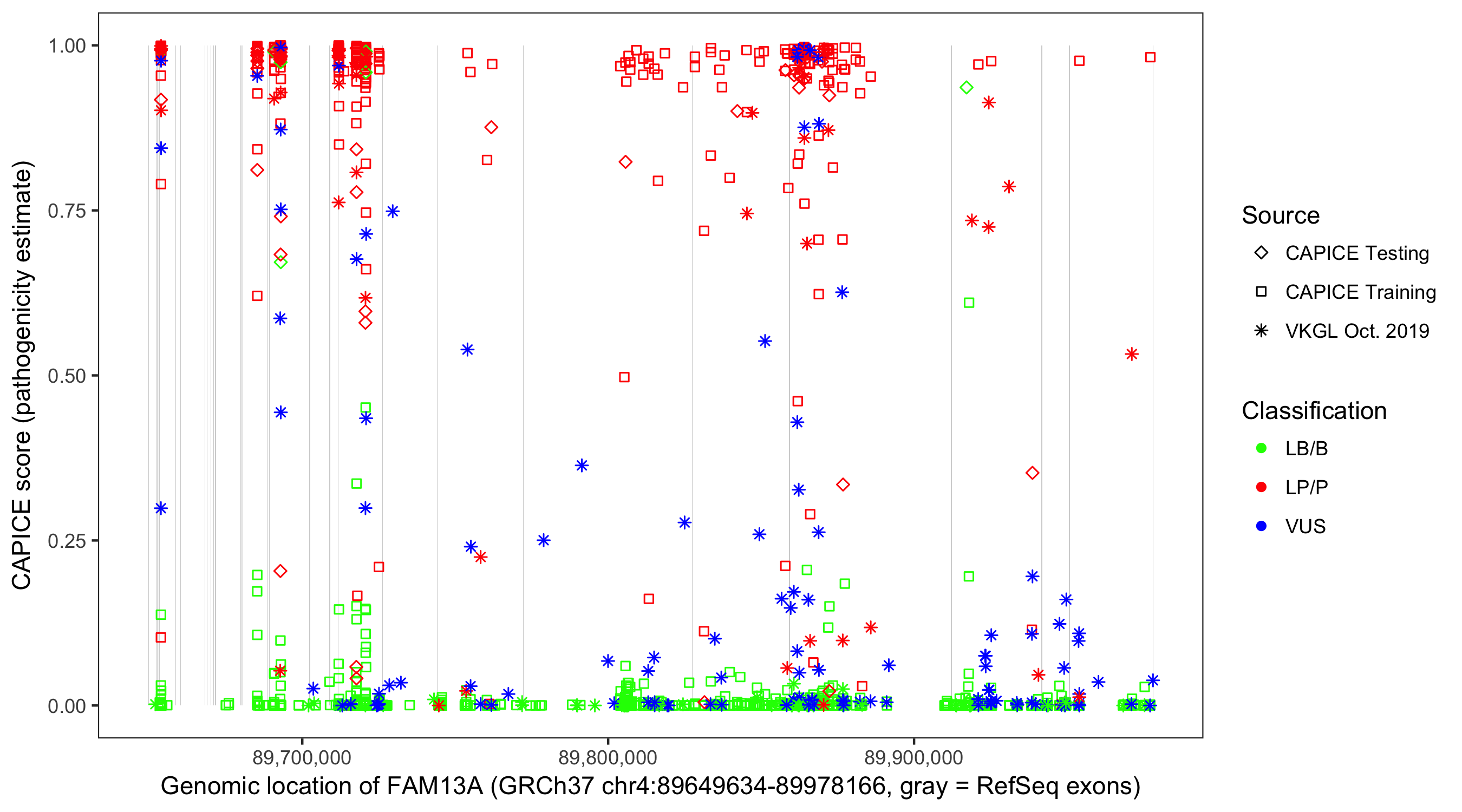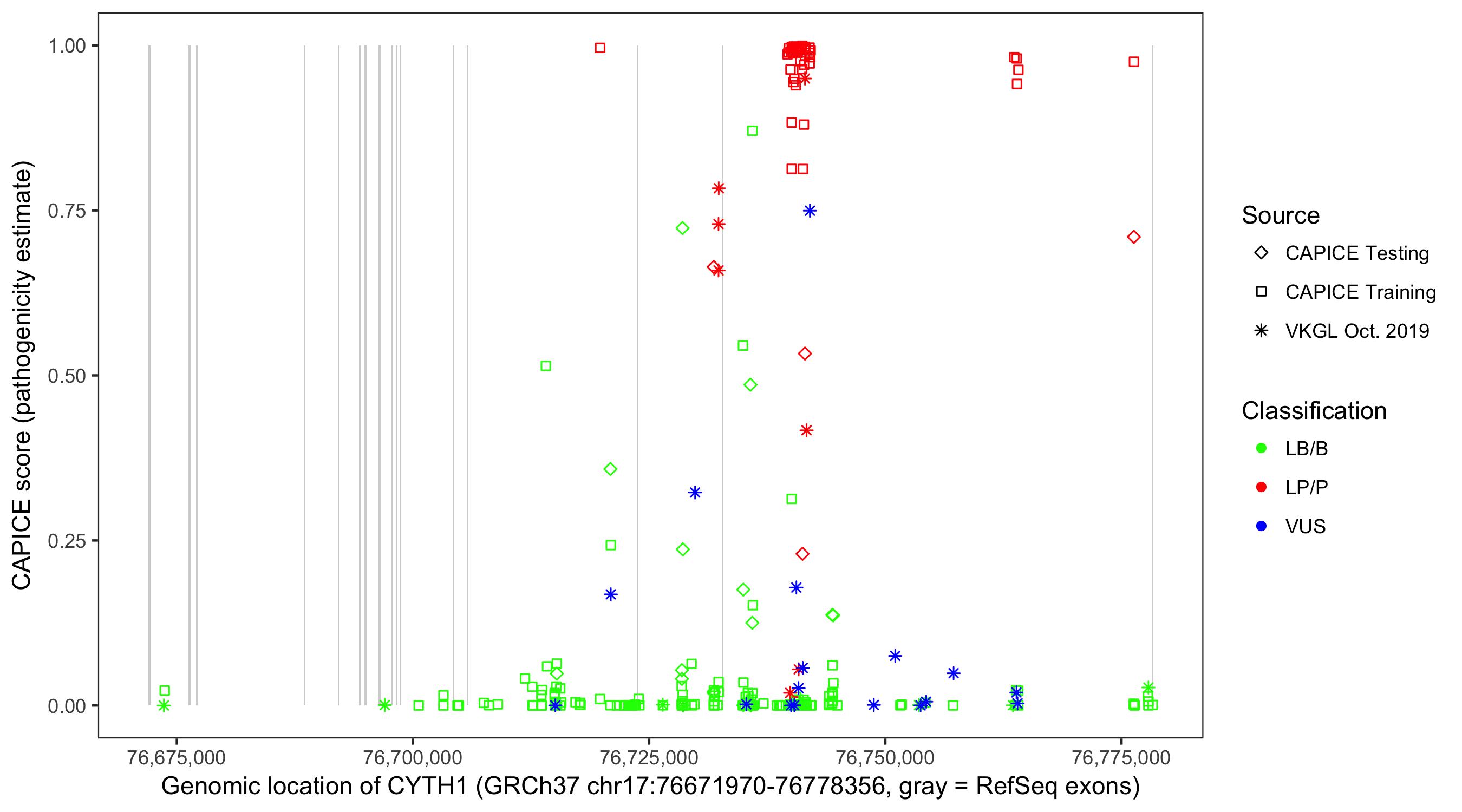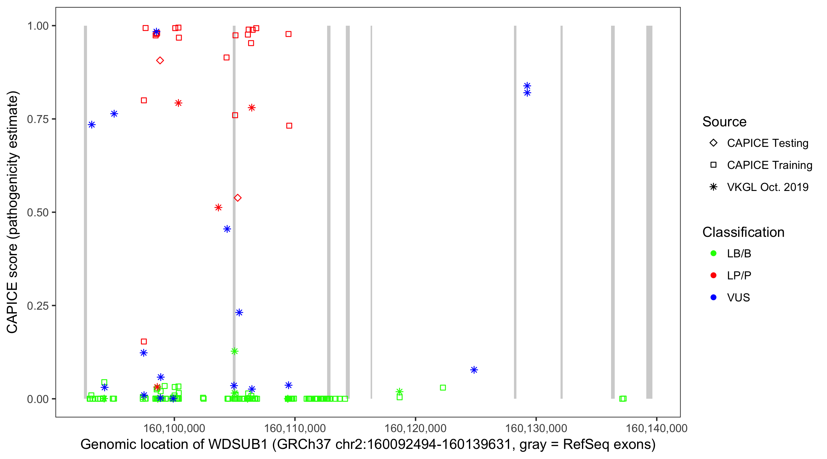 Shown are CAPICE train/test variants plus VKGL Oct 2019.