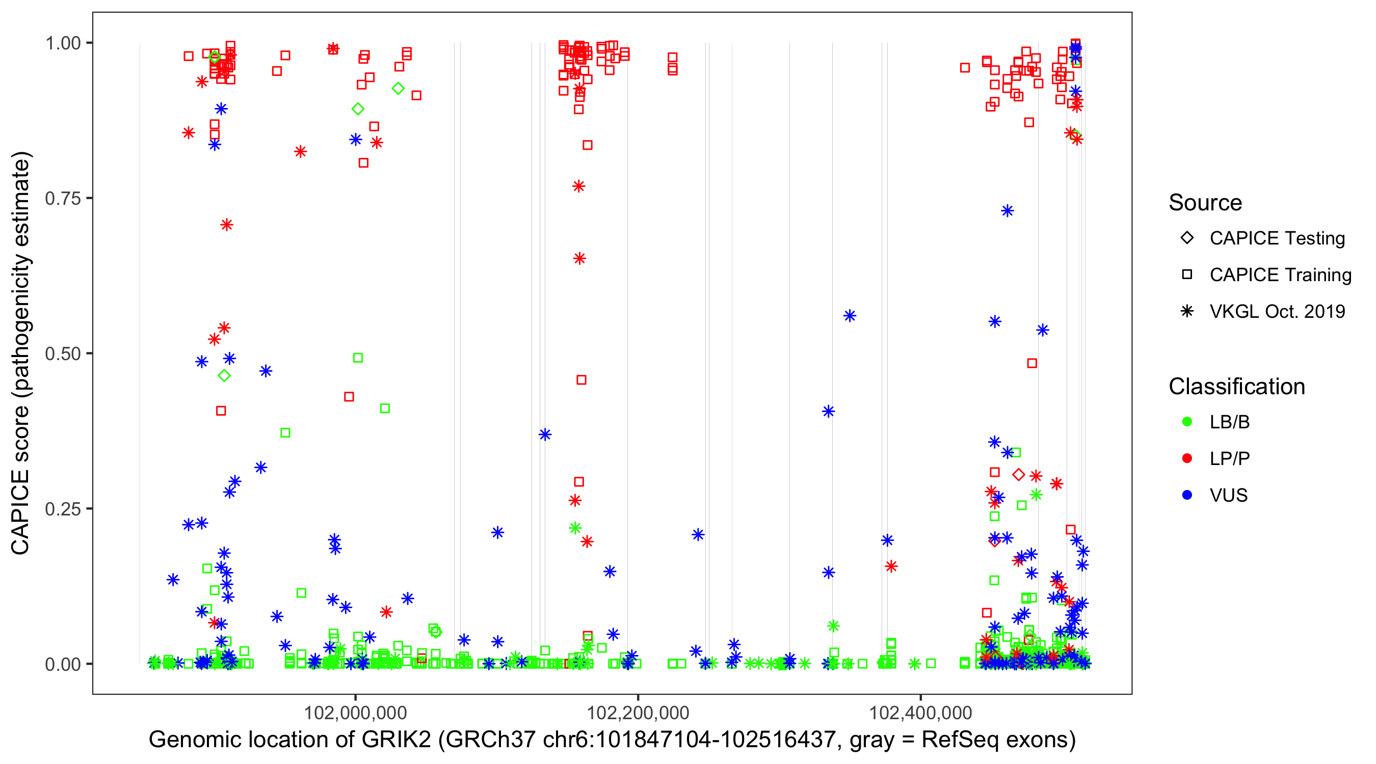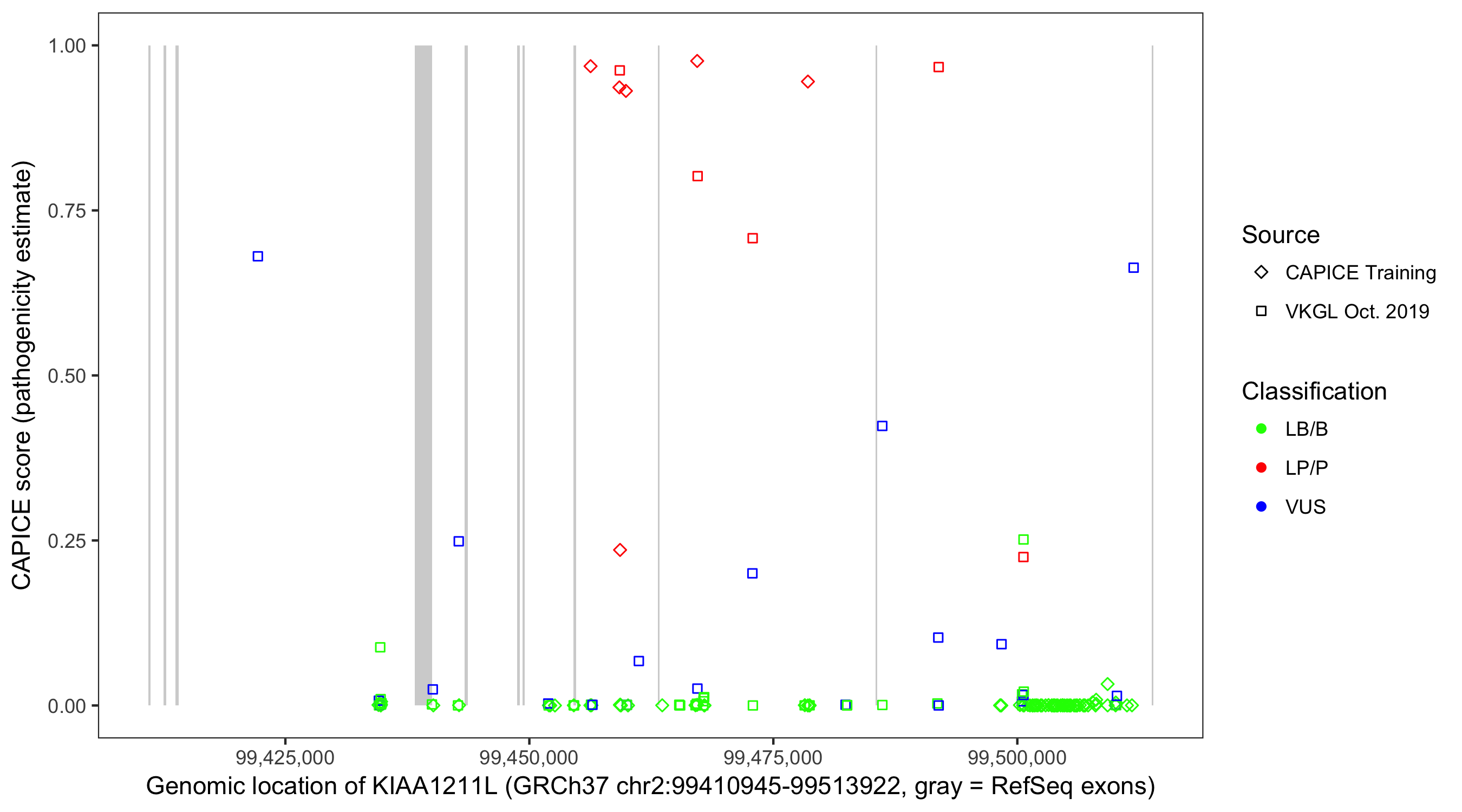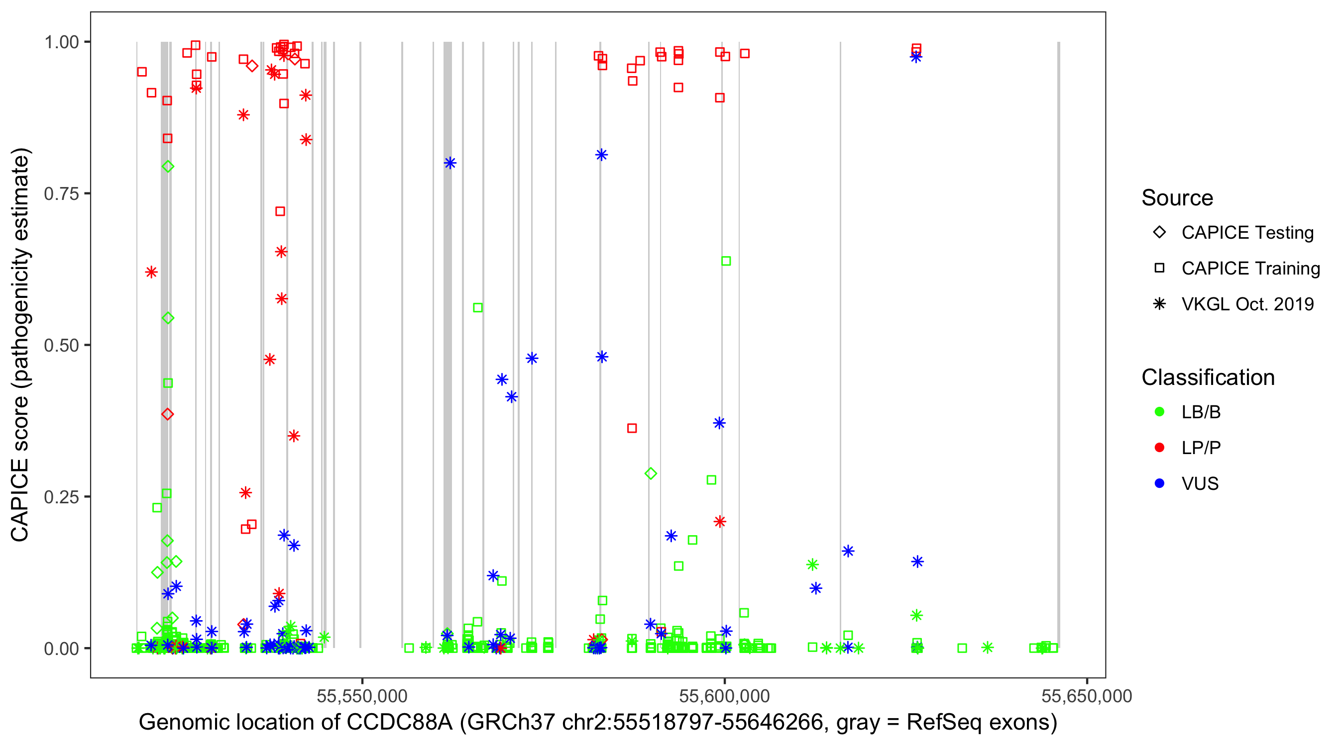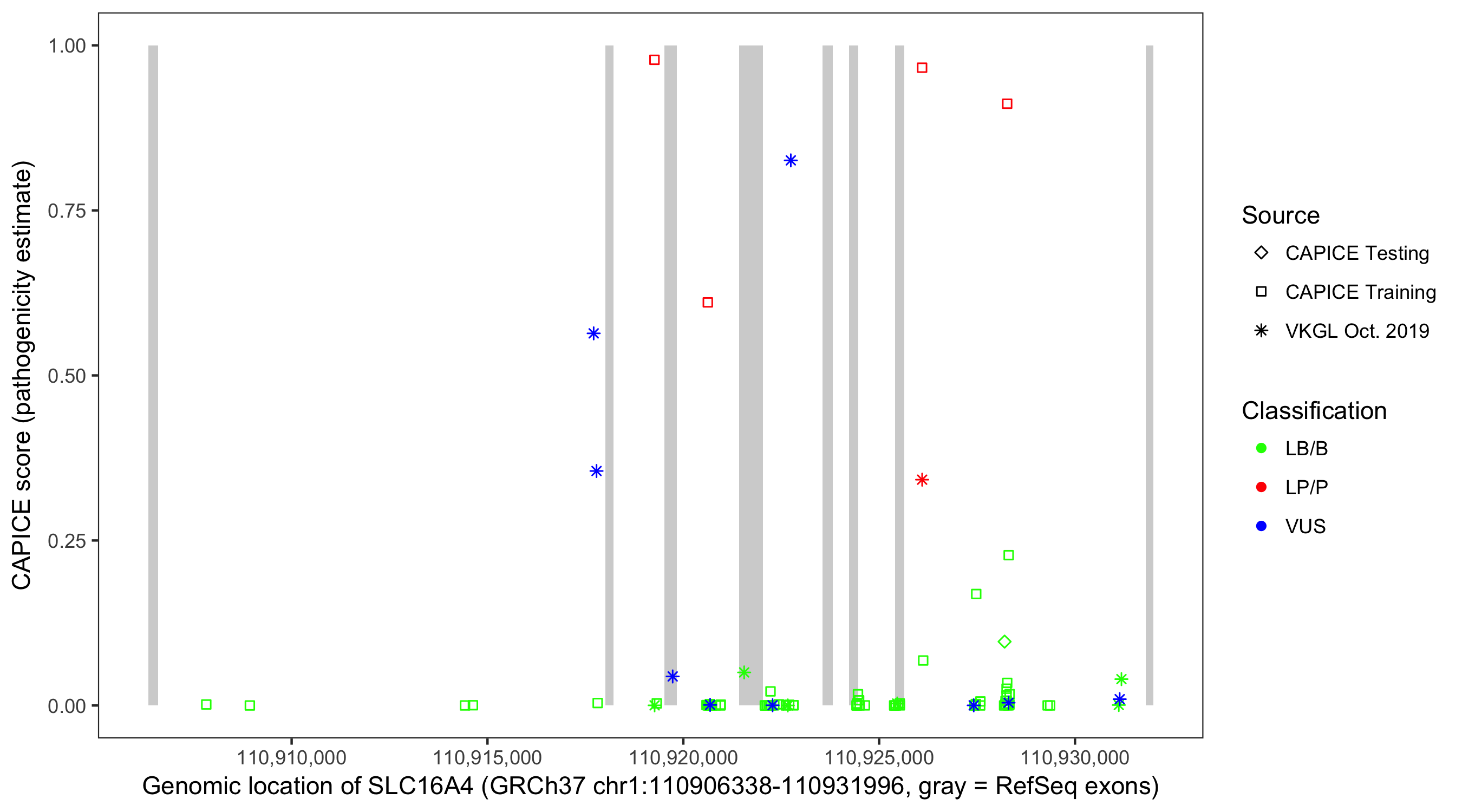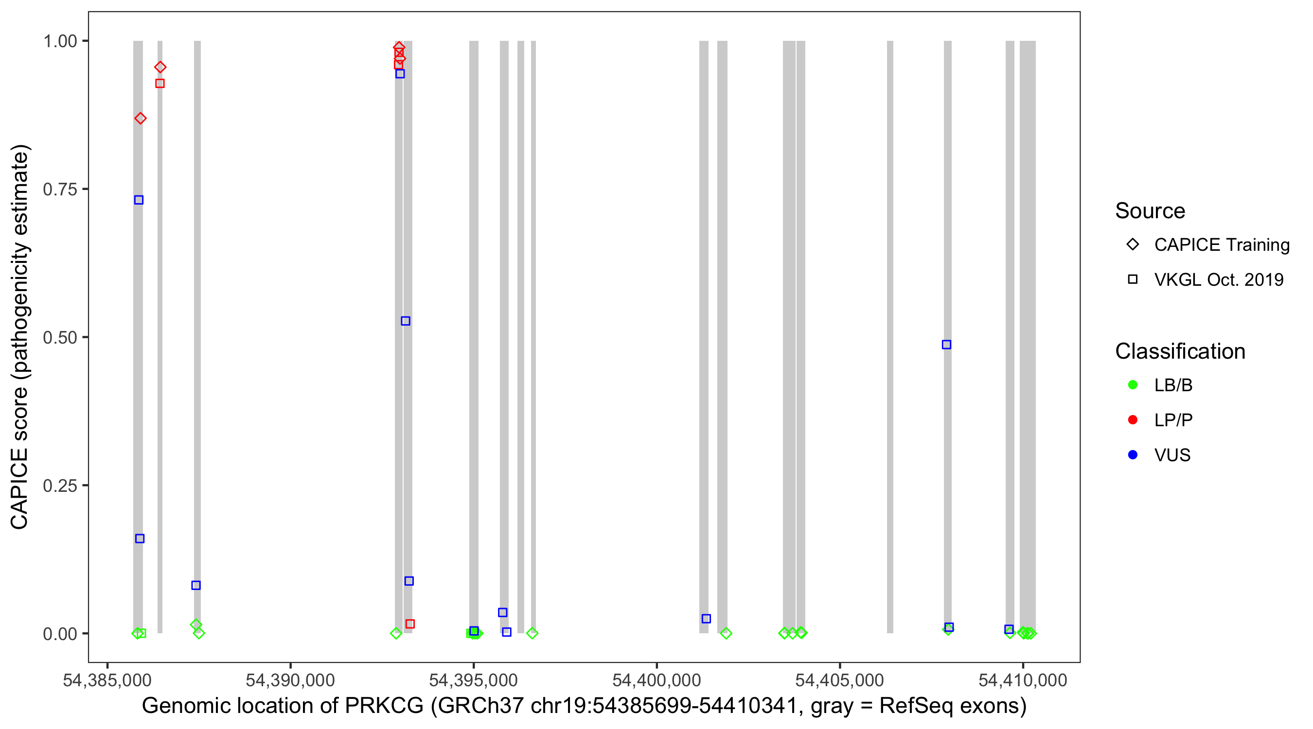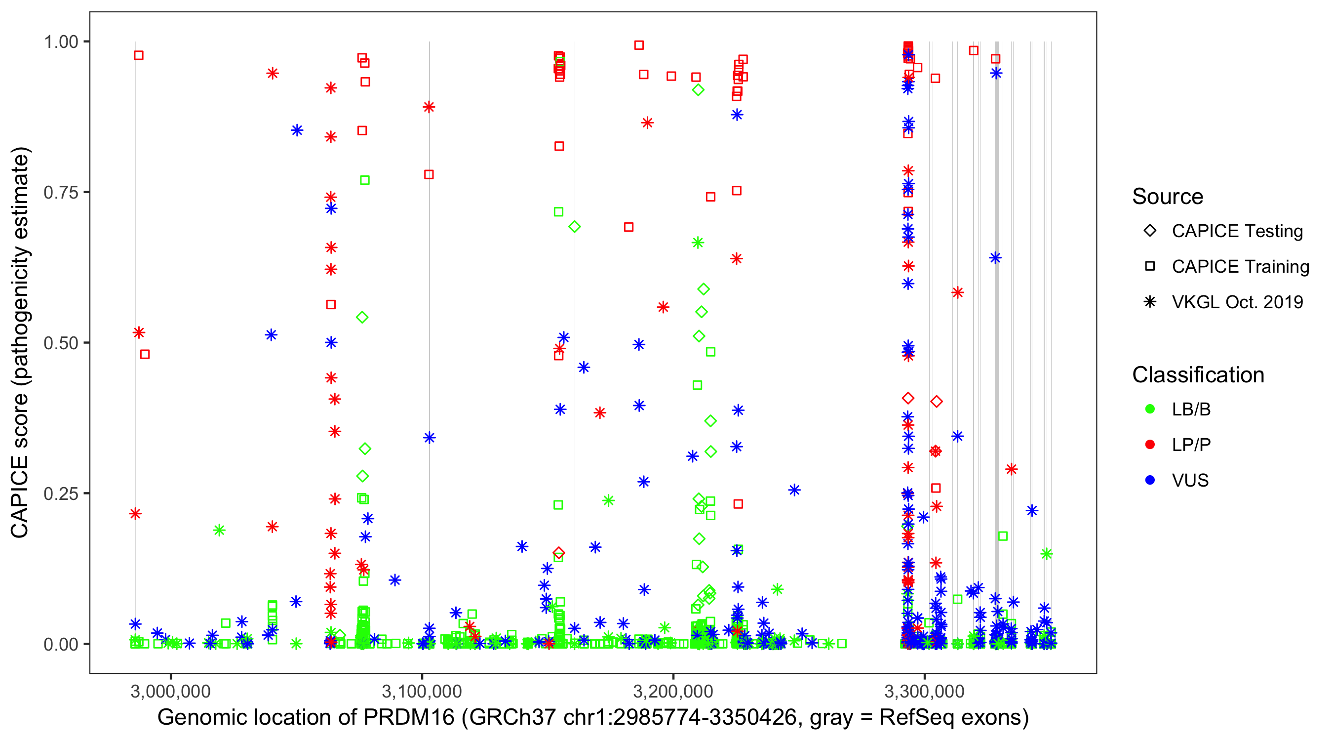 Shown are CAPICE train/test variants plus VKGL Oct 2019.