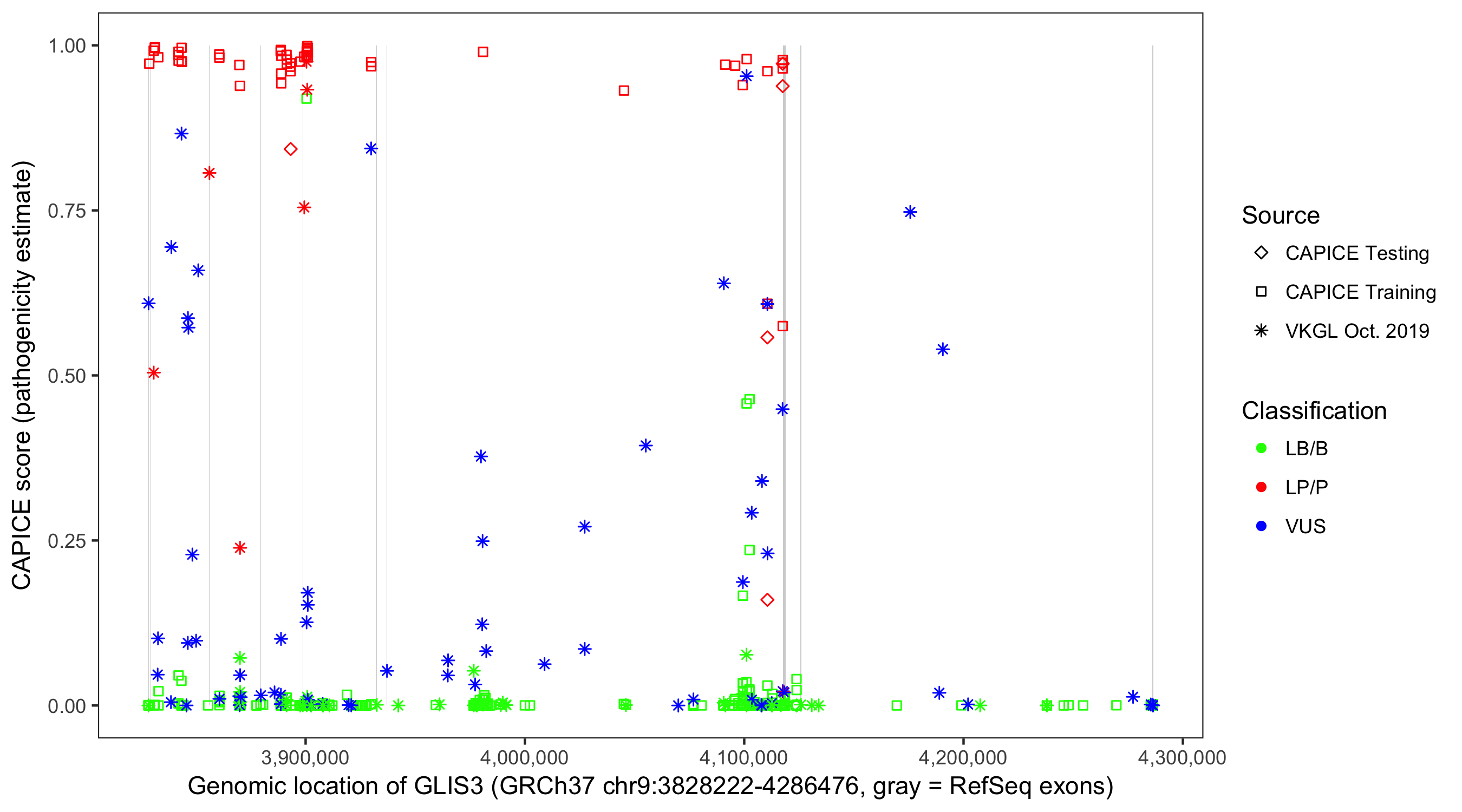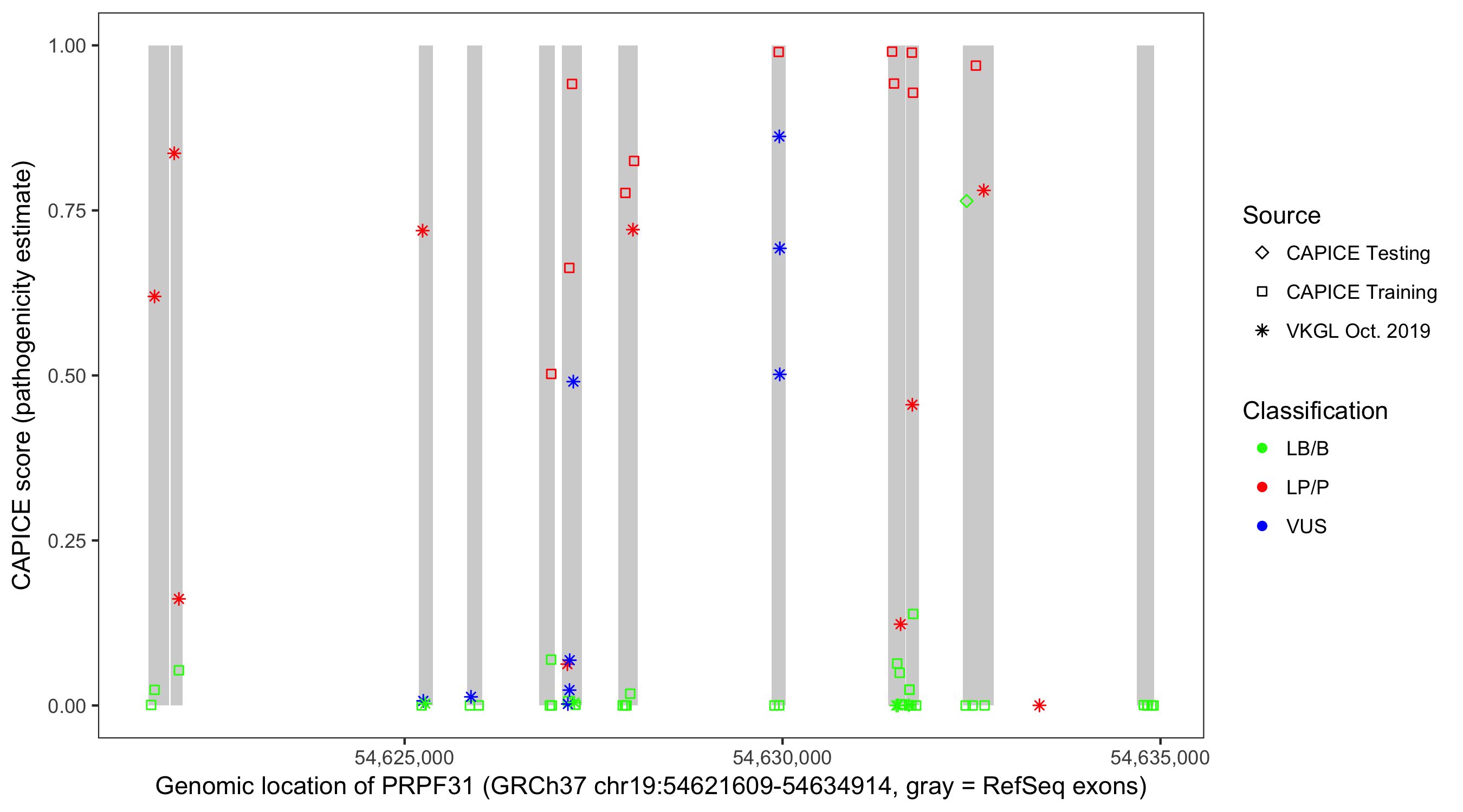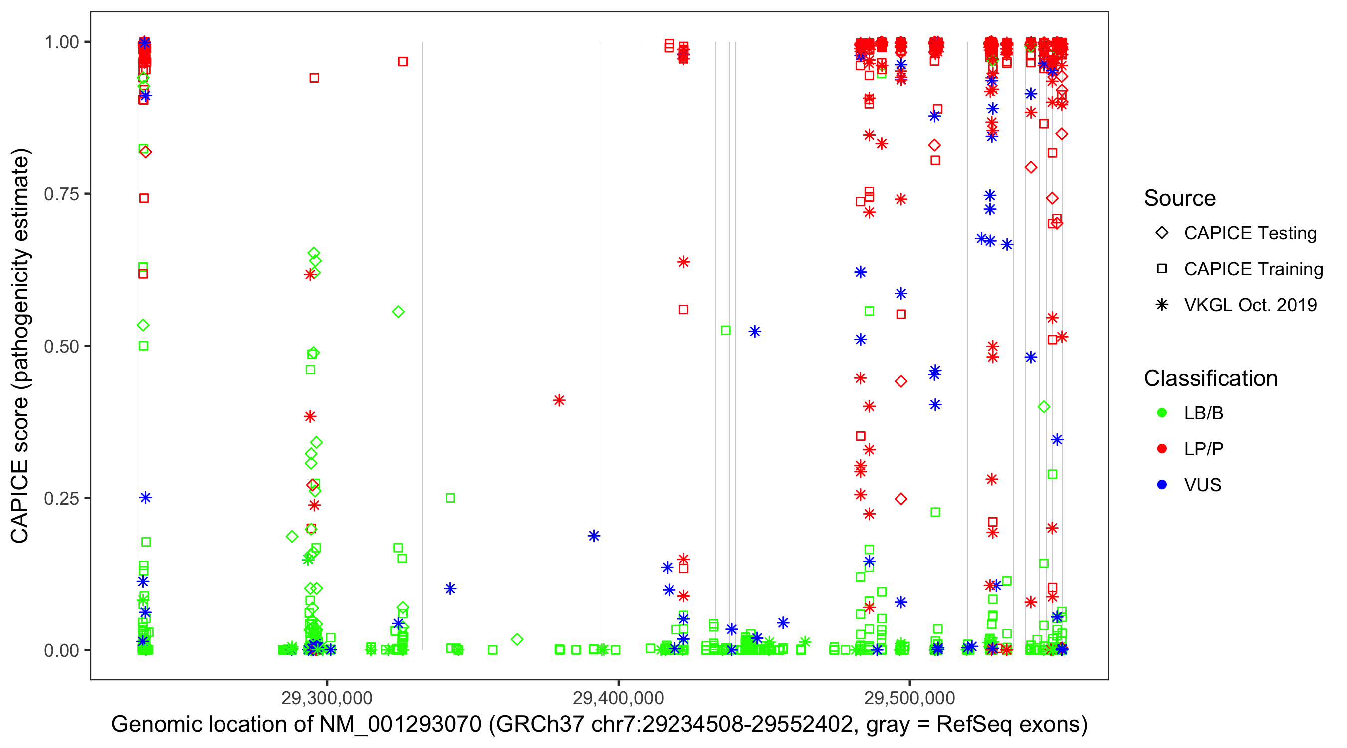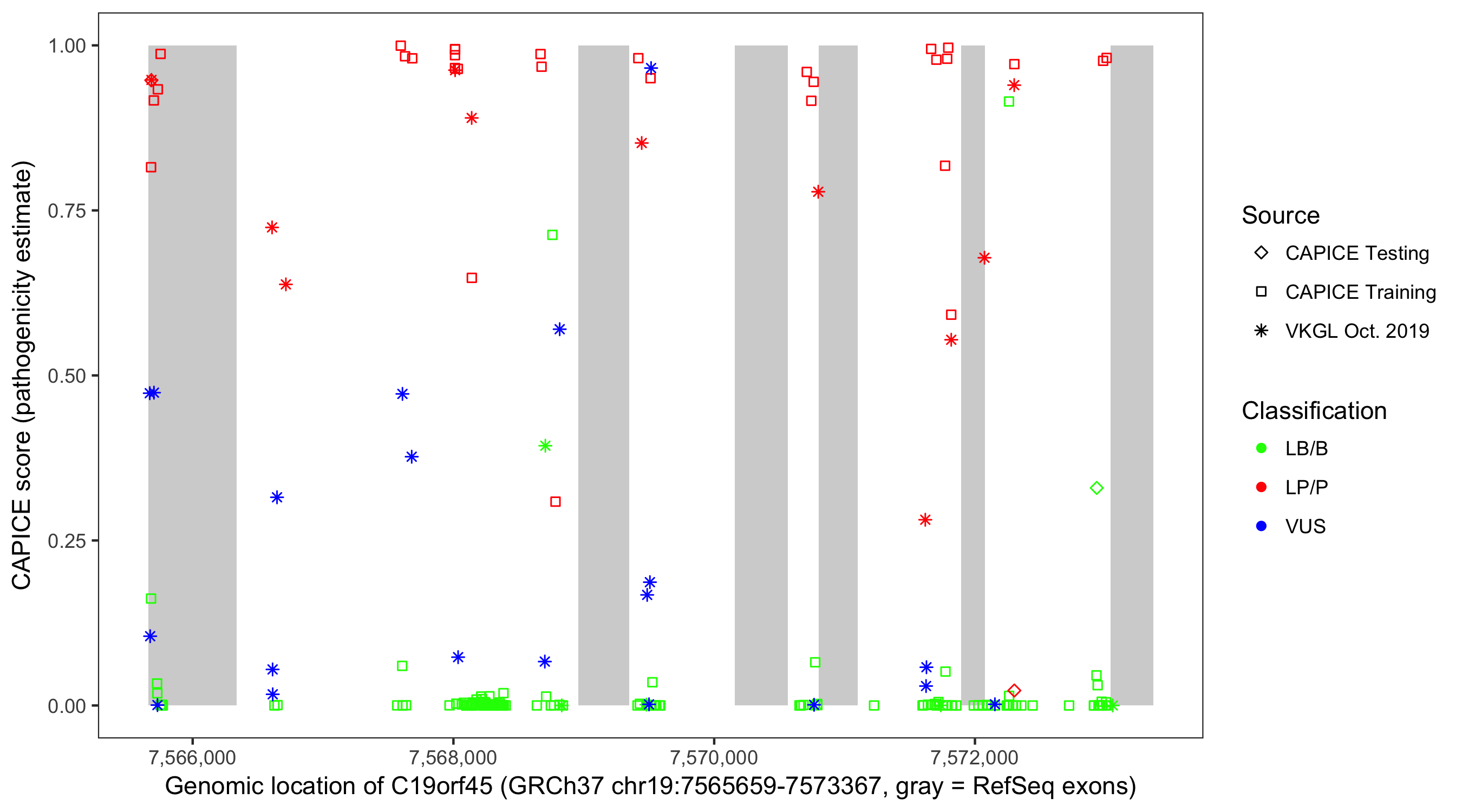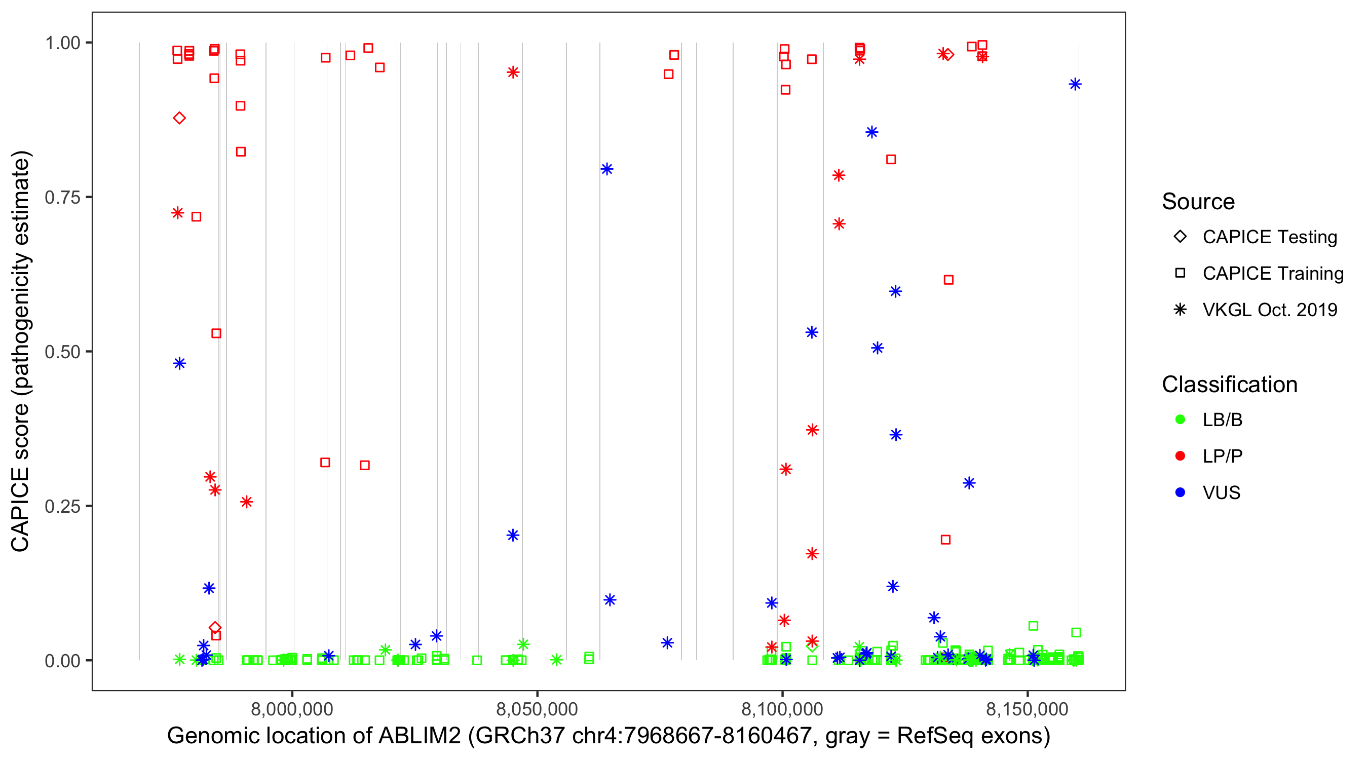 Shown are CAPICE train/test variants plus VKGL Oct 2019.