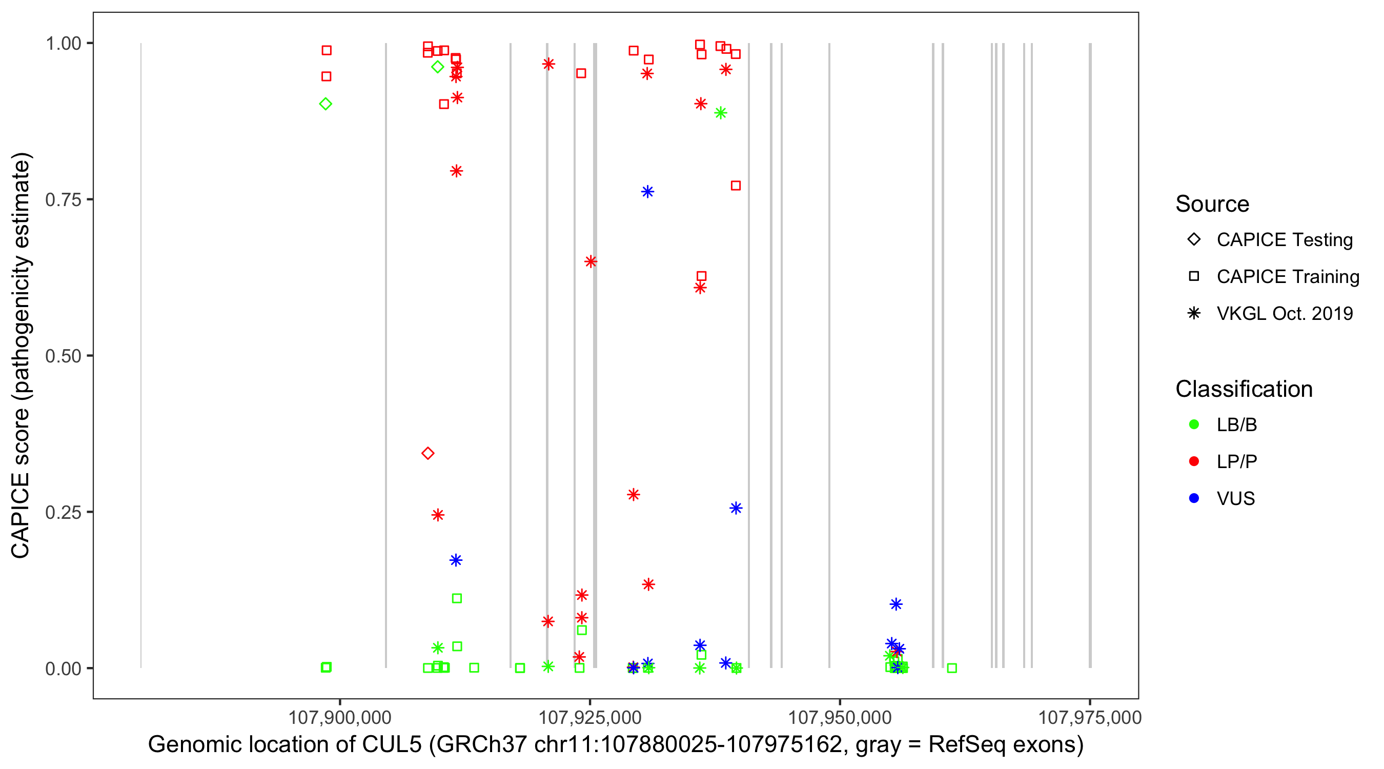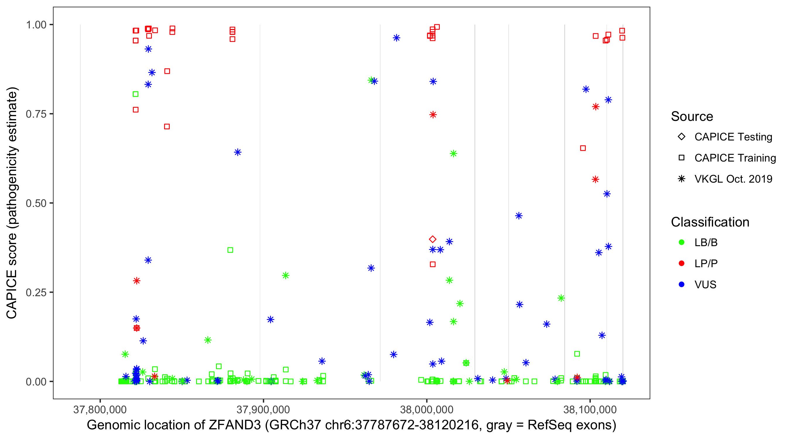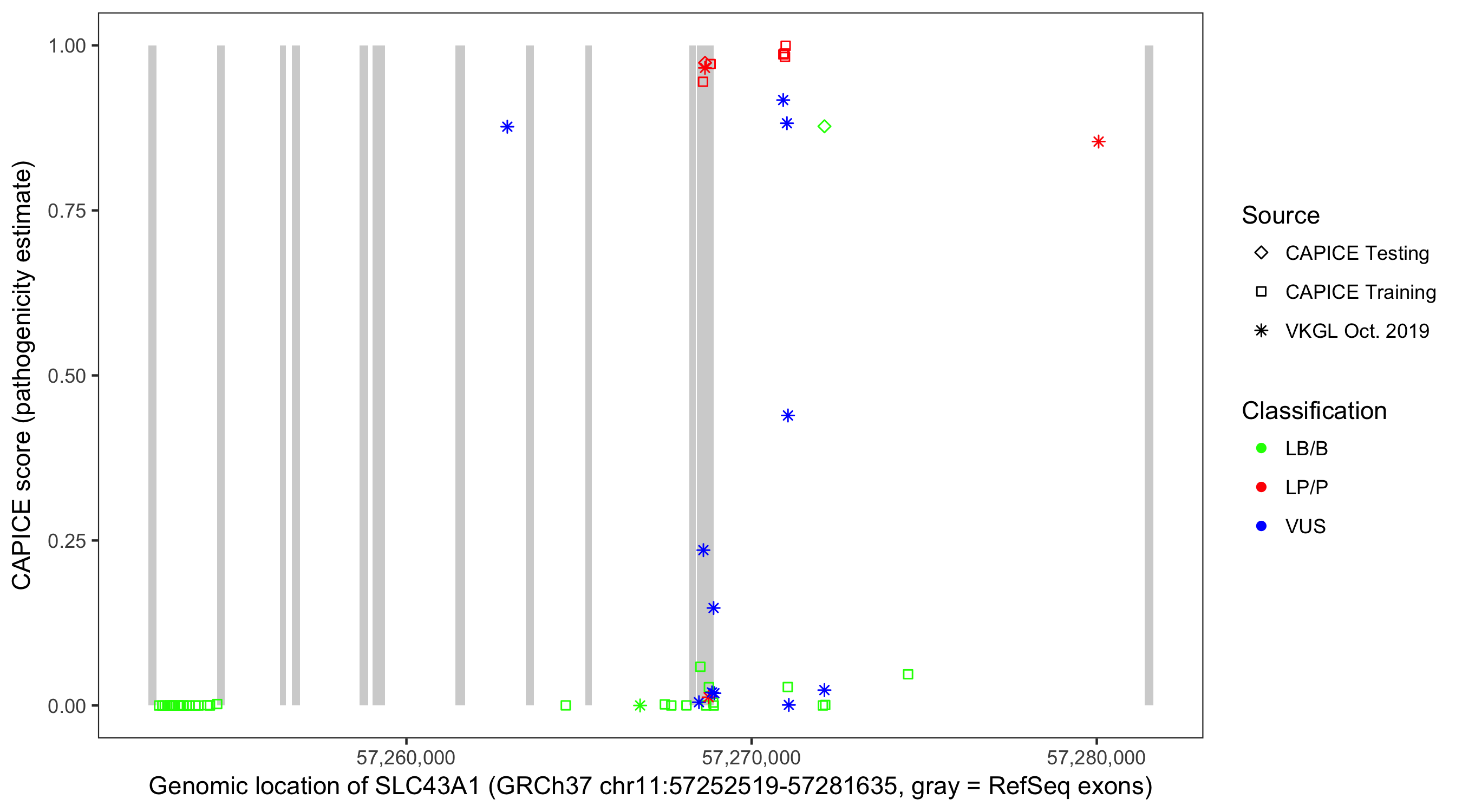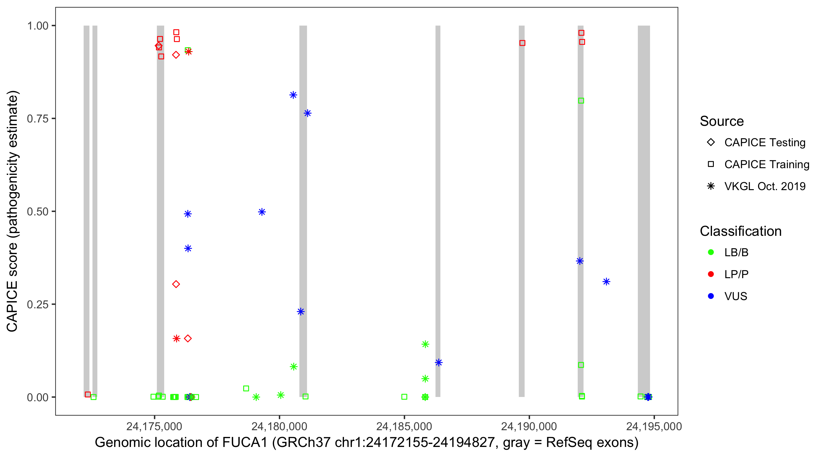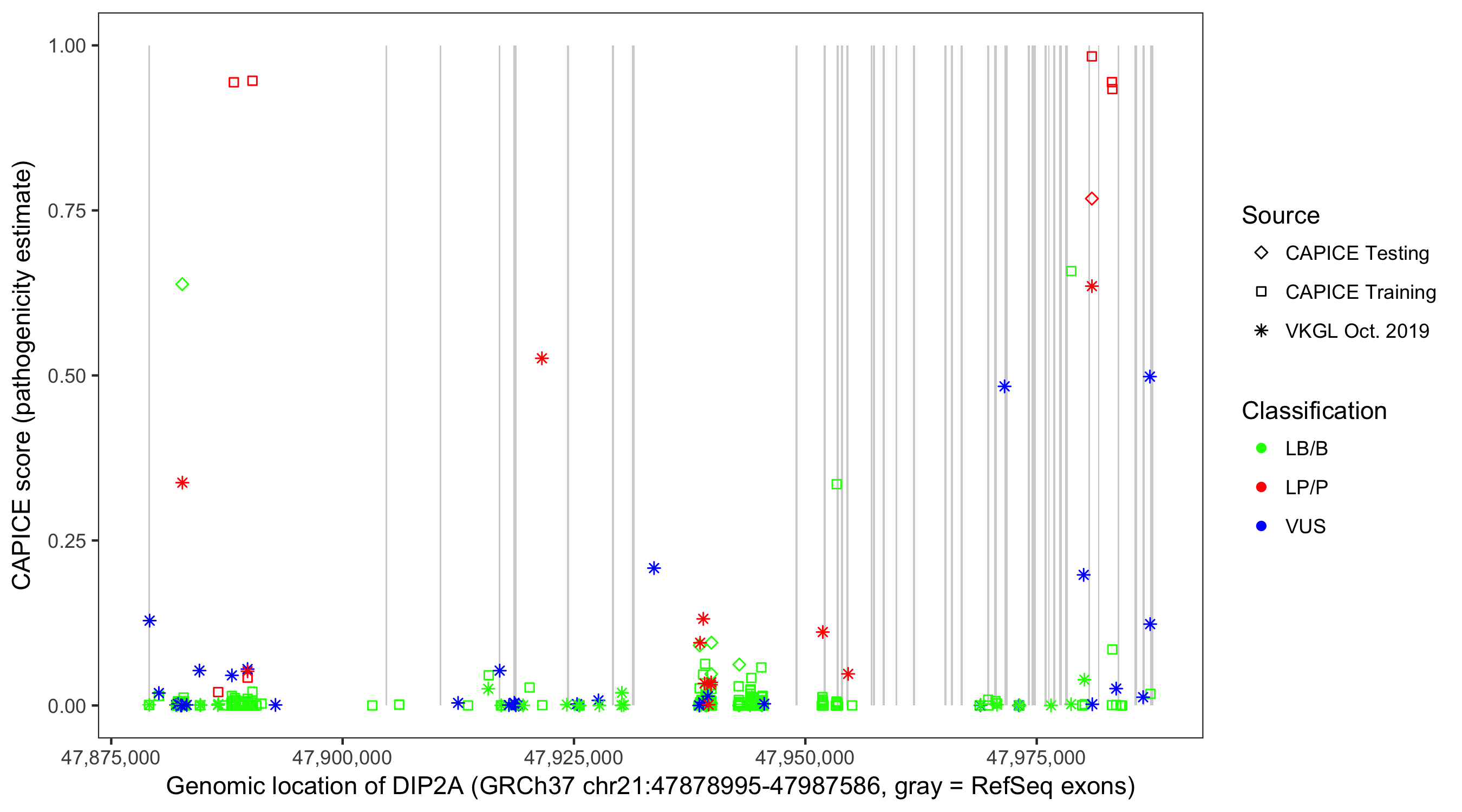 Shown are CAPICE train/test variants plus VKGL Oct 2019.